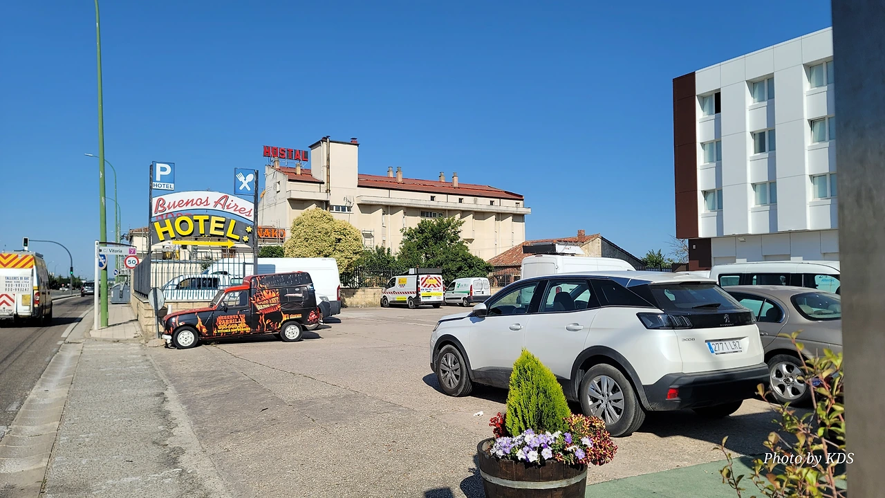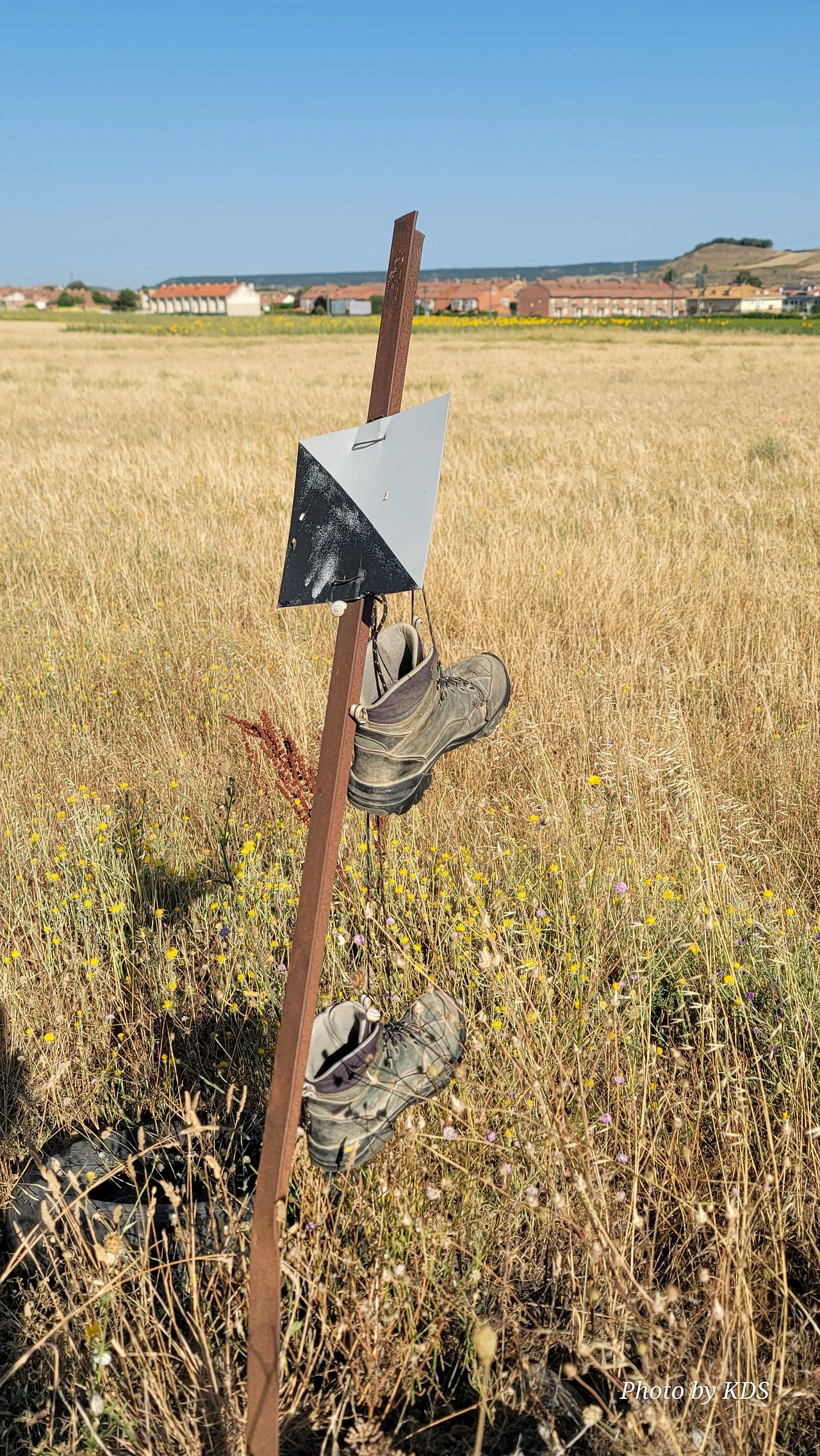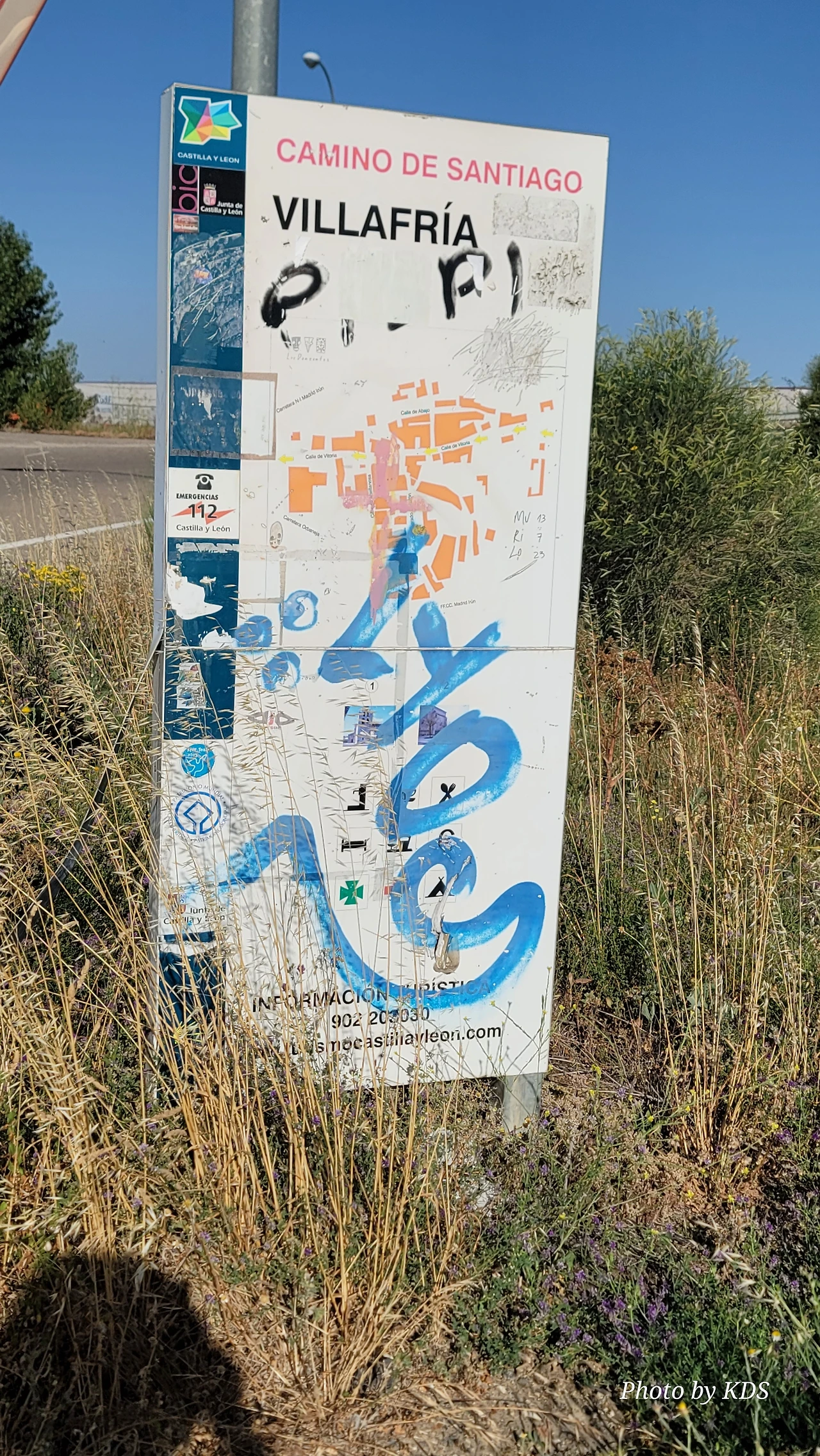 완만한 내리막길은 주변에 밀밭으로 이어져 있다. 군데군데 민가들이 가끔 보이고, 계속되는 벌판이다. 14km 정도를 걸어오니 부르고스(Burgos)를 약 10Km 정도 남겨두고 제법 현대화된 마을이 나타난다. 비야프리아(Villafria) 마을이다. 아스팔트 길이라서 걷는데 별로 어려움이 없다. 아스팔트 길은 정말 비단길을 걷는 것 같다. 마을 어귀에 부에노스 아이레스(Buenos Aires)라는 제법 큰 호텔과 카페티리아가 우리를 반긴다. 목도 마르고 배도 고픈 시간이다. 여기서 점심 요기를 하고 가야겠다. 음식점에 들어가 음료를 시키고 간단한 요기를 한다. 화장실 문제도 해결한다. 여기서부터 부르고스까지 가는 길은 여러 갈래가 있다. 원래의 시골길인 순례길이 있고, 차량들이 다니는 시끄러운 도로가 있다. 시골길은 걷기도 불편하고 거리가 2-3Km 정도 더 멀다. 아스팔트 길은 거리도 가깝고 걷기도 편안하다. 그러나 옆으로 차량이 소음을 내면서 쌩쌩 달리기 때문에 위험하다. 어느 길을 택할 것인가 고민을 하다가 한 시간이라도 부르고스에 빨리 도착하여 깨진 스마트폰 액정을 수리하는 것이 좋겠다는 결론이다. 급한 마음에 마을의 성당에도 들리지 않고 아스팔트 포장도로를 따라 무작정 부르고스 방향으로 걸었다. 길에서 멀리 보이는 수도원 건물 지붕과 성당의 종탑을 카메라에 담아본다.