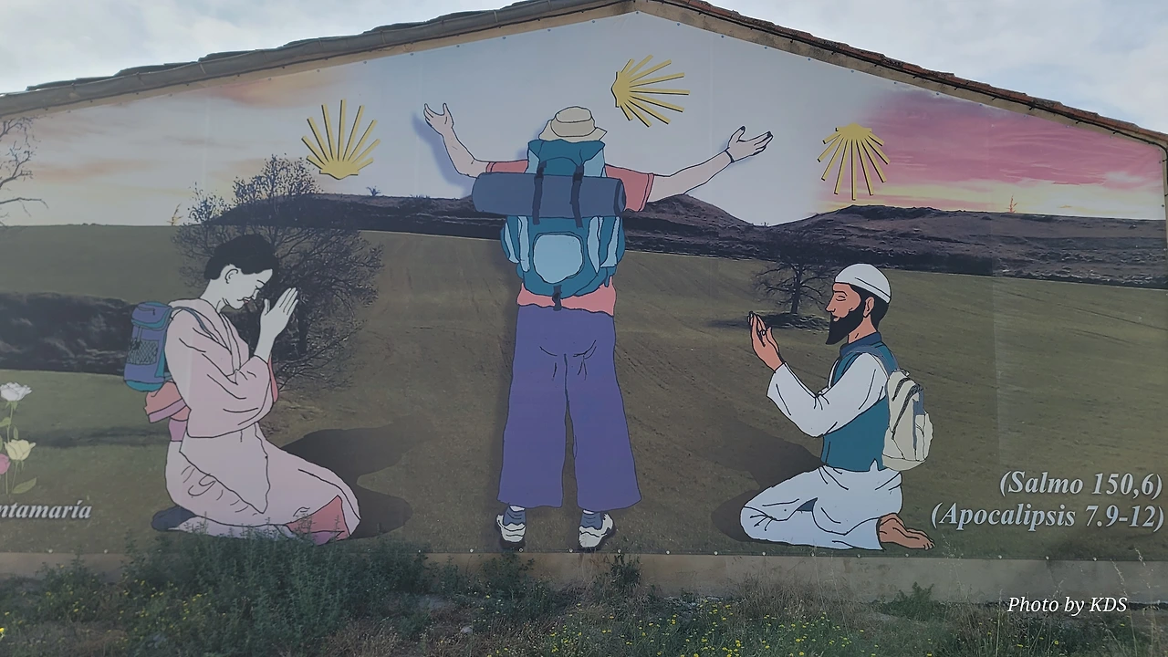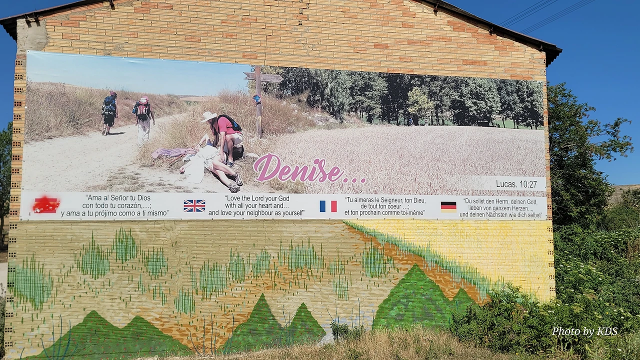<주님을 진심으로 사랑하라, 그리고 네 이웃을 네 몸처럼 사랑하라.>라는 문구가 여러 나라의 언어로 쓰여 있다. 쓸어진 순례자를 열심히 돕고 있는 다른 순례자의 모습이 보이고, 다른 두 명의 순례자는 그냥 순례길을 지나가고 있다. 순례길의 최우선이 천천히 걷되 다른 사람의 어려움을 보면 즉시 도와주는 것이다. 선을 베푸는 것이 곧 하늘의 뜻이고 그 뜻에 따르는 것이고 거기에 이르는 것이다.