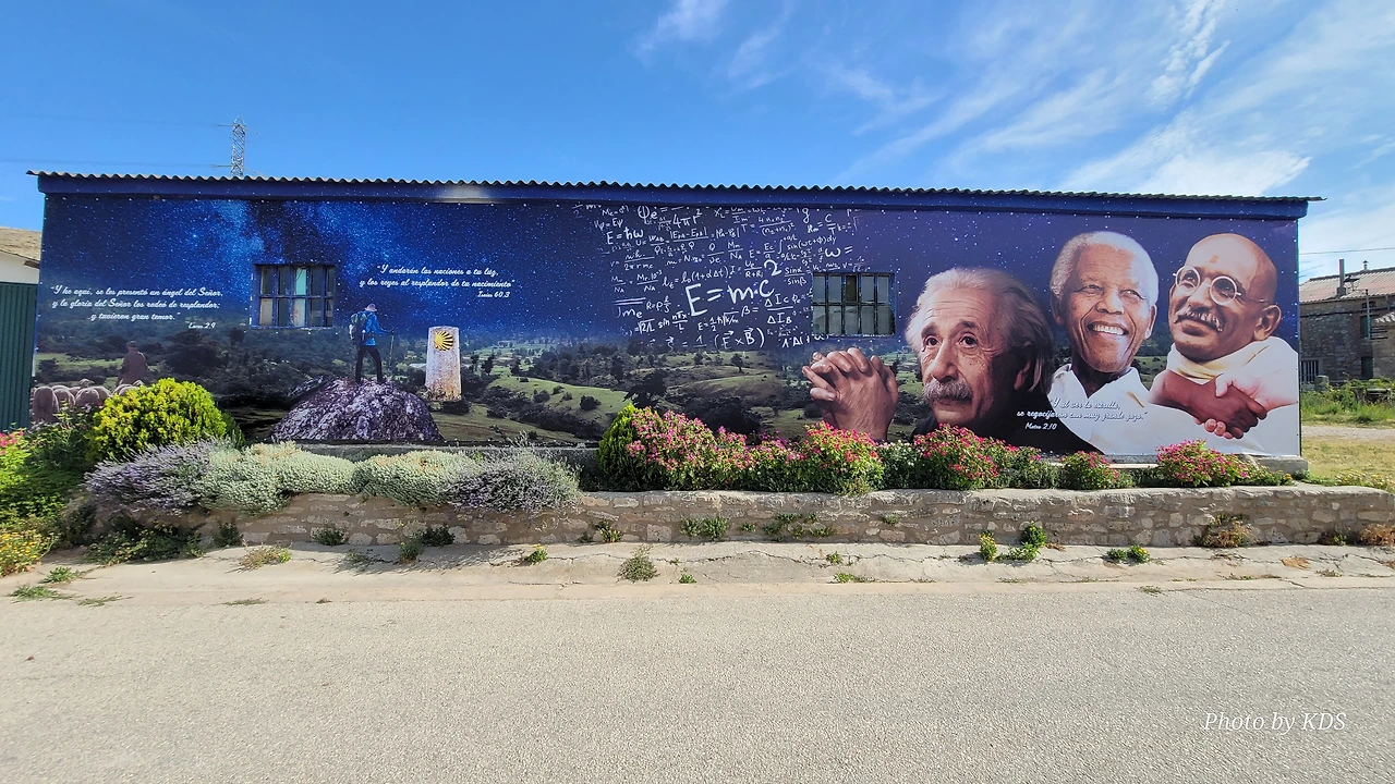 다음 집의 벽화는 더욱 난해하다. 왼쪽은 밤하늘의 은하수 별빛을 받으면서 하염없이 걷고 있는 순례자의 모습이 그즈녁하게 그려져 있다. 중간에는 아인슈타인의 상대성 이론을 설명하는 복잡한 수식과 기호가 빼곡하게 나열되어 있고, 가장 오른쪽에는 아인슈타인과 남아프리카공화국의 흑인 인권지도자 넬슨 만델라, 인도의 정신적 지도자 마하트마 간디의 얼굴이다. 이 세 가지의 그림의 연관성은 무엇이고 무슨 의미로 한 폭의 벽화에 담았는지 마냥 궁금하다.