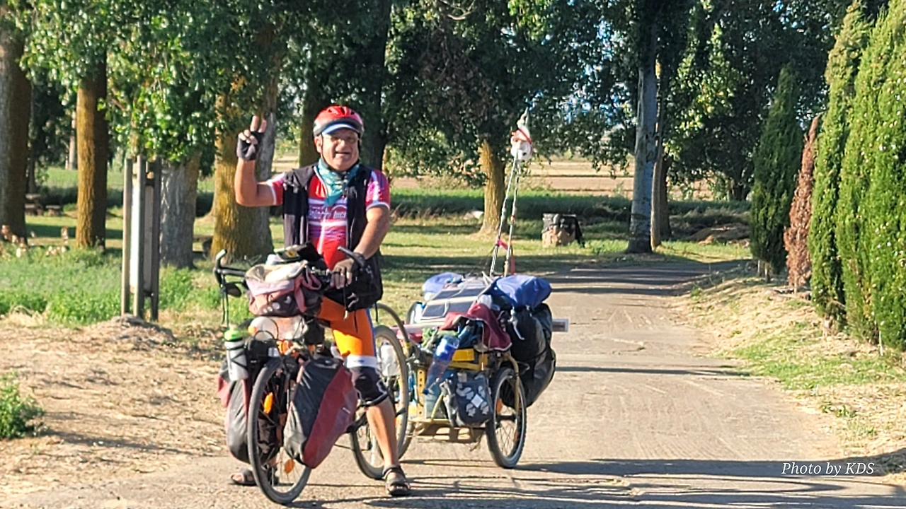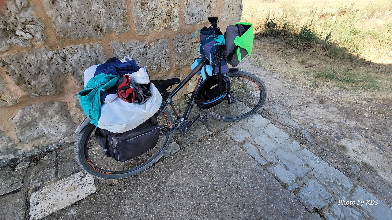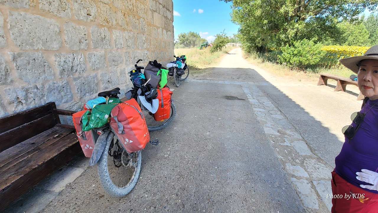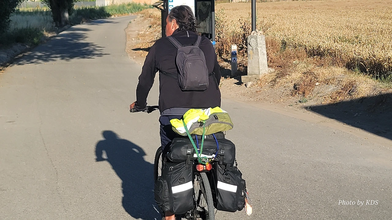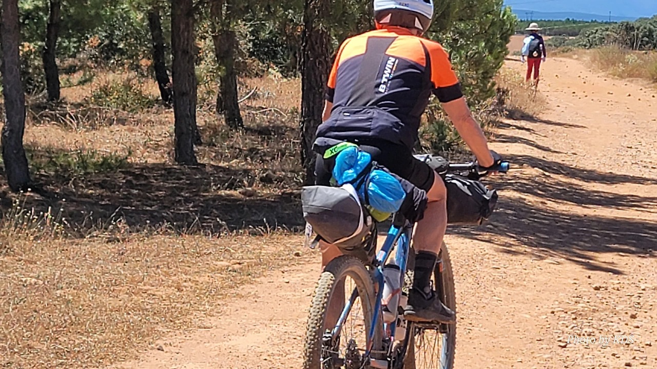 대부분의 순례객들은 무거운 배낭을 메고 두 발로 걷는다. 그런데 좁은 순례길이나 언덕의 내리막길에서 소리 없이 뒤쫓아와서 휙 하고 지나가는 자전거 순례객들로 인하여 깜짝깜짝 놀랄 때가 많다. 특히 산악지대의 좁은 내리막길에선 정말 위험하다. 자전거 순례객들은 모든 짐을 자전거에 실은 산악용 자전거(MTB : Mountain Terrain Bike)로 내달린다. 무거운 무게로 인하여 가속도가 붙으니 아찔한 속력으로 마구 질주한다. 한 명이 아니고 여럿이 일렬로 마구 달리면 건조한 순례길에 흙먼지도 많이 일으킨다. 도보 순례객에는 눈살을 찢푸리게 하는 장면이다. 그래도 터벅터벅 걷는 사람의 입장에서 보면 날쌔게 달려가는 그들이 조금 부럽다. 가끔 자전거의 체인이 끊어져서 쭈그리고 앉아서 그걸 수리하는 것을 볼 때면 오히려 처량한 모습으로도 보인다. 타이어가 펑크가 나도 마찬가지다.