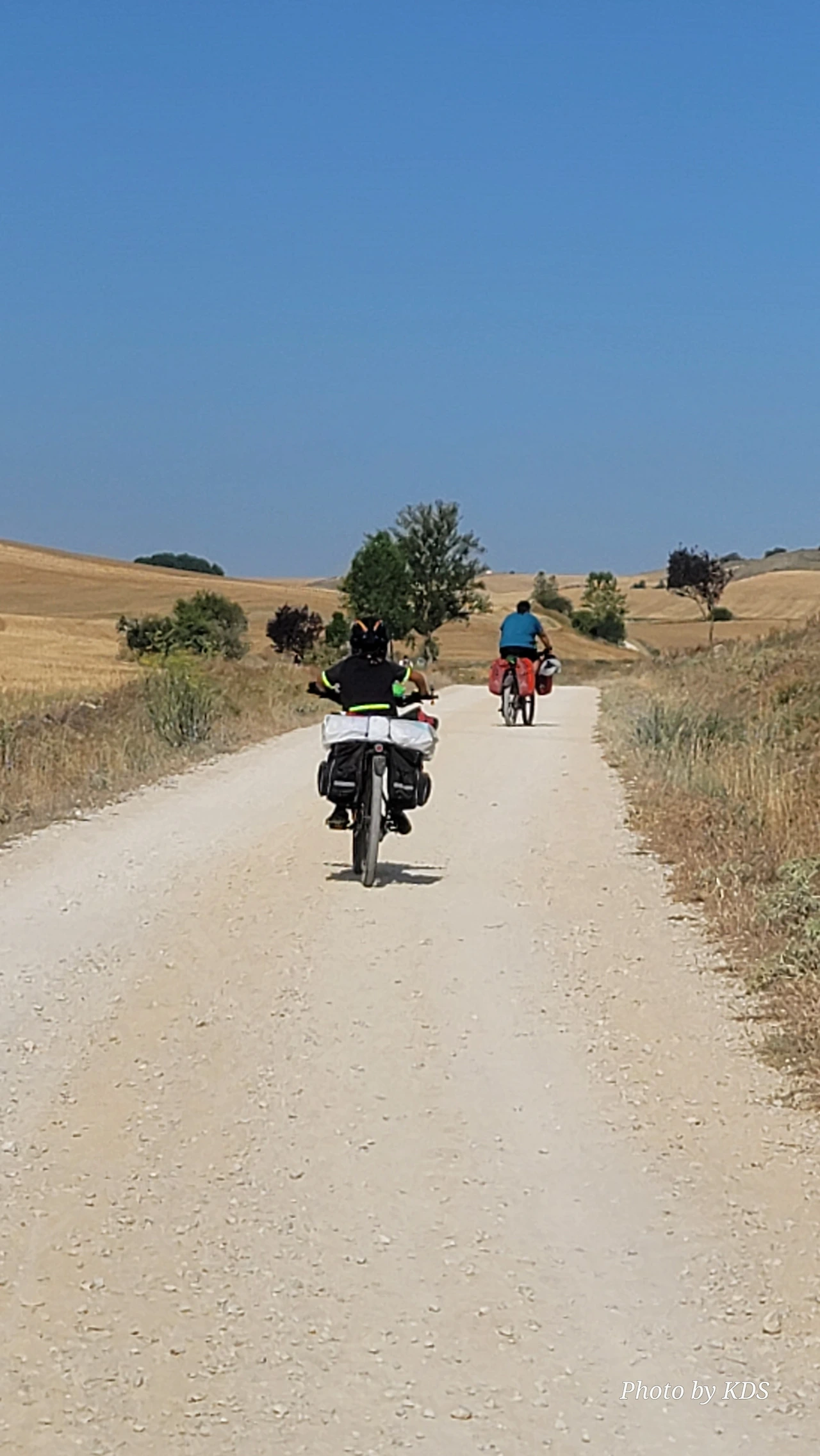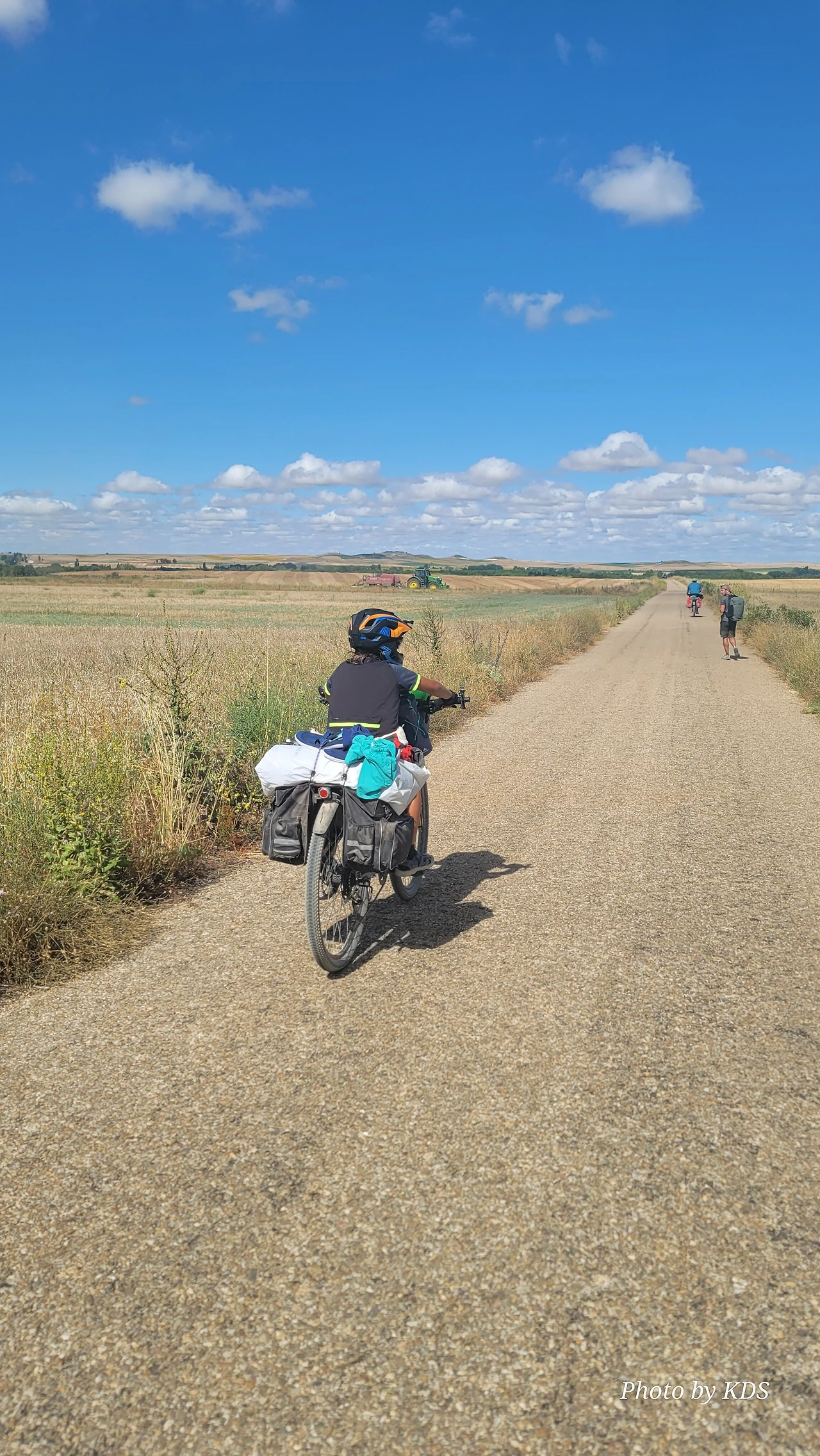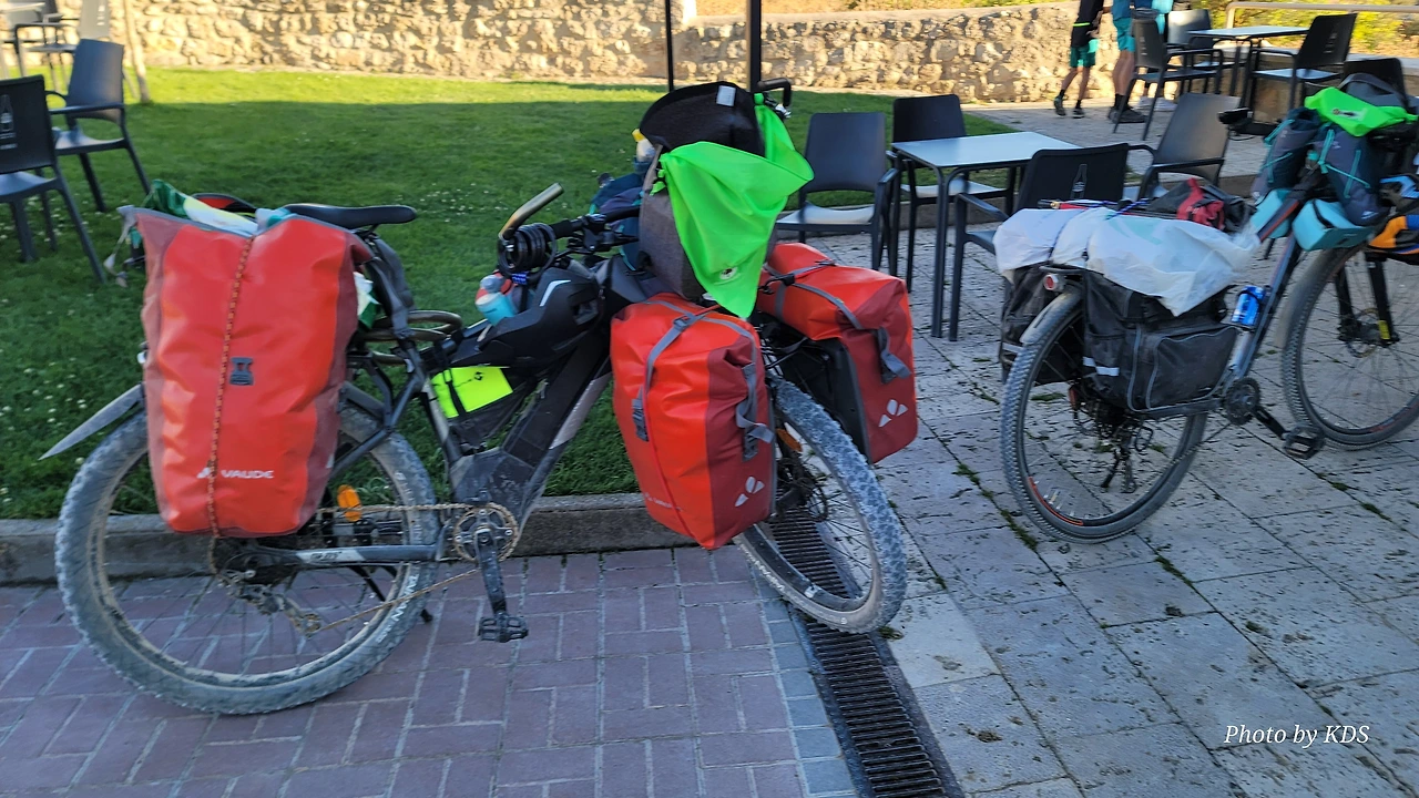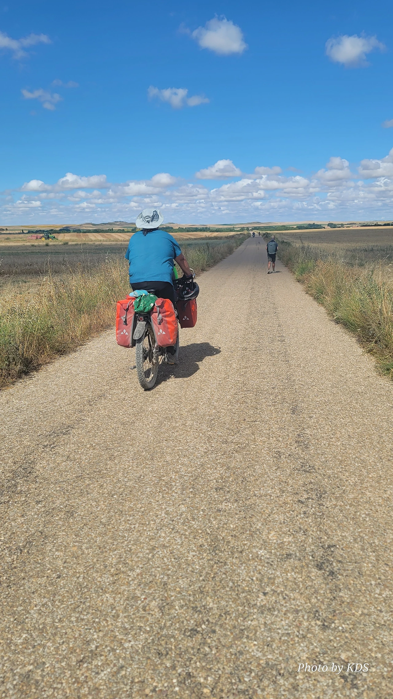 대부분의 순례객들은 무거운 배낭을 메고 두 발로 걷는다. 그런데 좁은 순례길이나 언덕의 내리막길에서 소리 없이 뒤쫓아와서 휙 하고 지나가는 자전거 순례객들로 인하여 깜짝깜짝 놀랄 때가 많다. 특히 산악지대의 좁은 내리막길에선 정말 위험하다. 자전거 순례객들은 모든 짐을 자전거에 실은 산악용 자전거(MTB : Mountain Terrain Bike)로 내달린다. 무거운 무게로 인하여 가속도가 붙으니 아찔한 속력으로 마구 질주한다. 한 명이 아니고 여럿이 일렬로 마구 달리면 건조한 순례길에 흙먼지도 많이 일으킨다. 도보 순례객에는 눈살을 찢푸리게 하는 장면이다. 그래도 터벅터벅 걷는 사람의 입장에서 보면 날쌔게 달려가는 그들이 조금 부럽다. 가끔 자전거의 체인이 끊어져서 쭈그리고 앉아서 그걸 수리하는 것을 볼 때면 오히려 처량한 모습으로도 보인다. 타이어가 펑크가 나도 마찬가지다.