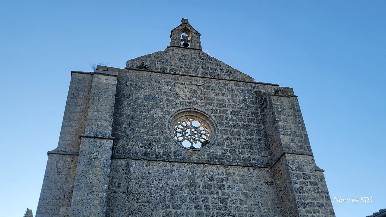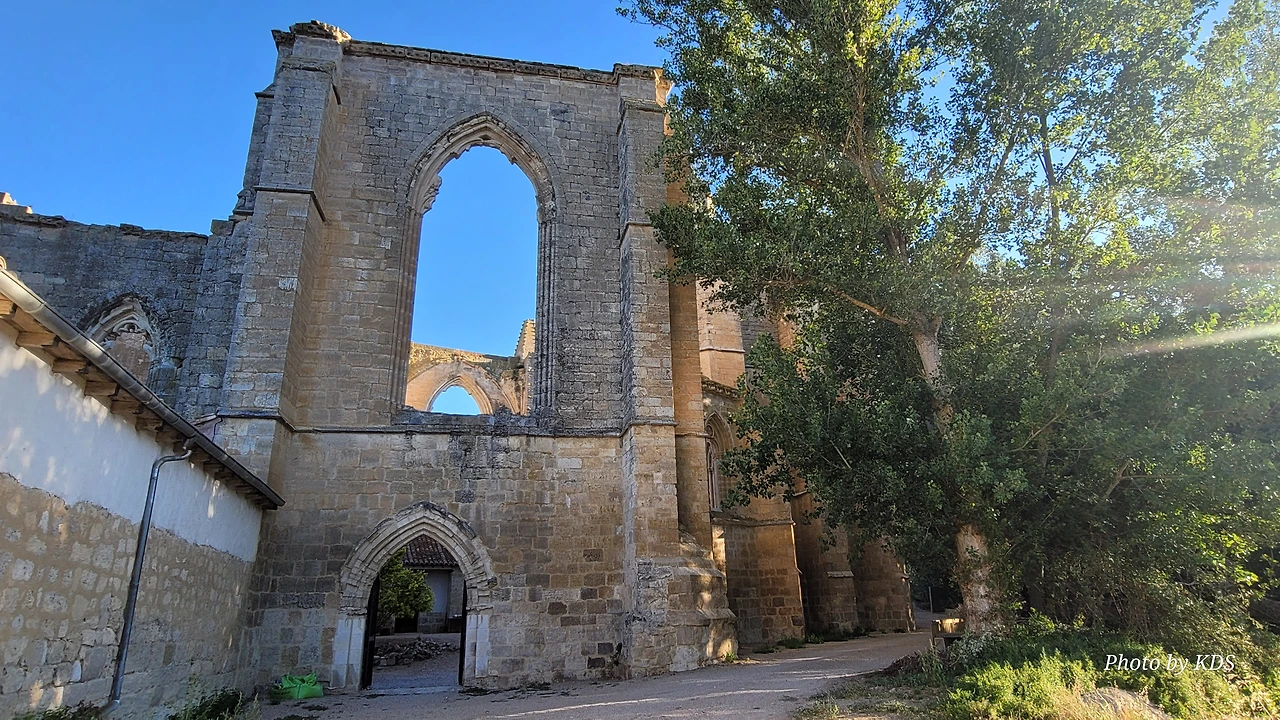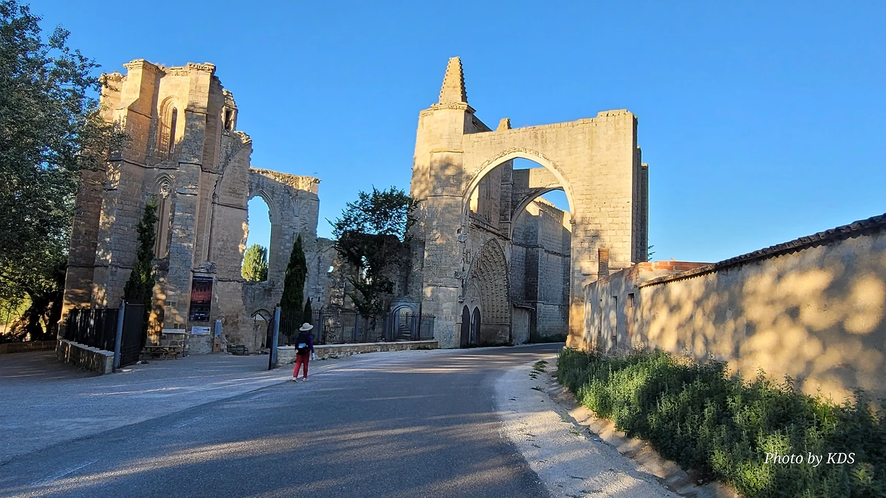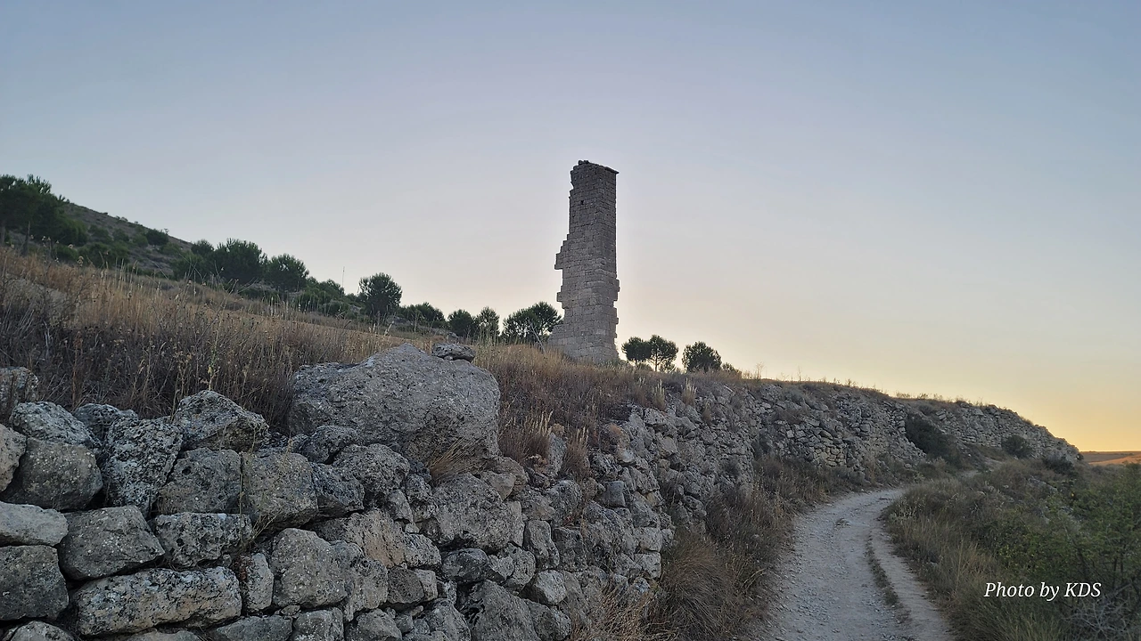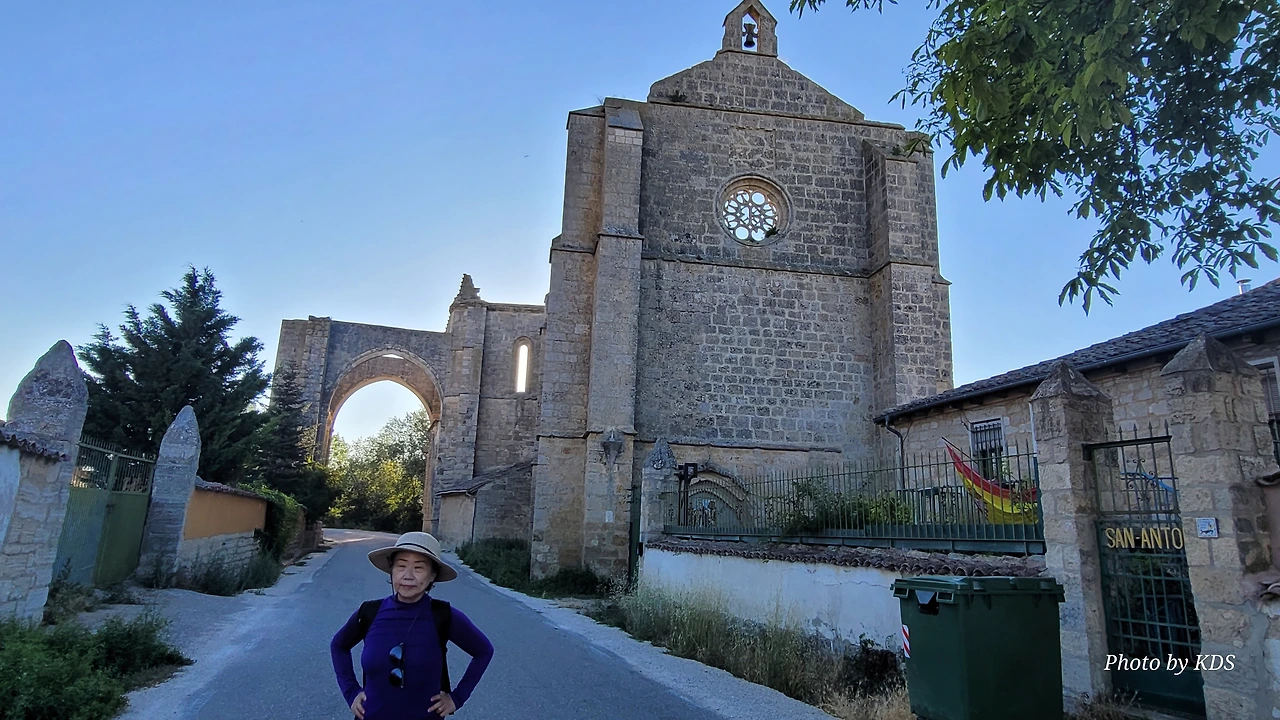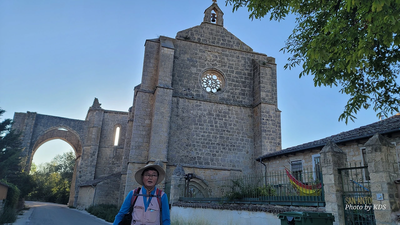 온타나스(Hontanas)에서 즐거운 밤을 보내고 7월 29일 아침 6시 40분경에 숙소를 나섰다. 오늘도 평원을 가로 딜러 걷는 길이다. 마을을 빠져나와서 가르반수엘라 시내(Arroyo de Garbanzuela)를 건너서 약간의 오르막 지대를 올라간다. 언덕의 중간쯤에 거대한 석탑 모양이 눈에 들어온다. 가까이 다가가서 보니 석탑이 아니고 허물어진 유적의 일부였다. 바로 산 비센떼 성당(Ermita de San Vicente)의 유적이다. 까스뜨로헤리스(Castrojeriz) 마을로 향하는 언덕 기슭 까미노의 오른쪽으로 서있는 건축물로 현재는 모퉁이의 벽체만 남은 유적이었다. 과거 순례길이 번창하였을 때 있었던 성당인데 이제 그 잔해만 남아 옛 영광을 기록하고 있다. 성당의 집터와 주변의 돌담은 아직도 남아 있었다. 나머지는 모두 농경지로 변했다. 벽체의 남은 부분이 곧 쓸러 질까 위태위태한 모습으로 서 있어서 조선 과객이 보기에 안타까운 모습이다.
