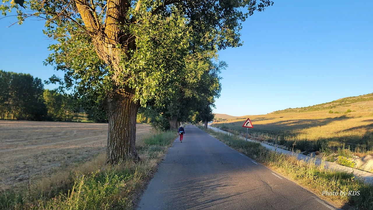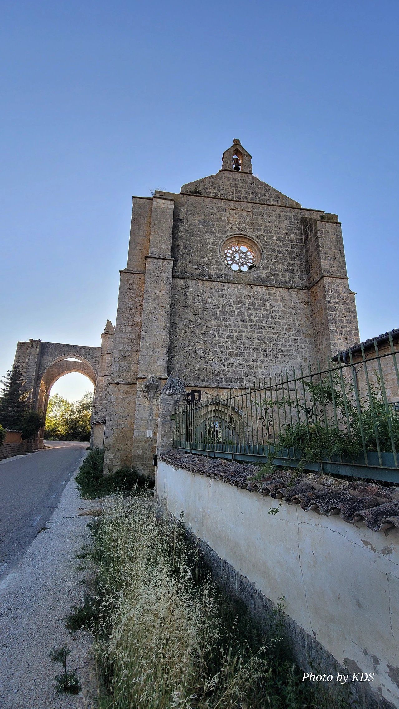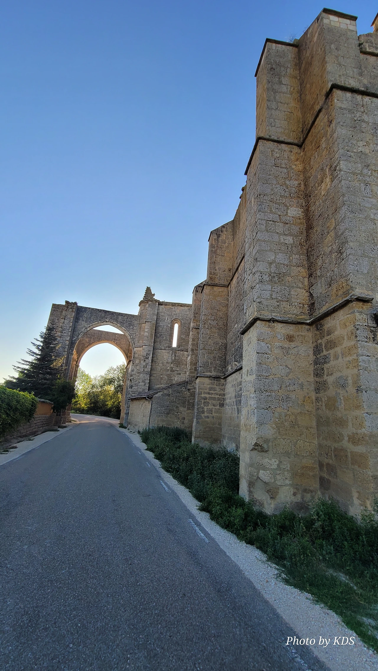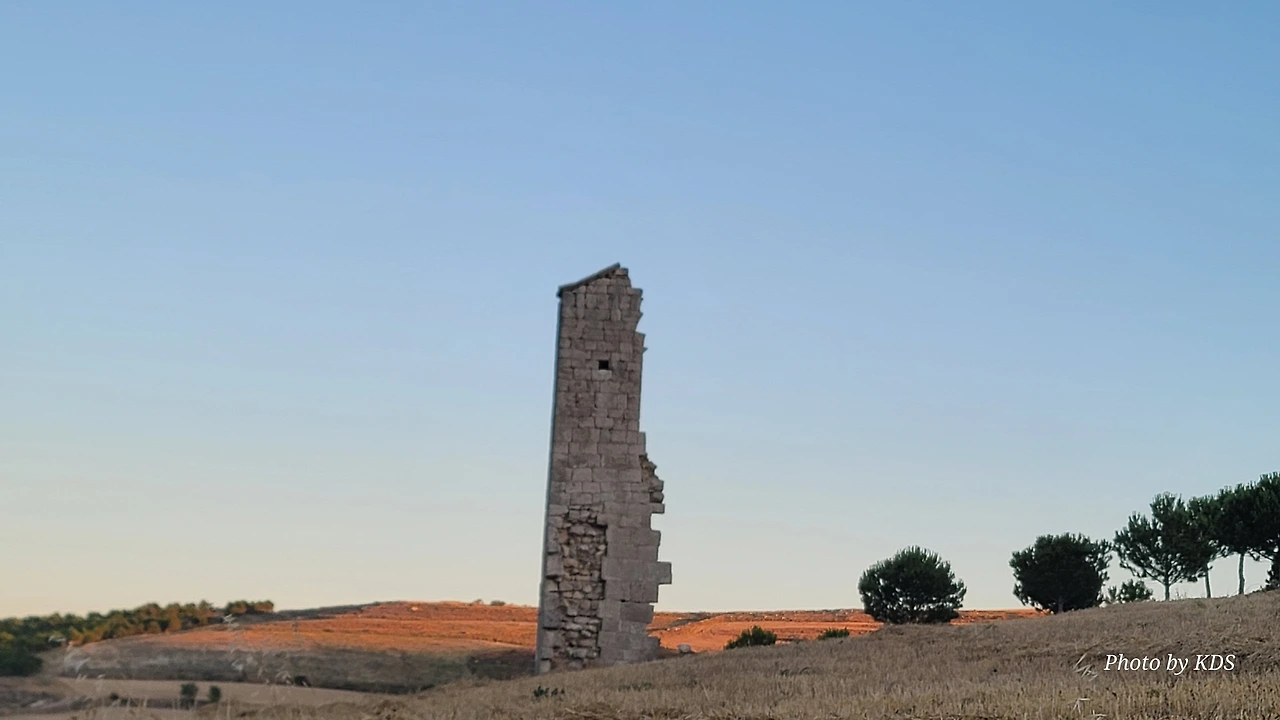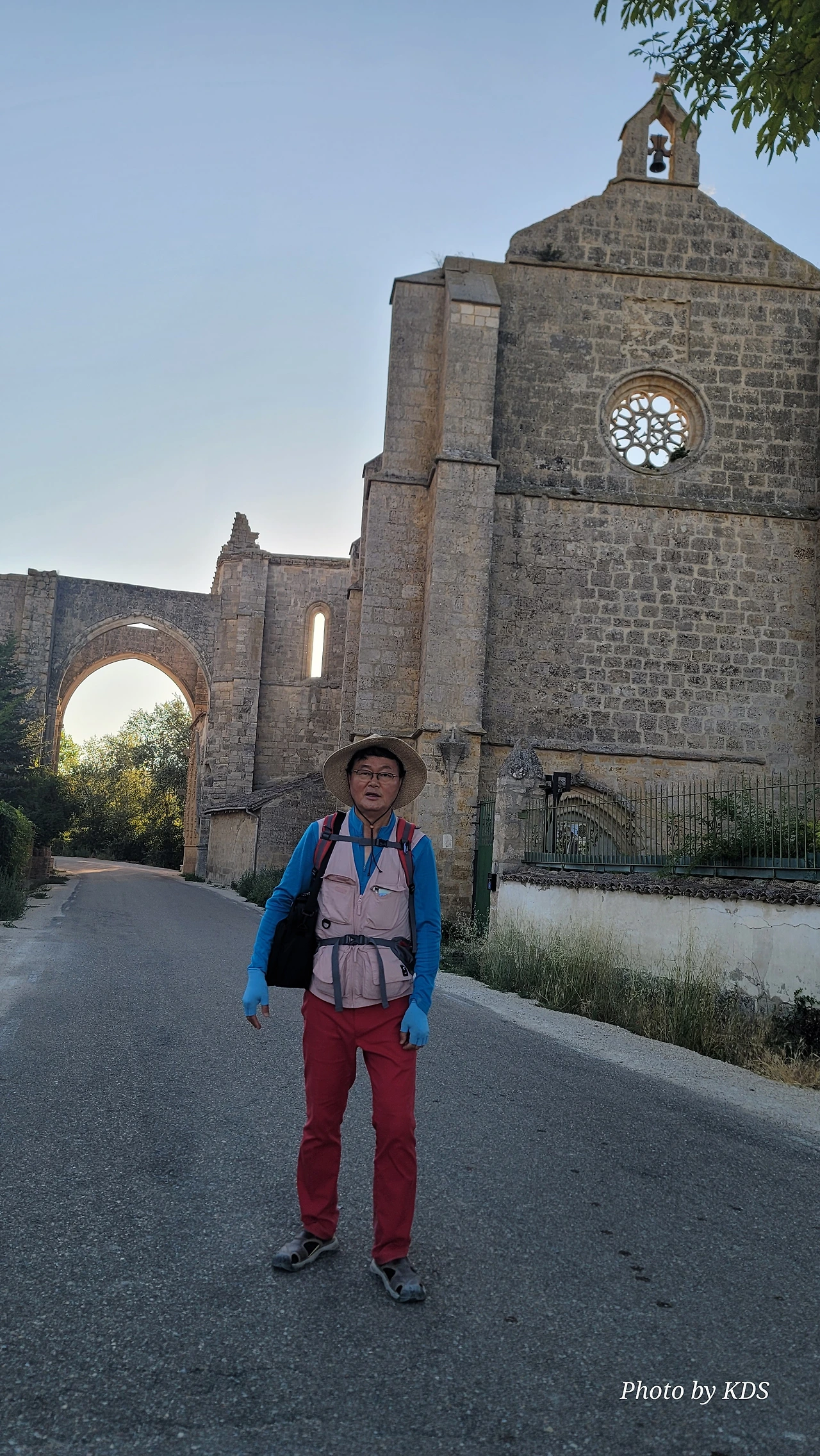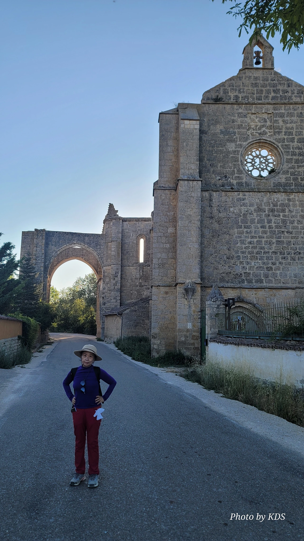 온타나스(Hontanas)에서 즐거운 밤을 보내고 7월 29일 아침 6시 40분경에 숙소를 나섰다. 오늘도 평원을 가로 딜러 걷는 길이다. 마을을 빠져나와서 가르반수엘라 시내(Arroyo de Garbanzuela)를 건너서 약간의 오르막 지대를 올라간다. 언덕의 중간쯤에 거대한 석탑 모양이 눈에 들어온다. 가까이 다가가서 보니 석탑이 아니고 허물어진 유적의 일부였다. 바로 산 비센떼 성당(Ermita de San Vicente)의 유적이다. 까스뜨로헤리스(Castrojeriz) 마을로 향하는 언덕 기슭 까미노의 오른쪽으로 서있는 건축물로 현재는 모퉁이의 벽체만 남은 유적이었다. 과거 순례길이 번창하였을 때 있었던 성당인데 이제 그 잔해만 남아 옛 영광을 기록하고 있다. 성당의 집터와 주변의 돌담은 아직도 남아 있었다. 나머지는 모두 농경지로 변했다. 벽체의 남은 부분이 곧 쓸러 질까 위태위태한 모습으로 서 있어서 조선 과객이 보기에 안타까운 모습이다.