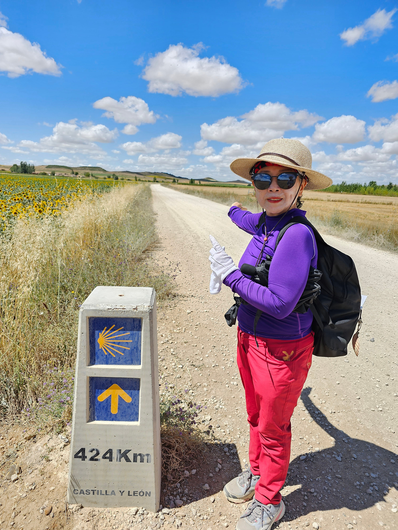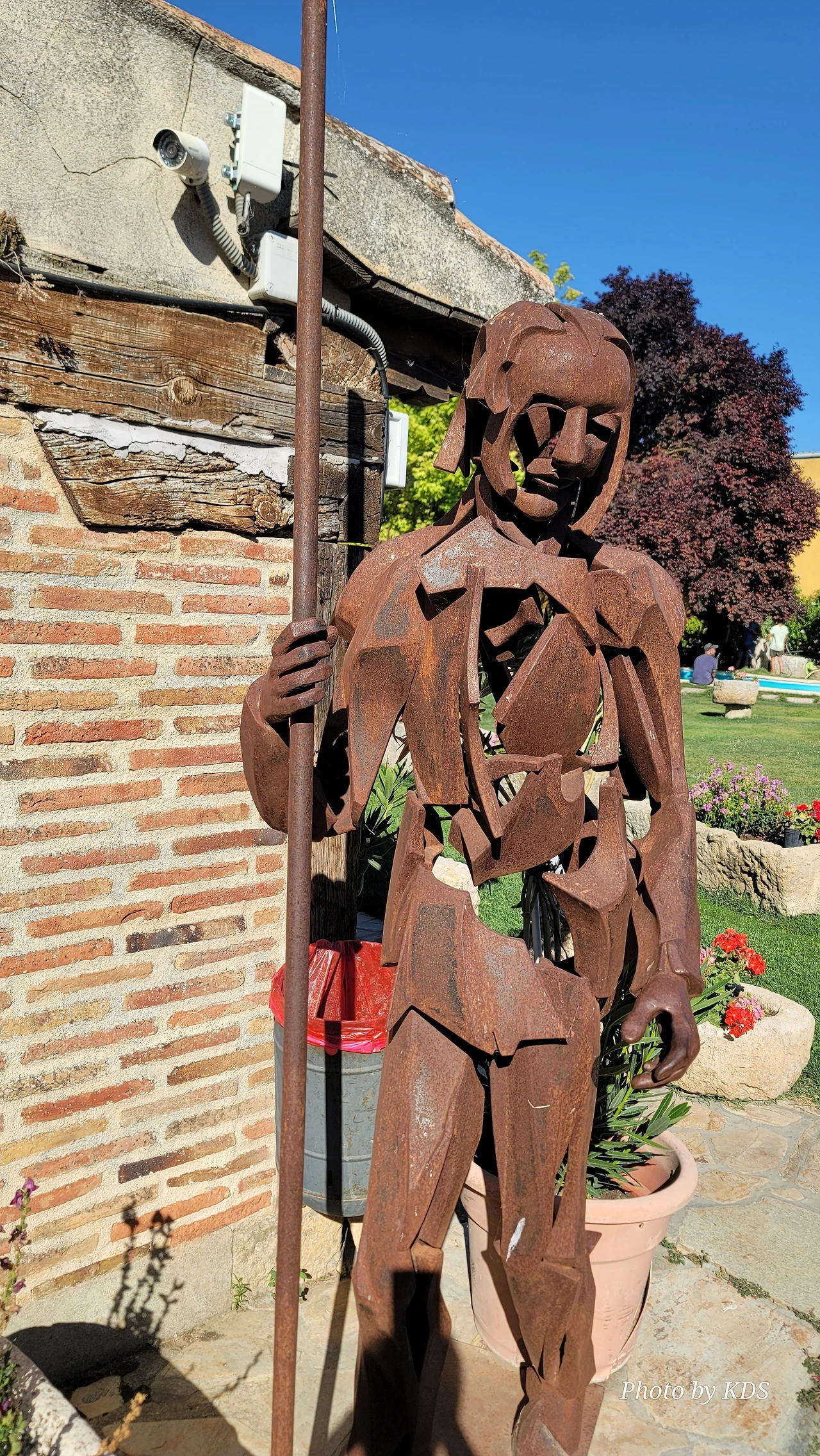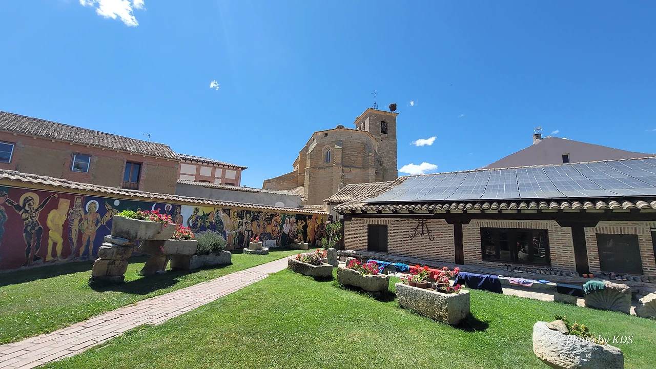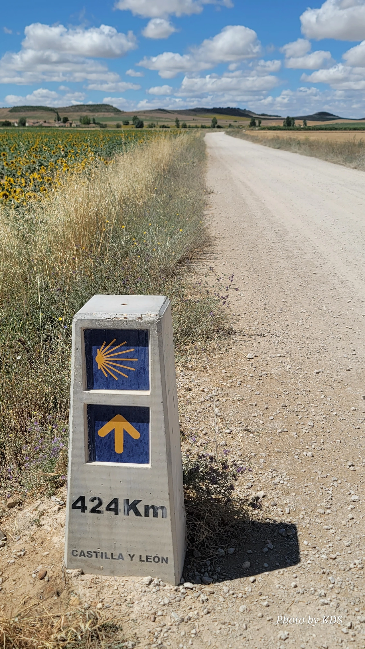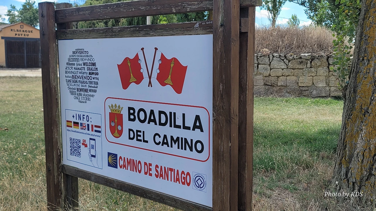 오늘 아침 온타나스(Hotanas)에서 6시 반 경에 출발하여 산 안톤(San Anton) 언덕(912m), 모스떼라레스(Mosterales) 언덕(901m), 오테로 라르호(Otero Largo) 언덕(857m) 세 개를 넘어서 26Km를 걸어서 숙박지인 보아디야 델 카미노(Boadilla del Camino) 마을에 도착했다. 중간에 여러 개의 마을을 지나온 것은 물론이다. 가장 인접 마을인 이떼로 데 라 베가(Itero de la vega) 마을에서 6.6Km 떨어진 거리이다. 길은 그리 힘들지 않고 메세타(Meseta) 순례길의 전형이다. 중간에 피수에르가 운하(Canal del Pisuerga)를 건너서 오는 코스이다. 길옆으로 운하의 수로가 가로지르기도 하고 같은 방향으로 뻗어 있기도 하다. 약간 언덕에서 보아디야 델 까미노 마을을 바라보면 띠에라 델 깜뽀(Tiera del Campo)의 지평선 너머로 높은 성당 건물이 보인다. 마을에는 벽돌로 지은 전통 가옥과 진흙으로 만든 담이 보존되어 있다. 이 마을 근처에서는 돌을 구하기가 힘들었기 때문에 성당과 가정의 주택도 모두 벽돌로 지어졌다고 한다. 성당의 내진부와 심판의 기둥, 중세식 발코니는 까미노에서 가장 그림 같은 풍경을 만들어 준다. 보아디야 델 까미노에서는 소빠스 데 아호(Sopas de Ajo)라는 마늘 수프와 양젖으로 만든 치즈, 꼬시도(Cocido)라고 부르는 여러 부위의 고기를 삶은 요리나 새끼 양 구이 요리 등을 맛볼 수도 있다. 그런데 그것도 기회를 잘 타야 가능하다. 순례길 중간에 카미노 424Km 남았다는 표지판이 있어서 한결 기분이 좋다. 이제 거의 절반을 걸었다는 안도감이다.