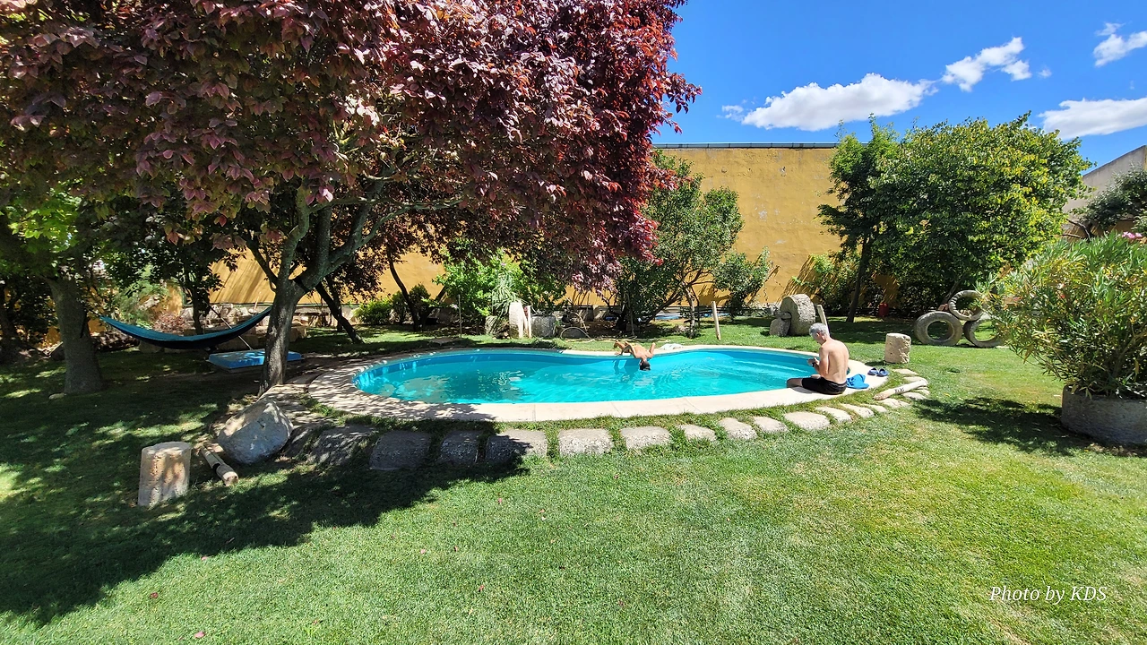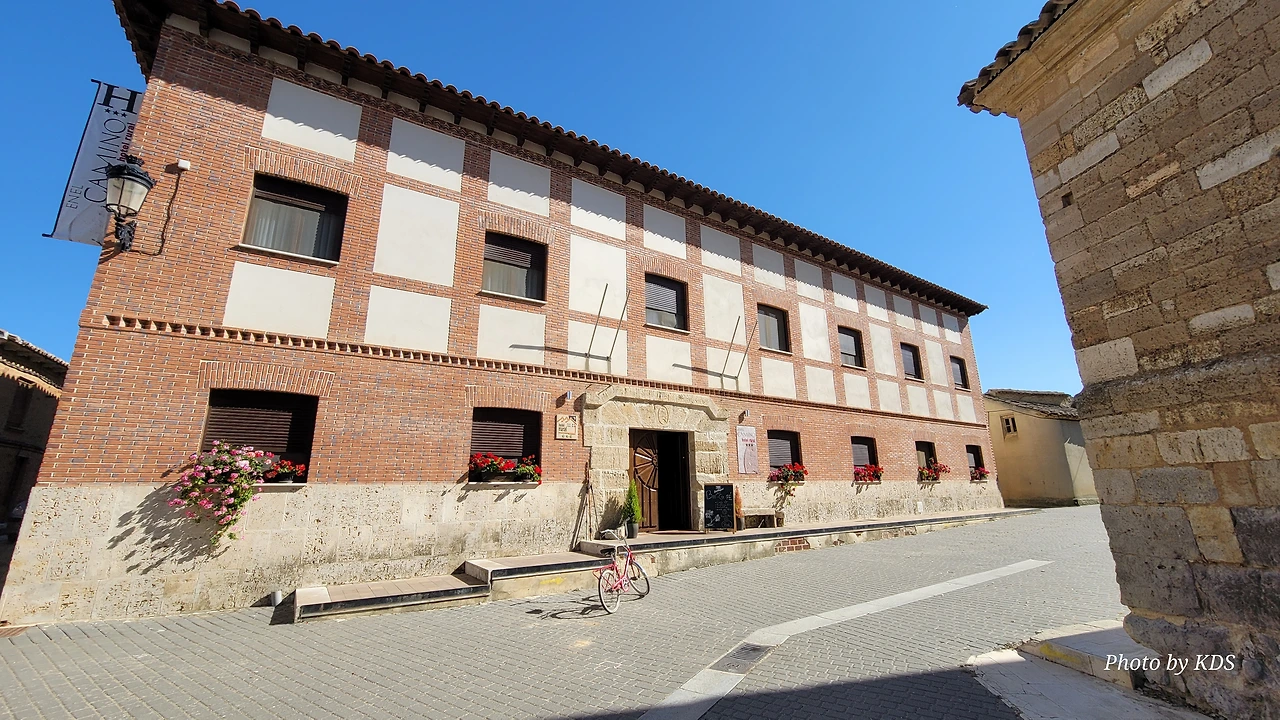 성당과 마을을 한 바퀴 둘러보고 이 마을에서 가장 규모가 큰 엔 엘 카미노(En el Camino) 알베르게에 숙소를 잡았다. 이 알베르게는 레스토랑과 호텔, 알베르게를 같이 운영하는 큰 곳이다. 순례객들이 묵는 알베르게 건물은 아주 오래된 낡은 건물인데 약간 어두침침하고 칙칙한 기분이 들었다. 그러나 정원은 잘 가꾸어져 있고 정원에 야외 수영장이 있어서 먼저 도착한 남녀 순례객들이 빨래를 마치고 수영복 차림으로 수영장에서 옹기종기 모여 있었다. 일부 서양 순례객 젊은 남녀의 과도한 애정 행각도 눈살을 찌푸리게 하지만 그들은 전혀 상관이 없는 듯하다. 너무 과도한 장면들을 찍을 수가 없어서 저녁때쯤에 수영장이 한산할 때 한 두 컷을 찍었다. 식사는 알베르게에서 할 수 없고, 저쪽으로 조금 떨어진 호텔 건물의 레스토랑에서 단체로 순례객 저녁 식사가 제공되었다.