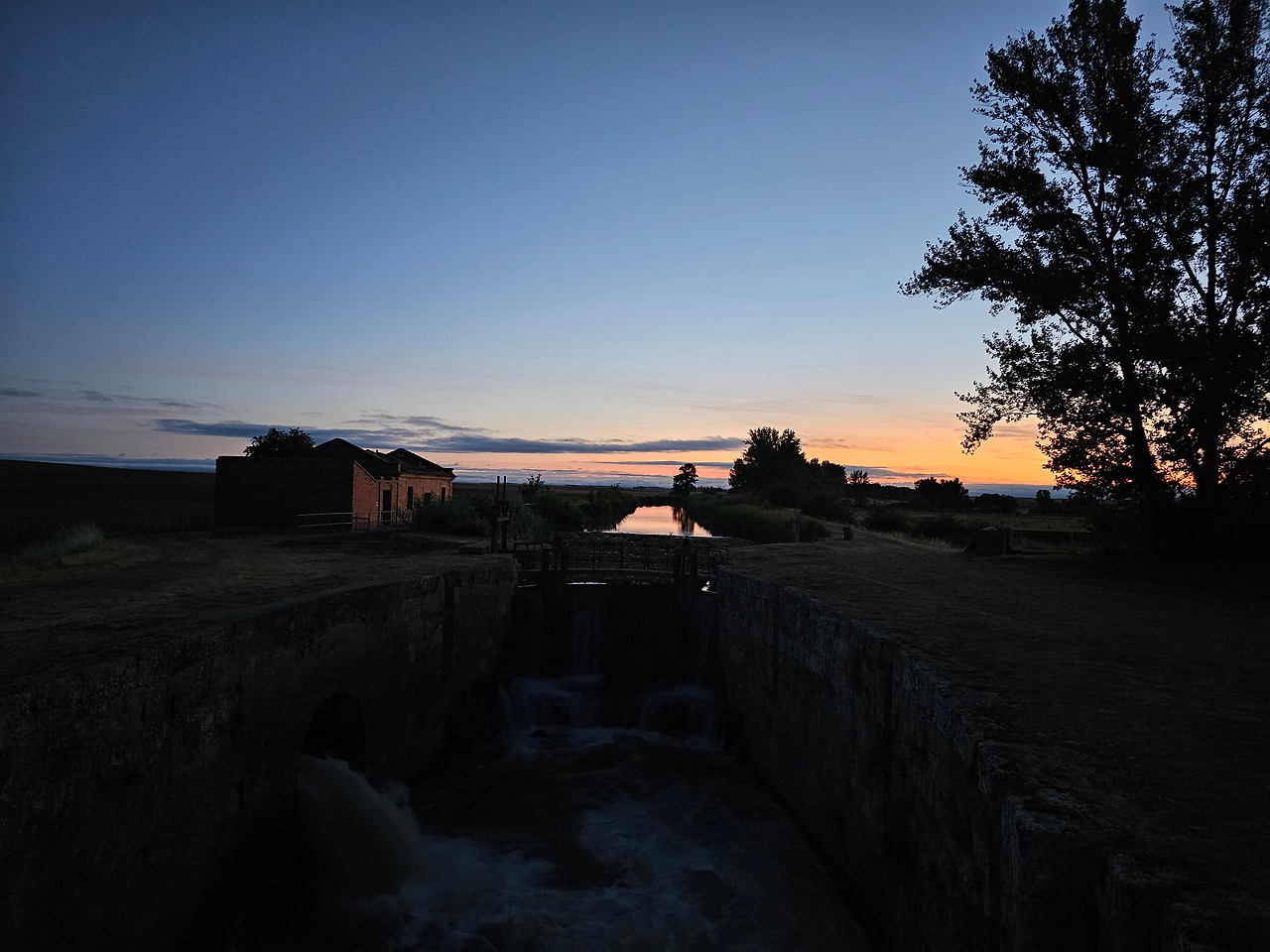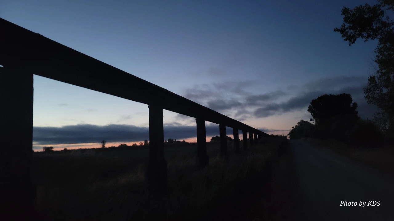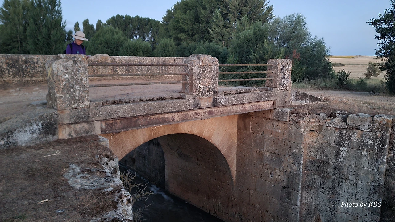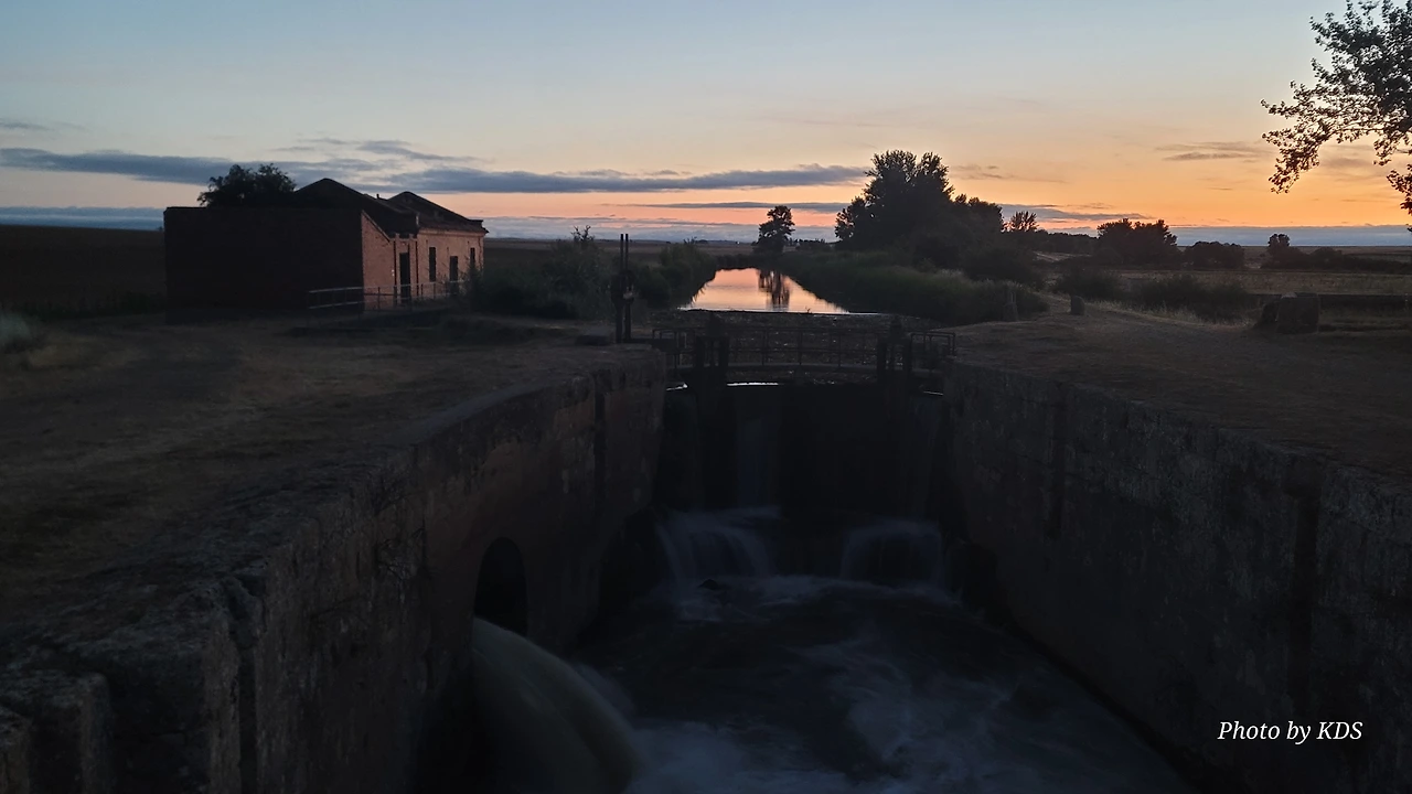 스페인 사람들은 이 지역을 띠에라 데 깜뽀스(Tierra de Campos) 즉 농장의 들판 정도의 뜻이겠다. 프로미스타(Fromista) 마을 이름이 고대 라틴어로는 곡물이라는 뜻이라니까 이 주변이 곡창지대임에 틀림없다. 어젯밤에 잠을 잔 보아디야 델 카미노(Boadilla del Camino)에서 새벽 6시에 출발하였다. 아직 날이 밝지 않아서 온 세상이 어둑어둑한 가운데 랜턴을 켜서 길을 찾아 걷는다. 아득히 먼 저쪽에서 먼동이 조금씩 터오고 있는 중이다. 평평한 밀밭 지역인 띠에라 데 깜보스를 5Km가량 걸어오면 카스티야 운하(Canal de Castilla) 지역에 도달한다. 이곳에 카스띠야 운하의 갑문(Esclusa)이 있다. 순례길에 바로 붙어 있어서 컴컴한 와중에 콸콸거리는 물소리와 물줄기가 그나마 장관을 이루어서 구경을 하면서 사진 몇 컷을 찍으려고 잠시 머물렀다. 그런데 그게 정말 패착(敗着)이었다. 이곳이 극성 모기떼 서식지였다. 어두워서 잘 몰랐는데 그들로부터 집단 공격을 받고서야 재빨리 그 지역을 벗어났다.