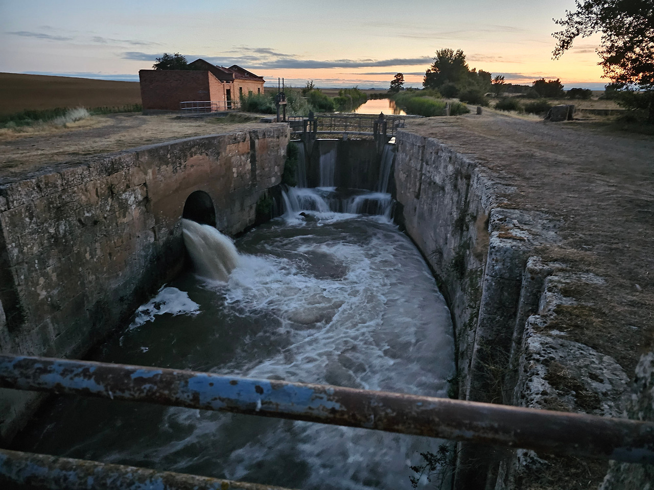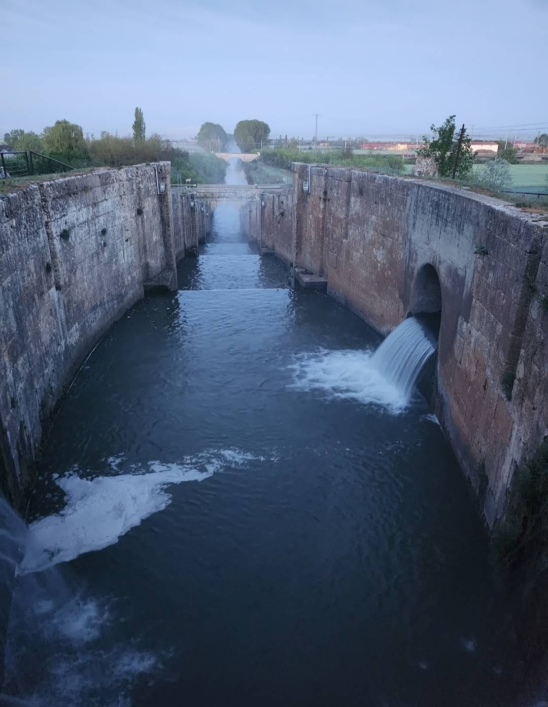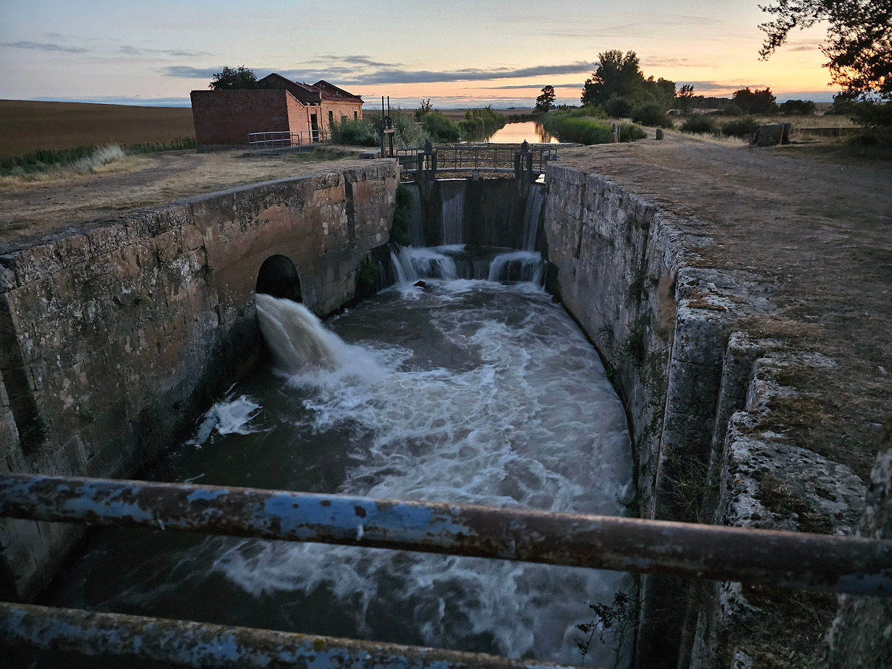 스페인 사람들은 이 지역을 띠에라 데 깜뽀스(Tierra de Campos) 즉 농장의 들판 정도의 뜻이겠다. 프로미스타(Fromista) 마을 이름이 고대 라틴어로는 곡물이라는 뜻이라니까 이 주변이 곡창지대임에 틀림없다. 어젯밤에 잠을 잔 보아디야 델 카미노(Boadilla del Camino)에서 새벽 6시에 출발하였다. 아직 날이 밝지 않아서 온 세상이 어둑어둑한 가운데 랜턴을 켜서 길을 찾아 걷는다. 아득히 먼 저쪽에서 먼동이 조금씩 터오고 있는 중이다. 평평한 밀밭 지역인 띠에라 데 깜보스를 5Km가량 걸어오면 카스티야 운하(Canal de Castilla) 지역에 도달한다. 이곳에 카스띠야 운하의 갑문(Esclusa)이 있다. 순례길에 바로 붙어 있어서 컴컴한 와중에 콸콸거리는 물소리와 물줄기가 그나마 장관을 이루어서 구경을 하면서 사진 몇 컷을 찍으려고 잠시 머물렀다. 그런데 그게 정말 패착(敗着)이었다. 이곳이 극성 모기떼 서식지였다. 어두워서 잘 몰랐는데 그들로부터 집단 공격을 받고서야 재빨리 그 지역을 벗어났다.