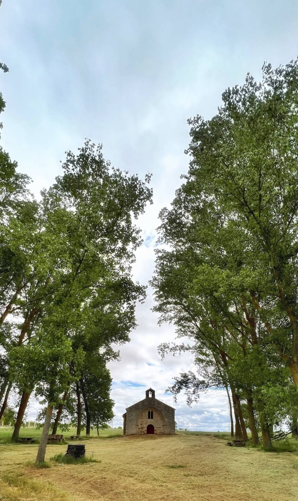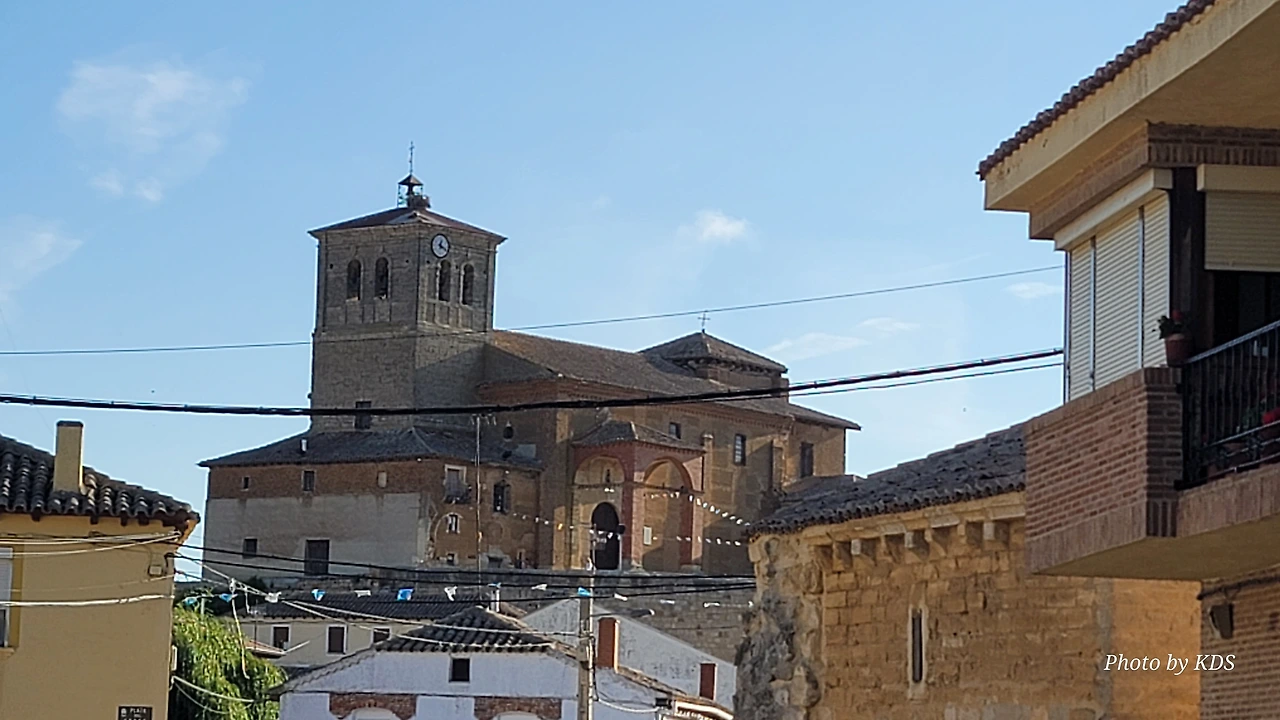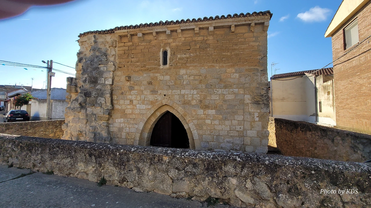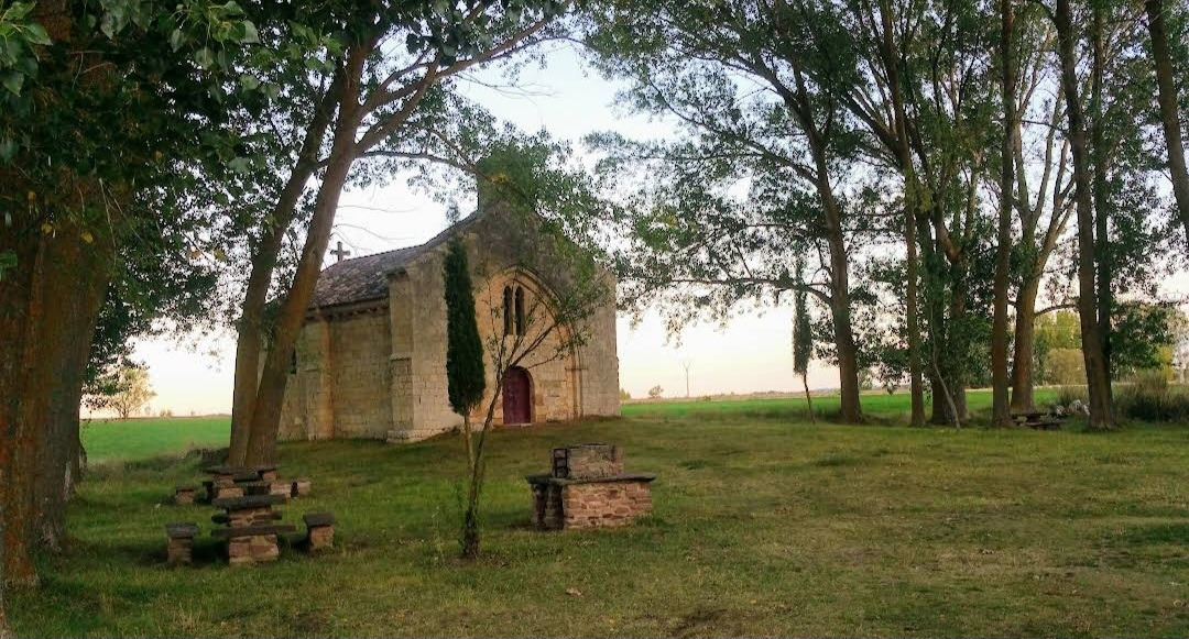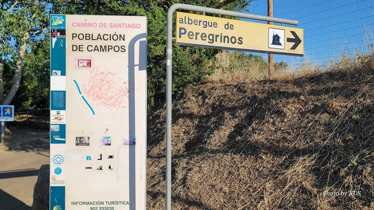 프로미스타(Fromista)에서 약 4Km가량 걸어오면 뽀블라시온 데 캄뽀스(Poblacion de Campos) 마을에 당도하게 되는데, 걷는 길은 아주 평이한 벌판이다. 밀밭이 주류를 이루고 있다. 마을 입구에는 오래된 작은 성당이 나무 숲 속에 아담하게 자리 잡고 있다. 이것이 바로 산 미겔 소성당(Ermita de San Miguel)이다. 13세기 로마네스크 양식에 초기 고딕 양식이 첨가되어 건축되었다. 내부에는 기사도 복장을 한 조형물이 설치되어 있다. 이 나무 숲에는 순례자들의 쉼터도 갖추어져 있다. 아래 사진의 바퀴가 달린 커다란 철 구조물은 밀밭이나 옥수수 밭에 물을 뿌리는 스프링 쿨러 시설이다.