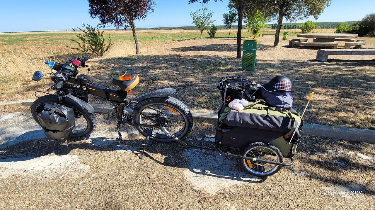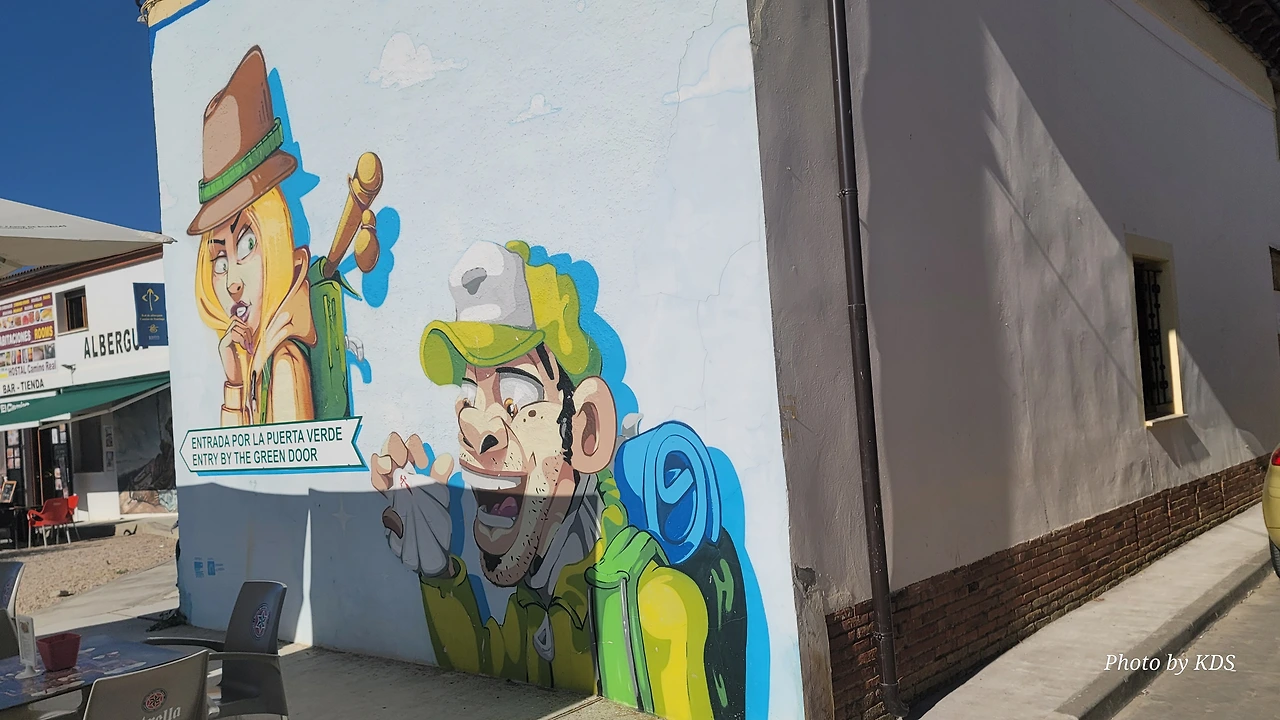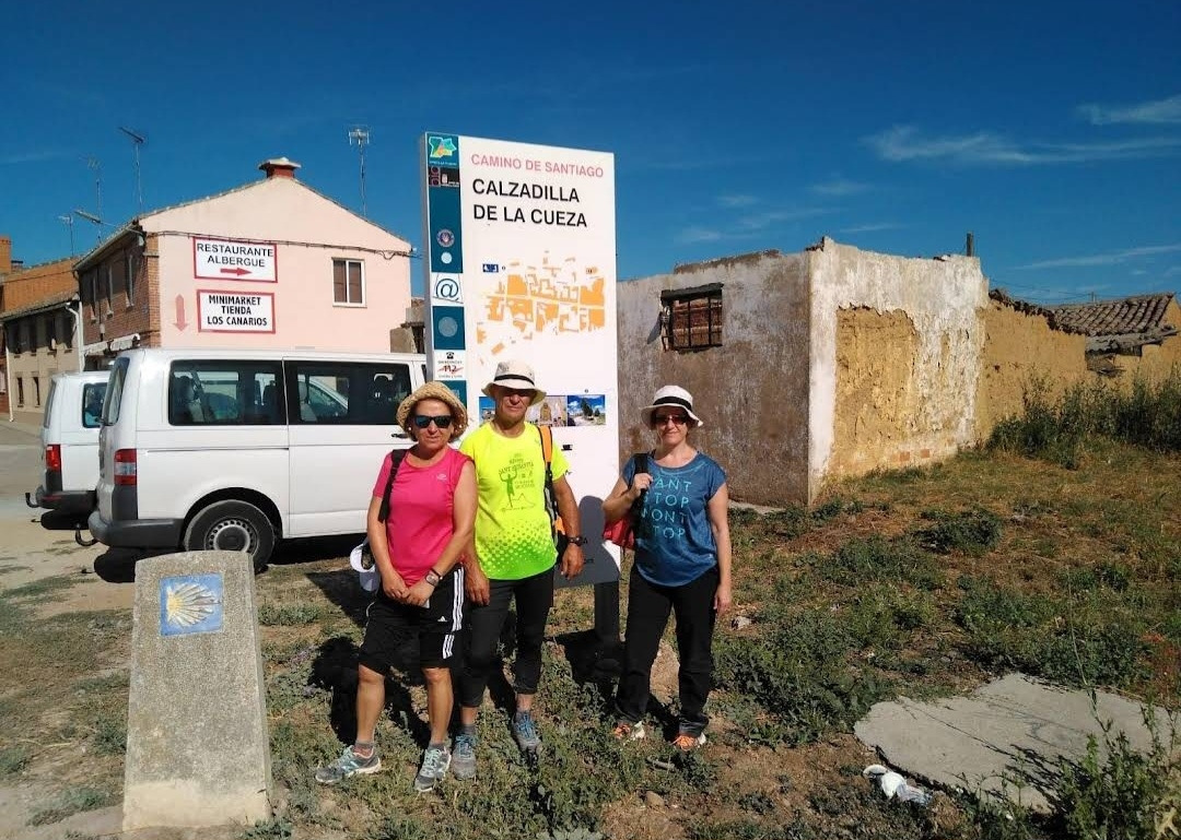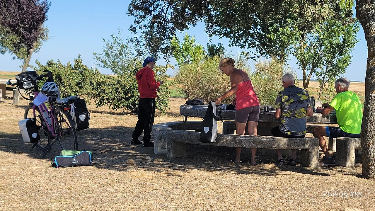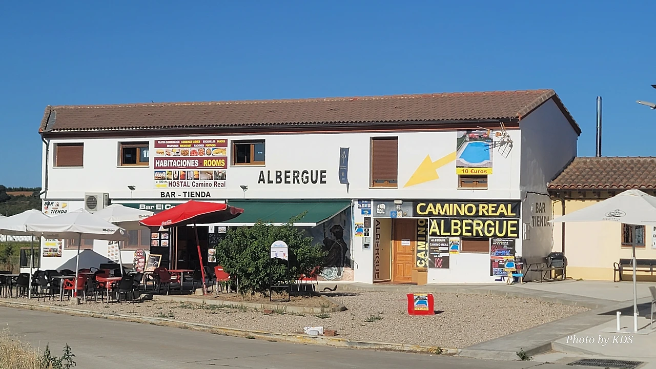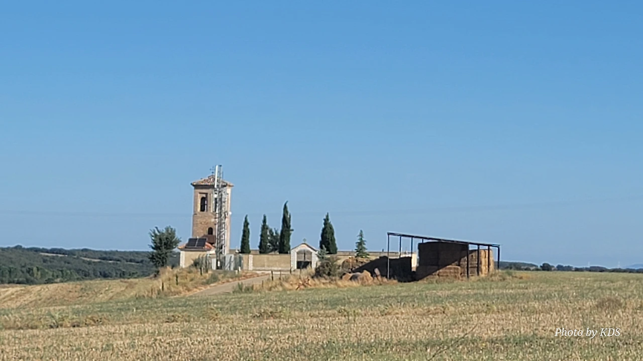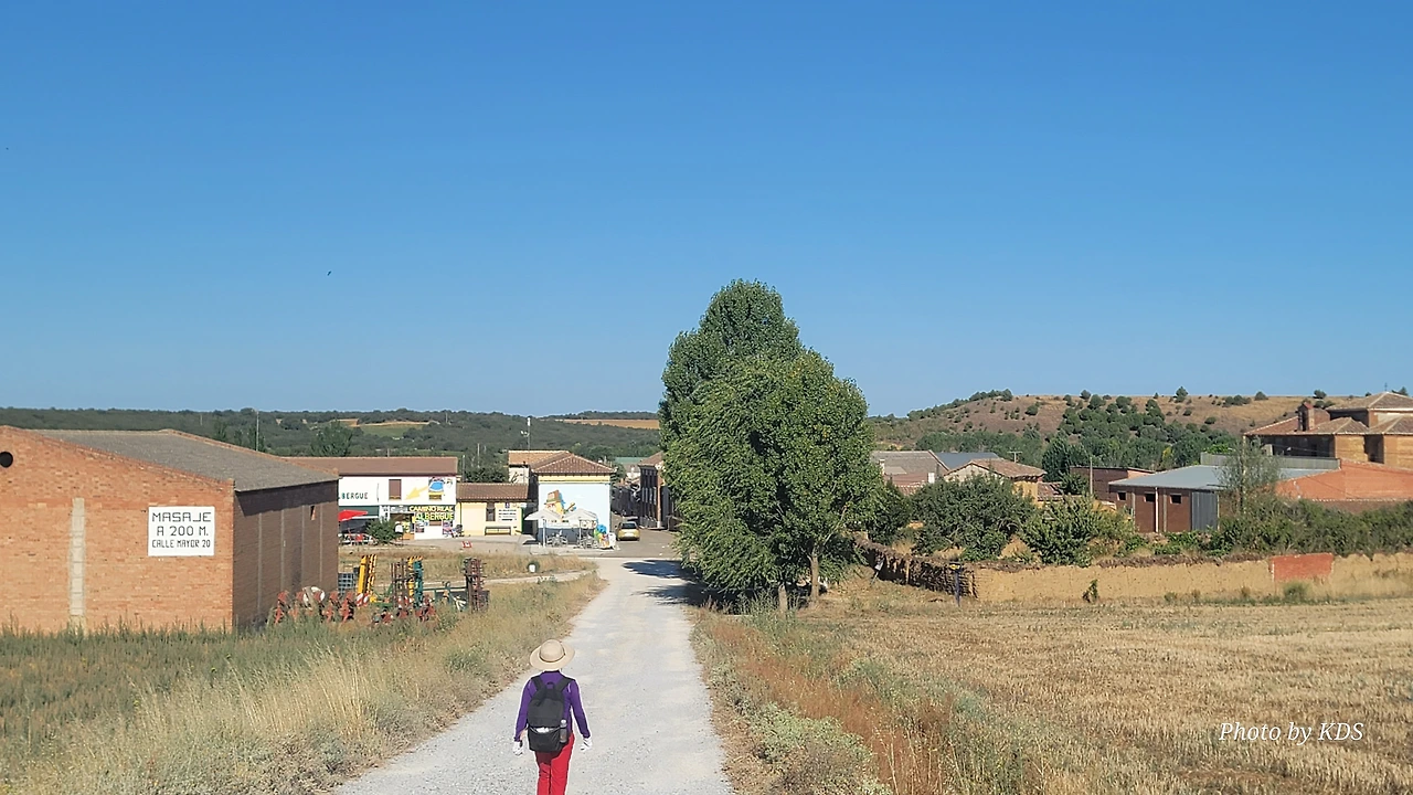 깔사디야 데 라 꾸에사(Calzadilla de la Cueza)은 까리온 데 로스 꼰데스(Carrion de los Condes) 마을에서 17Km 가량 떨어져 있는 곳이다. 해발 800m가 넘는 고원 지대의 평원을 하염없이 걸으면 나오는 첫 번째 마을이다. 마을 규모도 아주 작고 특별한 건축물이나 인상적인 조형물도 별로 없어서 아주 소박한 마을이다. 그런데 이렇게 작은 마을인데도 순례자를 위한 알베르게는 3개씩이나 있었다. 아를에는 아담한 벽돌집들이 있도. 성당은 산 마르띤 교구 성당(Iglesia Parroquial de San Martin) 하나가 있다. 성당 내부는 들어가 볼 수 없었다. 마을 외곽에 공동묘지가 조성되어 있었다. 마을 주변에도 볼 만한 것들이 없고, 다음 마을인 레디고스(Ledigos)까지는 6Km이다. 카미노 전통길을 제쳐두고 아스팔트 포장길인 N120번 도로를 타고 걸었더니 중간에 쉼터가 크게 조성되어 있었다. 도로 주변에 있는 쉼터라서 도보 순례객은 우리 밖에 없고, 모두가 자전거 순례객들이었다. 자전거에 트레일러를 매달고 순례하는 사람도 있었다. 텐트 등 짐도 많이 실을 수 있어서 캠핑 순례용으로 상당히 매력적인 느낌이다.