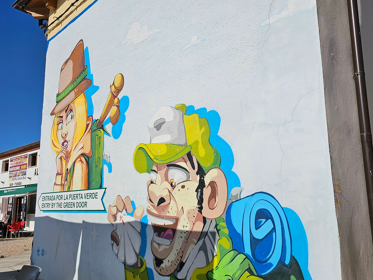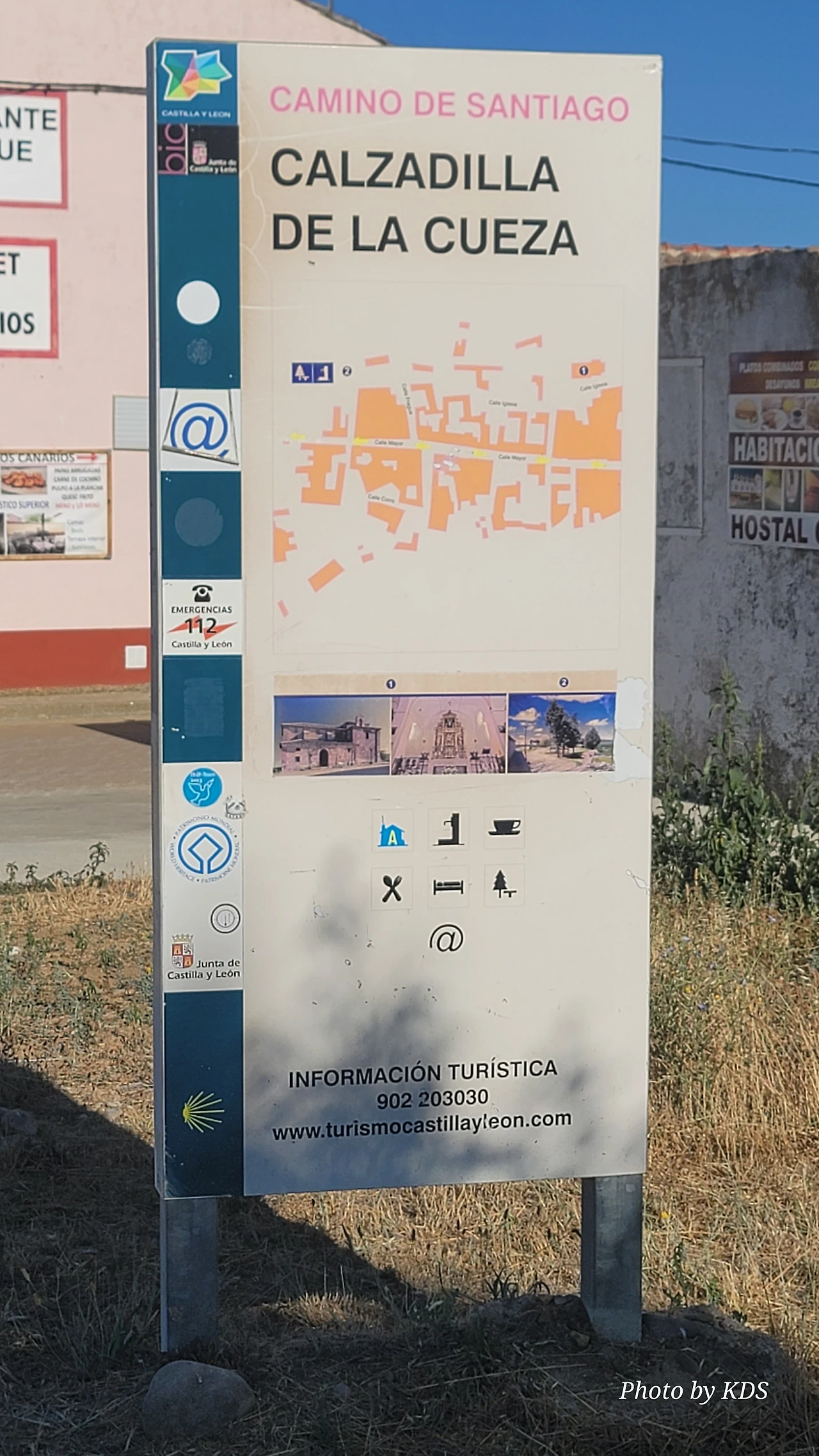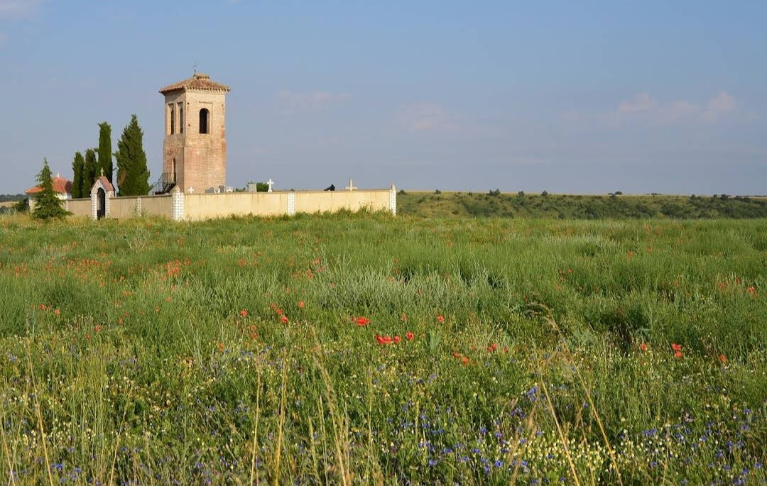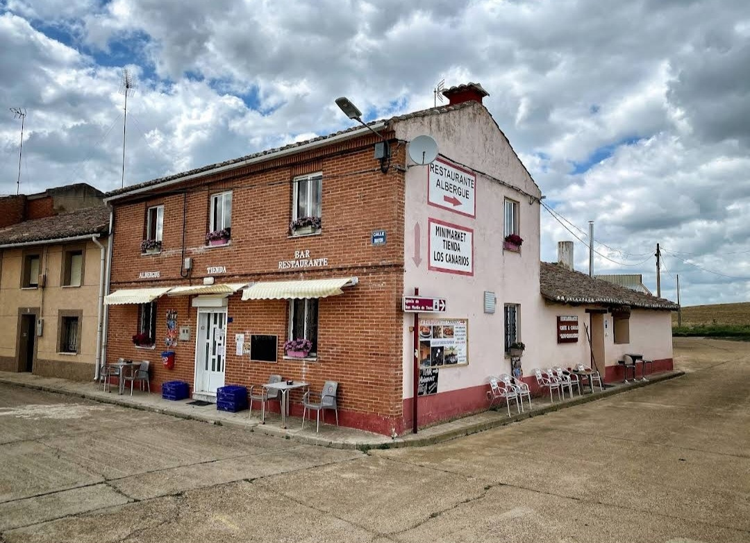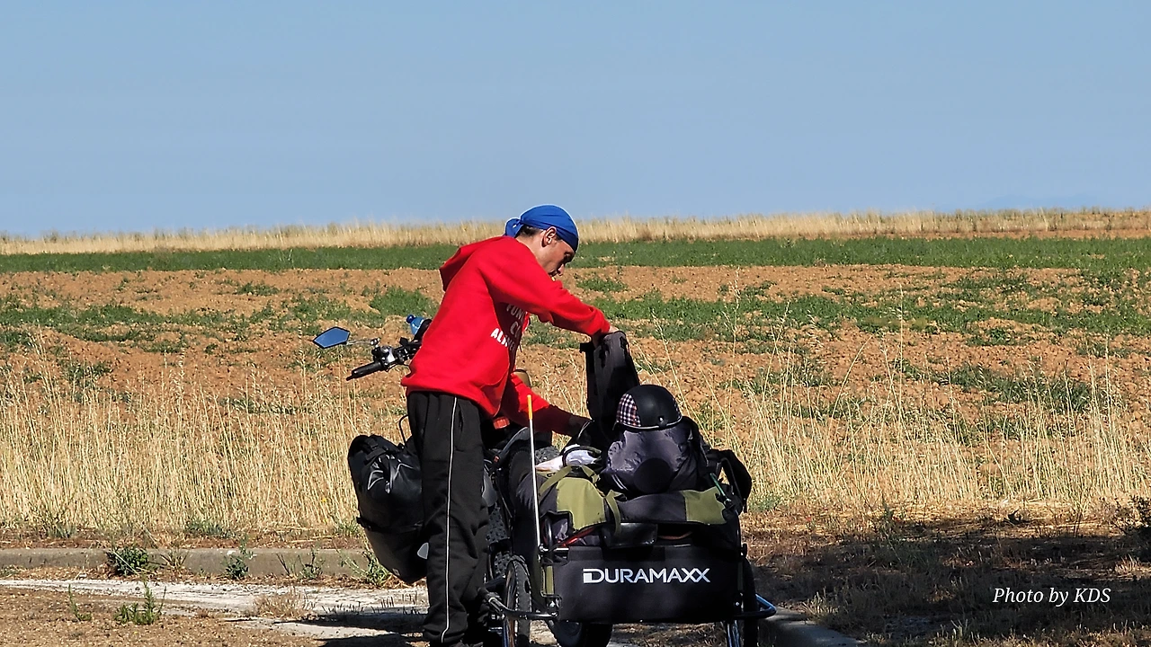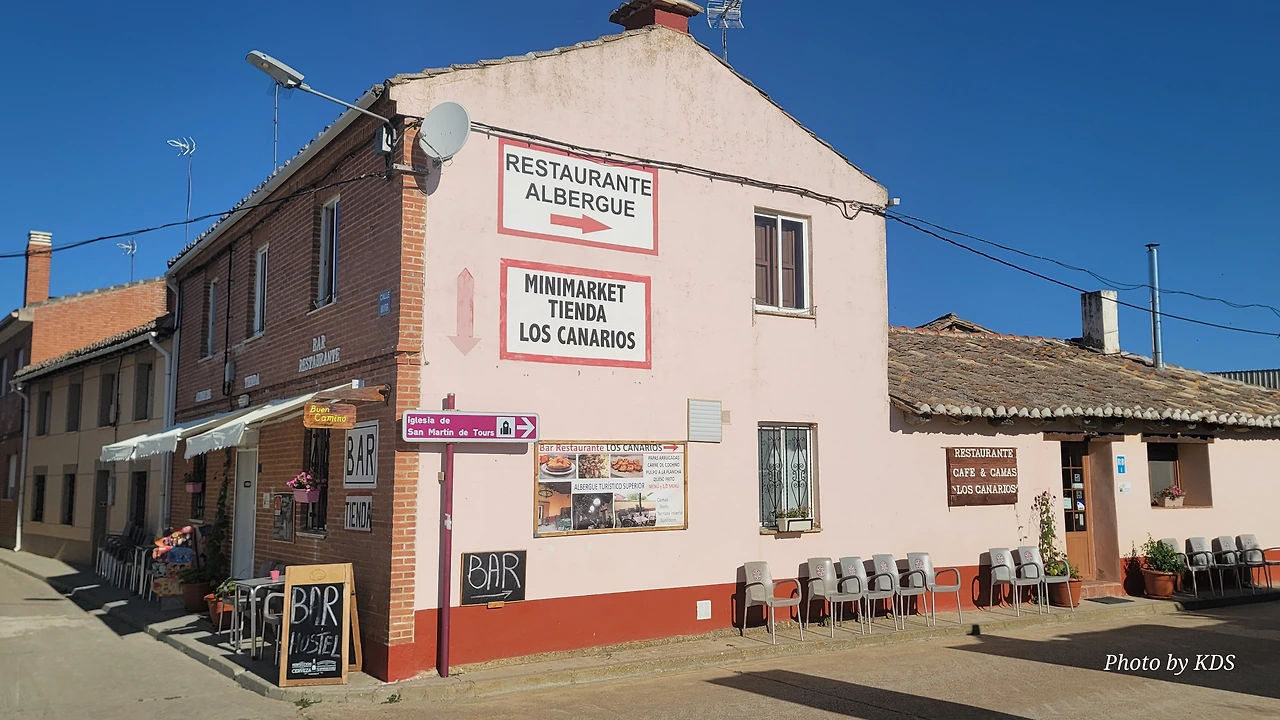 깔사디야 데 라 꾸에사(Calzadilla de la Cueza)은 까리온 데 로스 꼰데스(Carrion de los Condes) 마을에서 17Km 가량 떨어져 있는 곳이다. 해발 800m가 넘는 고원 지대의 평원을 하염없이 걸으면 나오는 첫 번째 마을이다. 마을 규모도 아주 작고 특별한 건축물이나 인상적인 조형물도 별로 없어서 아주 소박한 마을이다. 그런데 이렇게 작은 마을인데도 순례자를 위한 알베르게는 3개씩이나 있었다. 아를에는 아담한 벽돌집들이 있도. 성당은 산 마르띤 교구 성당(Iglesia Parroquial de San Martin) 하나가 있다. 성당 내부는 들어가 볼 수 없었다. 마을 외곽에 공동묘지가 조성되어 있었다. 마을 주변에도 볼 만한 것들이 없고, 다음 마을인 레디고스(Ledigos)까지는 6Km이다. 카미노 전통길을 제쳐두고 아스팔트 포장길인 N120번 도로를 타고 걸었더니 중간에 쉼터가 크게 조성되어 있었다. 도로 주변에 있는 쉼터라서 도보 순례객은 우리 밖에 없고, 모두가 자전거 순례객들이었다. 자전거에 트레일러를 매달고 순례하는 사람도 있었다. 텐트 등 짐도 많이 실을 수 있어서 캠핑 순례용으로 상당히 매력적인 느낌이다.