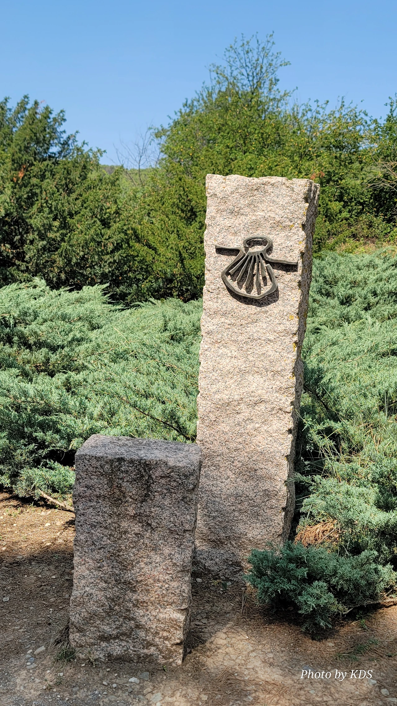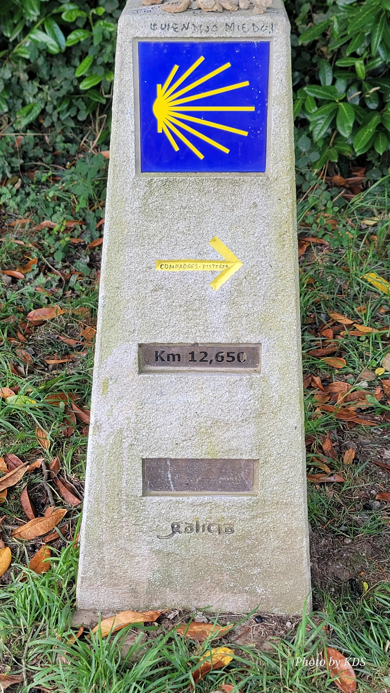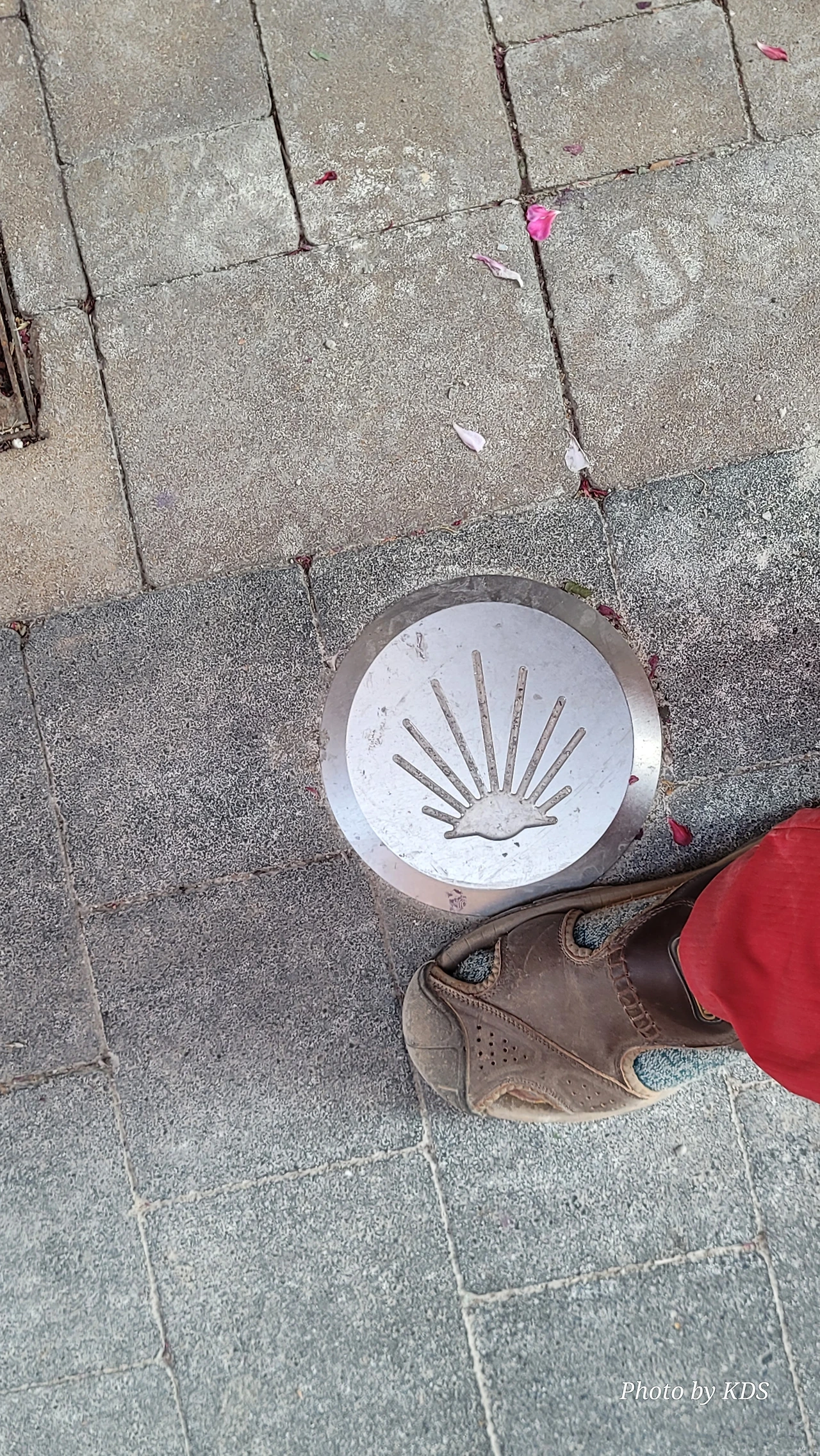 천 년의 세월 동안 무수한 순례자들이 조개껍질을 매달고 이 길을 걸었으리라. 정확히 우리말로 하면 조개 중에 가리비 껍데기이다. 왜 이것을 매달고 길을 걸을까? 그 이유에 대해서는 두 가지의 전설이 있는데, 어느 것이 진실인지 확인 불가하다. 첫 번째 전설은 성 야고보의 시신과 관련된 것이다. 야고보는 요한의 형으로 예수의 열두 제자에 속한다. 야고보는 성질이 우직하고 직선적이어서 예수가 복음을 땅끝까지 전도하라고 하자, 예수 사후에 이를 실천하기 위해서 행동했다. 예루살렘이나 로마에서 전도 구역 넓혀 땅끝까지 가는 방법이 아니라 처음부터 땅끝에서 시작하는 방법이다. 그야말로 단순 우직한 방법이다. 그는 지중해를 출발해서 지브롤터 해협을 지나 대서양을 돌아 이베리아 반도의 땅끝 마을에 도착하여 전도를 하였다. 그러다가 성모 마리아의 임종 소식을 듣고 다시 돌아왔다가 예루살렘의 헤롯 아그리파스왕에게 예수의 제자 중 최초로 순교하였다. 그의 시신은 제자들에 의해 돌로 만든 배에 실려져서 처음 전도를 떠났던 길을 따라 산티아고 콤포스텔라 근처의 연안으로 이동했다. 그때 돌로 만든 배와 시신에 가리비가 잔뜩 달라붙어 있어서 시신이 조금도 손상되지 않아서 거기에서 장례를 치렀다. 그 후 스페인의 대부분 국토가 무어인의 이슬람교도들에게 점령되어 있을 때, 9세기경 기적적으로 하늘의 별빛이 그의 무덤 있는 곳을 계시해 주었다. 그래서 그의 시신을 찾고, 알폰소 국왕이 그 묘지위에 산티아고 성당을 세워서 지금의 산티아고 콤포스텔라가 되었다. 그리고 역사적으로 스페인이 이슬람을 물리치는 전쟁에서 야고보의 기적이 가끔 일어나서 전승을 거두게 되자 성 야고보는 스페인의 수호신이 되었다. 당시 유럽의 여러 나라 신도들이 예루살렘이나 로마로 순례여행을 하기가 위험하고 힘드니까 이곳으로 모이게 되어서 천년의 세월 동안 이어지고 있는 것이다. 그래서 가리비가 야고보 성인 순례길의 상징물이 된 것이다. 12세기에 발행된 순례길의 안내서인 <칼릭스티누스 고사본(Codex Calixtinus)>에도 야고보 성인이 들고 있는 깃발과 주변에 가리비 껍데기 그림이 별처럼 흩어져 있다.