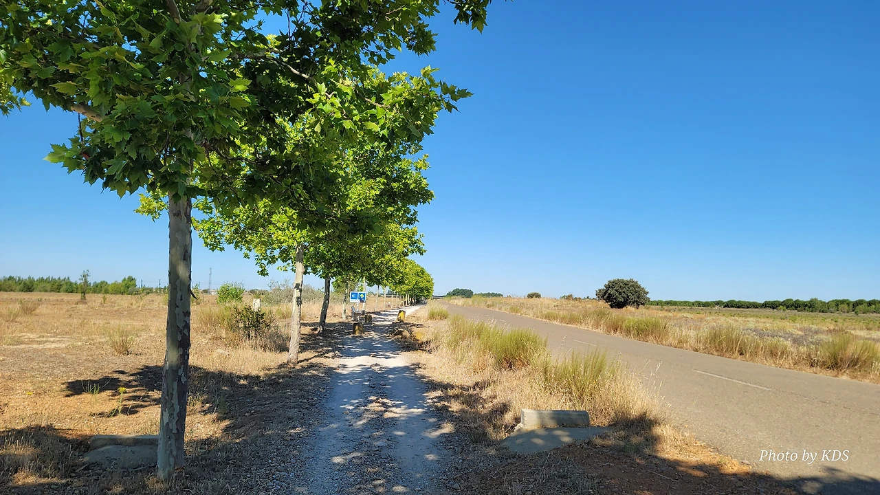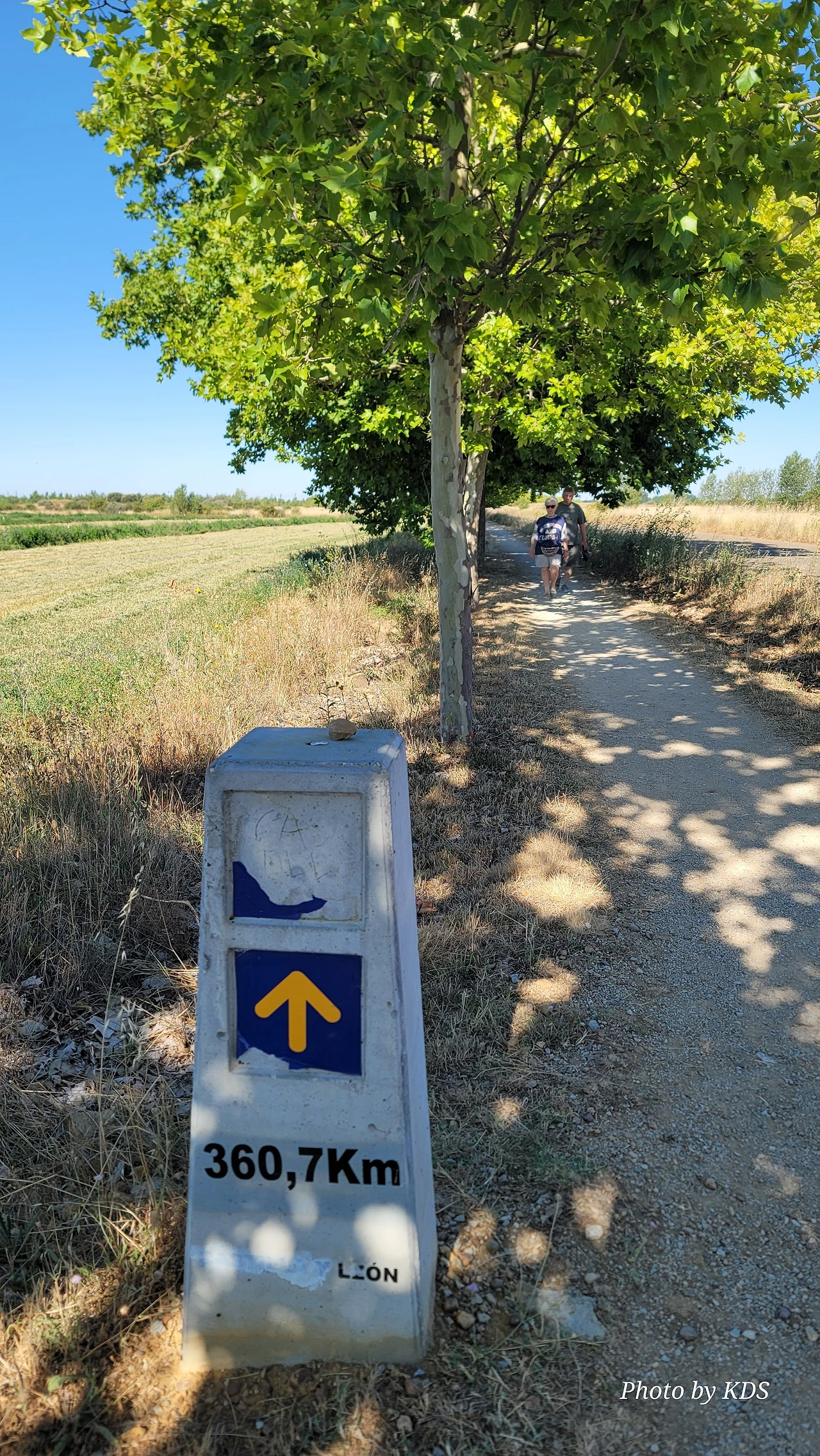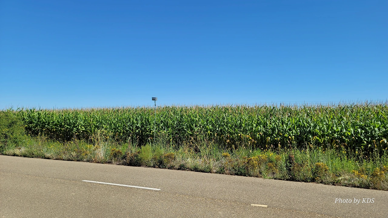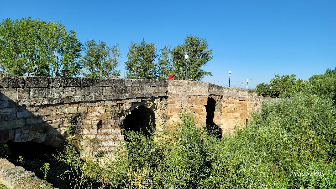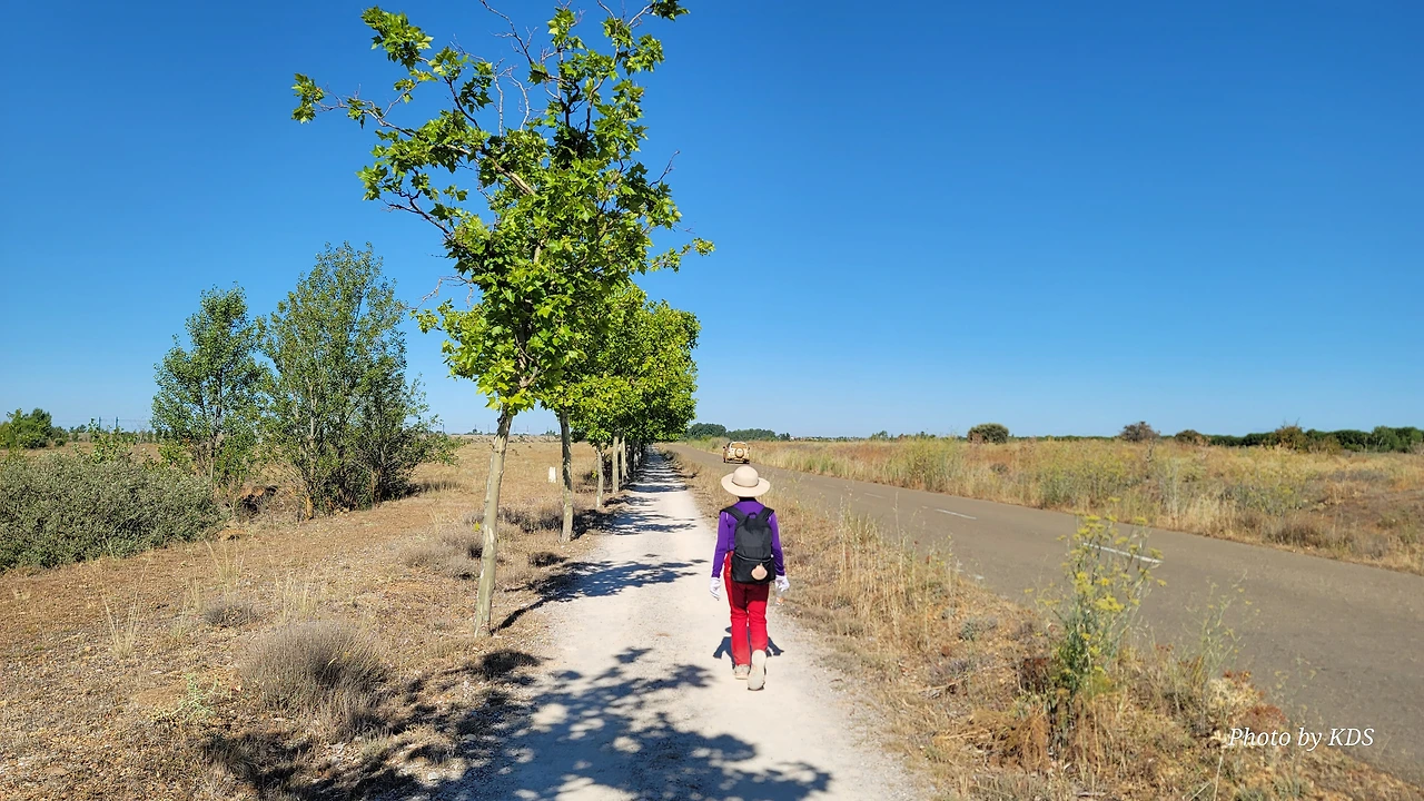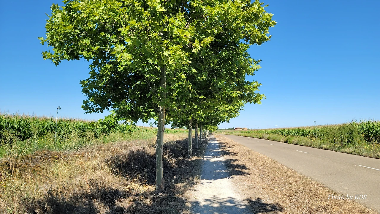 산티아고 순례길을 시작한 지 18일째 되는 날인데, 조선 과객 금삿갓의 발 상태는 이제 길에 적응되어 아프지 않고 물집도 잡히지 않는다. 말하자면 컨디션이 정상으로 돌아온 것이다. 사하군(Sahagun) 마을에서 깔사다 델 꼬또(Calzada del Coto) 마을까지는 4Km이고 모두 평원이다. 순례길 주변은 밀밭과 옥수수밭이 많았다. 먼저 사하군 마을 출구에 있는 세아 강(Rio Cea) 위를 지나는 깐또 다리(Puente Canto)를 건너서 순례길로 들어선다. 이 다리는 교통량이 많은 까닭에 여러 차례에 걸쳐 수리되고 증축되어 중세의 모습을 찾아보기 어렵다. 끊임없이 이어지는 밀밭과 옥수수밭, 그리고 언덕 쪽으로는 포도밭이 자리 잡고 있다. 옥수수밭에는 거대한 자동 스프링클러가 수분을 공급하는 모습이 보인다. 거대한 구조물이 양쪽에 바퀴가 있어서 옥수수 밭고랑을 왔다 갔다 하면서 물을 뿌리는 구조이다. 평원을 가로질러 난 순례길 옆에는 플라타너스 나무들이 길게 줄지어 심어져 있어서 여름의 뜨거운 순례길을 걷는 사람들에게 아주 좋은 그늘을 만들어 주고 있다. 정말 고마운 나무 그늘이다.