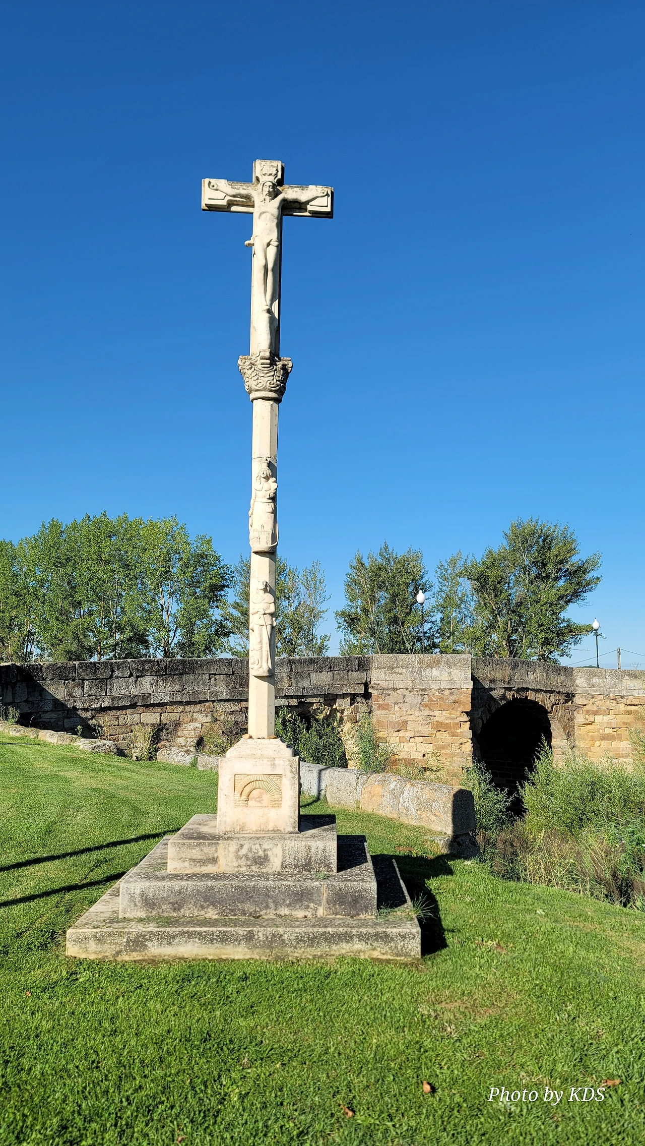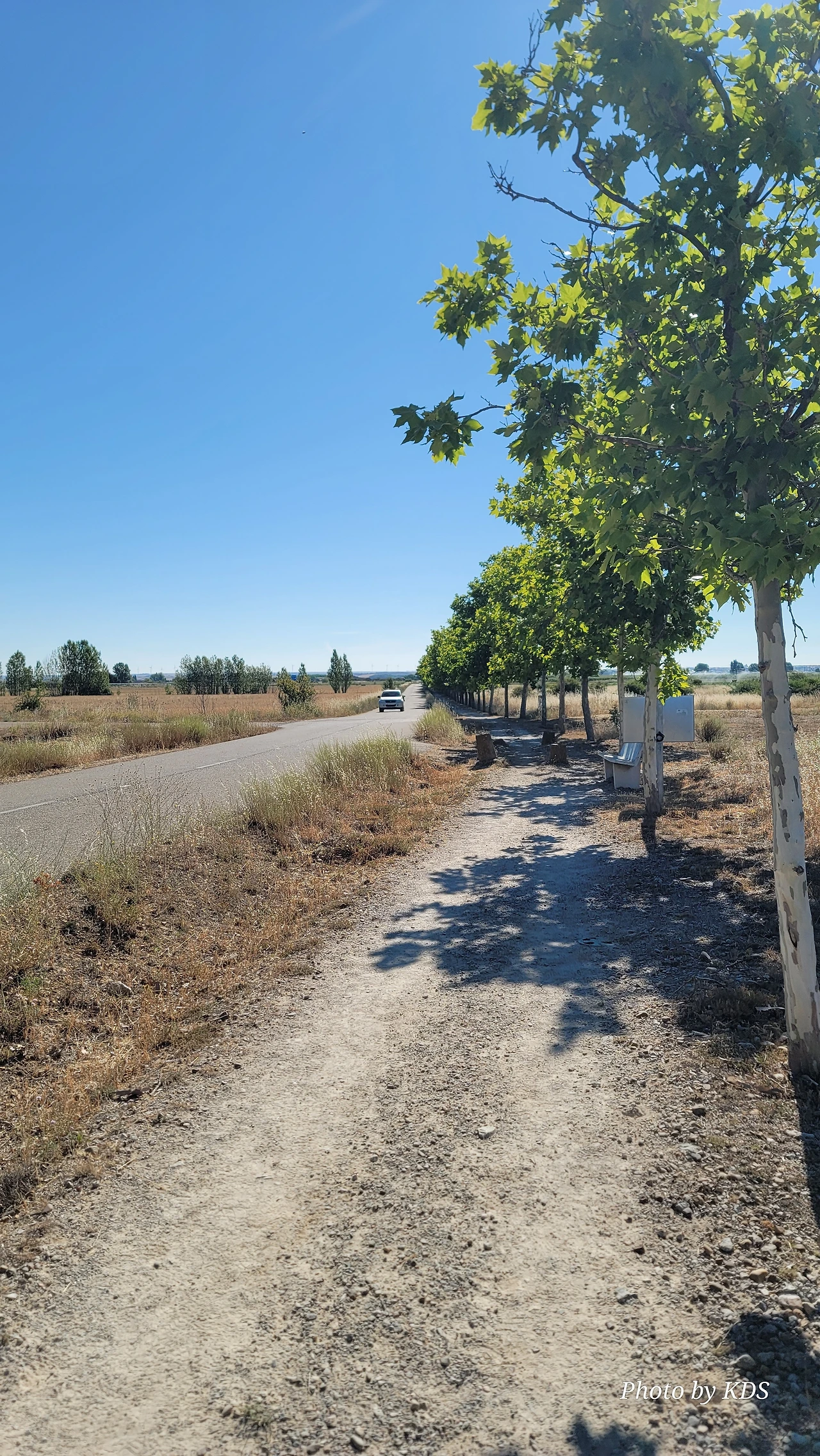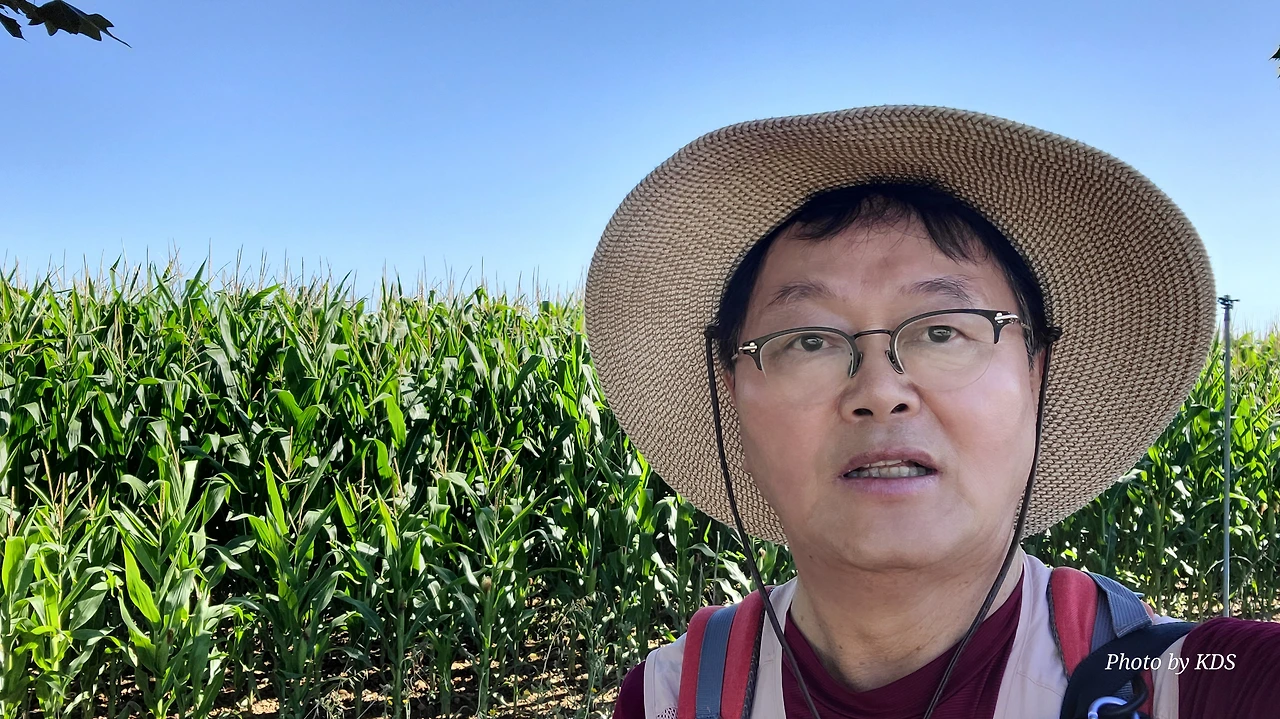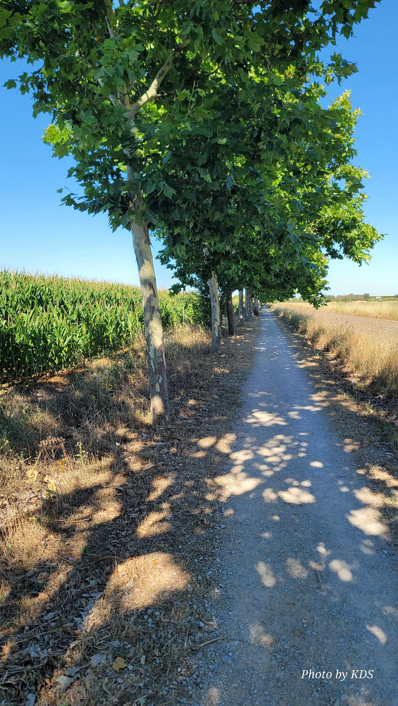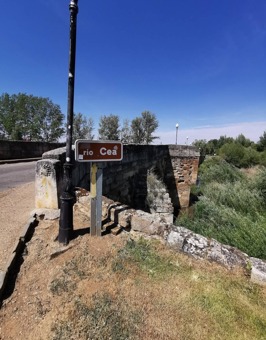 산티아고 순례길을 시작한 지 18일째 되는 날인데, 조선 과객 금삿갓의 발 상태는 이제 길에 적응되어 아프지 않고 물집도 잡히지 않는다. 말하자면 컨디션이 정상으로 돌아온 것이다. 사하군(Sahagun) 마을에서 깔사다 델 꼬또(Calzada del Coto) 마을까지는 4Km이고 모두 평원이다. 순례길 주변은 밀밭과 옥수수밭이 많았다. 먼저 사하군 마을 출구에 있는 세아 강(Rio Cea) 위를 지나는 깐또 다리(Puente Canto)를 건너서 순례길로 들어선다. 이 다리는 교통량이 많은 까닭에 여러 차례에 걸쳐 수리되고 증축되어 중세의 모습을 찾아보기 어렵다. 끊임없이 이어지는 밀밭과 옥수수밭, 그리고 언덕 쪽으로는 포도밭이 자리 잡고 있다. 옥수수밭에는 거대한 자동 스프링클러가 수분을 공급하는 모습이 보인다. 거대한 구조물이 양쪽에 바퀴가 있어서 옥수수 밭고랑을 왔다 갔다 하면서 물을 뿌리는 구조이다. 평원을 가로질러 난 순례길 옆에는 플라타너스 나무들이 길게 줄지어 심어져 있어서 여름의 뜨거운 순례길을 걷는 사람들에게 아주 좋은 그늘을 만들어 주고 있다. 정말 고마운 나무 그늘이다.