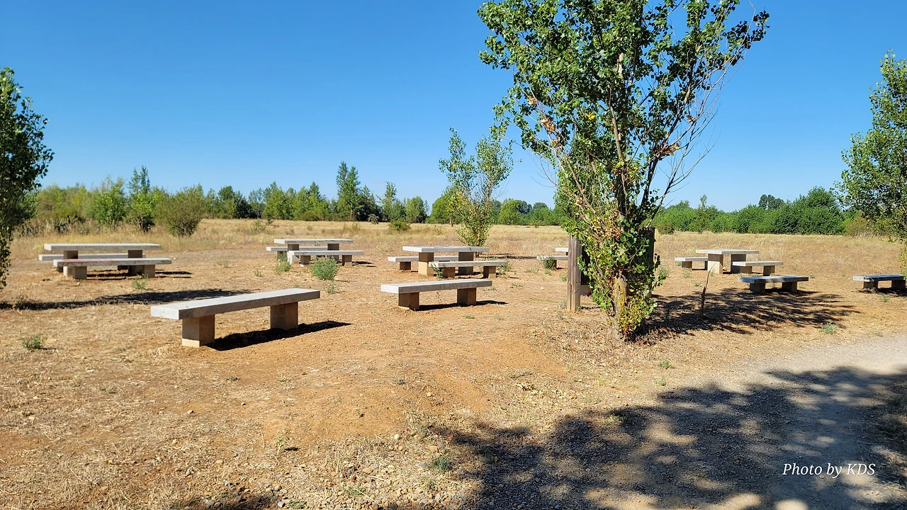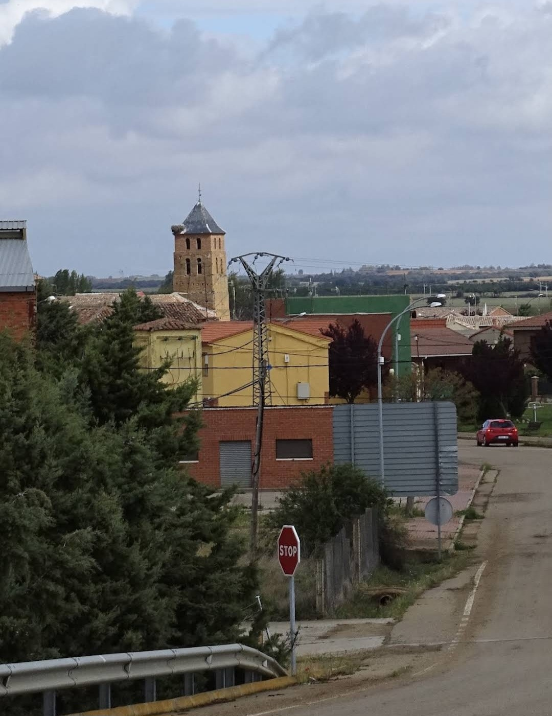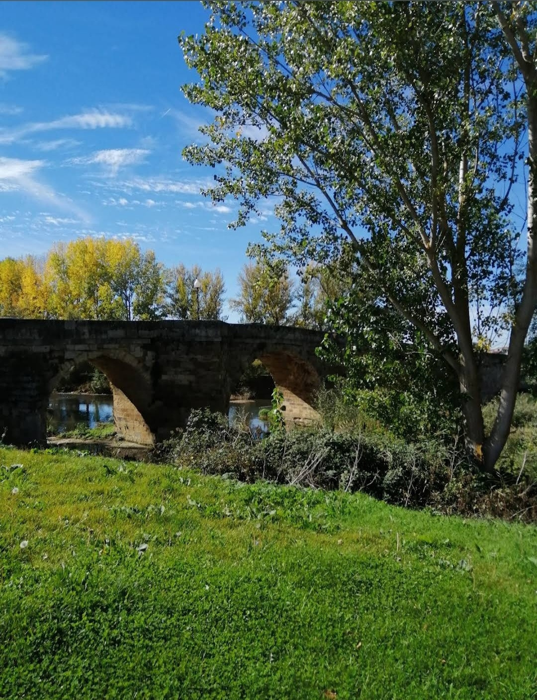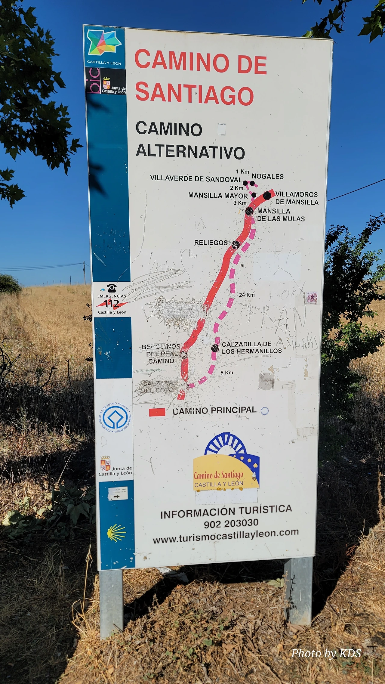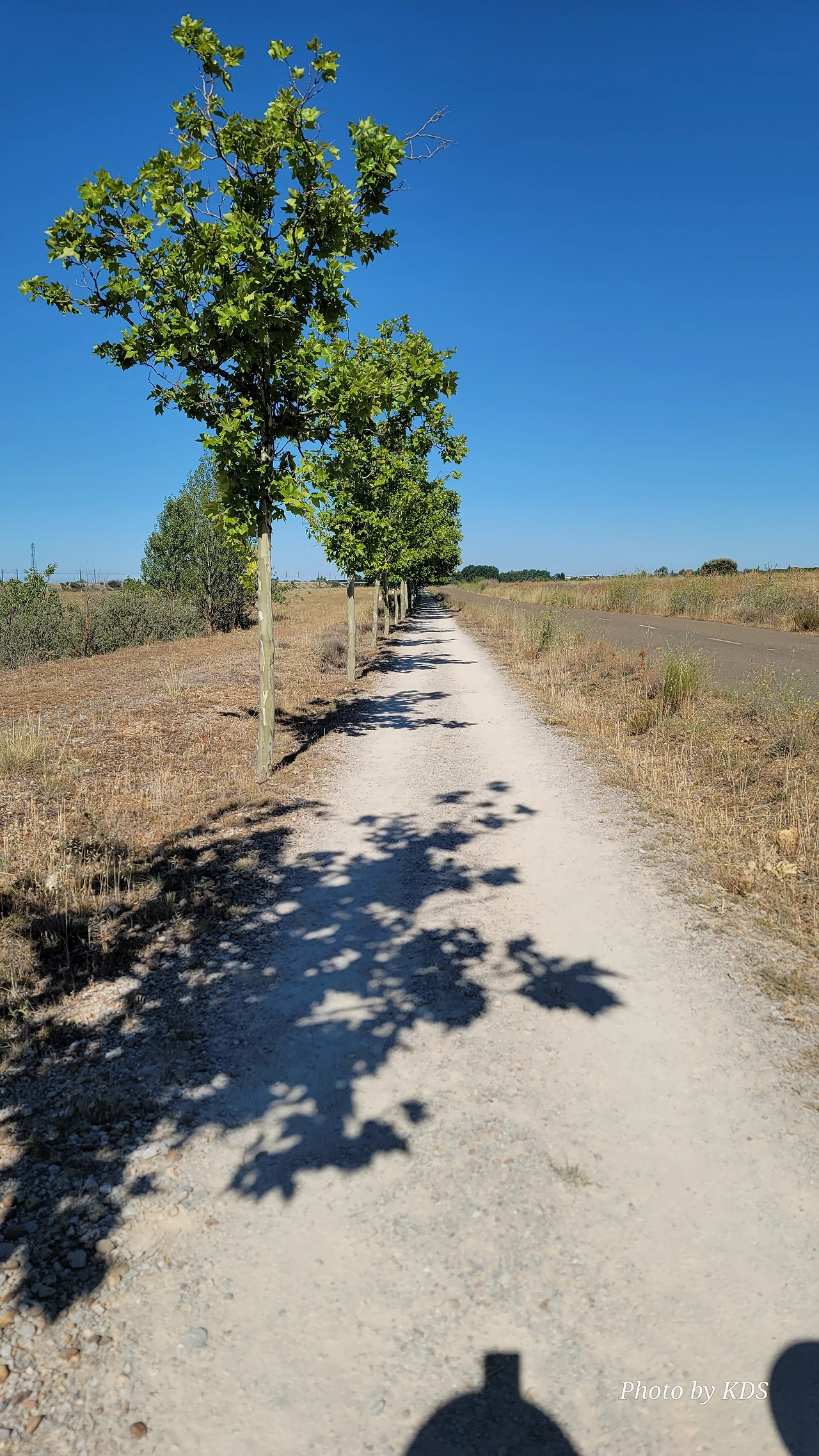 산티아고 순례길을 시작한 지 18일째 되는 날인데, 조선 과객 금삿갓의 발 상태는 이제 길에 적응되어 아프지 않고 물집도 잡히지 않는다. 말하자면 컨디션이 정상으로 돌아온 것이다. 사하군(Sahagun) 마을에서 깔사다 델 꼬또(Calzada del Coto) 마을까지는 4Km이고 모두 평원이다. 순례길 주변은 밀밭과 옥수수밭이 많았다. 먼저 사하군 마을 출구에 있는 세아 강(Rio Cea) 위를 지나는 깐또 다리(Puente Canto)를 건너서 순례길로 들어선다. 이 다리는 교통량이 많은 까닭에 여러 차례에 걸쳐 수리되고 증축되어 중세의 모습을 찾아보기 어렵다. 끊임없이 이어지는 밀밭과 옥수수밭, 그리고 언덕 쪽으로는 포도밭이 자리 잡고 있다. 옥수수밭에는 거대한 자동 스프링클러가 수분을 공급하는 모습이 보인다. 거대한 구조물이 양쪽에 바퀴가 있어서 옥수수 밭고랑을 왔다 갔다 하면서 물을 뿌리는 구조이다. 평원을 가로질러 난 순례길 옆에는 플라타너스 나무들이 길게 줄지어 심어져 있어서 여름의 뜨거운 순례길을 걷는 사람들에게 아주 좋은 그늘을 만들어 주고 있다. 정말 고마운 나무 그늘이다.
