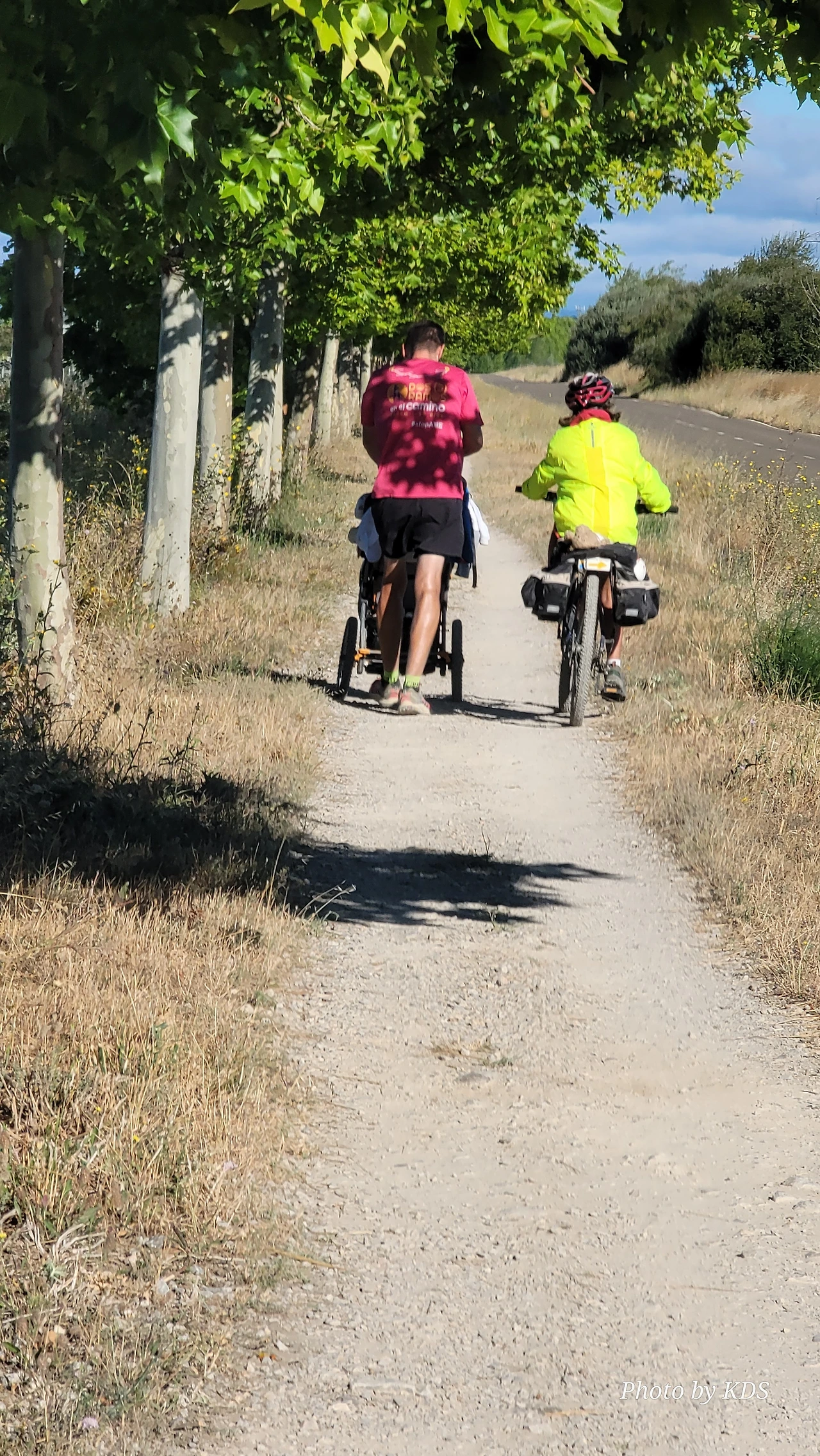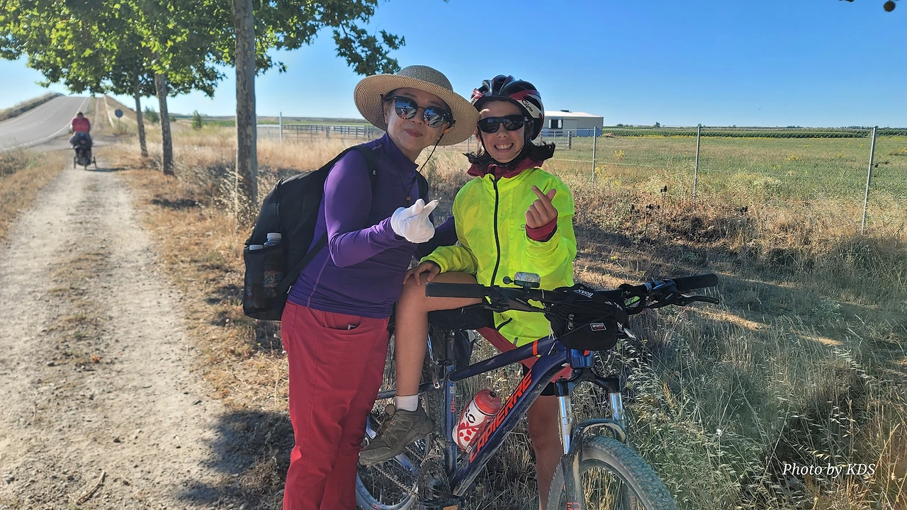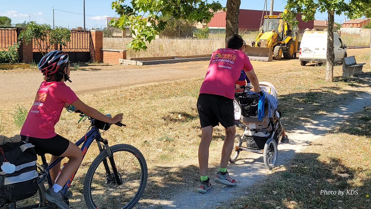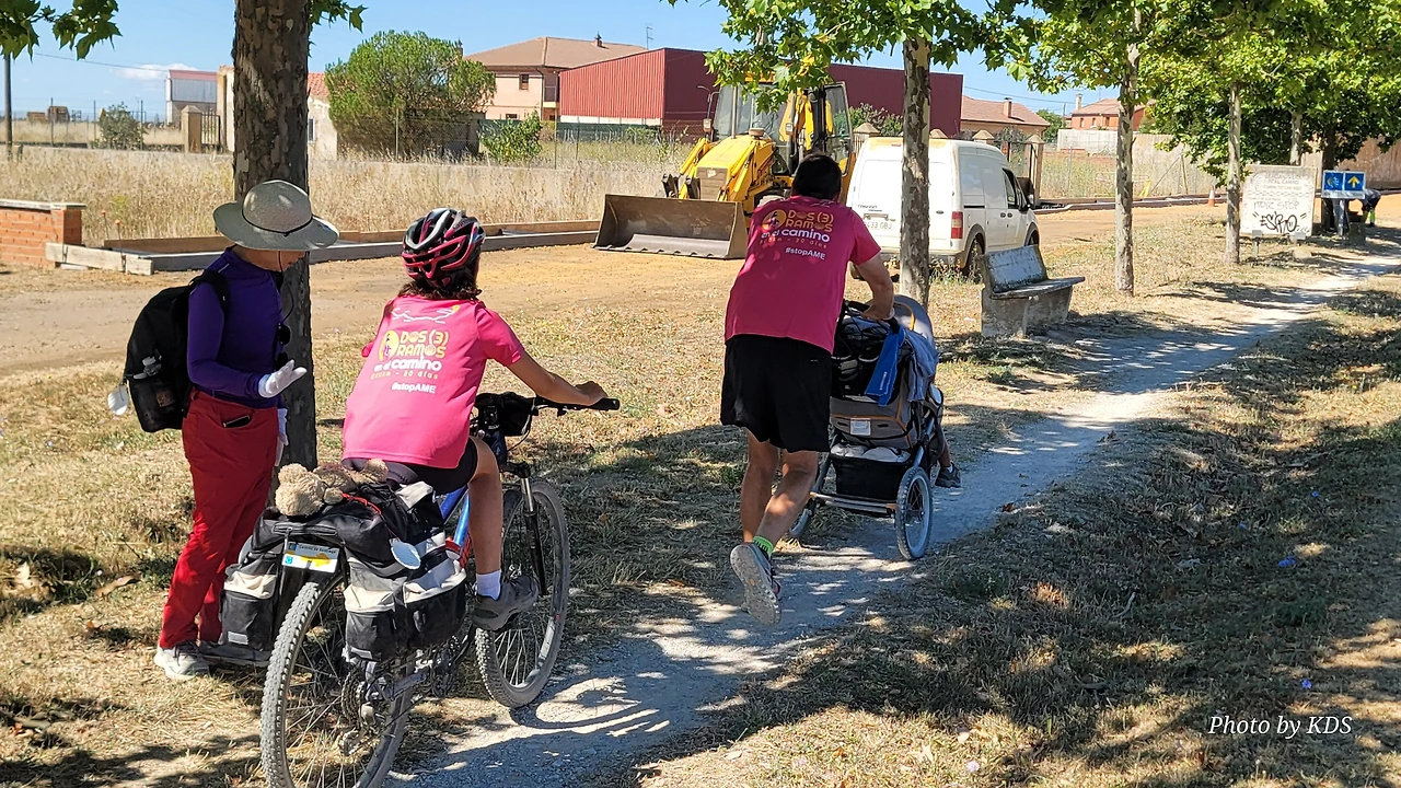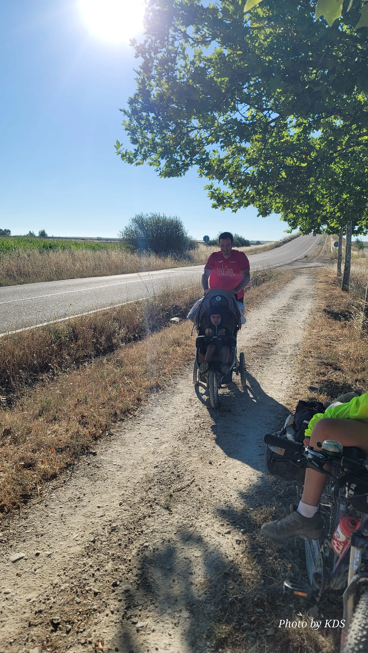 그는 스페인 동북부에 위치한 작은 주인 라 리오하(La Rioha) 출신의 엔리께 라모스(Enlike Lamos)인데 별명을 키께(Kike)라고 부른다. 나이는 46세로 부인은 SMA(척추근육 위축증)을 앓고 있어서 걷지를 못한단다. 그래서 부인 폴라(Pola)의 병을 치료하기 위하여 옛날 성직자들이 구도와 치유의 목적을 위해서 순례길을 걷듯이 산티아고 순례길을 걷는다고 했다. 지금 같이 걷고 있는 아이들은 딸 롤라(Lola)가 10세이고 아들 야고(Yago)가 4세이다. 딸은 자전거를 타고, 아들은 유모차에 태워서 800Km의 순례길을 걷고 있는 것이다. 부인의 치료를 위해 최초로 2018년에 딸이 5세일 때 유모차에 태워서 산티아고까지 완주를 하였단다. 그때 지나가는 마을의 모든 성당에 들어가서 기도와 명상을 하면서 하느님께 간절히 소원을 빌었더니 다행히 부인의 병이 더 이상 악화되지 않고 건강을 많이 회복하였단다. 그리고 둘째인 아들 야고를 건강하게 낳았단다. 그리고 올해 드디어 아들이 4살이 되자 다시 산티아고 전 코스의 순례길에 오르게 된 것이란다. 이번의 순례 목적은 부인만이 아니라 전 세계의 SMA 병을 앓고 있는 모든 어린이들의 치료를 돕기 위한 기금의 모금과 하느님께 좀 더 간절한 기도를 올리기 위한 고행이자 자선의 순례길이란다. 정말 가슴 찡한 감동의 순례객을 만난 것이다. 그 당시에 벌써 모금한 금액이 8,855유로라고 했다. 1인당 5유로 단위로 기부를 할 수 있다고 했다. 그 멀고 험한 길을 10살의 여자 어린이가 자전거를 타고 가고, 4살의 어린 아들은 유모차에서 늘 즐거운 표정으로 동참을 하는 것을 보고 정말 하느님의 얼굴을 보는 것 같았다. 지루함이나 피곤함이 전혀 없이 늘 만날 때마다 평안하고 명랑한 얼굴로 인사하는 아이들이 바로 천사들이었다. 힘든 구간에서는 아빠인 키께가 밧줄을 자전거에 매고 유모차를 밀면서 자전거를 끌면서 비지땀을 흘리는 모습을 아마 하늘에서 천사가 보고 하느님께 보고를 잘하였으리라.