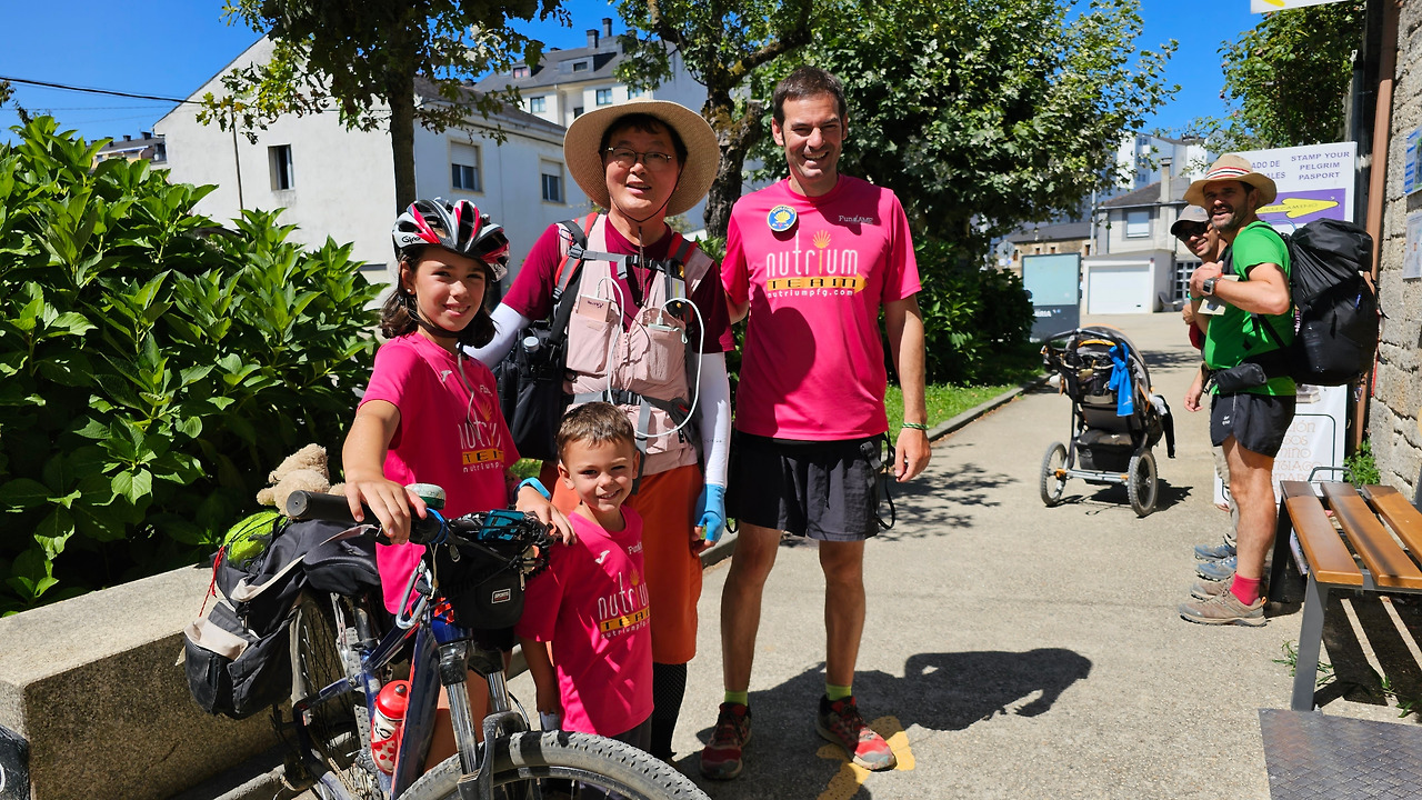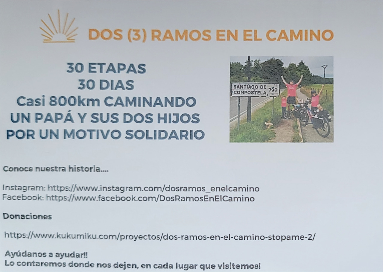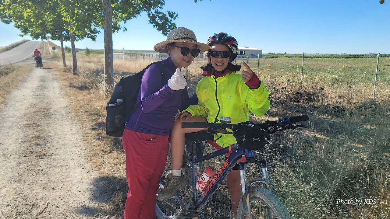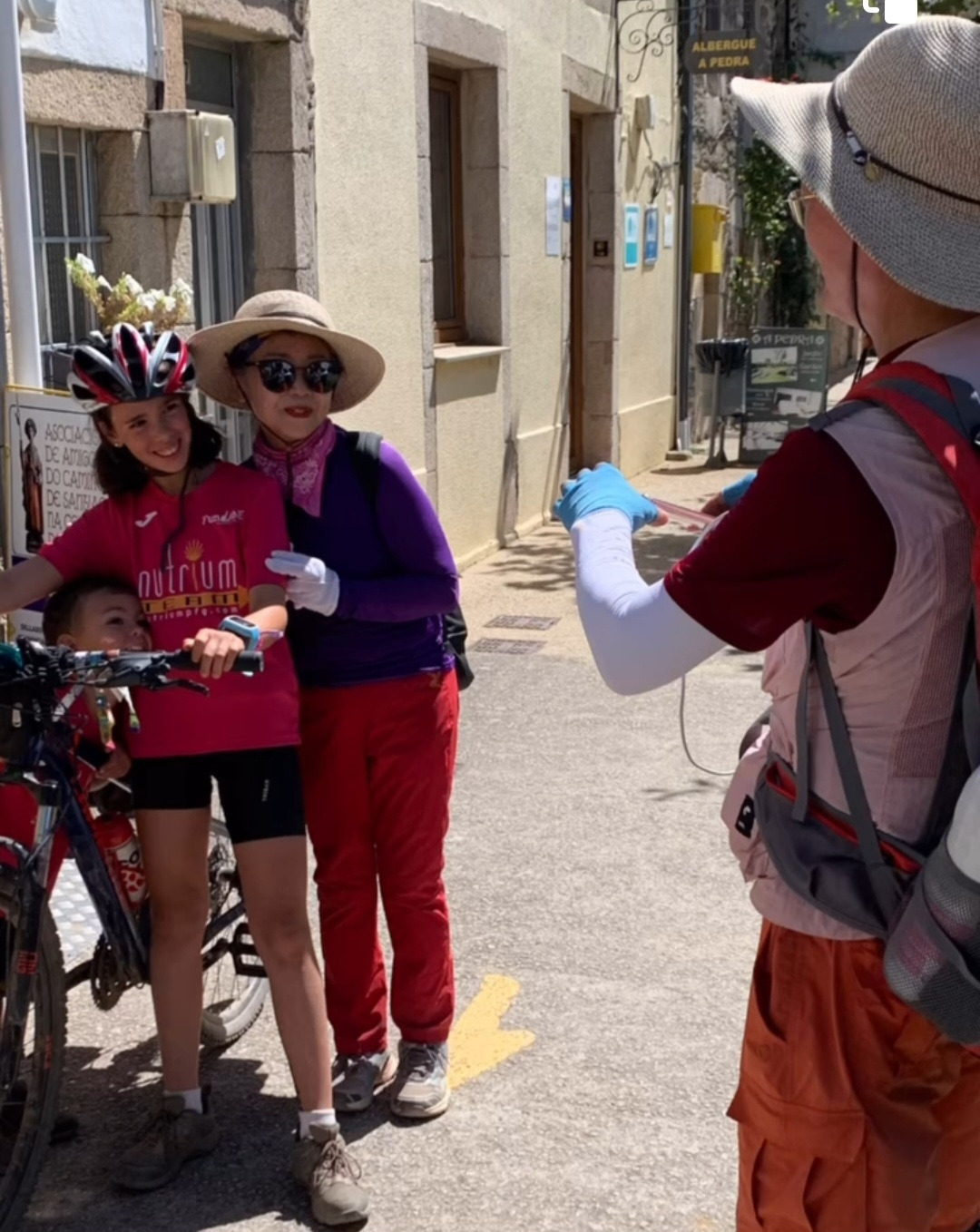 그는 스페인 동북부에 위치한 작은 주인 라 리오하(La Rioha) 출신의 엔리께 라모스(Enlike Lamos)인데 별명을 키께(Kike)라고 부른다. 나이는 46세로 부인은 SMA(척추근육 위축증)을 앓고 있어서 걷지를 못한단다. 그래서 부인 폴라(Pola)의 병을 치료하기 위하여 옛날 성직자들이 구도와 치유의 목적을 위해서 순례길을 걷듯이 산티아고 순례길을 걷는다고 했다. 지금 같이 걷고 있는 아이들은 딸 롤라(Lola)가 10세이고 아들 야고(Yago)가 4세이다. 딸은 자전거를 타고, 아들은 유모차에 태워서 800Km의 순례길을 걷고 있는 것이다. 부인의 치료를 위해 최초로 2018년에 딸이 5세일 때 유모차에 태워서 산티아고까지 완주를 하였단다. 그때 지나가는 마을의 모든 성당에 들어가서 기도와 명상을 하면서 하느님께 간절히 소원을 빌었더니 다행히 부인의 병이 더 이상 악화되지 않고 건강을 많이 회복하였단다. 그리고 둘째인 아들 야고를 건강하게 낳았단다. 그리고 올해 드디어 아들이 4살이 되자 다시 산티아고 전 코스의 순례길에 오르게 된 것이란다. 이번의 순례 목적은 부인만이 아니라 전 세계의 SMA 병을 앓고 있는 모든 어린이들의 치료를 돕기 위한 기금의 모금과 하느님께 좀 더 간절한 기도를 올리기 위한 고행이자 자선의 순례길이란다. 정말 가슴 찡한 감동의 순례객을 만난 것이다. 그 당시에 벌써 모금한 금액이 8,855유로라고 했다. 1인당 5유로 단위로 기부를 할 수 있다고 했다. 그 멀고 험한 길을 10살의 여자 어린이가 자전거를 타고 가고, 4살의 어린 아들은 유모차에서 늘 즐거운 표정으로 동참을 하는 것을 보고 정말 하느님의 얼굴을 보는 것 같았다. 지루함이나 피곤함이 전혀 없이 늘 만날 때마다 평안하고 명랑한 얼굴로 인사하는 아이들이 바로 천사들이었다. 힘든 구간에서는 아빠인 키께가 밧줄을 자전거에 매고 유모차를 밀면서 자전거를 끌면서 비지땀을 흘리는 모습을 아마 하늘에서 천사가 보고 하느님께 보고를 잘하였으리라.