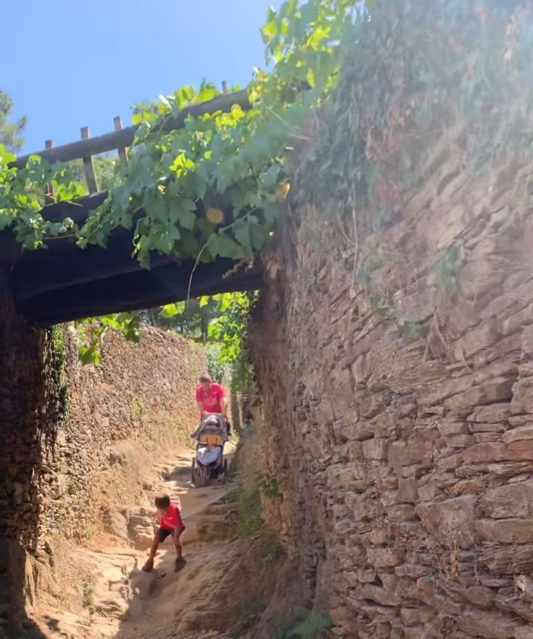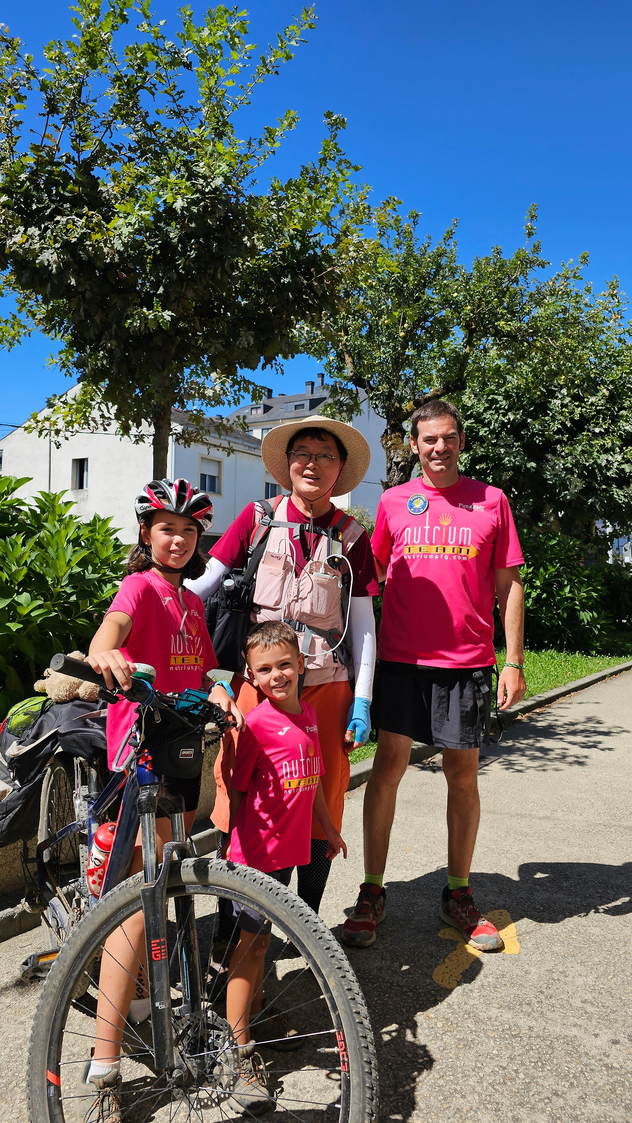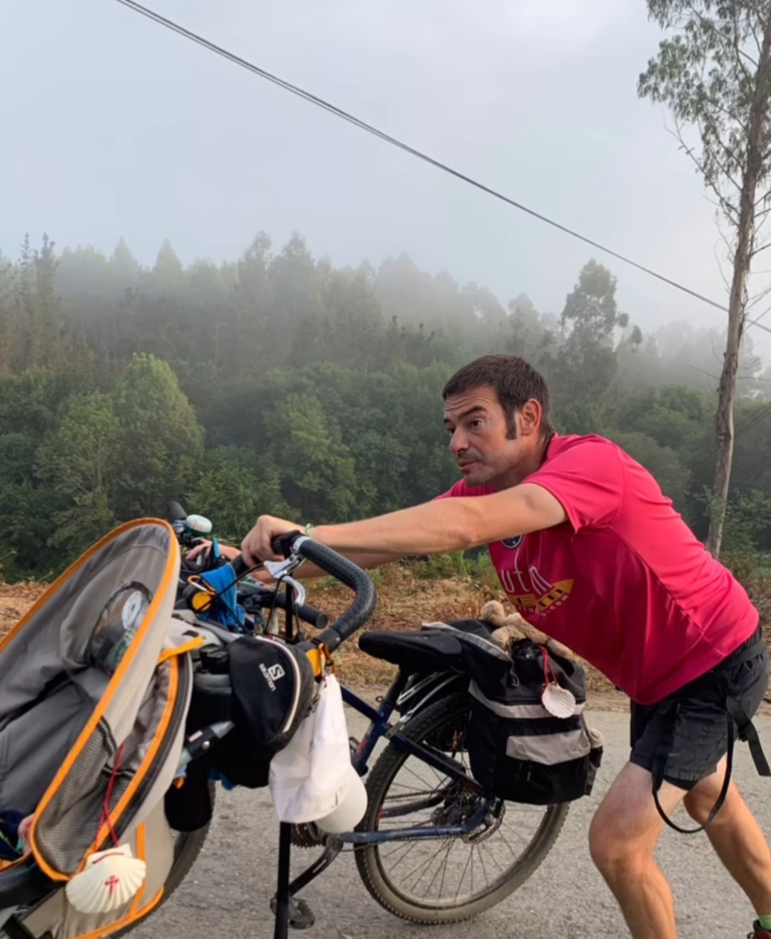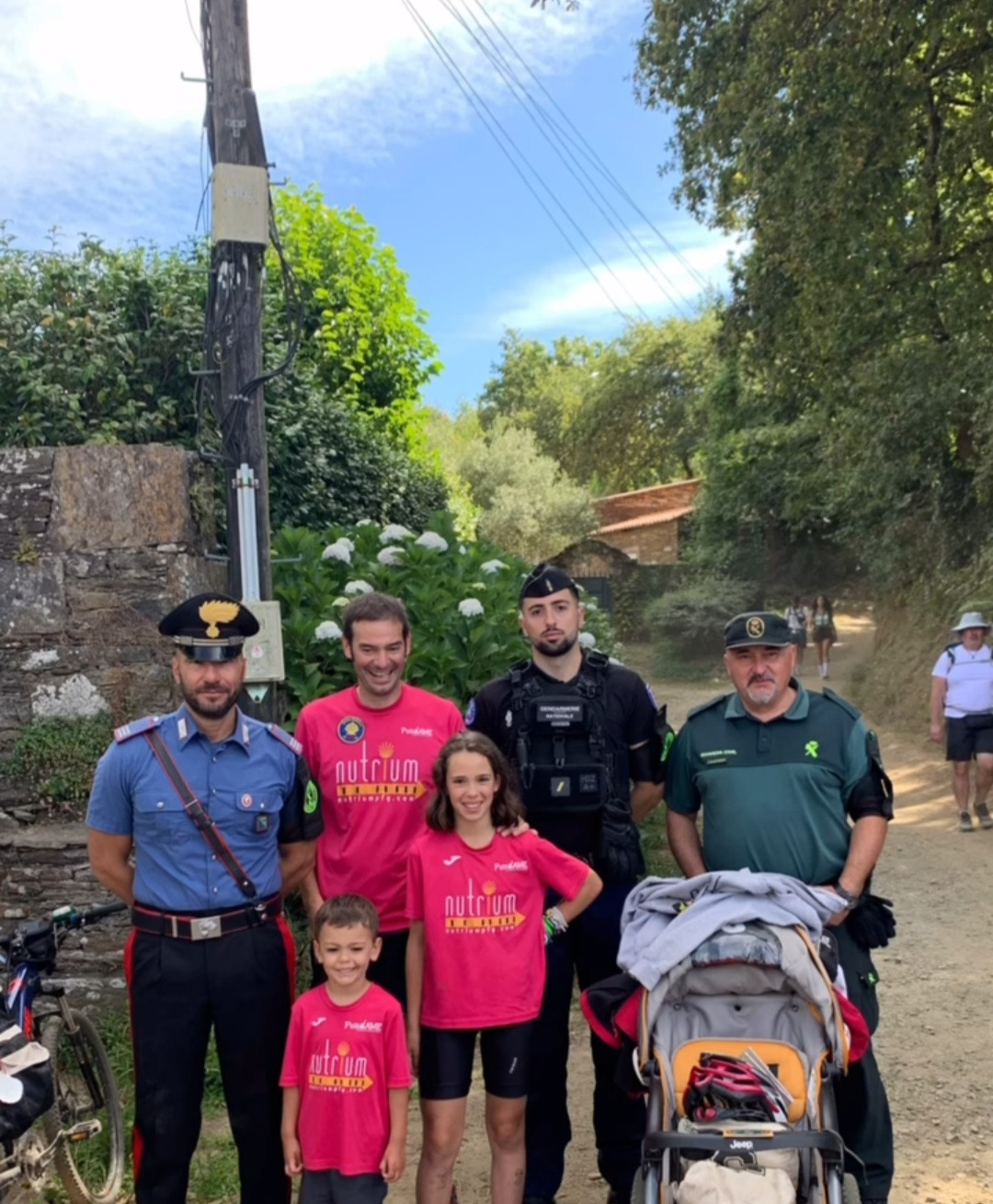 그는 스페인 동북부에 위치한 작은 주인 라 리오하(La Rioha) 출신의 엔리께 라모스(Enlike Lamos)인데 별명을 키께(Kike)라고 부른다. 나이는 46세로 부인은 SMA(척추근육 위축증)을 앓고 있어서 걷지를 못한단다. 그래서 부인 폴라(Pola)의 병을 치료하기 위하여 옛날 성직자들이 구도와 치유의 목적을 위해서 순례길을 걷듯이 산티아고 순례길을 걷는다고 했다. 지금 같이 걷고 있는 아이들은 딸 롤라(Lola)가 10세이고 아들 야고(Yago)가 4세이다. 딸은 자전거를 타고, 아들은 유모차에 태워서 800Km의 순례길을 걷고 있는 것이다. 부인의 치료를 위해 최초로 2018년에 딸이 5세일 때 유모차에 태워서 산티아고까지 완주를 하였단다. 그때 지나가는 마을의 모든 성당에 들어가서 기도와 명상을 하면서 하느님께 간절히 소원을 빌었더니 다행히 부인의 병이 더 이상 악화되지 않고 건강을 많이 회복하였단다. 그리고 둘째인 아들 야고를 건강하게 낳았단다. 그리고 올해 드디어 아들이 4살이 되자 다시 산티아고 전 코스의 순례길에 오르게 된 것이란다. 이번의 순례 목적은 부인만이 아니라 전 세계의 SMA 병을 앓고 있는 모든 어린이들의 치료를 돕기 위한 기금의 모금과 하느님께 좀 더 간절한 기도를 올리기 위한 고행이자 자선의 순례길이란다. 정말 가슴 찡한 감동의 순례객을 만난 것이다. 그 당시에 벌써 모금한 금액이 8,855유로라고 했다. 1인당 5유로 단위로 기부를 할 수 있다고 했다. 그 멀고 험한 길을 10살의 여자 어린이가 자전거를 타고 가고, 4살의 어린 아들은 유모차에서 늘 즐거운 표정으로 동참을 하는 것을 보고 정말 하느님의 얼굴을 보는 것 같았다. 지루함이나 피곤함이 전혀 없이 늘 만날 때마다 평안하고 명랑한 얼굴로 인사하는 아이들이 바로 천사들이었다. 힘든 구간에서는 아빠인 키께가 밧줄을 자전거에 매고 유모차를 밀면서 자전거를 끌면서 비지땀을 흘리는 모습을 아마 하늘에서 천사가 보고 하느님께 보고를 잘하였으리라.