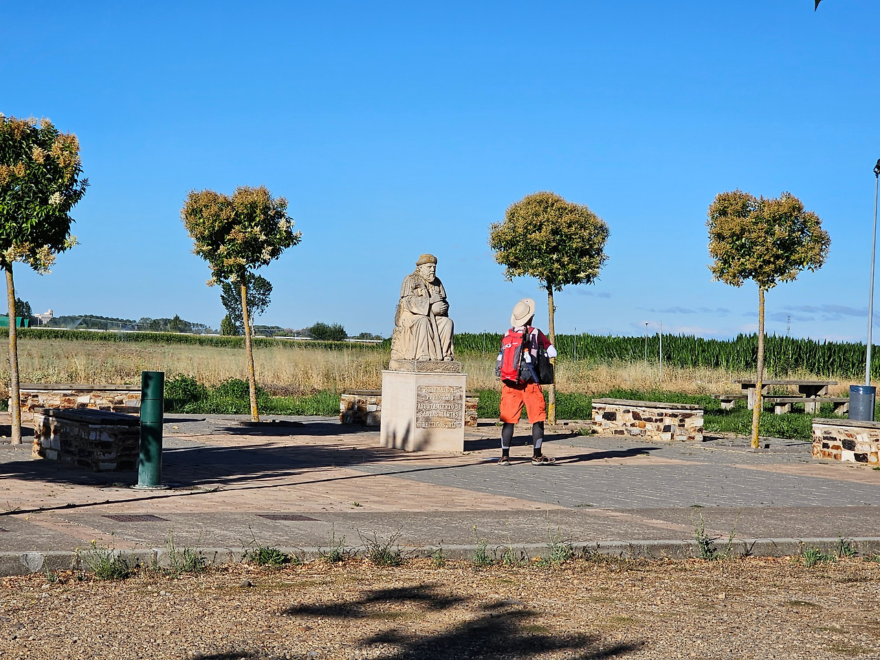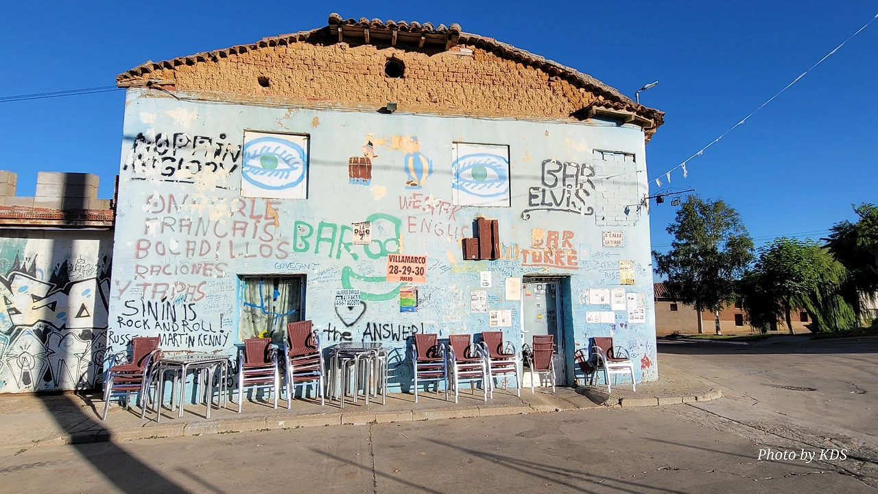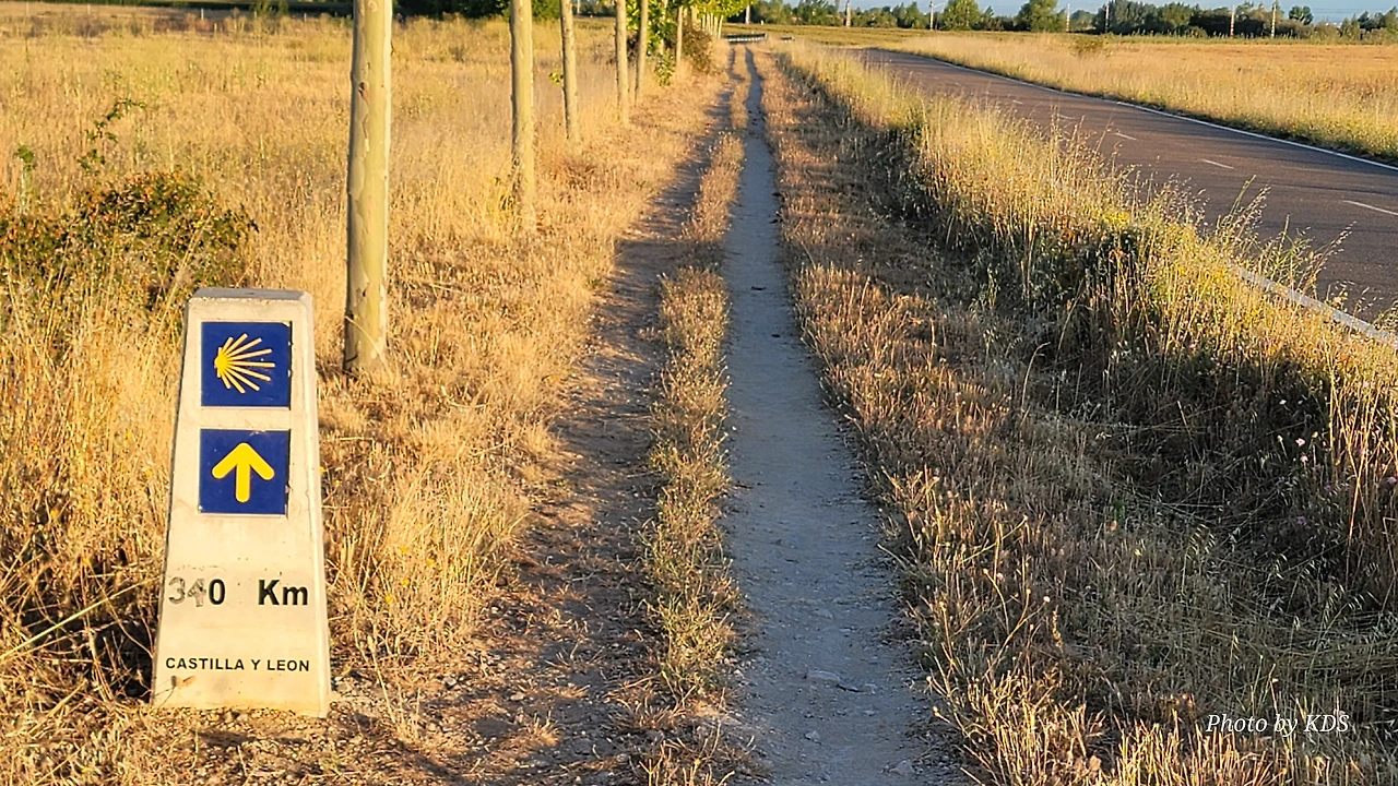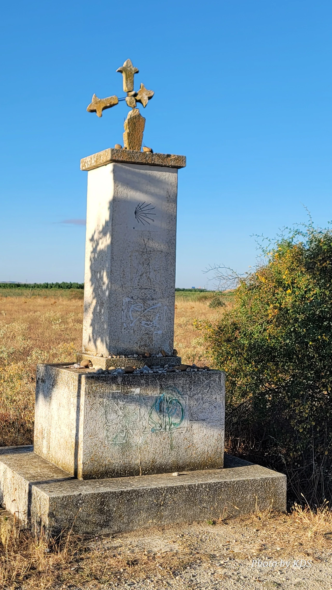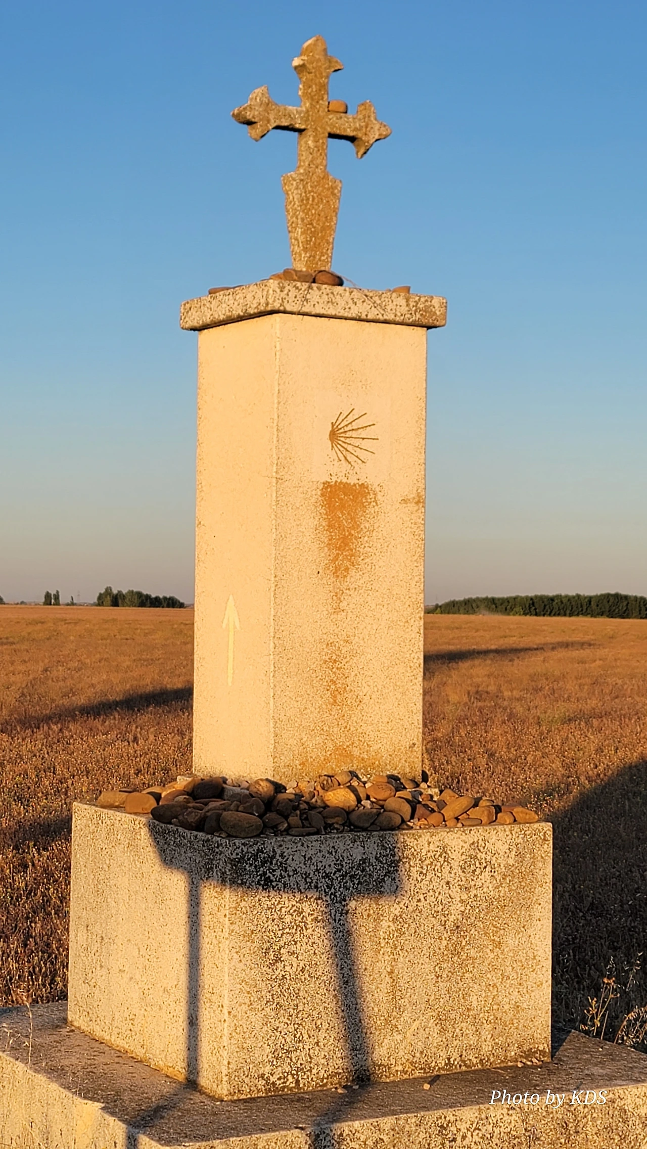 19일째 순례길의 아침을 맞는다. 05시에 기상을 하여 준비를 마치고 06:10분경에 엘 부르고 라네로(El Burgo Ranero)의 숙소를 나섰다. 하늘은 아직 시커멓고 서쪽 평원 저 멀리에 새벽달이 불그스름하게 넘어가고 있다. 마을을 빠져나오는데 길 옆에 십자가 조형물이 든든하게 서 있다. 오늘도 무사하게 예정된 순례길을 걸을 수 있기를 바래 본다. 평원에서 부는 바람은 걷기에 힘들 정도로 강하게 불기도 한다. 순례길과 자동차 포장도로가 나란히 이어져 있다. 발이 불편한 순례객을 유혹하는 것이다. 새벽이라서 다니는 차도 별로 없으니 돌멩이도 없고 발이 편한 아스팔트 포장도로 위를 걸어본다. 전등을 밝히고 걷는데 도로 위에 주검이 하나 있다. 로드킬(Road Kill)인지 자연사인지 모르겠다. 상처나 피가 나지 않을 것으로 보아서 자동차에 부딪혀서 죽은 로드킬은 아닌 듯하다. 제법 덩치가 큰 고슴도치의 사체다. 순례길을 걷다 보면 간혹 이런 로드킬을 접하곤 한다. 도로에 그냥 두면 달리는 자동차에 2-3차 깔릴 것 같아서 얼른 발로 도로 옆의 풀숲으로 밀어 넣었다. 아침부터 기분이 안 좋을 수 있으나 그런 것에 괘념할 필요가 없다. 점차 날이 밝아오니 광활한 옥수수밭에서 열 일을 하는 거대한 스프링클러가 보인다. 마치 거대한 티라노사우러스 공룡의 화석처럼 생긴 구조물이 옥수수밭이랑을 왔다 갔다 하면서 물을 주고 있는 모습이 이채롭다.