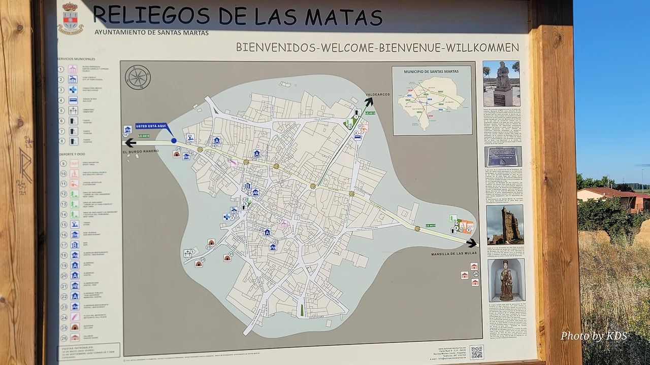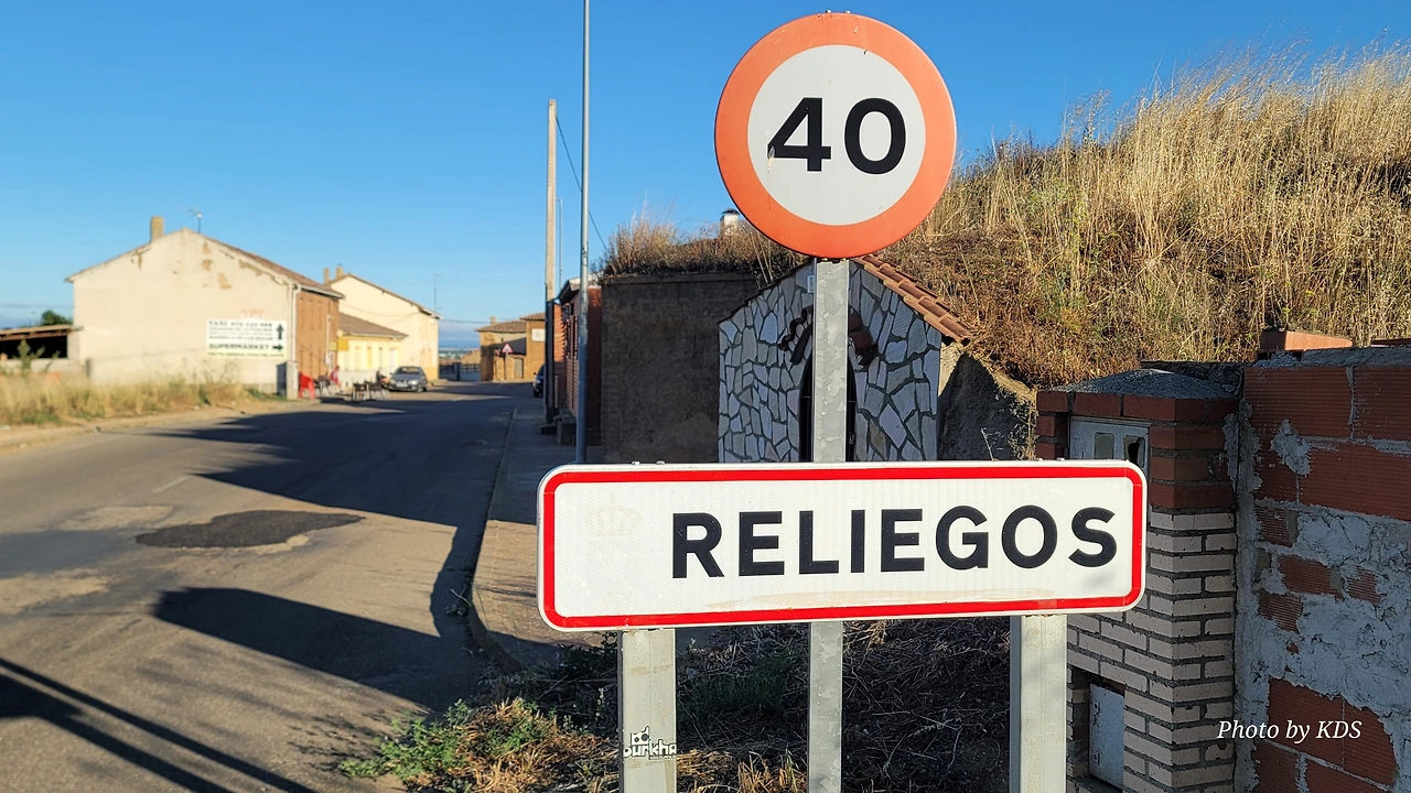 출발지에서 13Km를 걸어서 드디어 오늘의 첫 번째 마을인 렐리에고스(Relisgos)에 진입하게 된다. 렐리에고스 마을의 입구에는 오래되고 방치된 포도주 지하 저장고가 순례자의 눈에 뜨인다. 마을에는 성 꼬르넬리오와 성 시쁘리아노(Iglesia Parroquial de San Cornelio y San Cipriano)에 헌정된 유일한 성당과 알베르게가 독특할 뿐 다른 인상적인 건축물들은 보이지 않았다. 이 마을의 인구는 200명도 채 안 되는 작은 마을인데, 과거에는 포도주를 많이 생산하였는지 땅굴을 파고 만들어 놓은 포도주 저장고가 여기저기 보였다. 마을 안에서는 목재 골조에 벽돌과 흙으로 지어 아랍식 지붕을 얹은 오래된 전통 건축물을 볼 수 있었다.