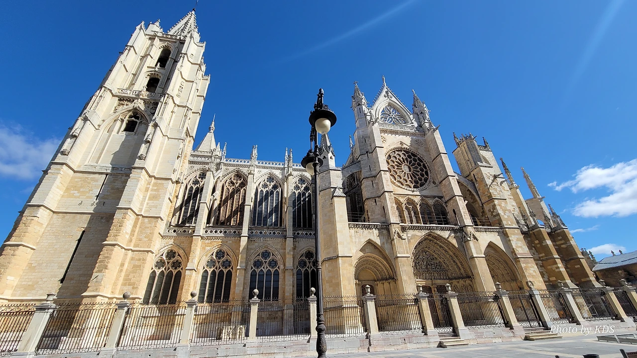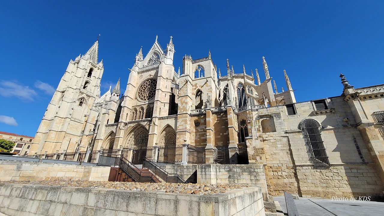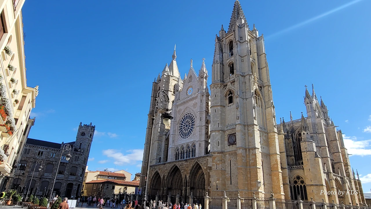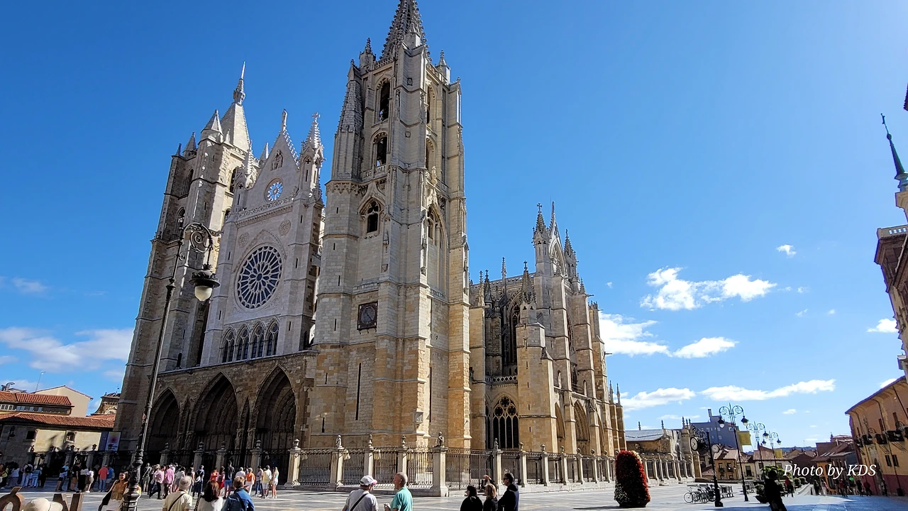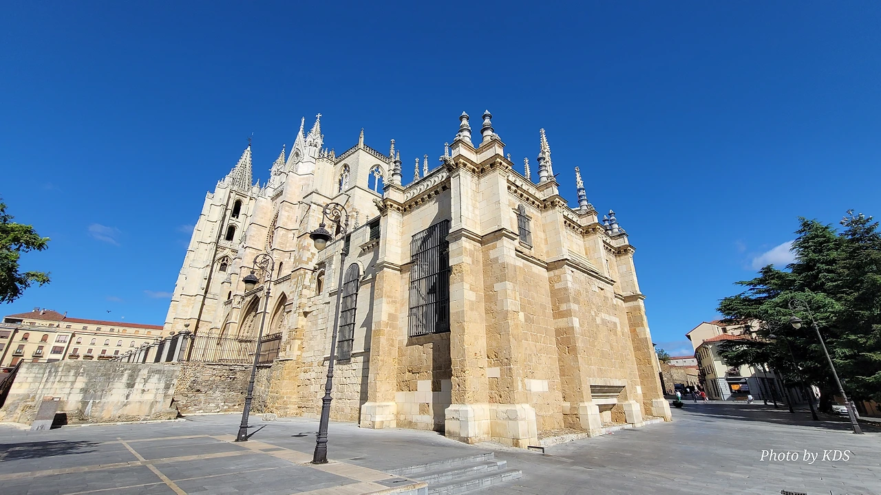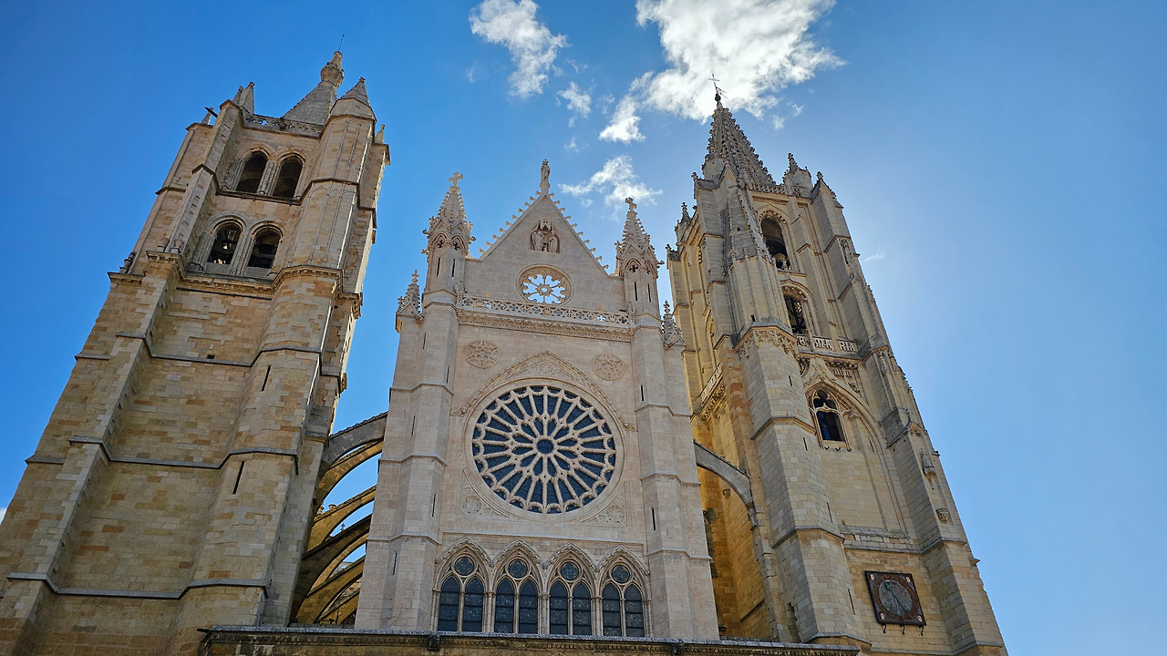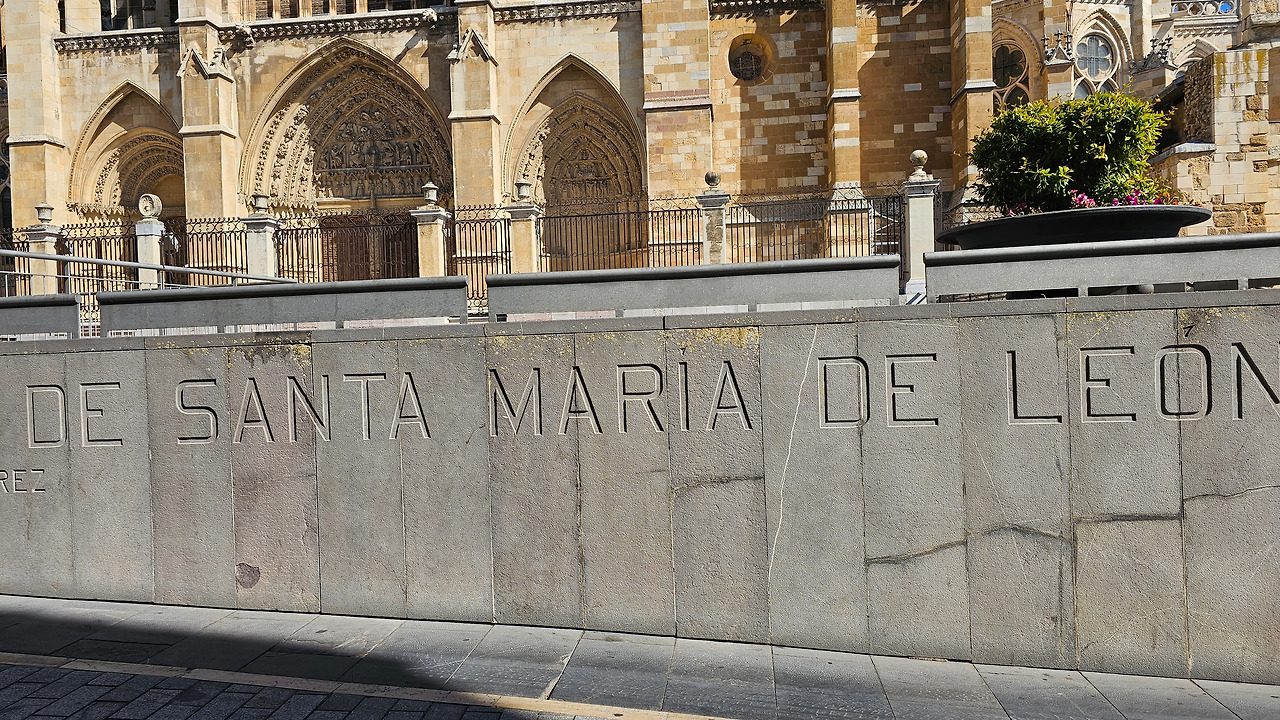 레온 대성당은 명칭이 산타 마리아 데 레글라 데 레온 대성당(Santa María de Regla de León Cathedral)인데, 성모 마리아의 이름으로 봉헌되었다. 스페인 역사상 가장 위대한 건축물 중의 하나이다. 13세기에 시작된 이 건축물은 프랑스의 영향을 받은 고딕 양식의 가장 위대한 작품 중 하나이다. '아름다운 레오네세'라는 뜻의 풀크라 레오니나(Pulchra Leonina )라고도 알려진 이곳은 산티아고 순례길 옆으로 위치해 있다. 레온 대성당에는 건축 당시에 대한 재미있는 이야기가 있다. 처음 이 성당을 건축할 때 석공들이 낮 동안 일을 해서 건물을 올리면 밤마다 거대한 두더지 한 마리가 나타나서 건물을 망가뜨리곤 했단다. 화가 난 석공들은 거대한 올가미를 놓아 두더지를 잡아서 죽였다. 죽인 두더지의 가죽을 산 후안 문에 걸어놓은 후로 더 이상 두더지가 나타나지 않았다고 전한다. 레온 대성당은 벽을 최소한의 표현으로 축소하여 스테인드 글라스로 대체한 것으로 알려져 있으며, 이는 중세 스테인드 글라스의 가장 큰 컬렉션 중 하나이다. 교회에는 거의 1,800제곱미터에 달하는 스테인드 글라스 창문이 있다. 그중 대다수는 13세기에서 15세기 사이에 만들어졌는데, 이는 중세 고딕 교회 중에서는 드문 일이다. 레온 대성당은 산티아고 순례길에 있는 부르고스(Burgos)와 종착지에 있는 산티아고 데 콤포스텔라 대성당과 함께 가장 중요한 3대 대성당 중 하나이다. 아래 사진의 길이 산 마르셀로(San Marcelo) 광장에서 레온 대성당으로 가는 산티아고 길이다.