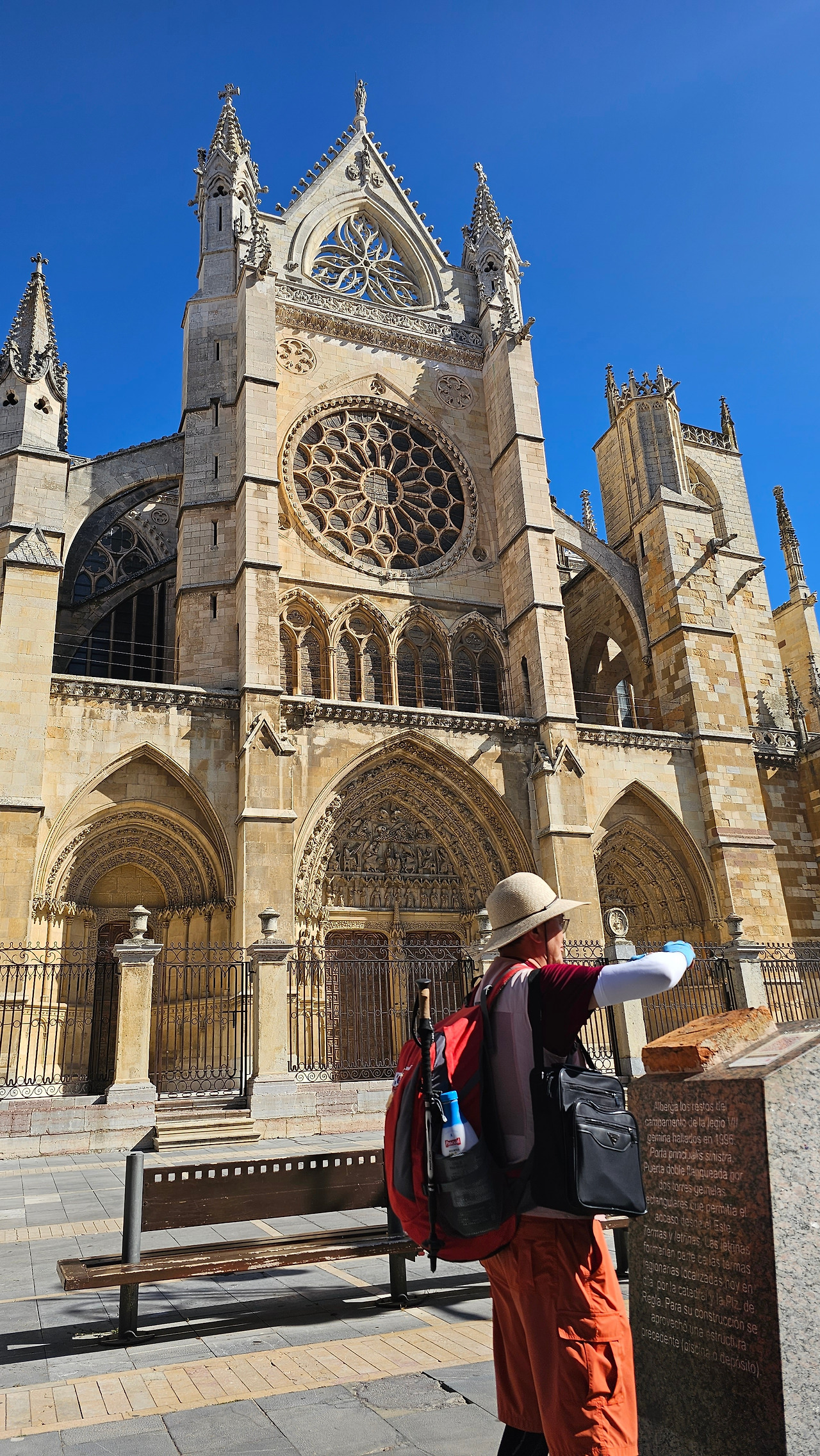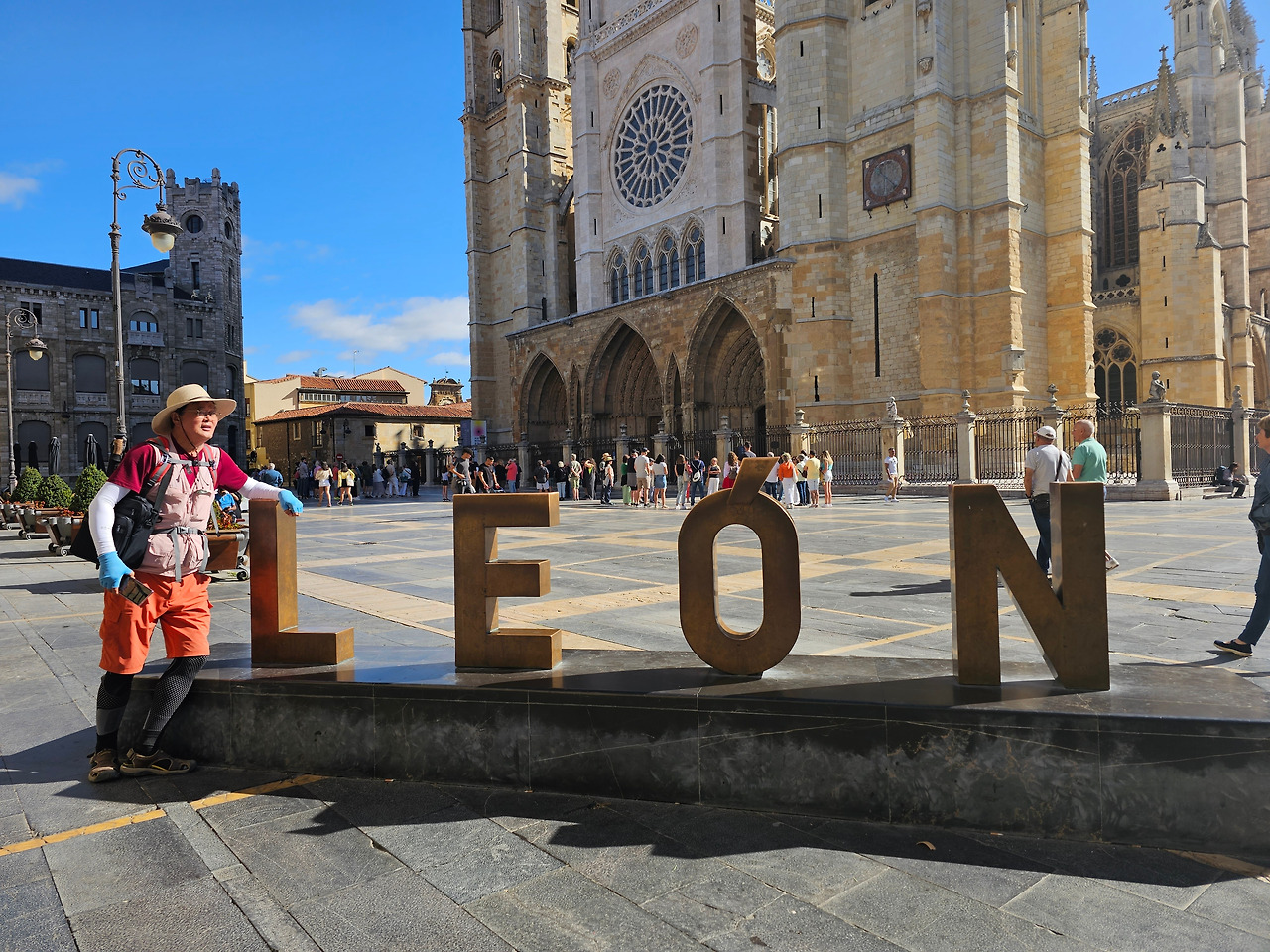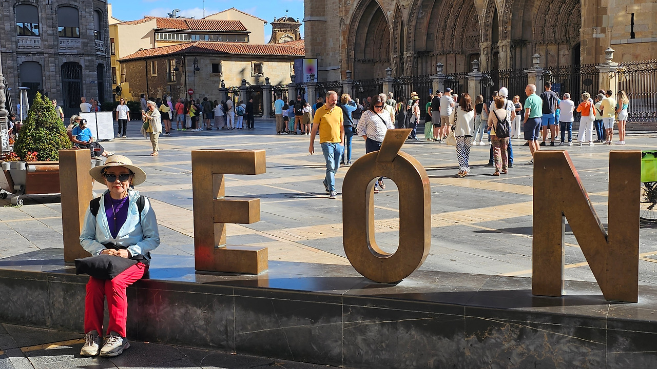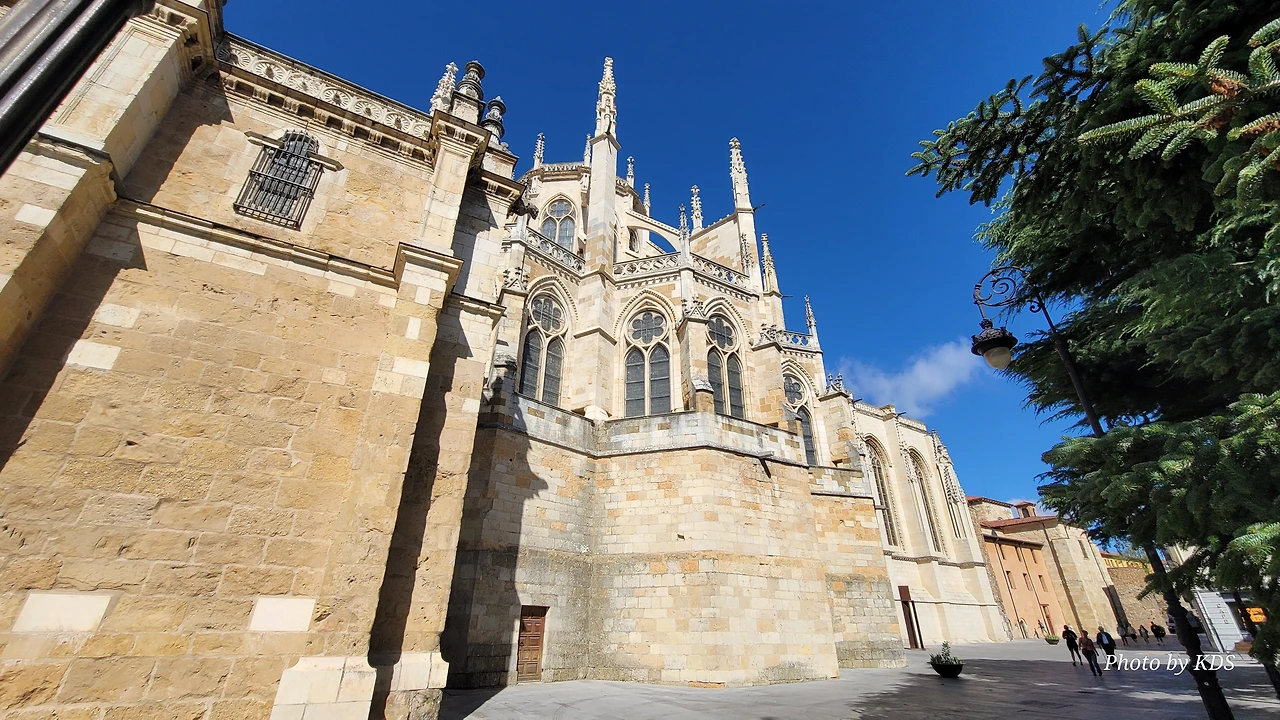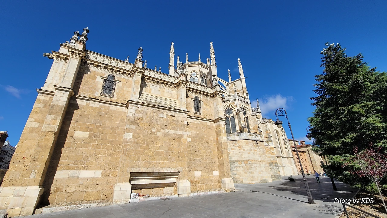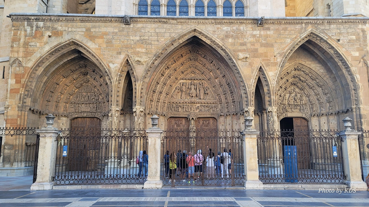 레온 대성당은 명칭이 산타 마리아 데 레글라 데 레온 대성당(Santa María de Regla de León Cathedral)인데, 성모 마리아의 이름으로 봉헌되었다. 스페인 역사상 가장 위대한 건축물 중의 하나이다. 13세기에 시작된 이 건축물은 프랑스의 영향을 받은 고딕 양식의 가장 위대한 작품 중 하나이다. '아름다운 레오네세'라는 뜻의 풀크라 레오니나(Pulchra Leonina )라고도 알려진 이곳은 산티아고 순례길 옆으로 위치해 있다. 레온 대성당에는 건축 당시에 대한 재미있는 이야기가 있다. 처음 이 성당을 건축할 때 석공들이 낮 동안 일을 해서 건물을 올리면 밤마다 거대한 두더지 한 마리가 나타나서 건물을 망가뜨리곤 했단다. 화가 난 석공들은 거대한 올가미를 놓아 두더지를 잡아서 죽였다. 죽인 두더지의 가죽을 산 후안 문에 걸어놓은 후로 더 이상 두더지가 나타나지 않았다고 전한다. 레온 대성당은 벽을 최소한의 표현으로 축소하여 스테인드 글라스로 대체한 것으로 알려져 있으며, 이는 중세 스테인드 글라스의 가장 큰 컬렉션 중 하나이다. 교회에는 거의 1,800제곱미터에 달하는 스테인드 글라스 창문이 있다. 그중 대다수는 13세기에서 15세기 사이에 만들어졌는데, 이는 중세 고딕 교회 중에서는 드문 일이다. 레온 대성당은 산티아고 순례길에 있는 부르고스(Burgos)와 종착지에 있는 산티아고 데 콤포스텔라 대성당과 함께 가장 중요한 3대 대성당 중 하나이다. 아래 사진의 길이 산 마르셀로(San Marcelo) 광장에서 레온 대성당으로 가는 산티아고 길이다.