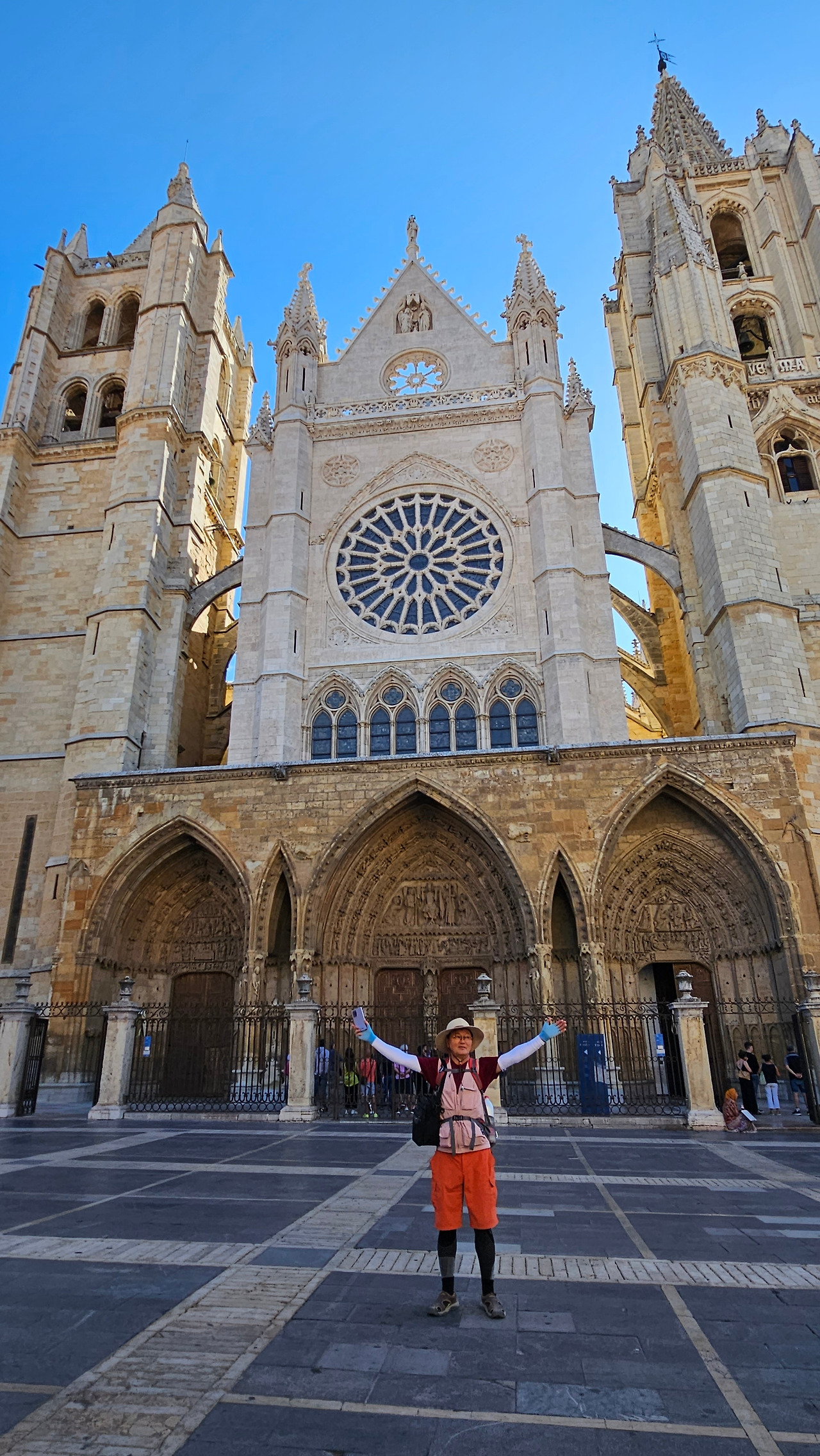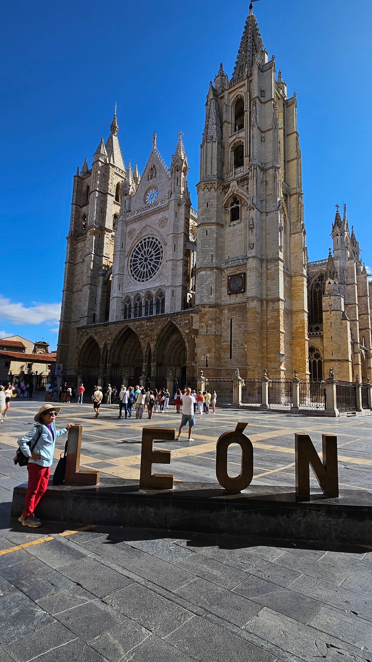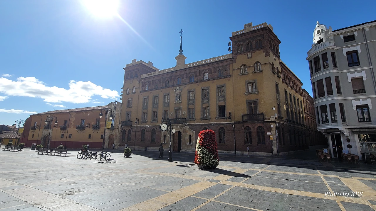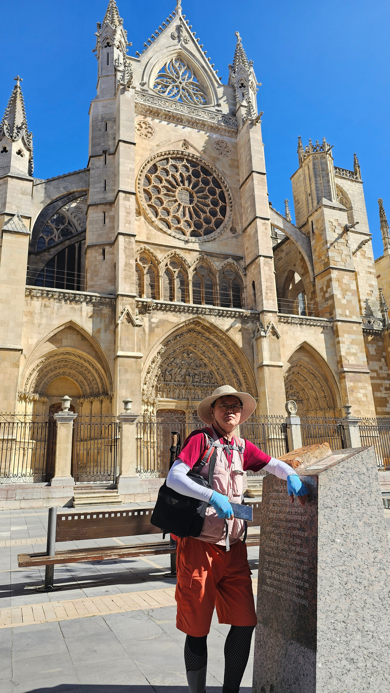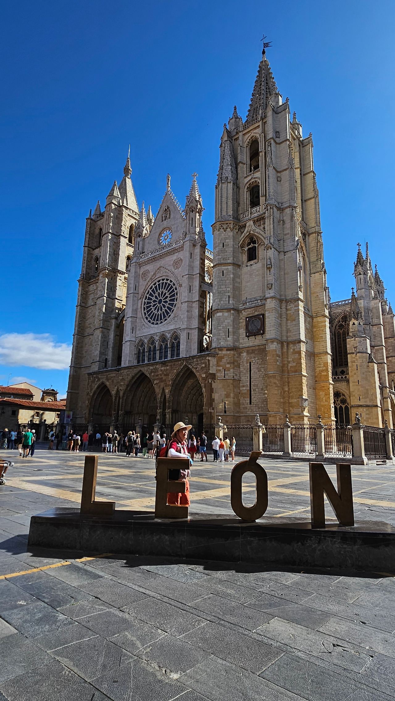 레온 대성당은 명칭이 산타 마리아 데 레글라 데 레온 대성당(Santa María de Regla de León Cathedral)인데, 성모 마리아의 이름으로 봉헌되었다. 스페인 역사상 가장 위대한 건축물 중의 하나이다. 13세기에 시작된 이 건축물은 프랑스의 영향을 받은 고딕 양식의 가장 위대한 작품 중 하나이다. '아름다운 레오네세'라는 뜻의 풀크라 레오니나(Pulchra Leonina )라고도 알려진 이곳은 산티아고 순례길 옆으로 위치해 있다. 레온 대성당에는 건축 당시에 대한 재미있는 이야기가 있다. 처음 이 성당을 건축할 때 석공들이 낮 동안 일을 해서 건물을 올리면 밤마다 거대한 두더지 한 마리가 나타나서 건물을 망가뜨리곤 했단다. 화가 난 석공들은 거대한 올가미를 놓아 두더지를 잡아서 죽였다. 죽인 두더지의 가죽을 산 후안 문에 걸어놓은 후로 더 이상 두더지가 나타나지 않았다고 전한다. 레온 대성당은 벽을 최소한의 표현으로 축소하여 스테인드 글라스로 대체한 것으로 알려져 있으며, 이는 중세 스테인드 글라스의 가장 큰 컬렉션 중 하나이다. 교회에는 거의 1,800제곱미터에 달하는 스테인드 글라스 창문이 있다. 그중 대다수는 13세기에서 15세기 사이에 만들어졌는데, 이는 중세 고딕 교회 중에서는 드문 일이다. 레온 대성당은 산티아고 순례길에 있는 부르고스(Burgos)와 종착지에 있는 산티아고 데 콤포스텔라 대성당과 함께 가장 중요한 3대 대성당 중 하나이다. 아래 사진의 길이 산 마르셀로(San Marcelo) 광장에서 레온 대성당으로 가는 산티아고 길이다.