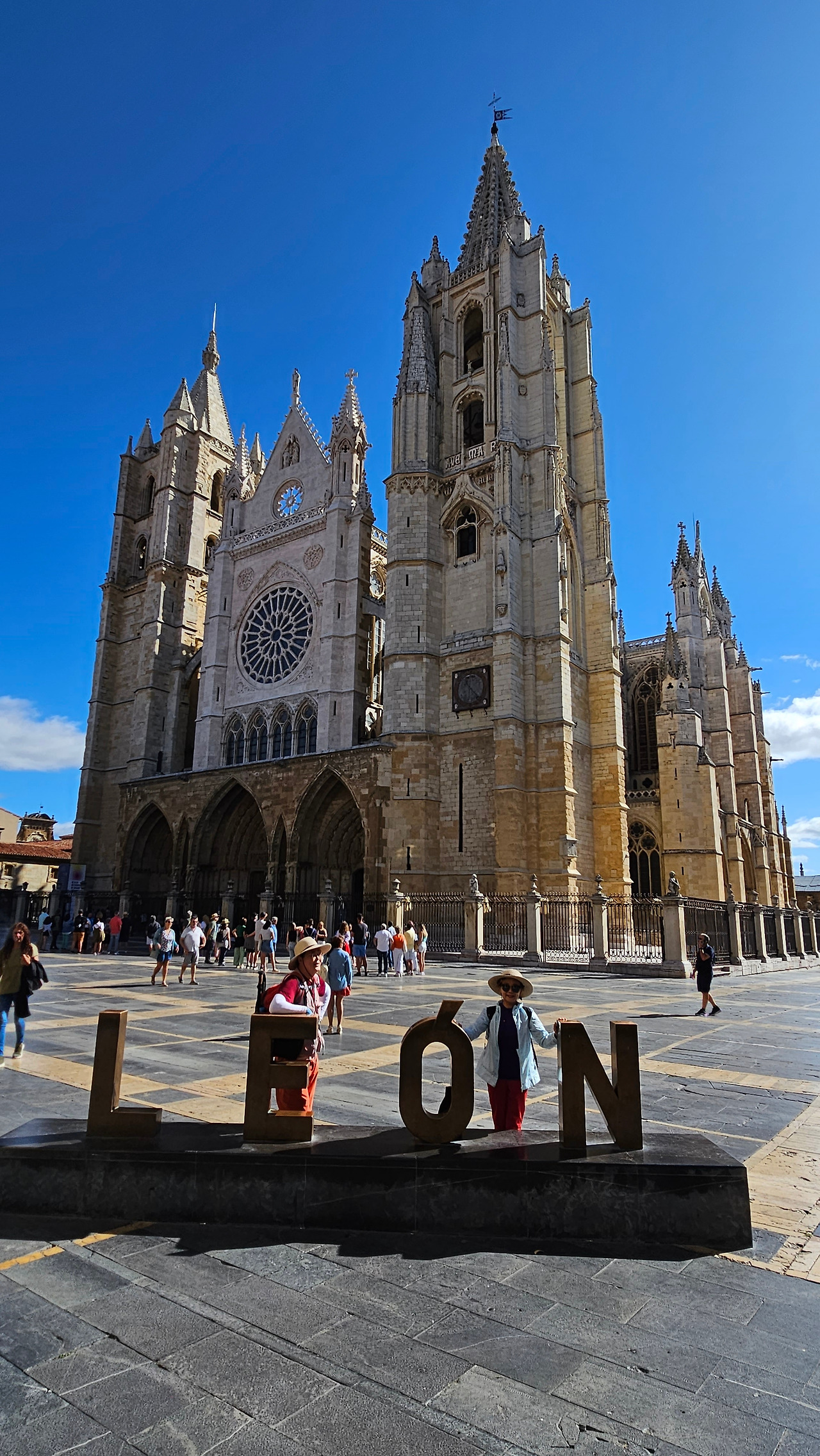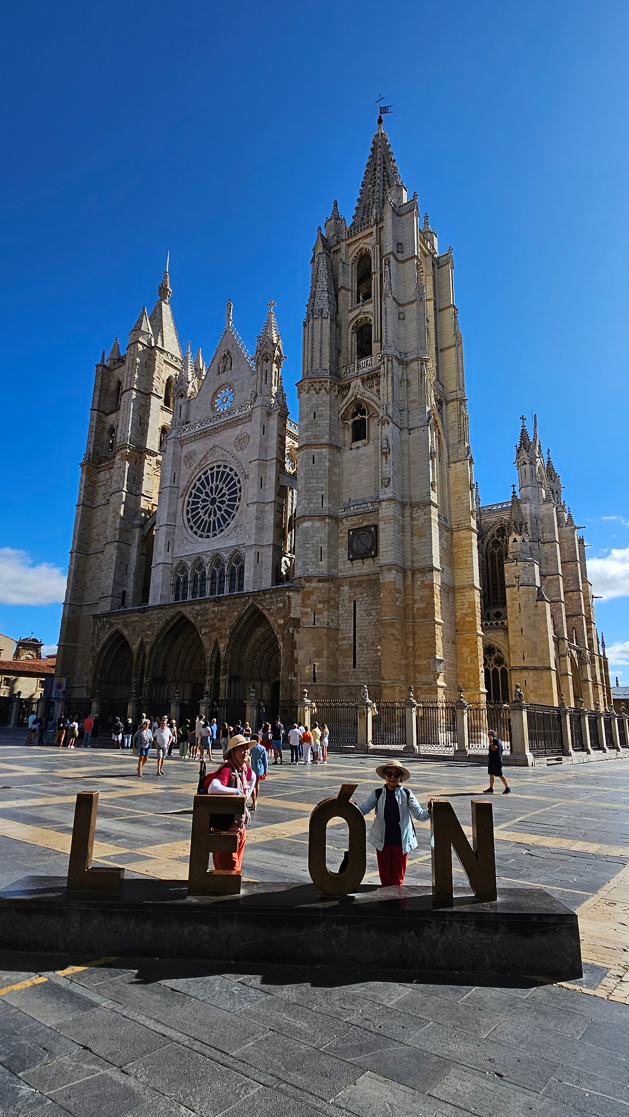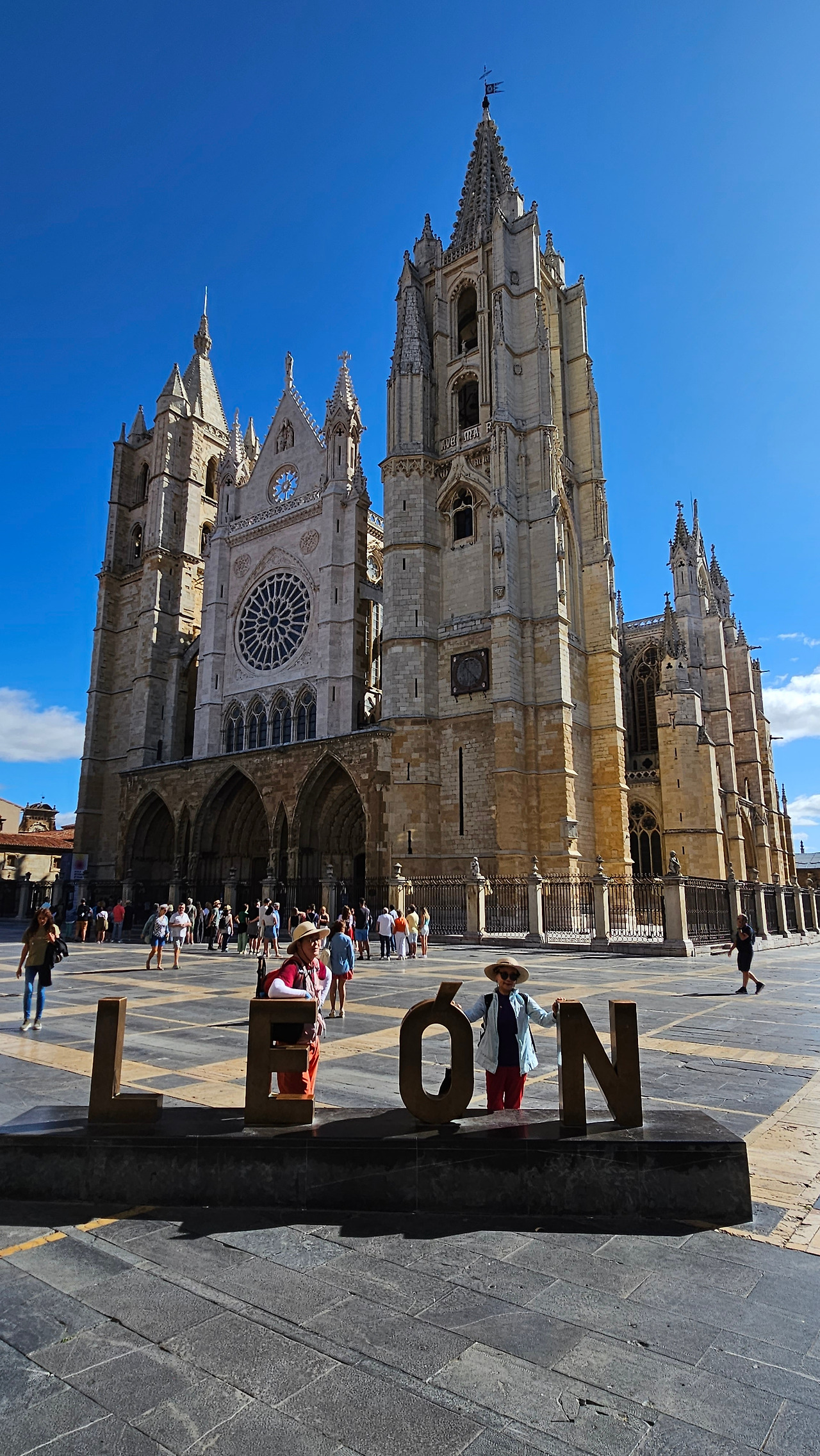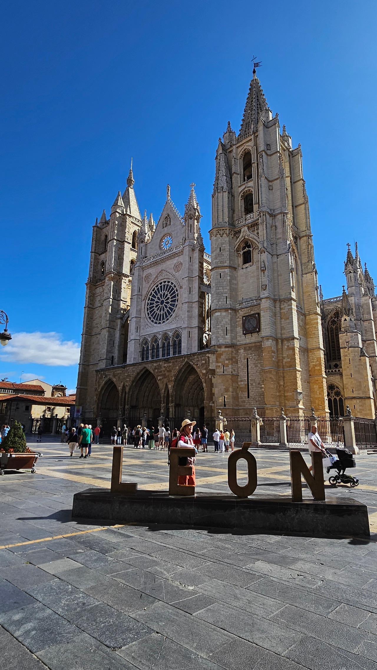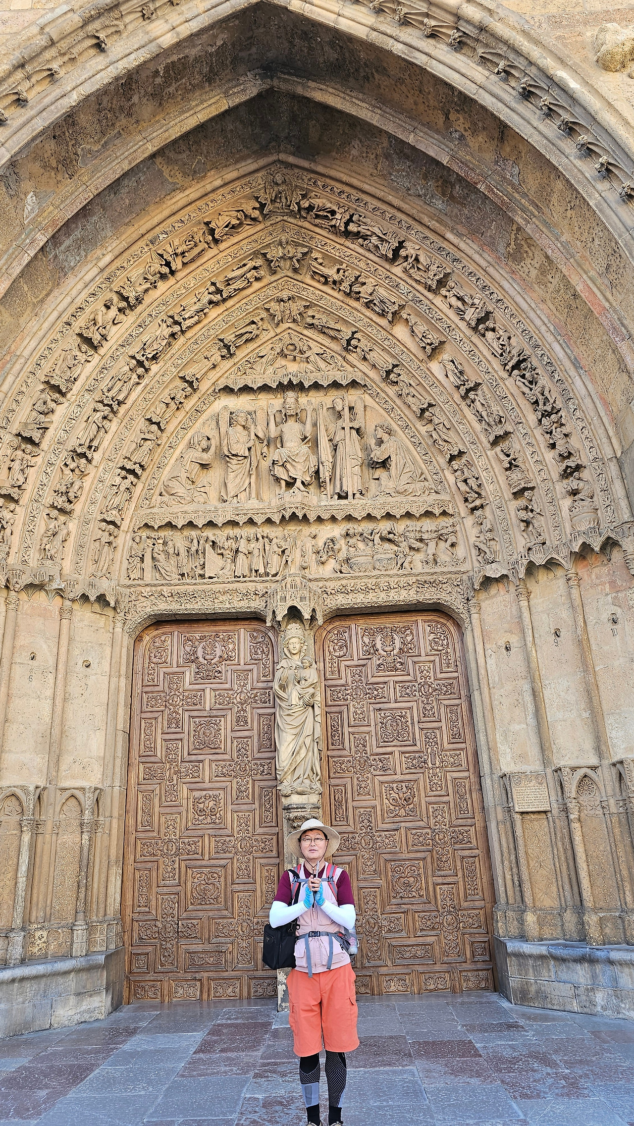 레온 대성당은 명칭이 산타 마리아 데 레글라 데 레온 대성당(Santa María de Regla de León Cathedral)인데, 성모 마리아의 이름으로 봉헌되었다. 스페인 역사상 가장 위대한 건축물 중의 하나이다. 13세기에 시작된 이 건축물은 프랑스의 영향을 받은 고딕 양식의 가장 위대한 작품 중 하나이다. '아름다운 레오네세'라는 뜻의 풀크라 레오니나(Pulchra Leonina )라고도 알려진 이곳은 산티아고 순례길 옆으로 위치해 있다. 레온 대성당에는 건축 당시에 대한 재미있는 이야기가 있다. 처음 이 성당을 건축할 때 석공들이 낮 동안 일을 해서 건물을 올리면 밤마다 거대한 두더지 한 마리가 나타나서 건물을 망가뜨리곤 했단다. 화가 난 석공들은 거대한 올가미를 놓아 두더지를 잡아서 죽였다. 죽인 두더지의 가죽을 산 후안 문에 걸어놓은 후로 더 이상 두더지가 나타나지 않았다고 전한다. 레온 대성당은 벽을 최소한의 표현으로 축소하여 스테인드 글라스로 대체한 것으로 알려져 있으며, 이는 중세 스테인드 글라스의 가장 큰 컬렉션 중 하나이다. 교회에는 거의 1,800제곱미터에 달하는 스테인드 글라스 창문이 있다. 그중 대다수는 13세기에서 15세기 사이에 만들어졌는데, 이는 중세 고딕 교회 중에서는 드문 일이다. 레온 대성당은 산티아고 순례길에 있는 부르고스(Burgos)와 종착지에 있는 산티아고 데 콤포스텔라 대성당과 함께 가장 중요한 3대 대성당 중 하나이다. 아래 사진의 길이 산 마르셀로(San Marcelo) 광장에서 레온 대성당으로 가는 산티아고 길이다.