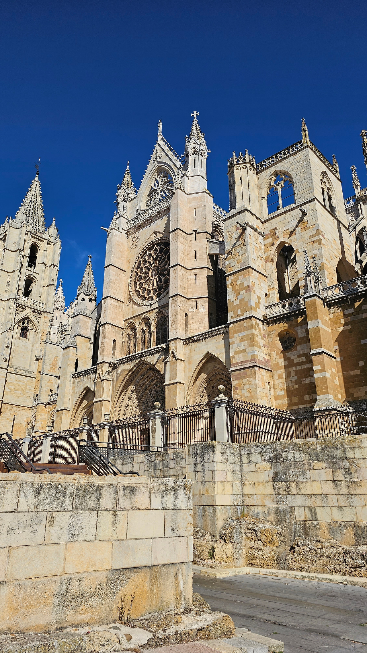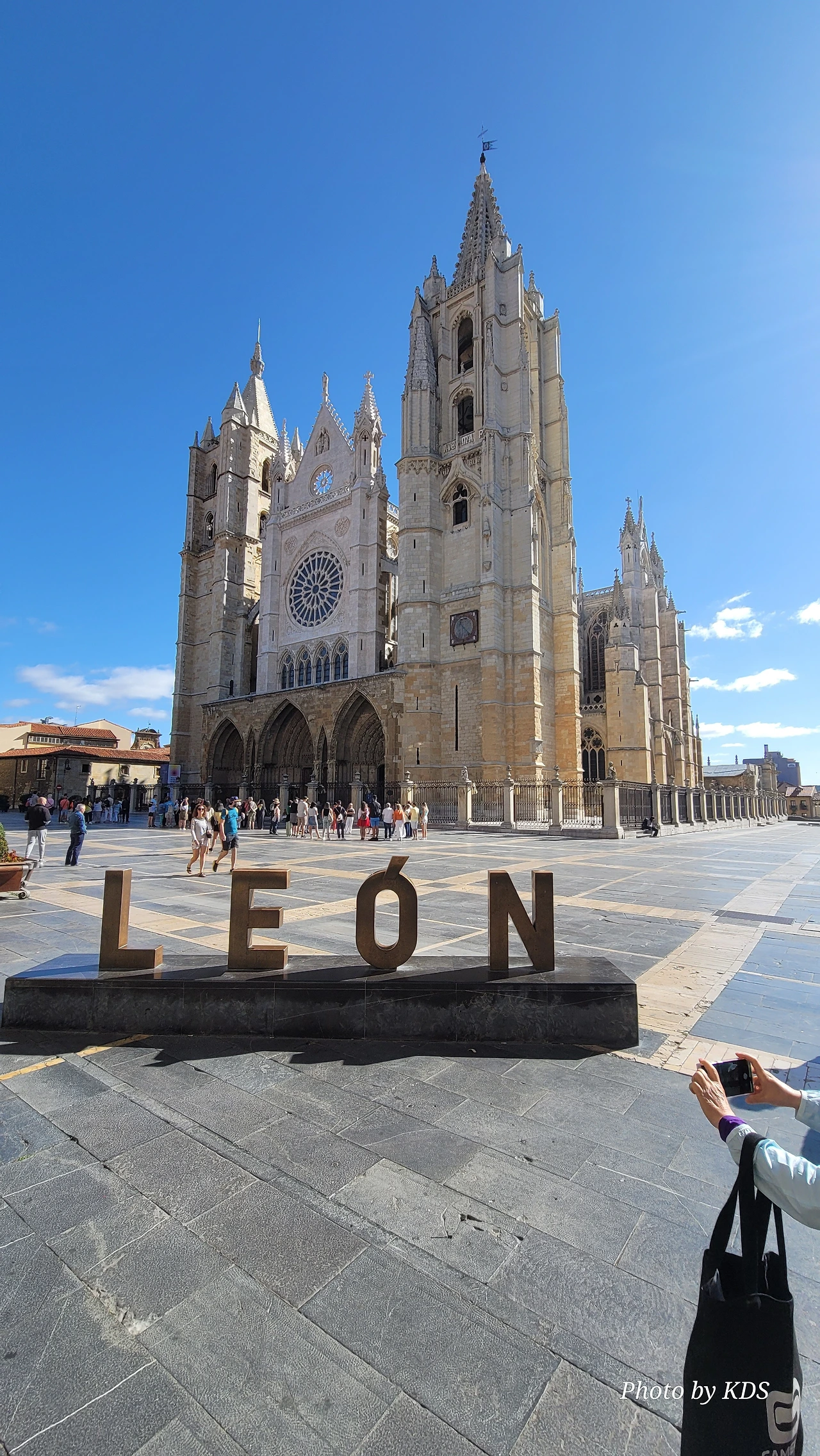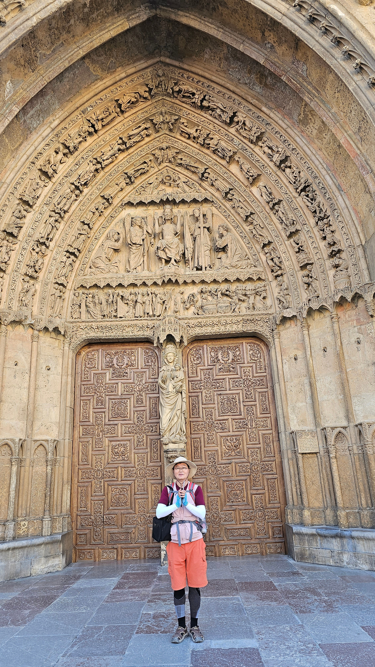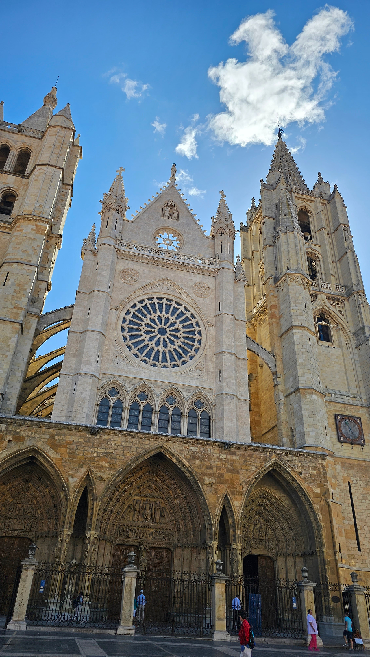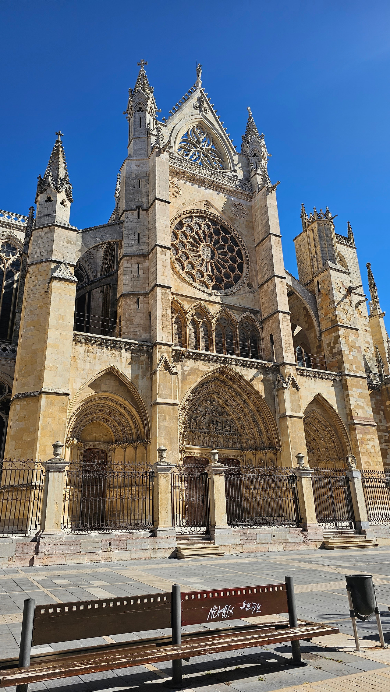 레온 대성당은 명칭이 산타 마리아 데 레글라 데 레온 대성당(Santa María de Regla de León Cathedral)인데, 성모 마리아의 이름으로 봉헌되었다. 스페인 역사상 가장 위대한 건축물 중의 하나이다. 13세기에 시작된 이 건축물은 프랑스의 영향을 받은 고딕 양식의 가장 위대한 작품 중 하나이다. '아름다운 레오네세'라는 뜻의 풀크라 레오니나(Pulchra Leonina )라고도 알려진 이곳은 산티아고 순례길 옆으로 위치해 있다. 레온 대성당에는 건축 당시에 대한 재미있는 이야기가 있다. 처음 이 성당을 건축할 때 석공들이 낮 동안 일을 해서 건물을 올리면 밤마다 거대한 두더지 한 마리가 나타나서 건물을 망가뜨리곤 했단다. 화가 난 석공들은 거대한 올가미를 놓아 두더지를 잡아서 죽였다. 죽인 두더지의 가죽을 산 후안 문에 걸어놓은 후로 더 이상 두더지가 나타나지 않았다고 전한다. 레온 대성당은 벽을 최소한의 표현으로 축소하여 스테인드 글라스로 대체한 것으로 알려져 있으며, 이는 중세 스테인드 글라스의 가장 큰 컬렉션 중 하나이다. 교회에는 거의 1,800제곱미터에 달하는 스테인드 글라스 창문이 있다. 그중 대다수는 13세기에서 15세기 사이에 만들어졌는데, 이는 중세 고딕 교회 중에서는 드문 일이다. 레온 대성당은 산티아고 순례길에 있는 부르고스(Burgos)와 종착지에 있는 산티아고 데 콤포스텔라 대성당과 함께 가장 중요한 3대 대성당 중 하나이다. 아래 사진의 길이 산 마르셀로(San Marcelo) 광장에서 레온 대성당으로 가는 산티아고 길이다.