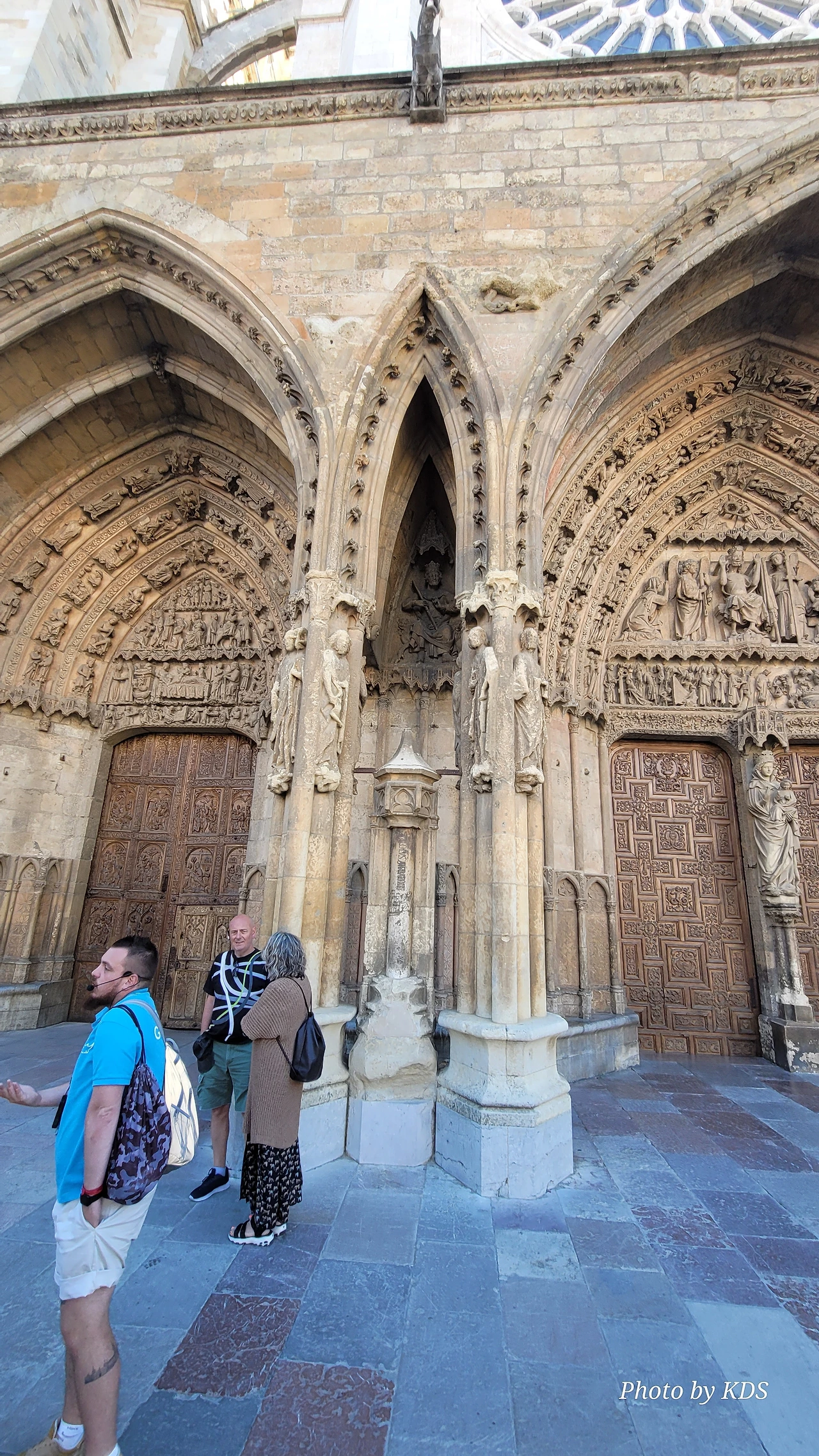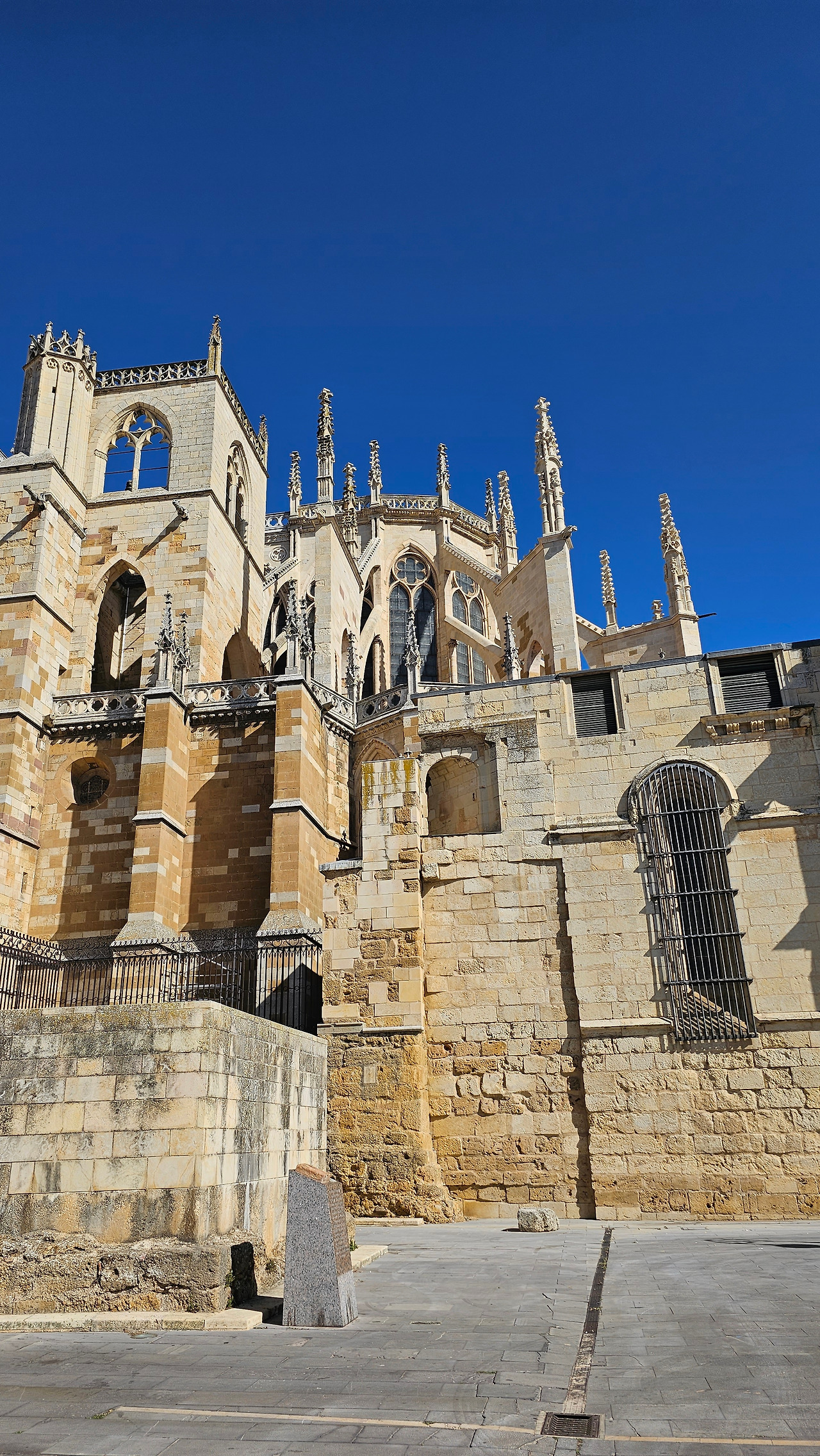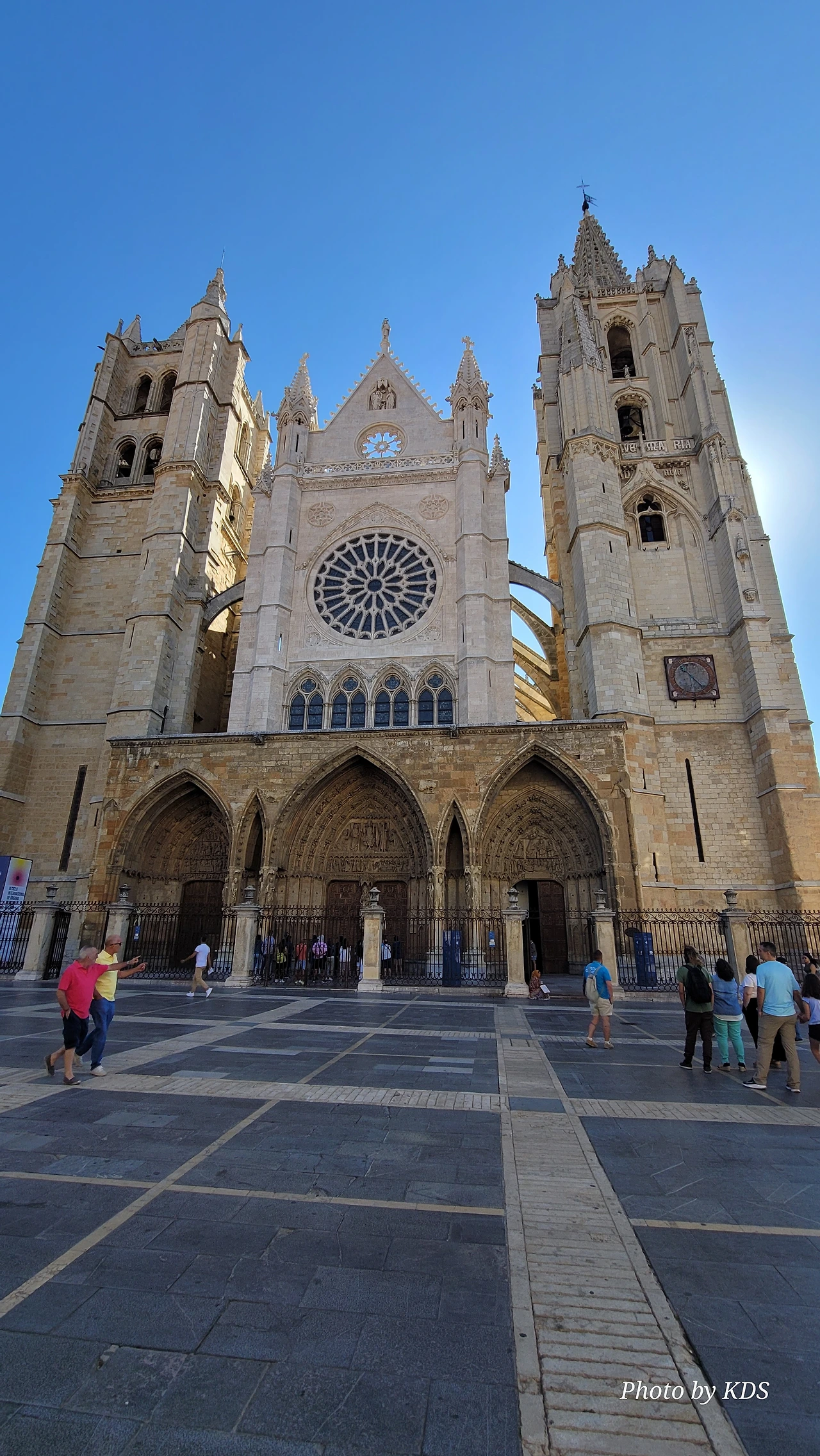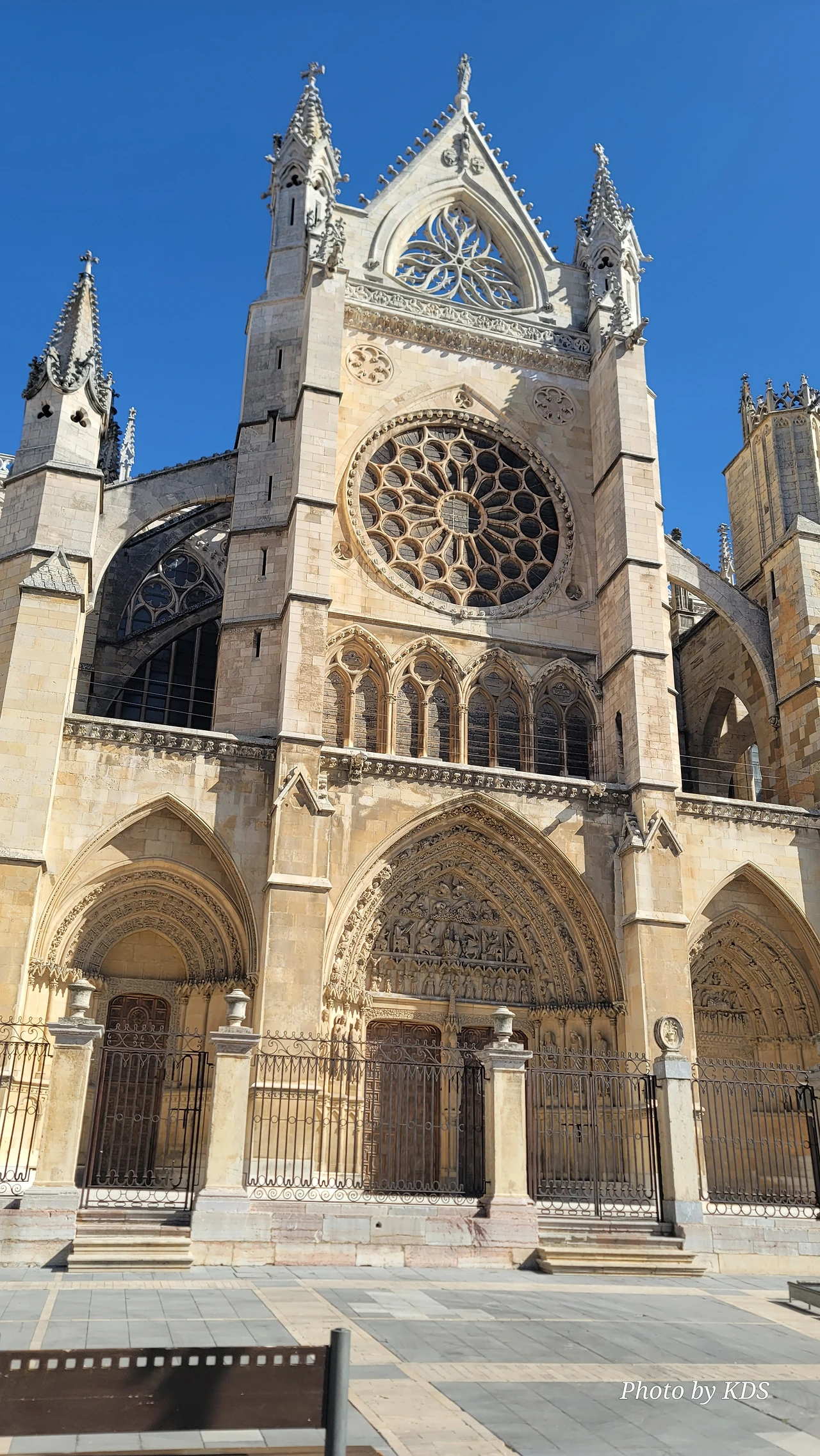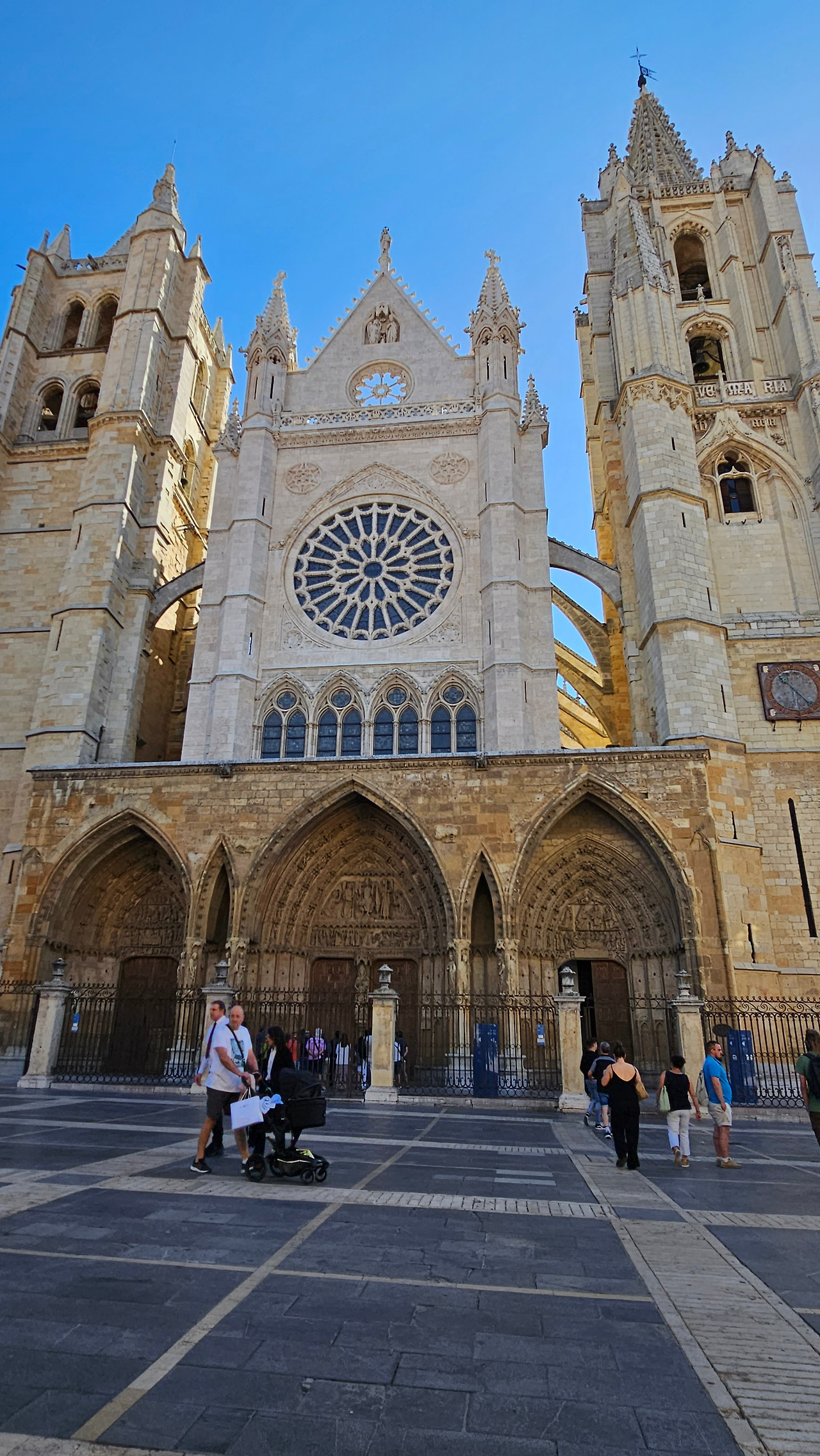 레온 대성당은 명칭이 산타 마리아 데 레글라 데 레온 대성당(Santa María de Regla de León Cathedral)인데, 성모 마리아의 이름으로 봉헌되었다. 스페인 역사상 가장 위대한 건축물 중의 하나이다. 13세기에 시작된 이 건축물은 프랑스의 영향을 받은 고딕 양식의 가장 위대한 작품 중 하나이다. '아름다운 레오네세'라는 뜻의 풀크라 레오니나(Pulchra Leonina )라고도 알려진 이곳은 산티아고 순례길 옆으로 위치해 있다. 레온 대성당에는 건축 당시에 대한 재미있는 이야기가 있다. 처음 이 성당을 건축할 때 석공들이 낮 동안 일을 해서 건물을 올리면 밤마다 거대한 두더지 한 마리가 나타나서 건물을 망가뜨리곤 했단다. 화가 난 석공들은 거대한 올가미를 놓아 두더지를 잡아서 죽였다. 죽인 두더지의 가죽을 산 후안 문에 걸어놓은 후로 더 이상 두더지가 나타나지 않았다고 전한다. 레온 대성당은 벽을 최소한의 표현으로 축소하여 스테인드 글라스로 대체한 것으로 알려져 있으며, 이는 중세 스테인드 글라스의 가장 큰 컬렉션 중 하나이다. 교회에는 거의 1,800제곱미터에 달하는 스테인드 글라스 창문이 있다. 그중 대다수는 13세기에서 15세기 사이에 만들어졌는데, 이는 중세 고딕 교회 중에서는 드문 일이다. 레온 대성당은 산티아고 순례길에 있는 부르고스(Burgos)와 종착지에 있는 산티아고 데 콤포스텔라 대성당과 함께 가장 중요한 3대 대성당 중 하나이다. 아래 사진의 길이 산 마르셀로(San Marcelo) 광장에서 레온 대성당으로 가는 산티아고 길이다.