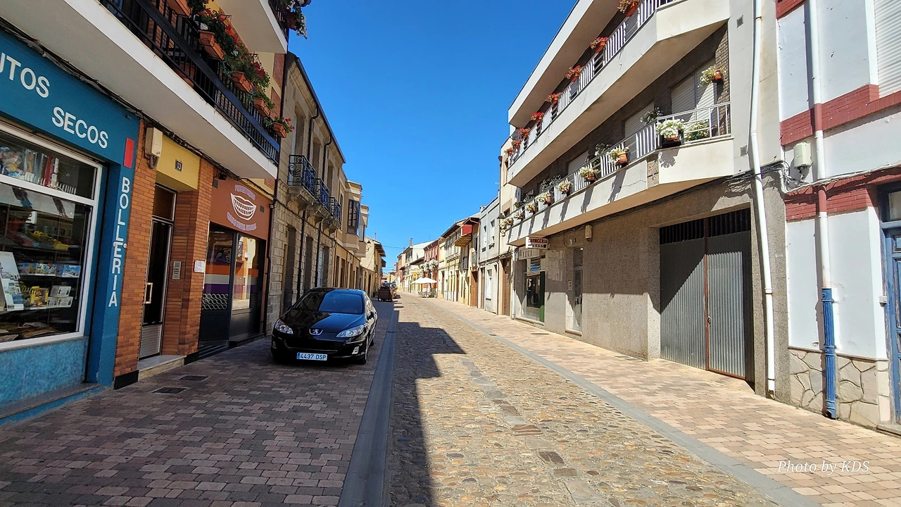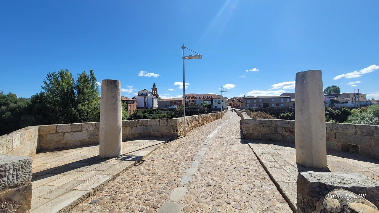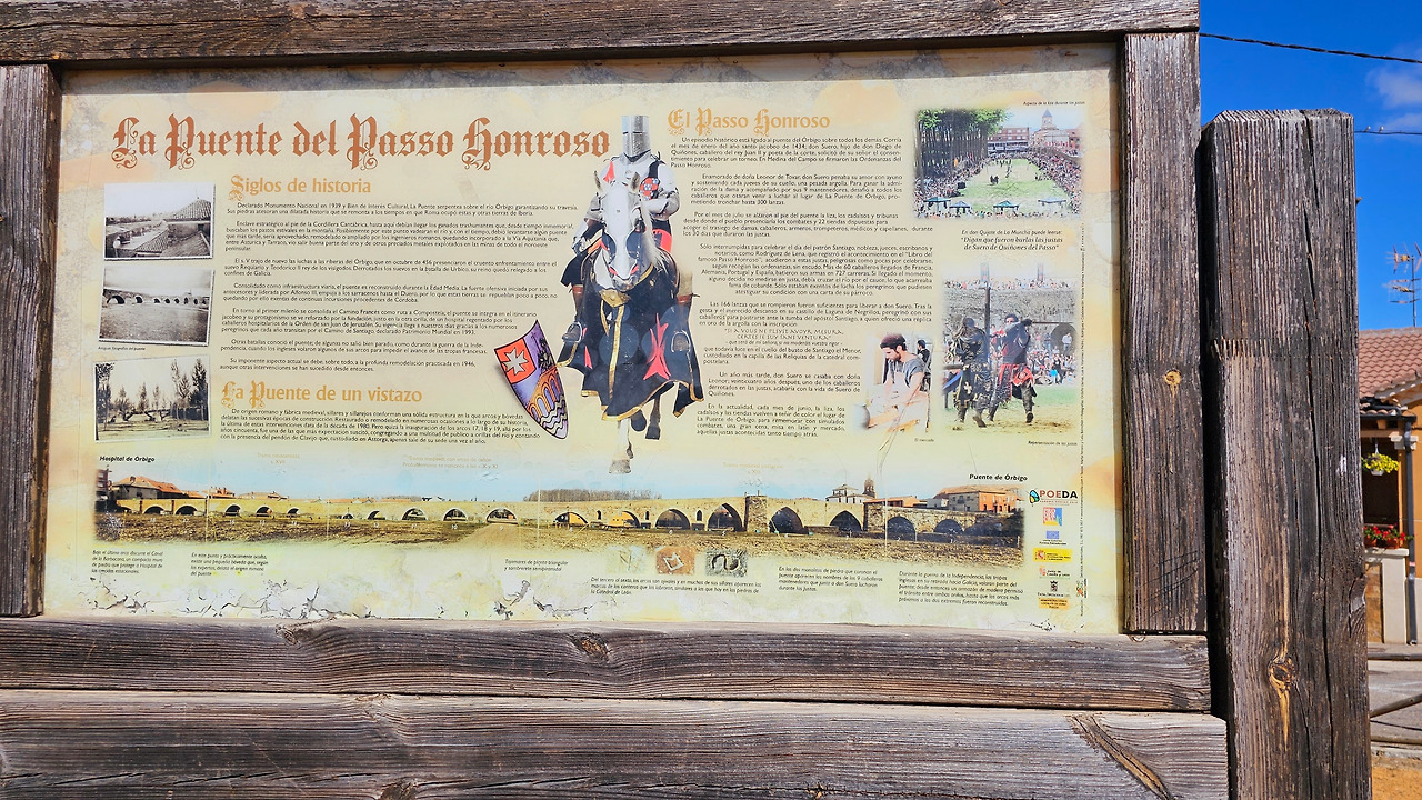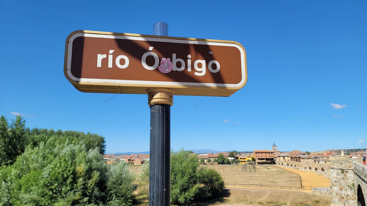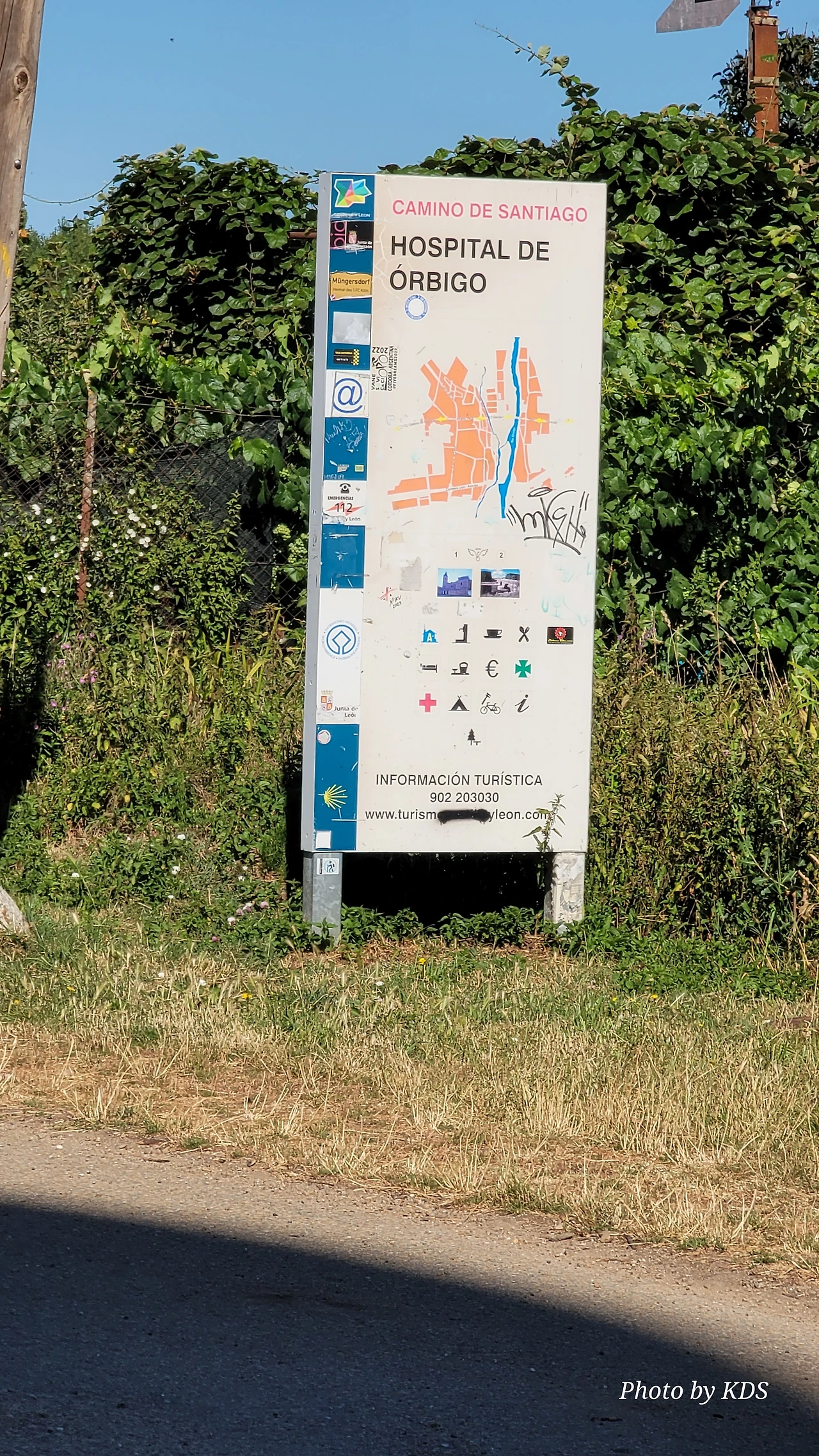 오스삐딸 데 오르비고(Hospital de Órbigo) 마을은 직전 마을인 산 마르틴 델 카미노(San Martin del Camino)로부터 6.5Km 정도 떨어진 곳이다. 마을 중앙을 흐르는 강이 오르비고 강(Rio Orbigo)인데, 원래 강이 흐르는 방향으로 보아 왼쪽 편에서부터 마을이 형성되었다. 중세시대에는 오르비고 강의 왼쪽 기슭에 산타 마리아 교회 주변에 형성된 작은 마을이었다. 마을 이름도 이 강의 다리 이름과 같은 푸엔테 델 오르비고(Puente del Órbigo)라고 불렸다. 16 세기말, 강의 오른쪽 기슭에 있는 옛 순례자 병원 옆에 또 다른 도시가 형성되었다. 병원은 예루살렘의 성 요한 기사단의 명령에 의해 설립되었다. 이 마을은 순례자를 위한 병원인 이 오르비고 병원(Hospital de Órbigo)에서 이름을 따왔다. 그러니까 이 마을은 오르비고 강을 끼고 양쪽으로 나뉘어 있다. 왼쪽은 뿌엔테(Puente) 즉 다리에 연유하고, 오른쪽은 오스삐딸(Hospital) 즉 병원에서 연유된 것이다. 이곳으로 오는 길에 산티아고까지 280Km 남았다는 도로 표지판이 서있다.