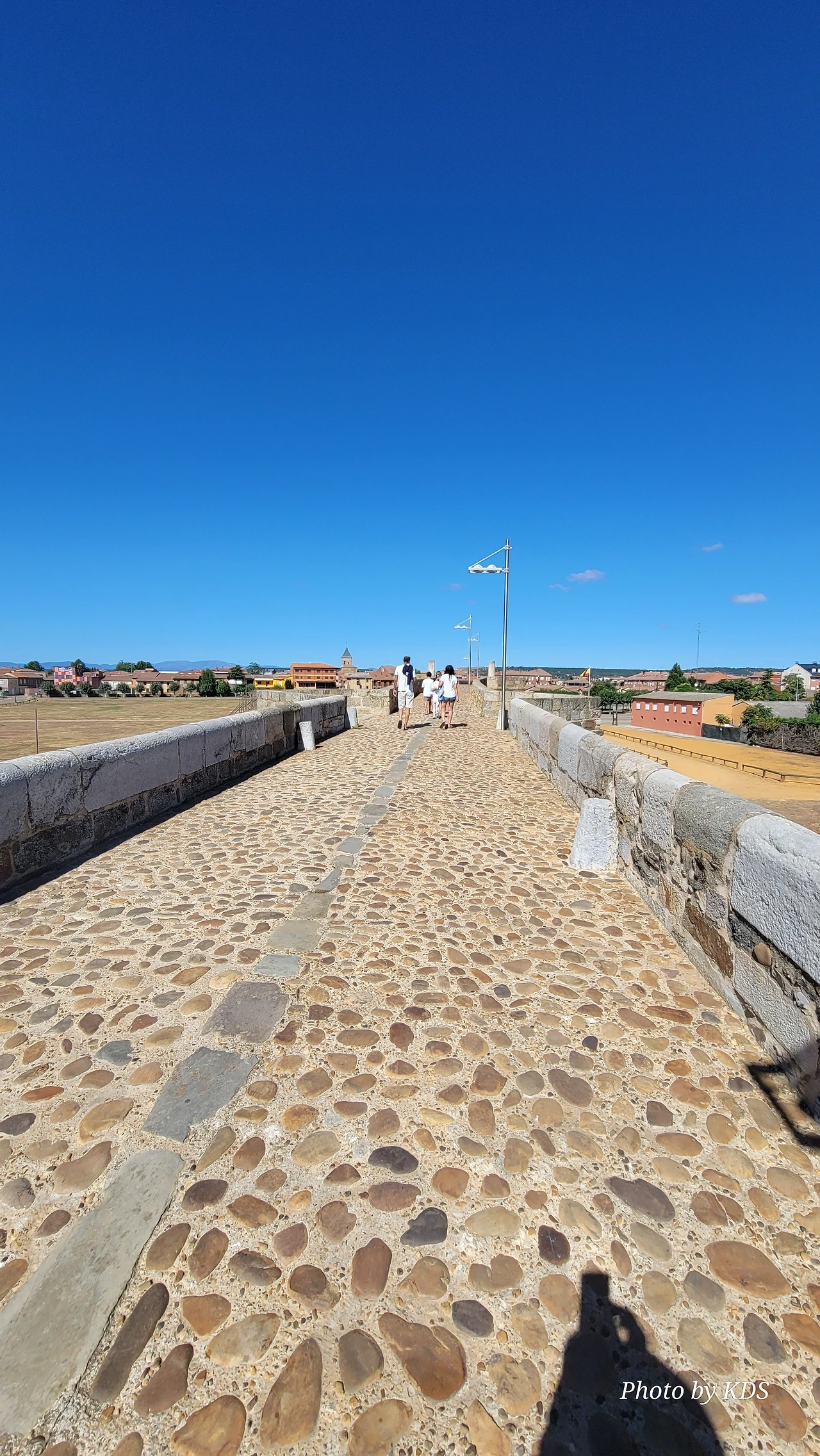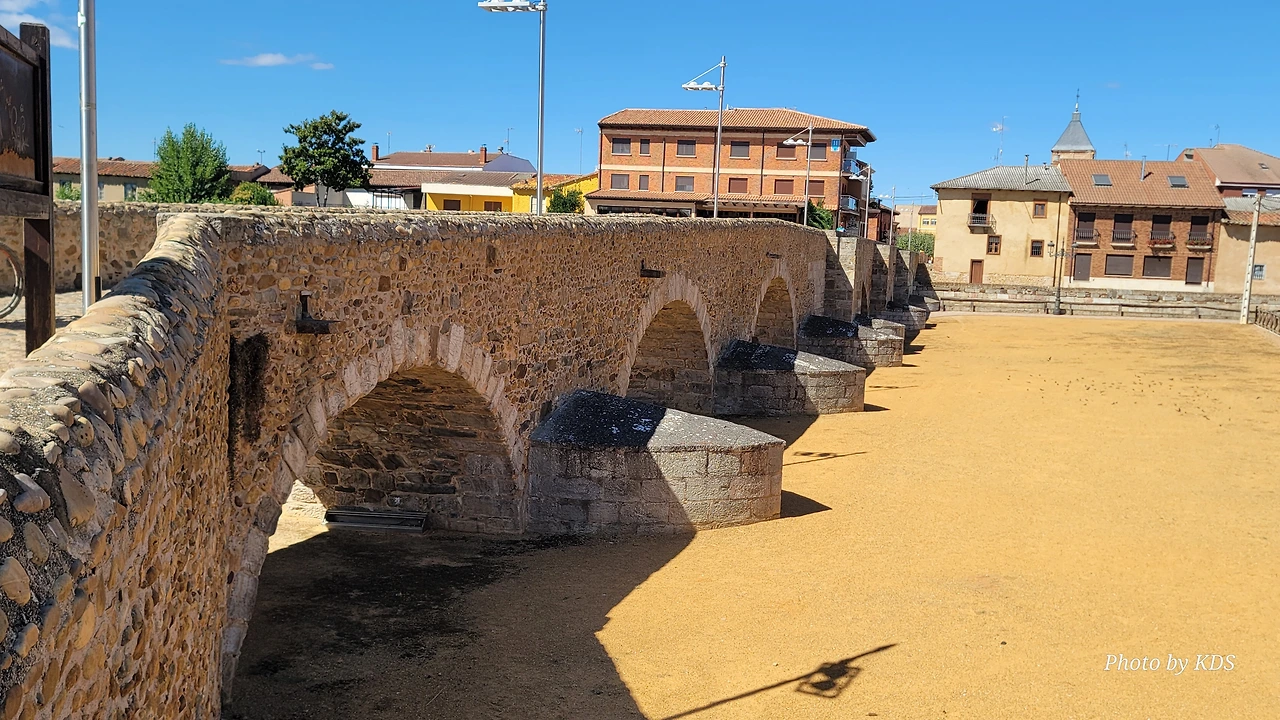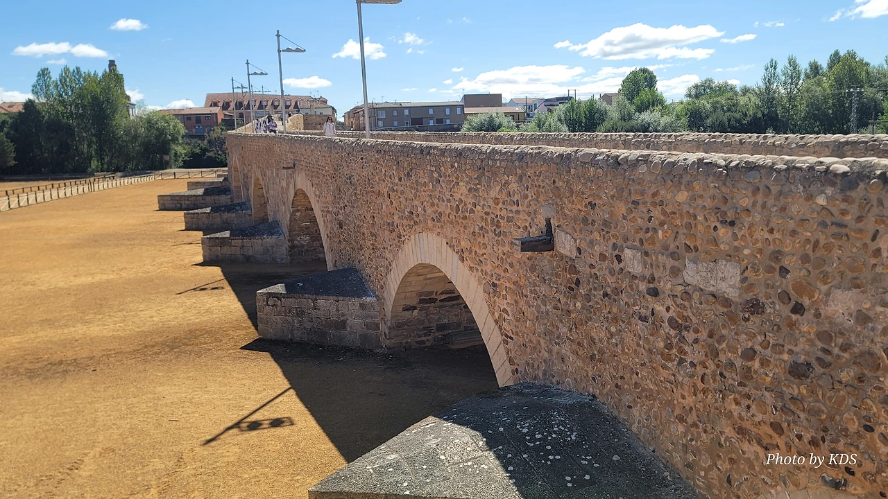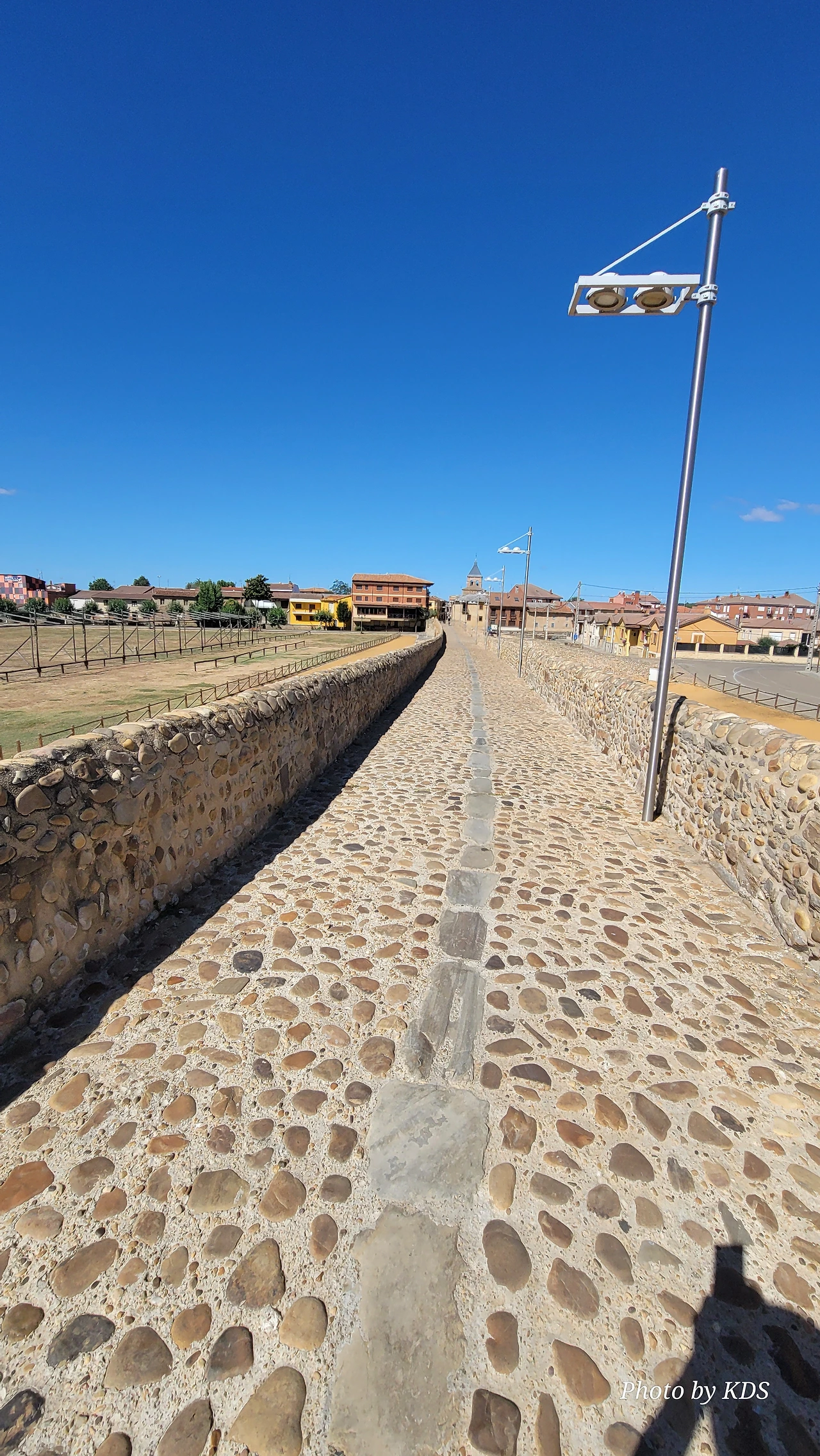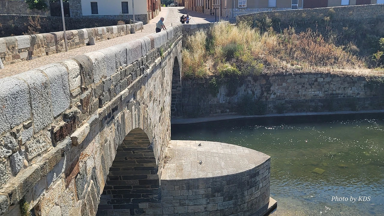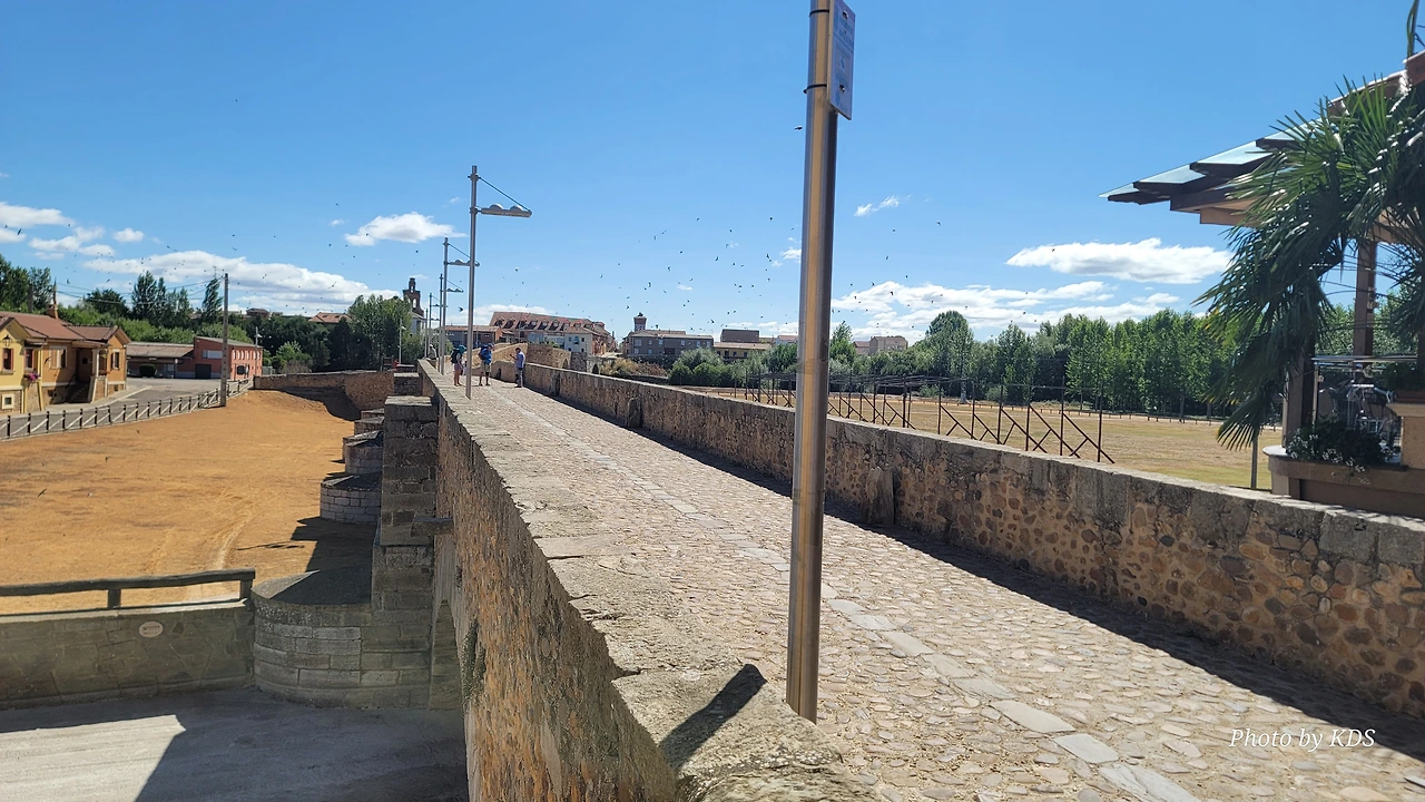 걸어오는 길목에는 거대한 물탱크도 있고 고층 탑처럼 생긴 저수조도 보인다. 오르비고 강을 건너기 전에 있는 옛날 마을인 뿌엔떼 데 오르비고 마을에는 성모 정화 성당(Iglesia de la Purificacion)이 있는데, 여기도 예외 없이 종탑에는 새들의 둥지가 커다랗게 지어져 있었다. 성당의 문이 닫혀 있어서 안으로 들어갈 수 없어서 그냥 지나쳤다. 강에 놓여 있는 오래되고 유서 깊은 다리의 시작 부분에서 강을 내려다보니 시원하게 맑은 물이 흘러가고 있다. 수량도 많고 주변에 숲도 매우 잘 조성되어 있다. 강에는 견지낚시를 하는 태공들이 열심히 물고기를 쫓고 있었다. 다리를 건너는데, 물이 흘러가는 부분과 고수부지처럼 물이 없는 지역으로 구분이 되어 다리가 무척 길었다. 이제까지 걸은 순례길에서 이 다리가 제일 길었다. 아치형으로 잘 만들어진 오래된 다리다. 이 다리에는 오랜 기사도의 전설이 얽혀있단다. 그 전설에 따라 매년 6월의 첫 번째 주말에 이 다리 밑에서 축제가 벌어진다.