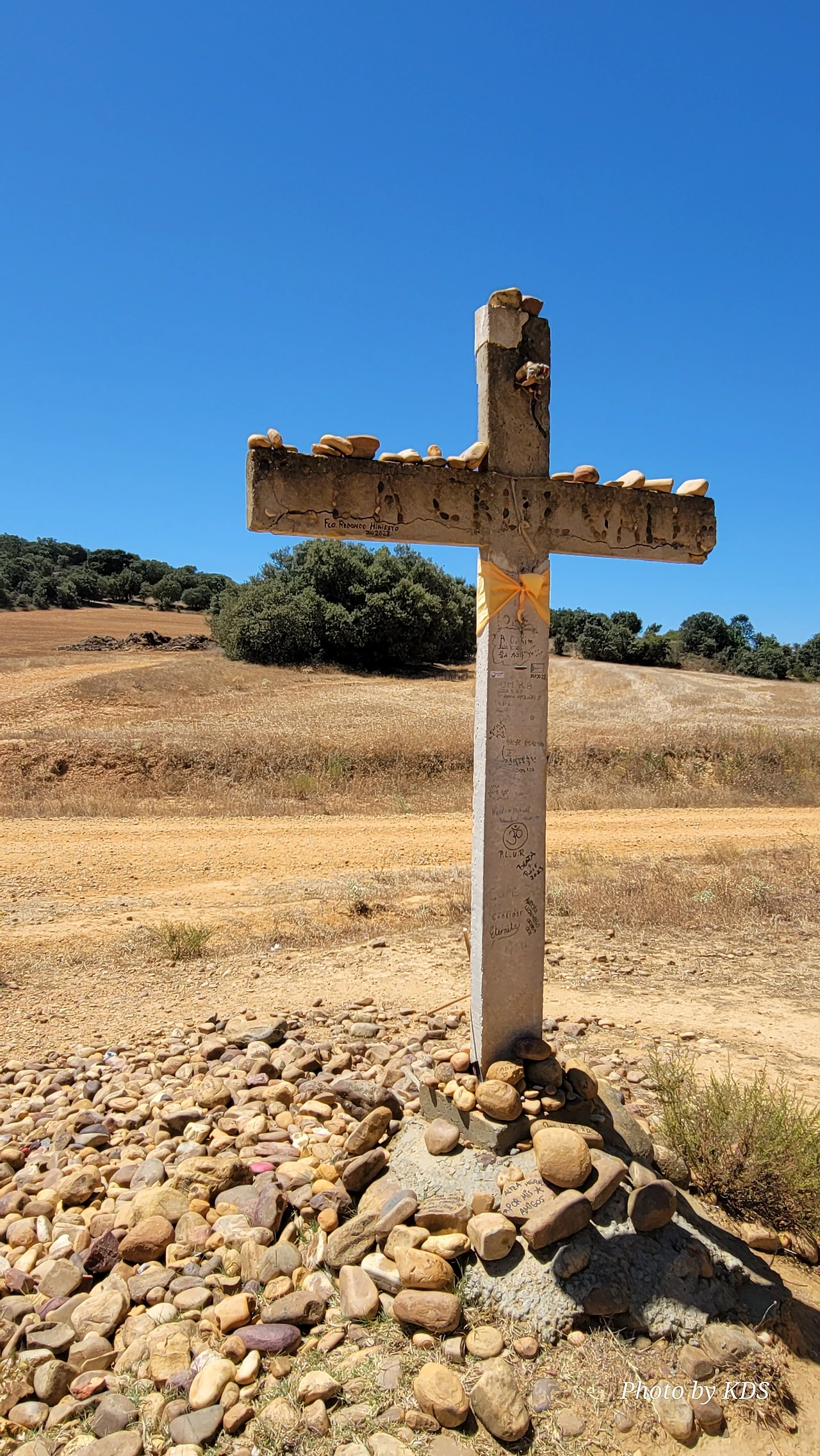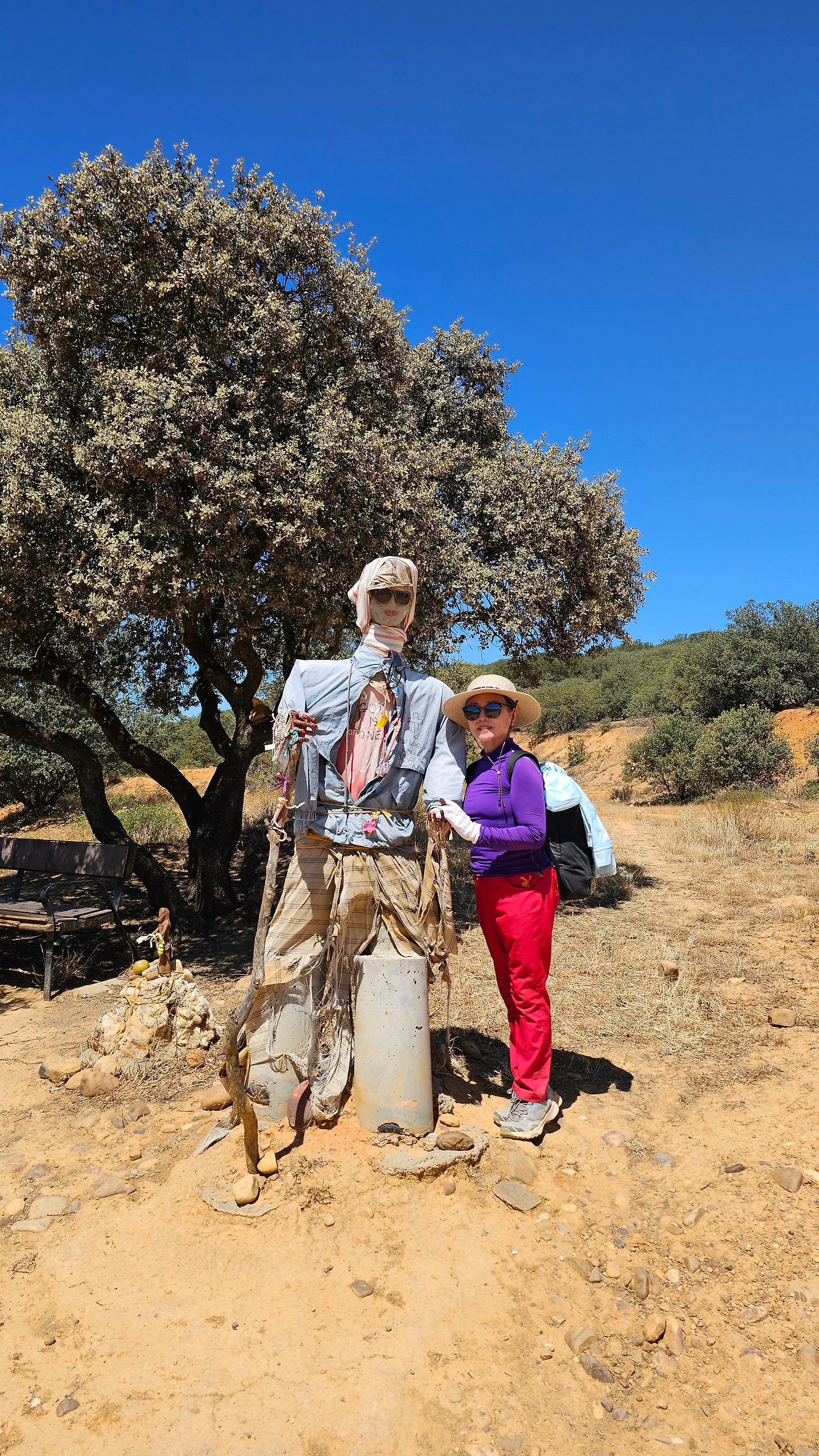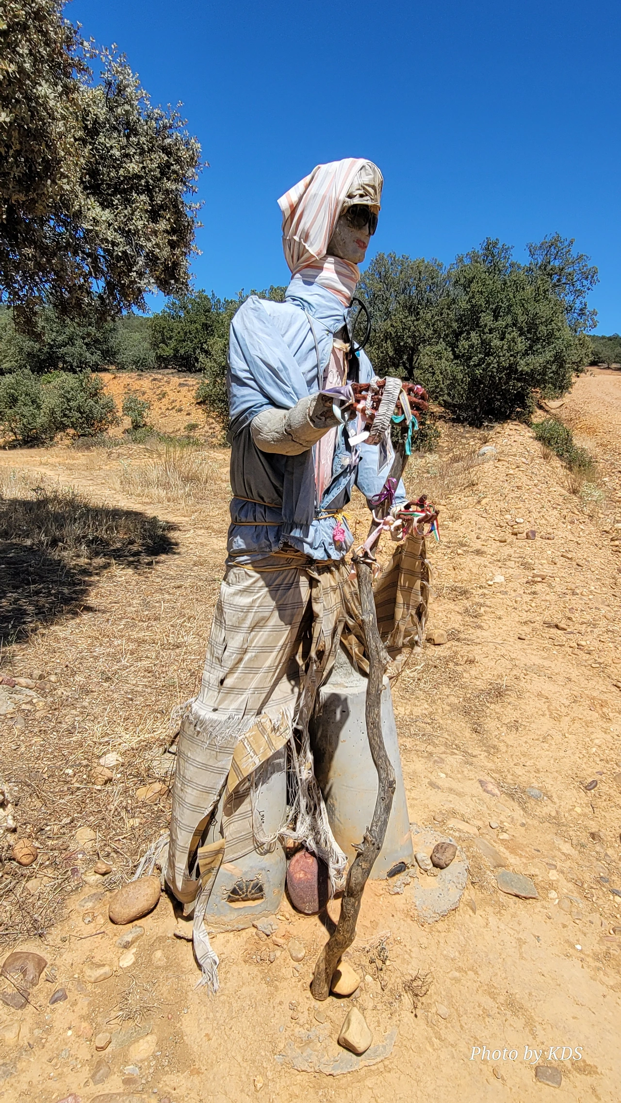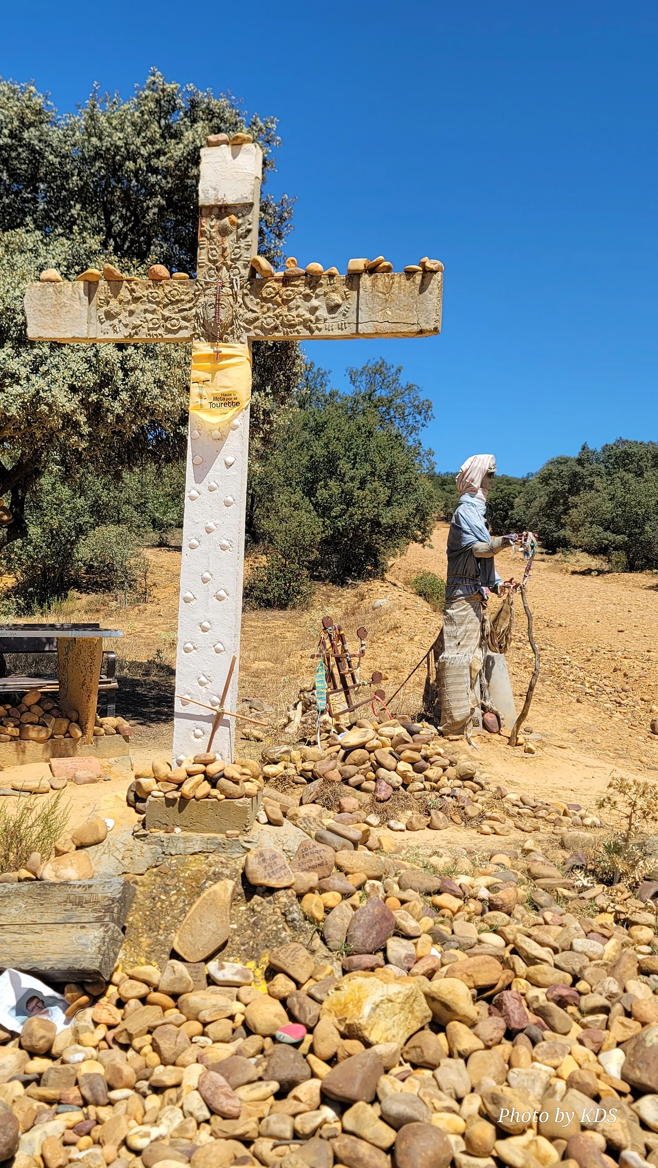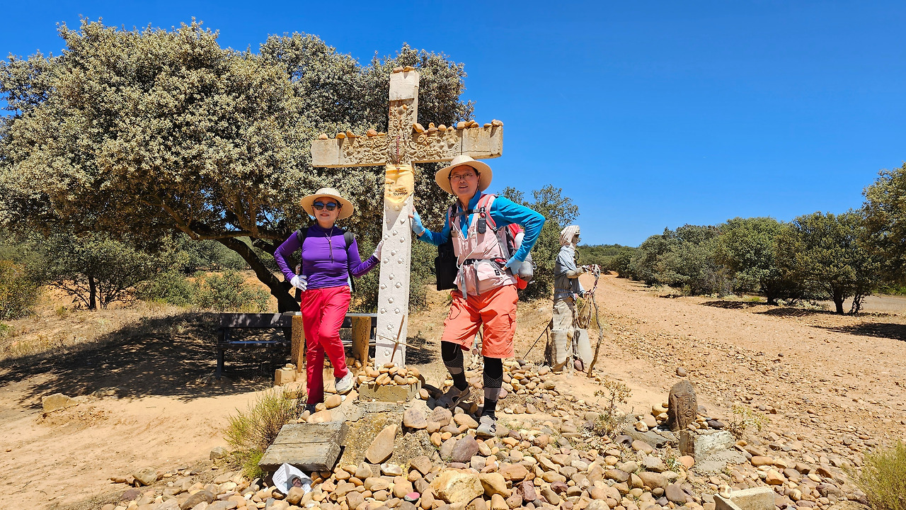 산티바네스 데 발데이글레시아스(Santibáñez de Valdeiglesias) 마을을 지나면 약간 언덕길과 구릉을 만난다. 언덕길을 오르다 보면 크루스 데 바예(Cruz de Valle) 즉 계곡의 십자가 상을 볼 수 있다. 십자가는 언덕의 몇 그루의 나무와 쉼터 의자가 같이 있다. 그 주변에 허수아비 모양의 그로테스크(Grotesque)한 조형물들이 있다. 지나가는 모든 순례객들은 이것을 배경으로 사진을 찍는다. 순례자 복장에 멋지게 선글라스까지 끼고 있는 모습이 재미있다. 십자가는 시멘트 콘크리트로 조성되었고, 주변에 돌무더기가 많다. 철로 만든 수도승 모양의 조형물 앞에 누군가 배 한 덩어리를 올려놓았다. 순례길을 걷다 보면 이런 기발한 조형물들을 가끔 만나고, 그런 것들을 보면서 순례길의 피로를 잊기도 한다.
