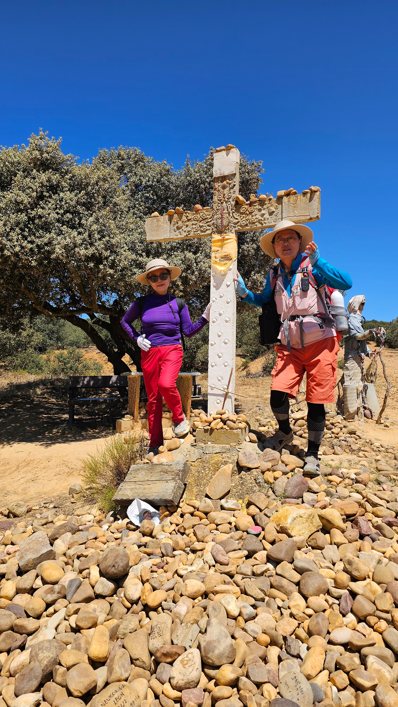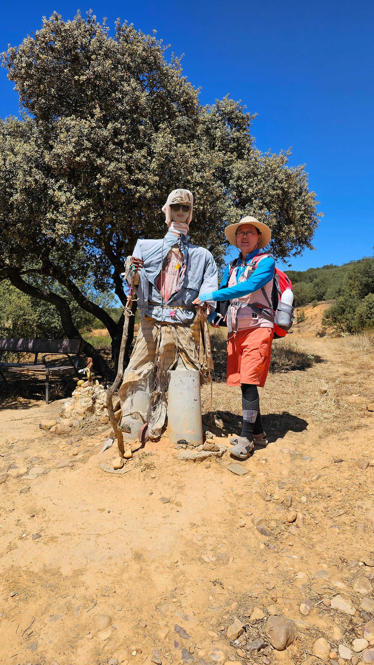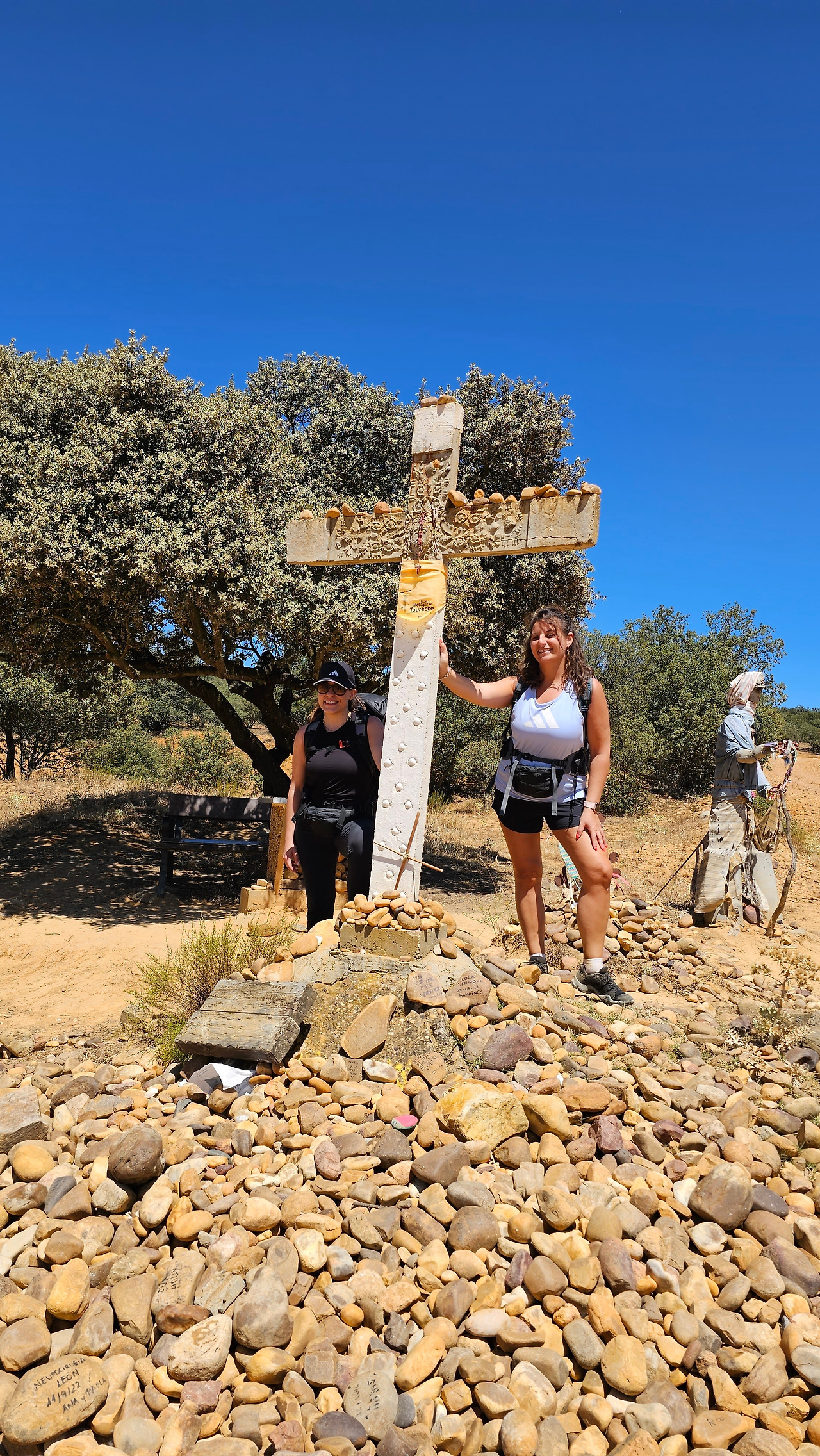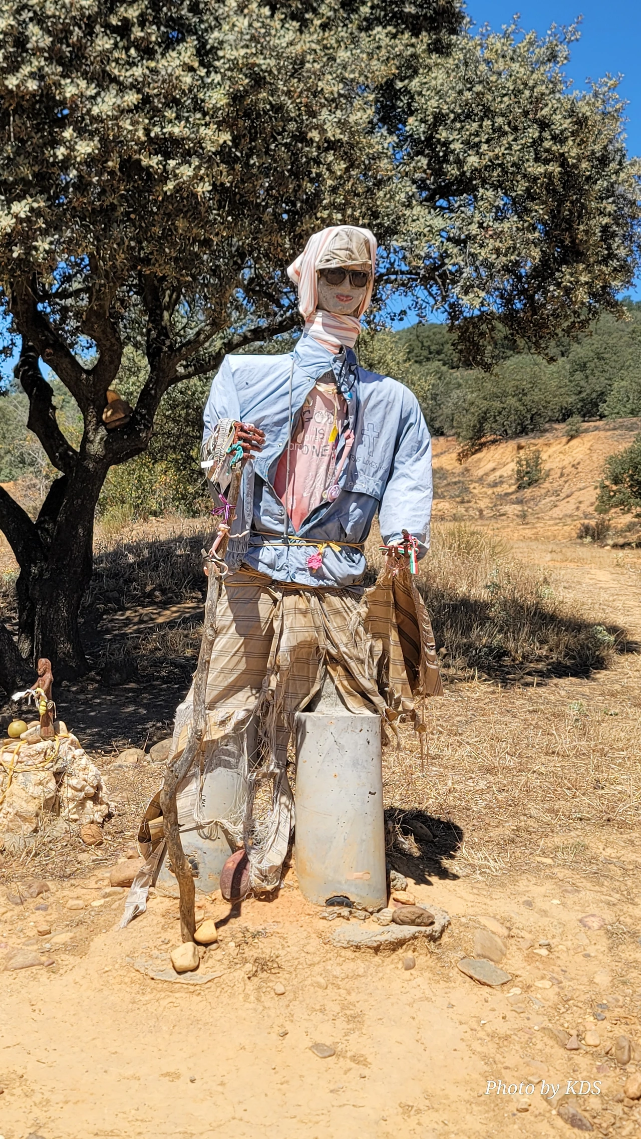 산티바네스 데 발데이글레시아스(Santibáñez de Valdeiglesias) 마을을 지나면 약간 언덕길과 구릉을 만난다. 언덕길을 오르다 보면 크루스 데 바예(Cruz de Valle) 즉 계곡의 십자가 상을 볼 수 있다. 십자가는 언덕의 몇 그루의 나무와 쉼터 의자가 같이 있다. 그 주변에 허수아비 모양의 그로테스크(Grotesque)한 조형물들이 있다. 지나가는 모든 순례객들은 이것을 배경으로 사진을 찍는다. 순례자 복장에 멋지게 선글라스까지 끼고 있는 모습이 재미있다. 십자가는 시멘트 콘크리트로 조성되었고, 주변에 돌무더기가 많다. 철로 만든 수도승 모양의 조형물 앞에 누군가 배 한 덩어리를 올려놓았다. 순례길을 걷다 보면 이런 기발한 조형물들을 가끔 만나고, 그런 것들을 보면서 순례길의 피로를 잊기도 한다.