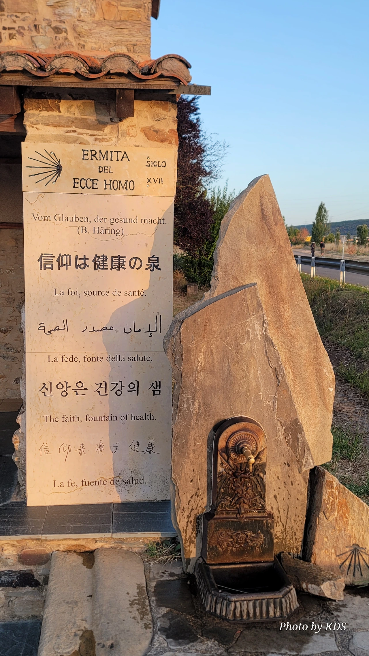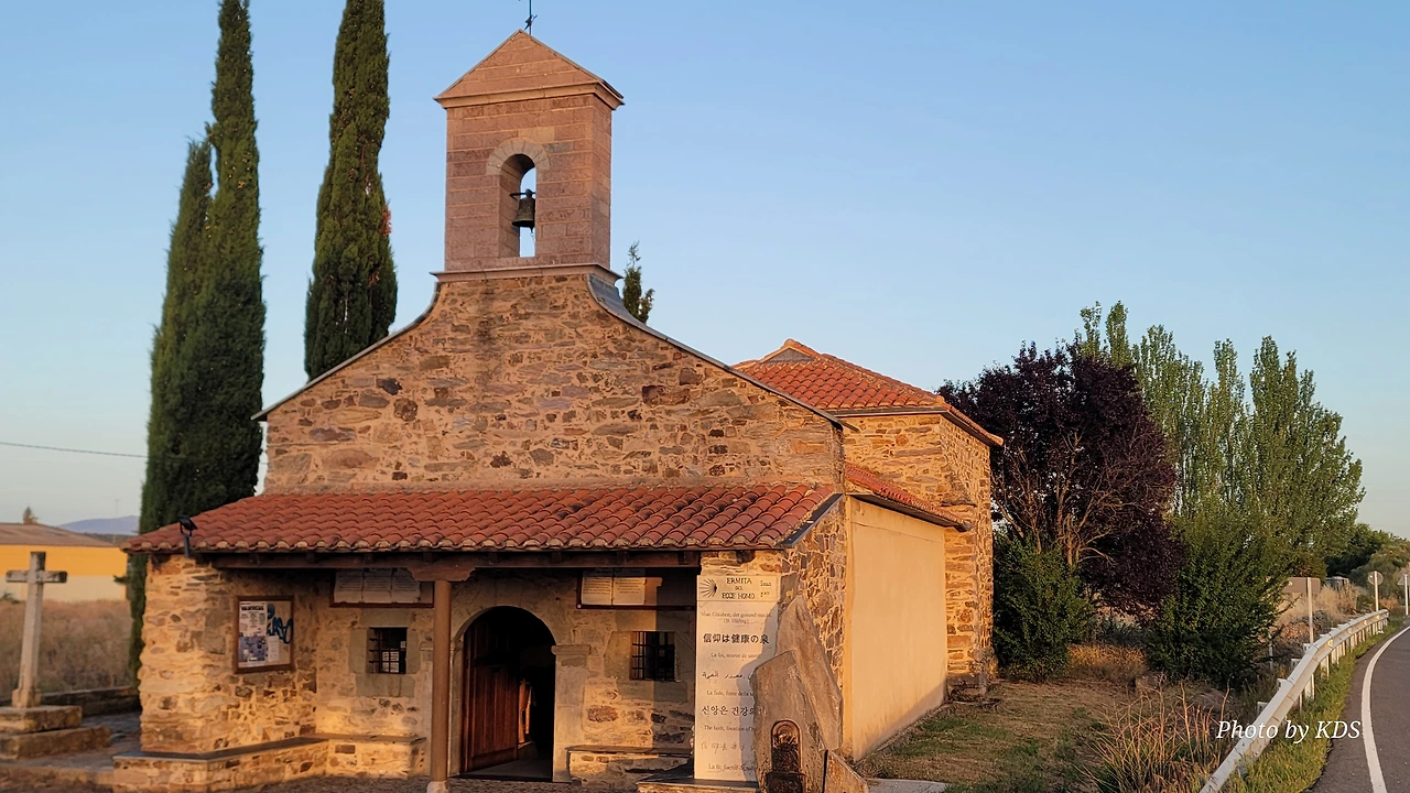 아스또르가(Astorga)에서 아침 7시 10분경에 출발하였다. 시내를 벗어나서 평원을 조금 걸었는데, 발데비에하스(Valdeviejas) 마을이 나타났다. 마을 규모도 워낙 작아서 표지판이 없었으면 마을인지도 모르고 지나칠 뻔했다. 순례객을 위한 지도에도 표시가 되어 있지 않은 마을이다. 길 옆으로 오래된 공동묘지가 방치된 채 폐허처럼 변해가고 있었다. 오래된 비석들은 풍우에 마모되고 검버섯도 피었고, 땅에는 잡초만이 무성하게 자라나서 말라죽었다. 길옆에 아마 오토바이를 타고 순례길을 가다가 하늘로 간 순례객을 기리는 조형물이 있었다. 오토바이를 아예 땅에 박아서 비석처럼 사용하고 꽃다발도 하나 설치되어 있었다. 그냥 스치듯이 지나치는데 마을에서 조금 떨어진 곳에 아주 작은 성당이 있었다. 마침 음수대도 있고 해서 쉴 겸 잠시 들려보았다. 성당 이름이 <이 사람을 보라(Ermita del Ecce Homo)>의 성당이다. Ermita del Ecce Homo는 라틴어로 "이 사람을 보라"이다. 가시 면류관을 쓰고 벌거벗긴 채 빌라도 앞으로 끌려온 예수님을 보고 빌라도가 한 말이라고 한다. 이 성당의 내부에 들어가면 제단의 조각물에 위쪽으로 <Ecce Homo(이 사람을 보라)>와 <Ecce Deus(보라 하나님)>라고 쓰여있다. 제단의 십자가 밑에는 예수의 형상은 아닌 것 같은 사람이 지팡이를 들고 마치 순례자 모양으로 서있다. 순례자를 위한 음수대 옆에는 커다란 돌 비석에 <신앙은 건강의 샘>이라는 문구를 한글을 포함해서 9개 언어로 새겨 놓았다. 한글이 영어와 중국어 보다 위에 새겨있다. 옛날 이곳에 우물이 있었는데, 어린 아들을 데리고 순례길에 올랐던 어머니가 아들과 함께 이곳 우물에서 물을 마시다가 아들이 우물에 빠졌단다. 어머니가 간절히 기도하자 아들이 물 위로 떠올라 살려서 순례길을 끝까지 완주했다는 전설이 전해온다.