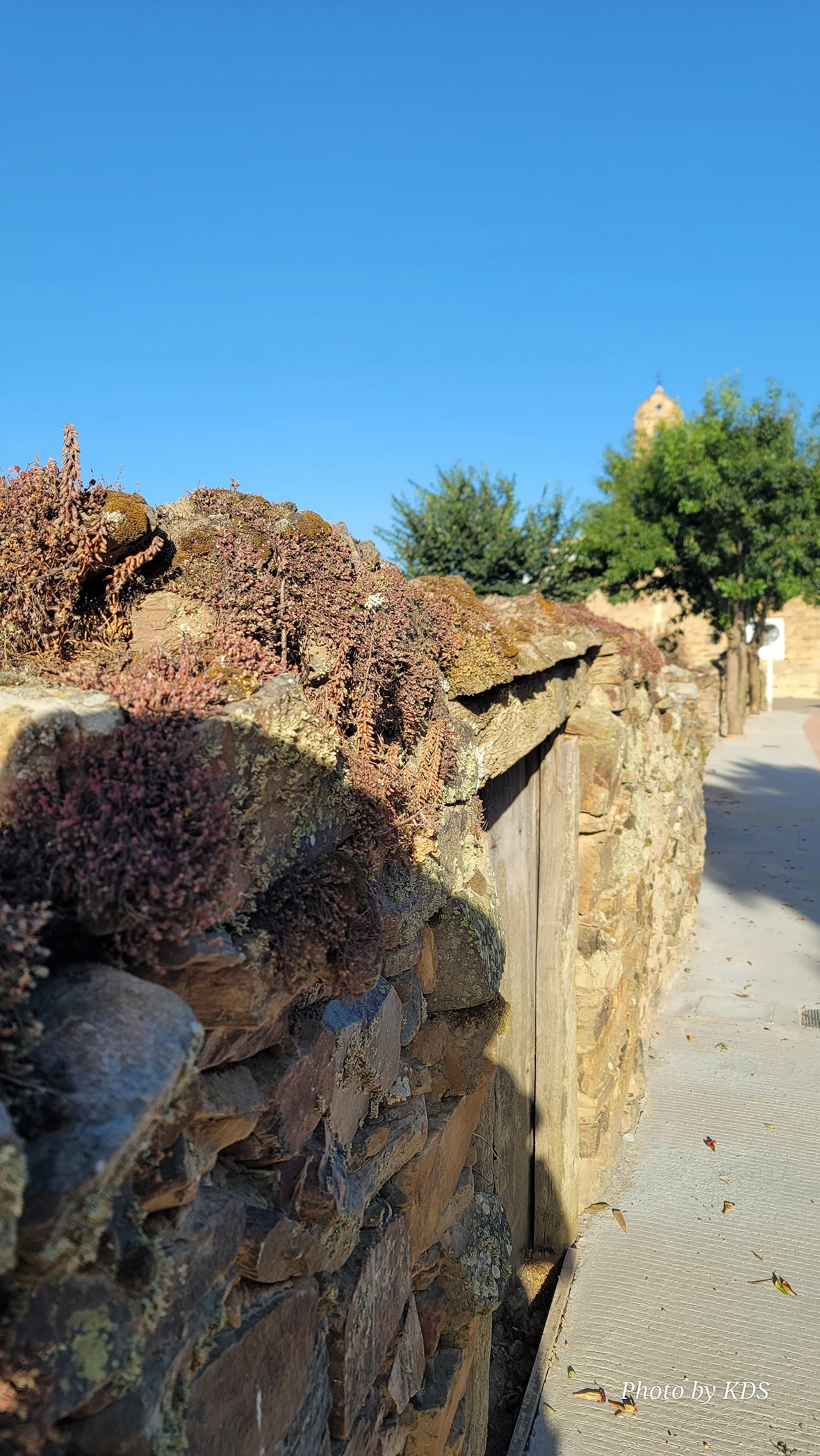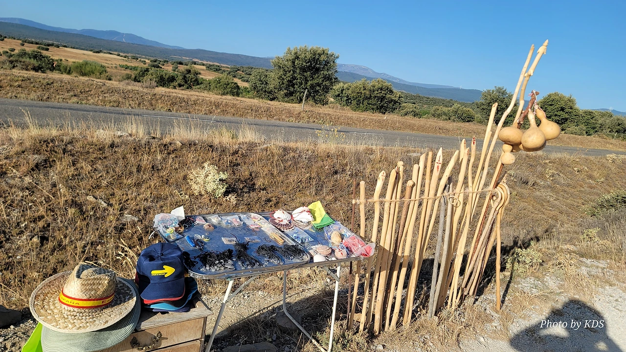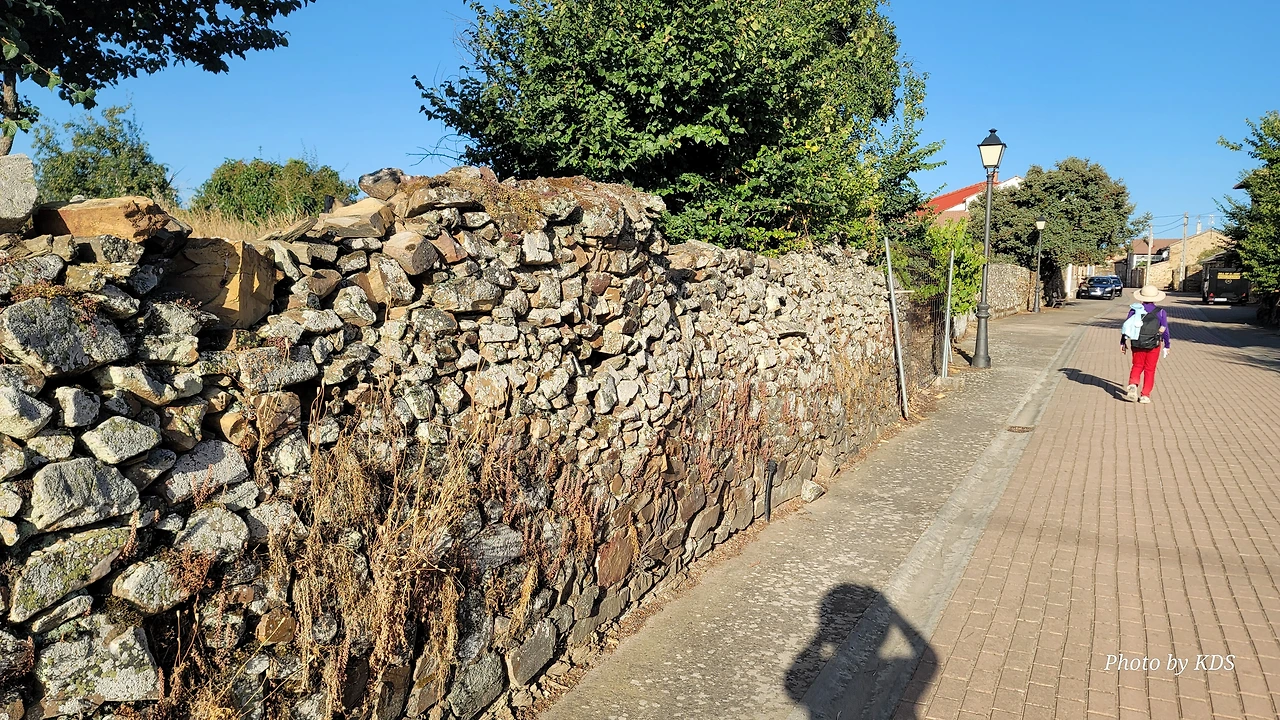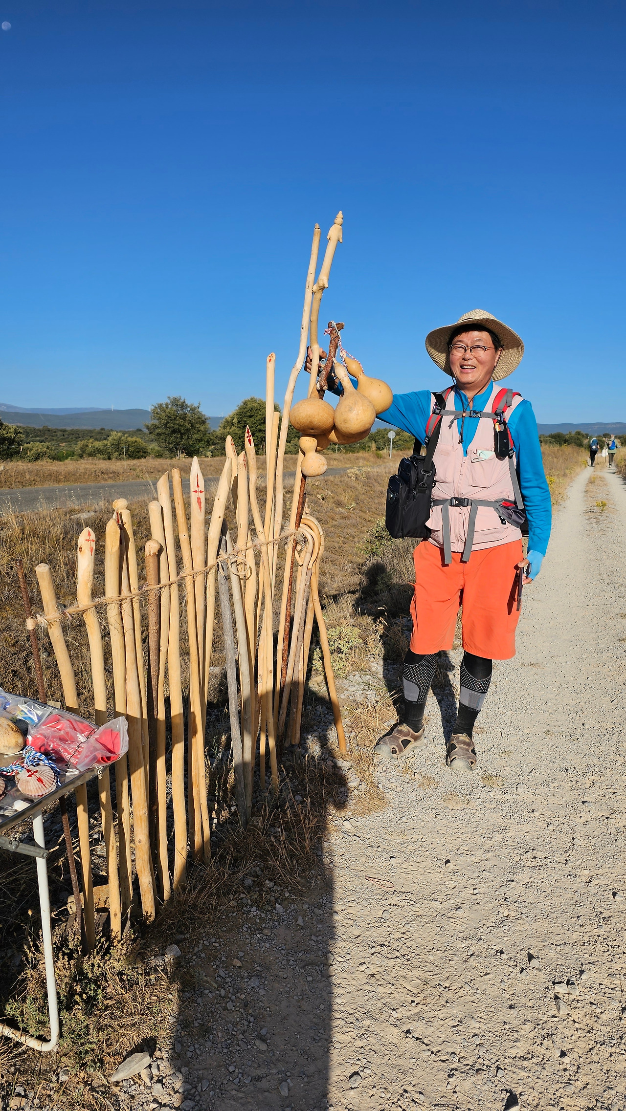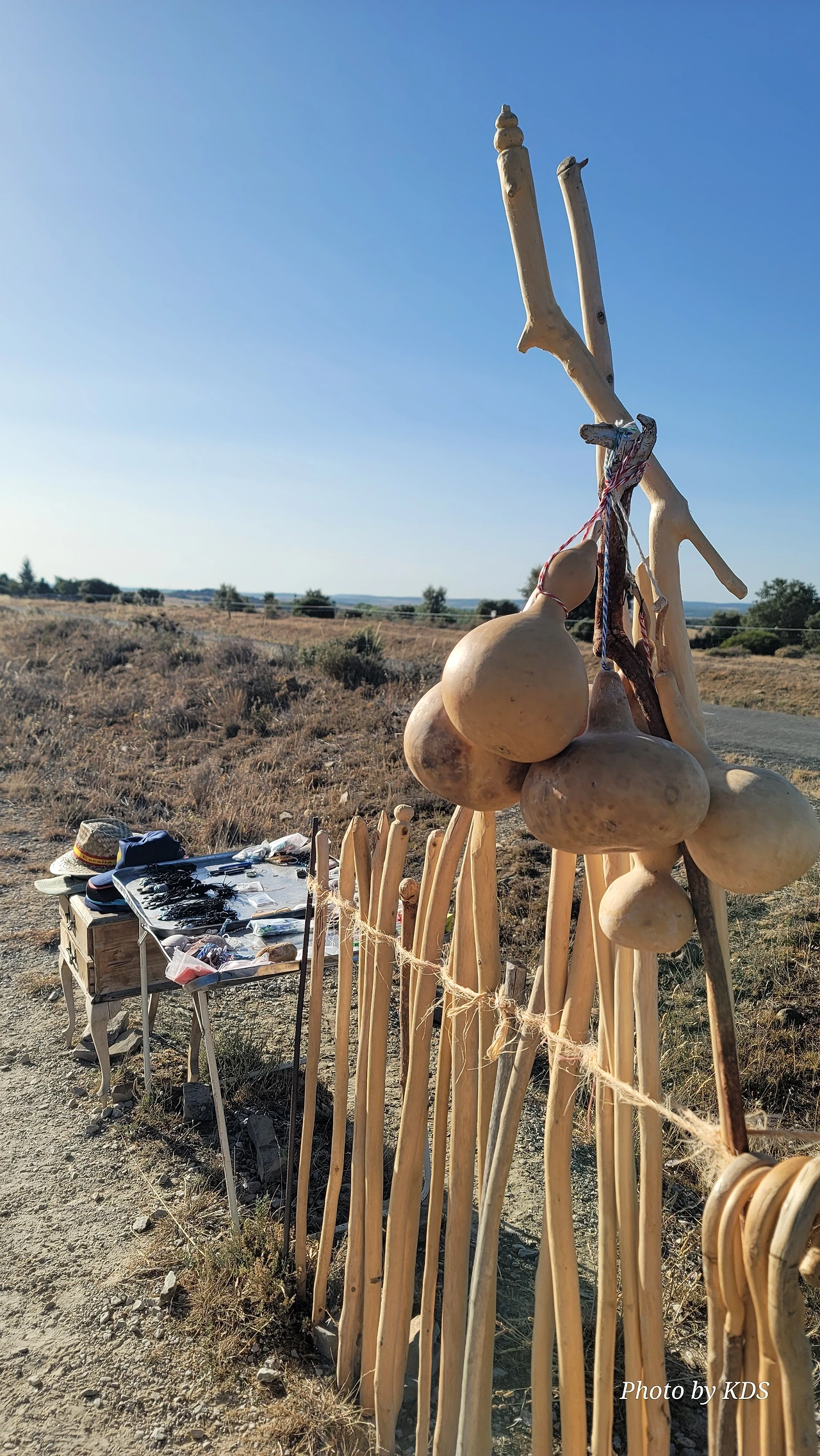 마을을 벗어나도 돌담으로 둘러싸인 밭들이 나오고, 허물어진 돌담 건물의 잔해들도 많이 보인다. 길가에 순례자를 위한 지팡이와 조롱박을 팔고 있는 노점이 있는데 주인은 어디 갔는지 보이지 않는다. 순례길을 걷는 사람들 중에 등산용 스틱을 주로 많이 사용하지만, 예스럽게 굳이 이런 나무 지팡이를 고집하는 사람들도 더러 있다. 어떤 사람은 자기 키보다도 더 큰 나무지팡이를 들고 걷기도 한다. 금삿갓의 생각은 그건 도리어 짐스러운데 힘들게 왜 들고 다니는지 이해가 가질 않는다. 길가의 조형물 옆에 가지런히 벗어 놓은 등산화 한 켤레가 색이 바랜 채 놓여있다. 주인은 벌써 순례길을 다 걷고 고향으로 돌아갔을 텐데, 남겨진 신발만 이 길을 오래도록 지키고 있는 것이다. 이 마을은 전체적으로 제주도의 올레길을 연상하면서 걸을 수 있었다.