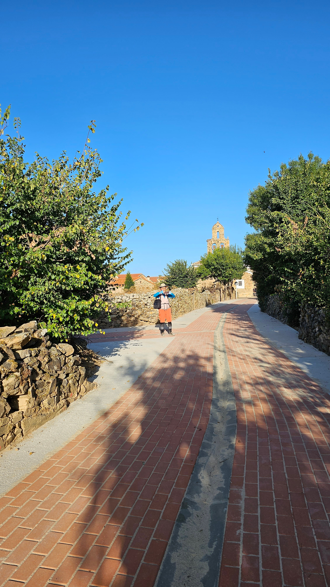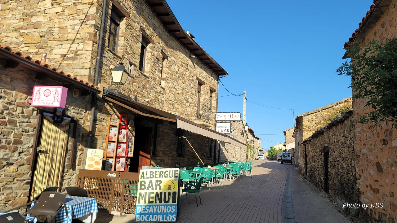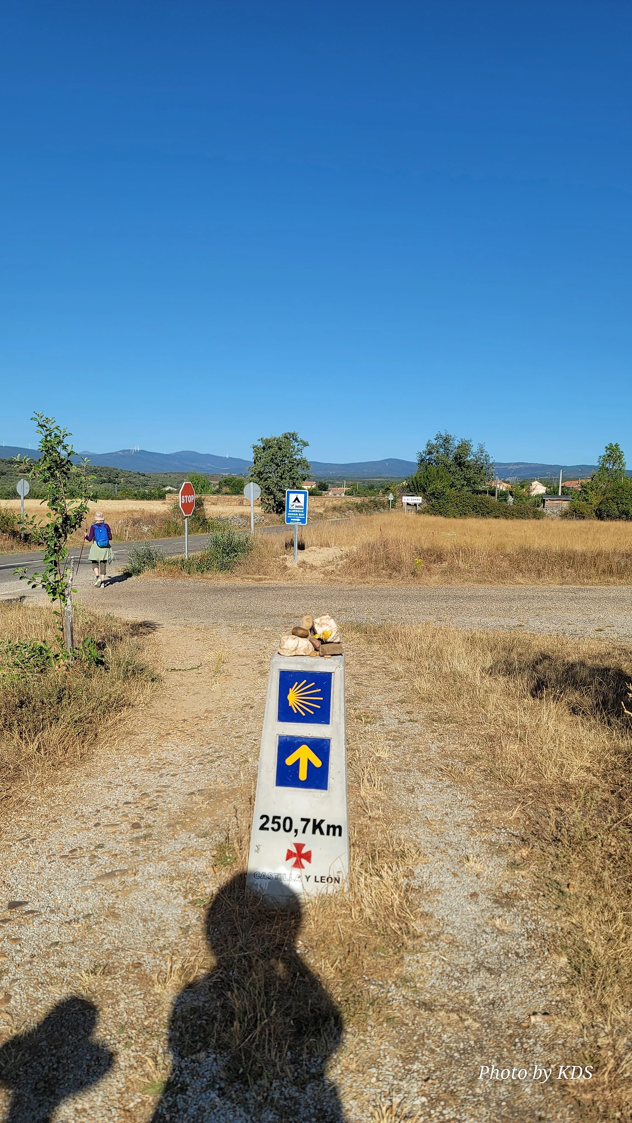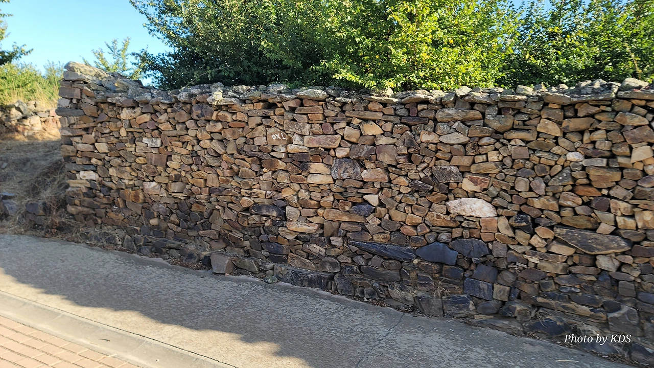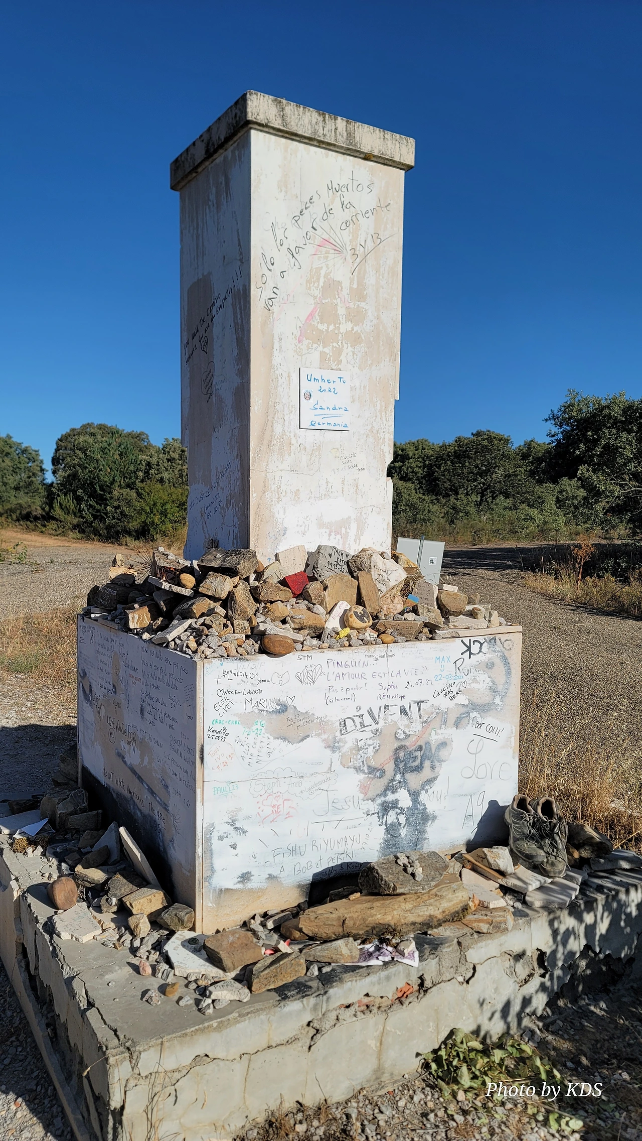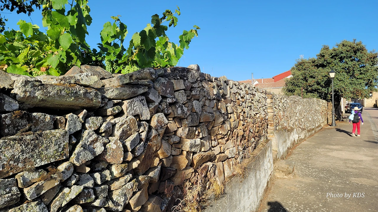 마을을 벗어나도 돌담으로 둘러싸인 밭들이 나오고, 허물어진 돌담 건물의 잔해들도 많이 보인다. 길가에 순례자를 위한 지팡이와 조롱박을 팔고 있는 노점이 있는데 주인은 어디 갔는지 보이지 않는다. 순례길을 걷는 사람들 중에 등산용 스틱을 주로 많이 사용하지만, 예스럽게 굳이 이런 나무 지팡이를 고집하는 사람들도 더러 있다. 어떤 사람은 자기 키보다도 더 큰 나무지팡이를 들고 걷기도 한다. 금삿갓의 생각은 그건 도리어 짐스러운데 힘들게 왜 들고 다니는지 이해가 가질 않는다. 길가의 조형물 옆에 가지런히 벗어 놓은 등산화 한 켤레가 색이 바랜 채 놓여있다. 주인은 벌써 순례길을 다 걷고 고향으로 돌아갔을 텐데, 남겨진 신발만 이 길을 오래도록 지키고 있는 것이다. 이 마을은 전체적으로 제주도의 올레길을 연상하면서 걸을 수 있었다.