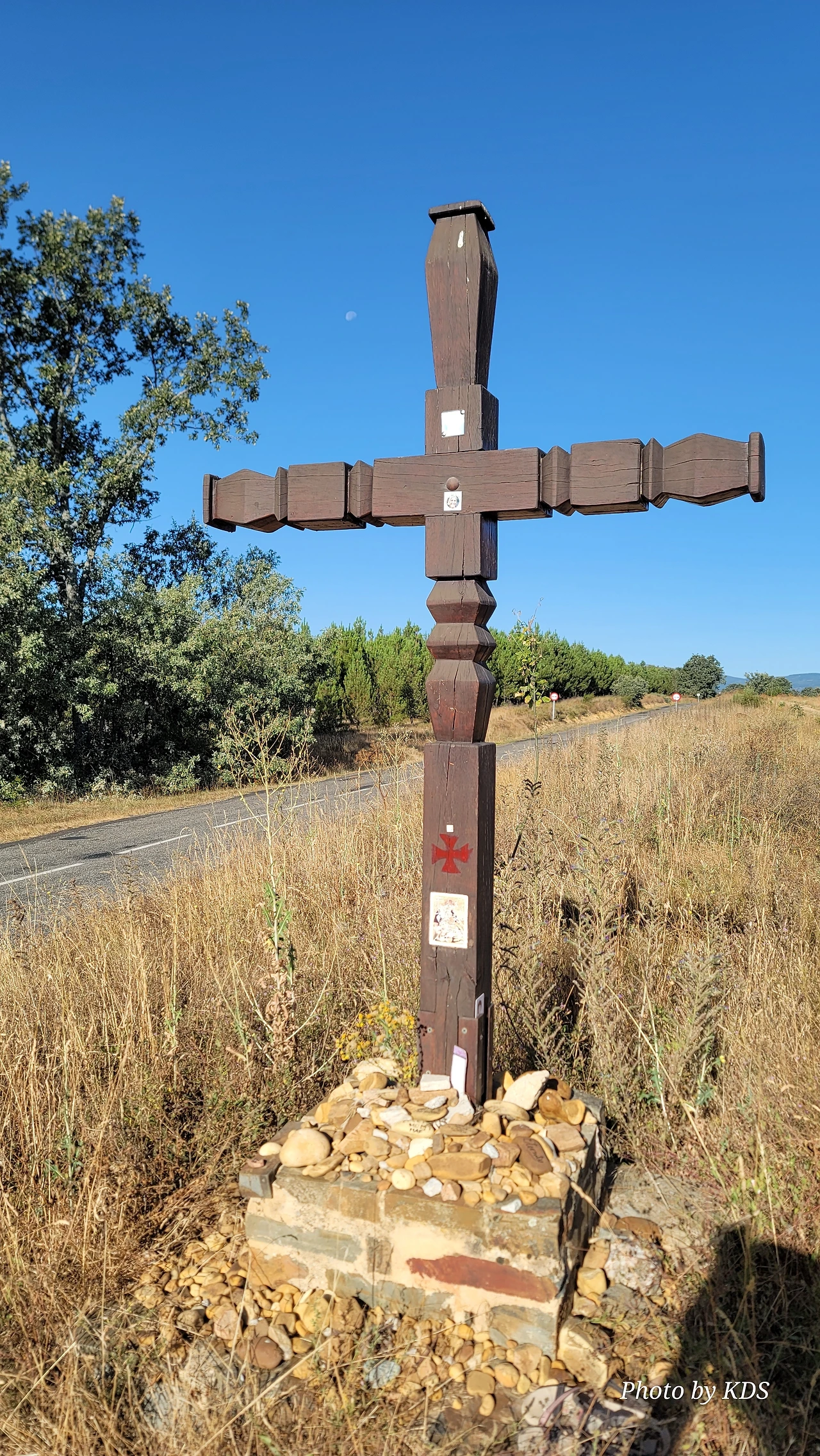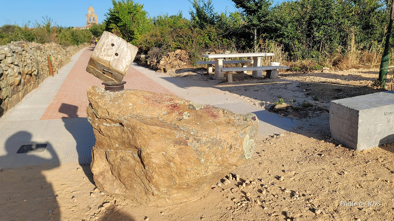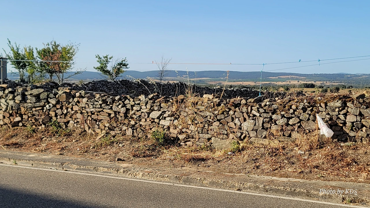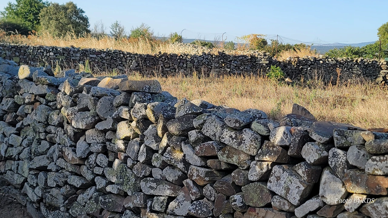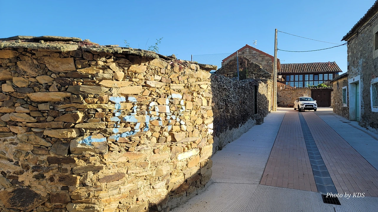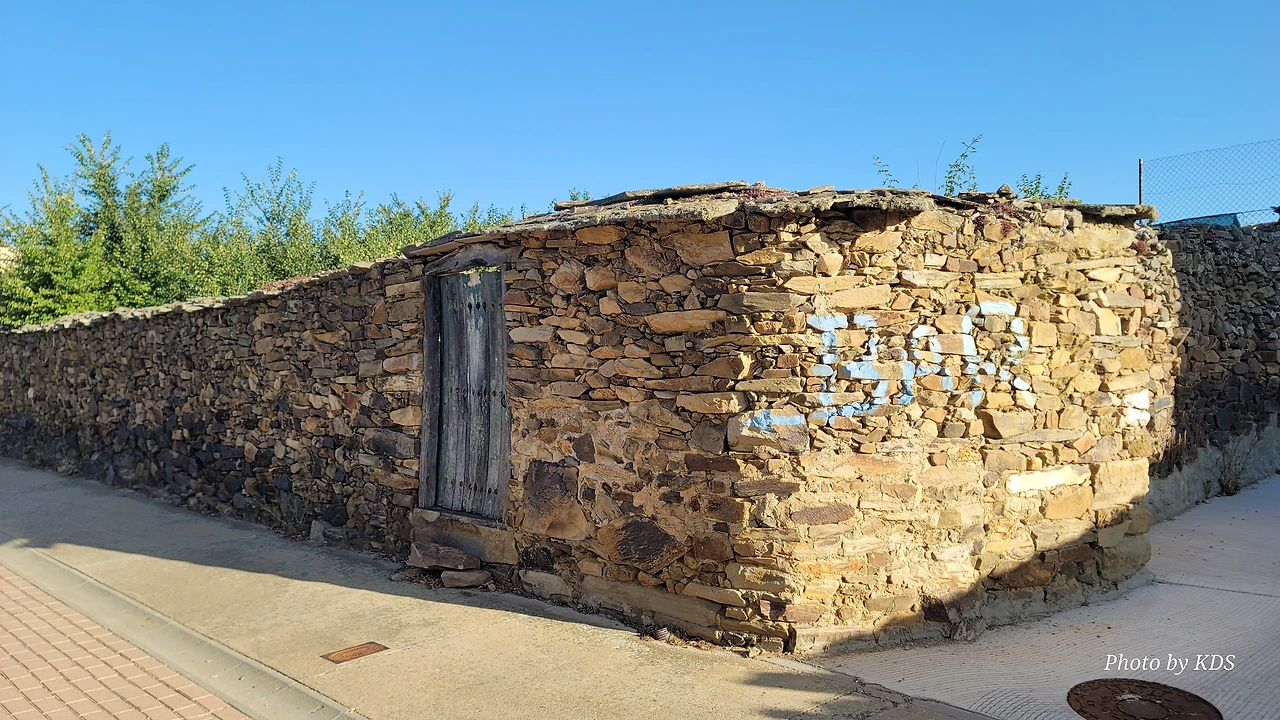 마을을 벗어나도 돌담으로 둘러싸인 밭들이 나오고, 허물어진 돌담 건물의 잔해들도 많이 보인다. 길가에 순례자를 위한 지팡이와 조롱박을 팔고 있는 노점이 있는데 주인은 어디 갔는지 보이지 않는다. 순례길을 걷는 사람들 중에 등산용 스틱을 주로 많이 사용하지만, 예스럽게 굳이 이런 나무 지팡이를 고집하는 사람들도 더러 있다. 어떤 사람은 자기 키보다도 더 큰 나무지팡이를 들고 걷기도 한다. 금삿갓의 생각은 그건 도리어 짐스러운데 힘들게 왜 들고 다니는지 이해가 가질 않는다. 길가의 조형물 옆에 가지런히 벗어 놓은 등산화 한 켤레가 색이 바랜 채 놓여있다. 주인은 벌써 순례길을 다 걷고 고향으로 돌아갔을 텐데, 남겨진 신발만 이 길을 오래도록 지키고 있는 것이다. 이 마을은 전체적으로 제주도의 올레길을 연상하면서 걸을 수 있었다.