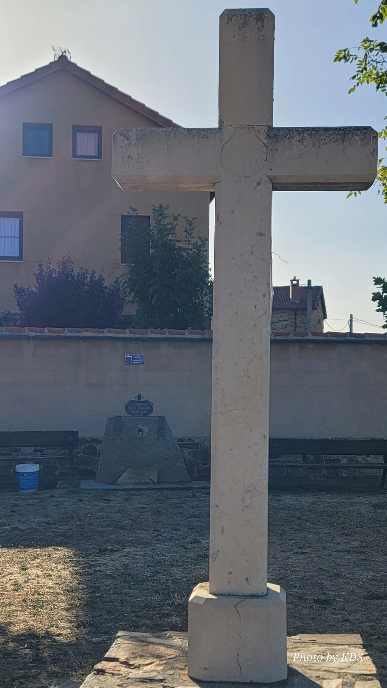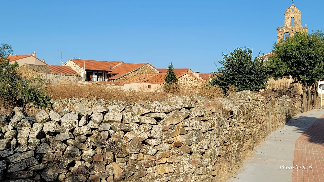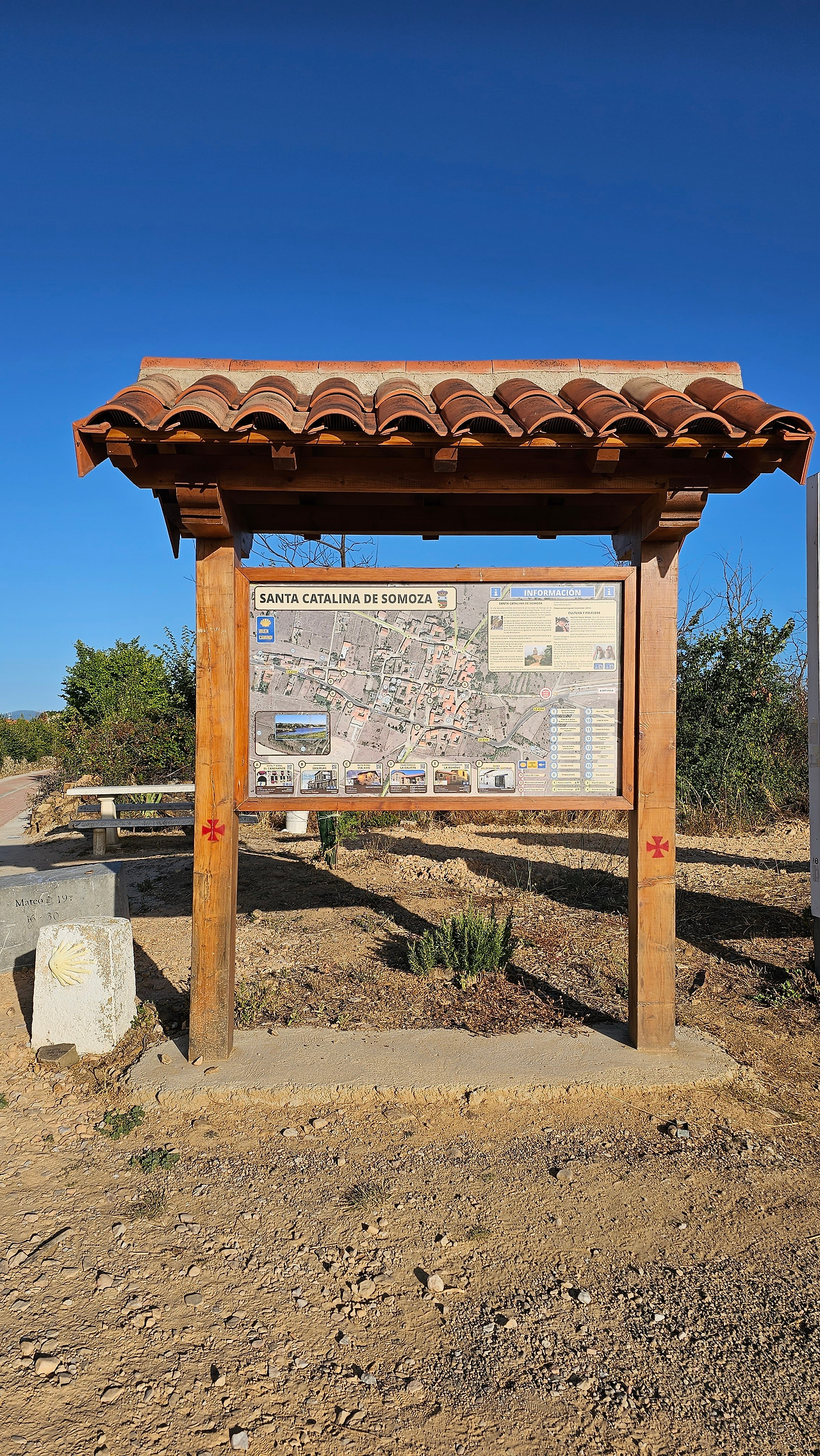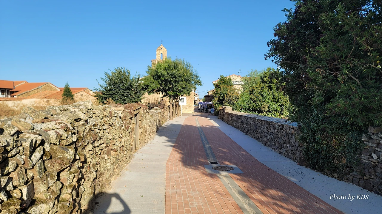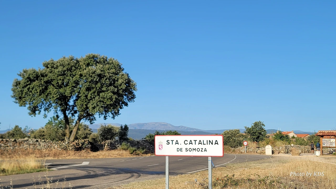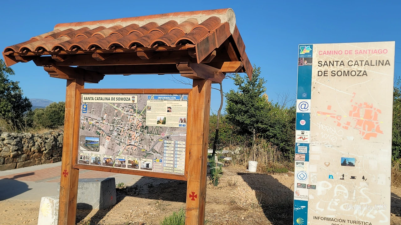 산따 까딸리나 데 소모사(Santa Catalina de Somoza) 마을은 그 이름에 들어있는 소모사(Somoza)는 라틴어로 '산 밑'을 나타내는 말이다. 이 마을이 해발 870m 정도인데, 여기서부터 점차 순례길의 고도가 높아져서 해발 1515m의 레온 산(Montes de Leon)을 넘어가야 한다. 그래서 아마 산밑의 마을로 이름이 지어졌나 보다. 이 마을의 첫 느낌은 우리의 제주도 시골 돌담길 같다. 대부분의 주택들이 돌담으로 지어져 있고, 허물어진 건물도 돌담이다. 주변의 밭들도 제주처럼 돌담으로 경계를 표시하는 것 같다. 마을의 중안 광장에 이 지방에서 태어난 땀보릴레로(Tamborilero)라고 하는 작은북의 명 연주자인 아낄리노 빠스또르(Aquilino Pastor)의 흉상이 서 있다. 마을에는 산따 마리아 교구 성당(Iglesia Parroquial de Santa Maria)이 있다. 1708년에 건축되었으며, 1982년에 개축되었다. 성당은 본당과 단순한 제단으로 구성되어 있으며, 하나는 고전주의 양식이고 다른 하나는 바로크 양식이다. 고색창연한 종탑이 높이 서있다.
