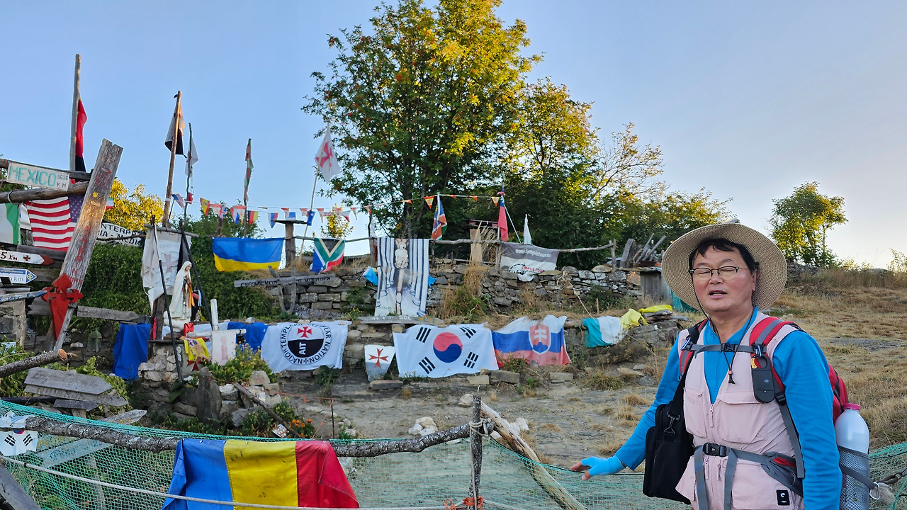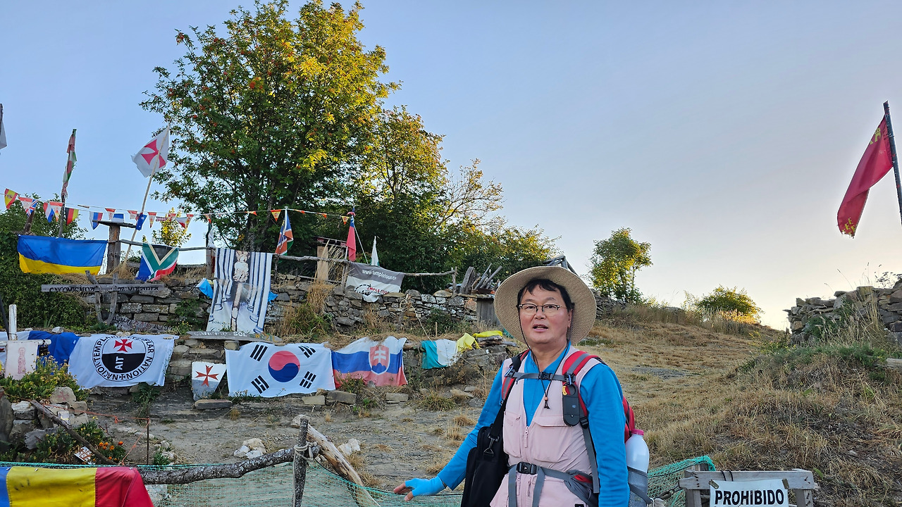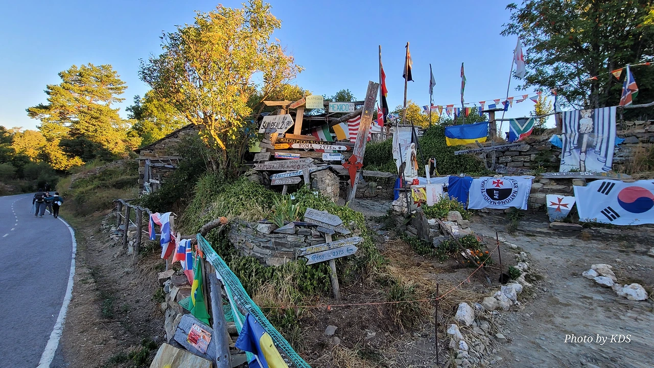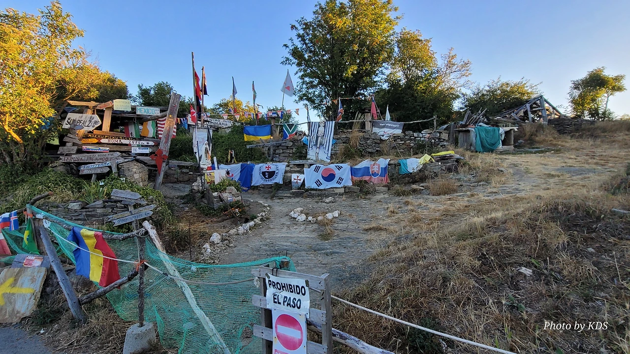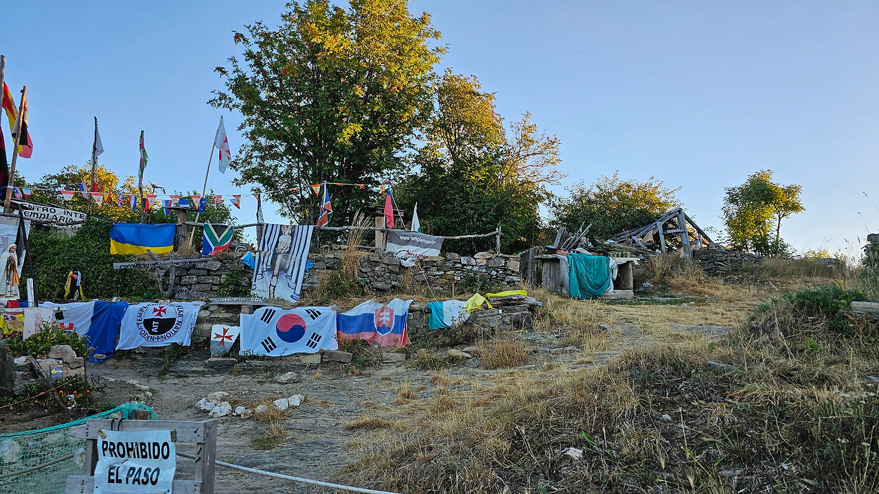 정상의 철 십자가(La Cruz de Ferro)에서 내리막길을 2.3Km 정도 내려오면 폐허가 된 마을인 만하린(Manjarin)을 만난다. 이 마을은 거의 폐허가 되어서 보기에도 을씨년스럽다. 그런데 이곳의 쓸만한 건축물을 재건하여 순례자용 알베르게로 활용하고 있는 곳이 딱 하나 있다. 이곳의 해발고도가 1458m로 표시되어 있는데, 이런 곳에서 하룻밤을 묵어도 기분이 괜찮을 것 같았다. 공기도 상쾌하고 시야가 넓어서 가슴이 탁 트인다. 알베르게 주변에 돌담과 나무 목책을 얼기설기 만들어 놓고 여러 나라의 국기를 걸어 놓았다. 우리나라의 태극기도 커다랗게 중앙에 자리 잡고 있어서 매우 뿌듯했다. 조선 과객 금삿갓이 지나갈 때는 영업을 하지 않는지 출입구를 봉쇄해 놓았다. 아마 주인장이 이곳을 비우고 다른 곳에 볼일을 보러 간 모양일 거다. 만하린 마을을 지나 내리막길을 계속 내려오면 저 멀리 산등성이에 통신용 철탑도 보이고, 능선을 타고 풍력발전기들이 열심히 전기를 생산하고 있는 모습이 보인다.