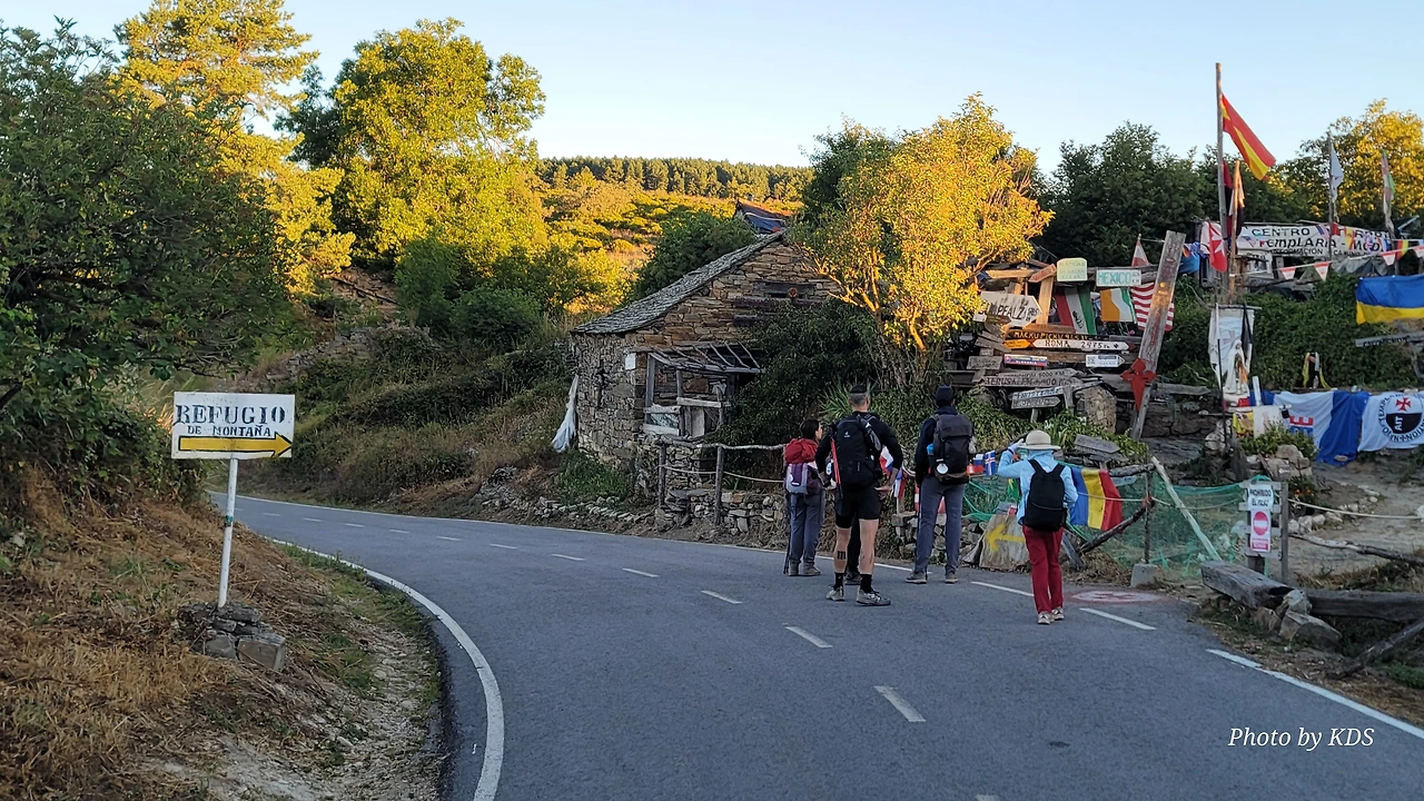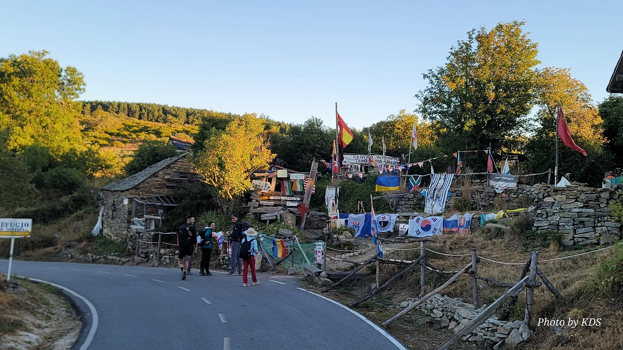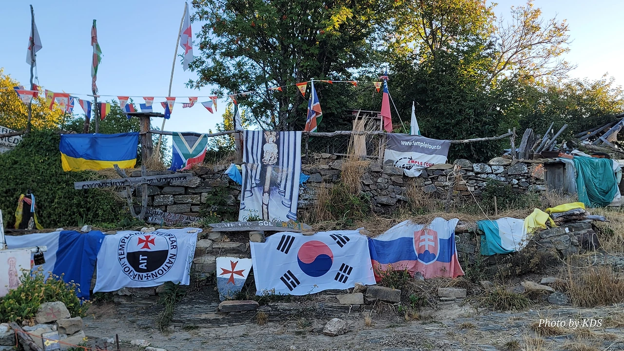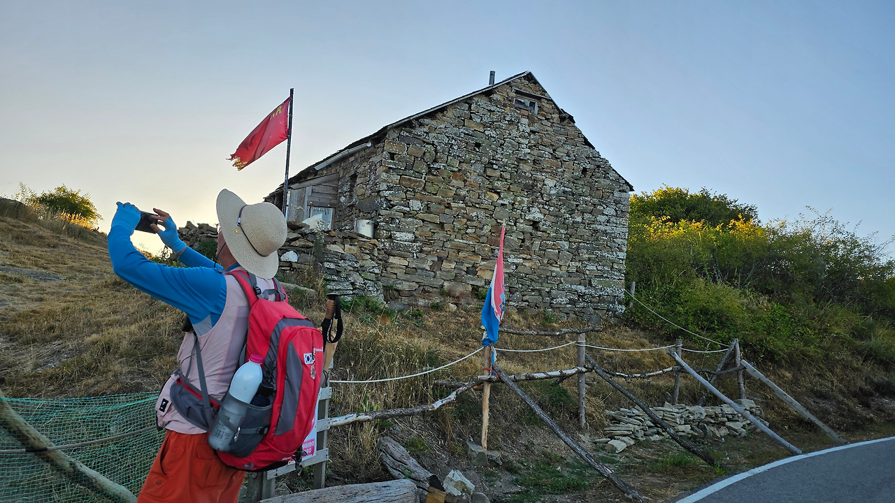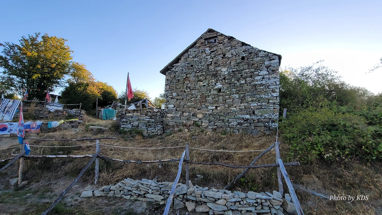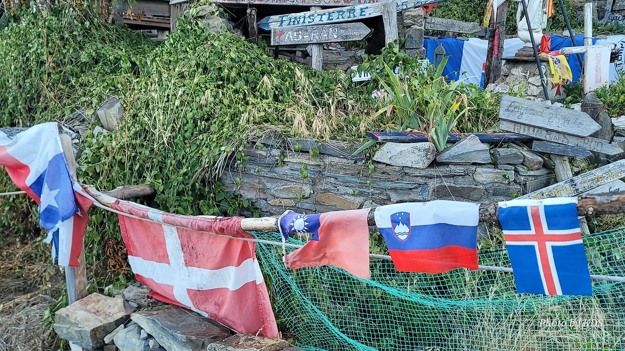 정상의 철 십자가(La Cruz de Ferro)에서 내리막길을 2.3Km 정도 내려오면 폐허가 된 마을인 만하린(Manjarin)을 만난다. 이 마을은 거의 폐허가 되어서 보기에도 을씨년스럽다. 그런데 이곳의 쓸만한 건축물을 재건하여 순례자용 알베르게로 활용하고 있는 곳이 딱 하나 있다. 이곳의 해발고도가 1458m로 표시되어 있는데, 이런 곳에서 하룻밤을 묵어도 기분이 괜찮을 것 같았다. 공기도 상쾌하고 시야가 넓어서 가슴이 탁 트인다. 알베르게 주변에 돌담과 나무 목책을 얼기설기 만들어 놓고 여러 나라의 국기를 걸어 놓았다. 우리나라의 태극기도 커다랗게 중앙에 자리 잡고 있어서 매우 뿌듯했다. 조선 과객 금삿갓이 지나갈 때는 영업을 하지 않는지 출입구를 봉쇄해 놓았다. 아마 주인장이 이곳을 비우고 다른 곳에 볼일을 보러 간 모양일 거다. 만하린 마을을 지나 내리막길을 계속 내려오면 저 멀리 산등성이에 통신용 철탑도 보이고, 능선을 타고 풍력발전기들이 열심히 전기를 생산하고 있는 모습이 보인다.