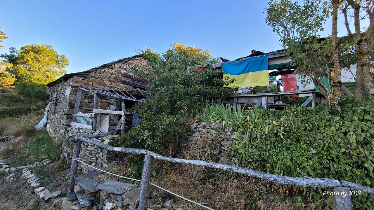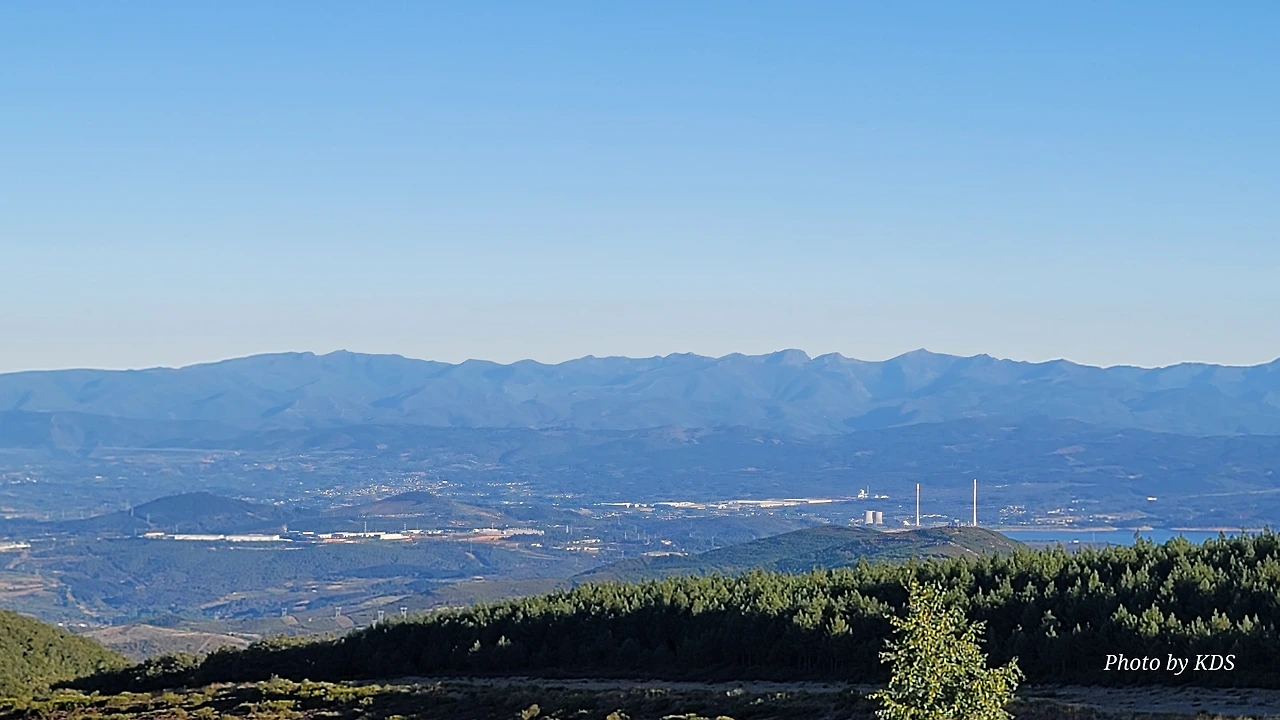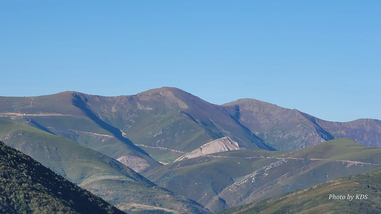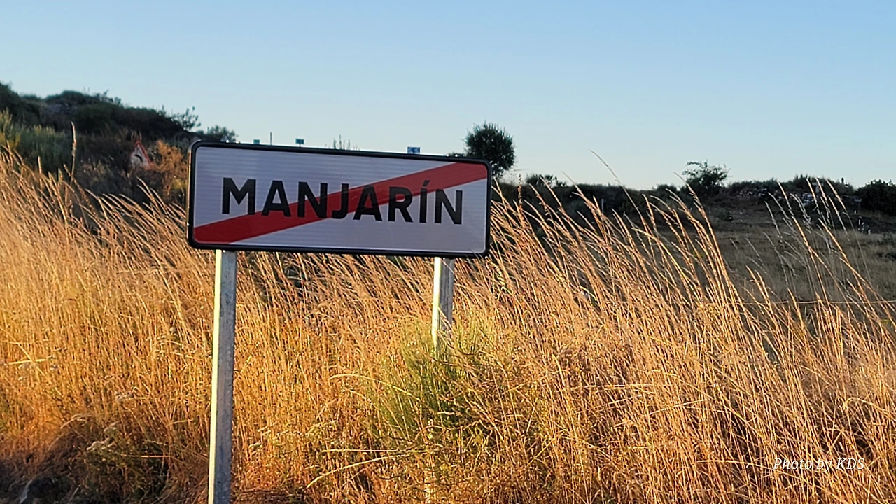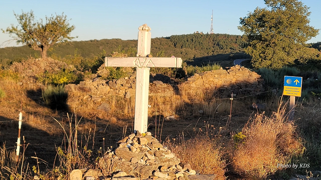 정상의 철 십자가(La Cruz de Ferro)에서 내리막길을 2.3Km 정도 내려오면 폐허가 된 마을인 만하린(Manjarin)을 만난다. 이 마을은 거의 폐허가 되어서 보기에도 을씨년스럽다. 그런데 이곳의 쓸만한 건축물을 재건하여 순례자용 알베르게로 활용하고 있는 곳이 딱 하나 있다. 이곳의 해발고도가 1458m로 표시되어 있는데, 이런 곳에서 하룻밤을 묵어도 기분이 괜찮을 것 같았다. 공기도 상쾌하고 시야가 넓어서 가슴이 탁 트인다. 알베르게 주변에 돌담과 나무 목책을 얼기설기 만들어 놓고 여러 나라의 국기를 걸어 놓았다. 우리나라의 태극기도 커다랗게 중앙에 자리 잡고 있어서 매우 뿌듯했다. 조선 과객 금삿갓이 지나갈 때는 영업을 하지 않는지 출입구를 봉쇄해 놓았다. 아마 주인장이 이곳을 비우고 다른 곳에 볼일을 보러 간 모양일 거다. 만하린 마을을 지나 내리막길을 계속 내려오면 저 멀리 산등성이에 통신용 철탑도 보이고, 능선을 타고 풍력발전기들이 열심히 전기를 생산하고 있는 모습이 보인다.