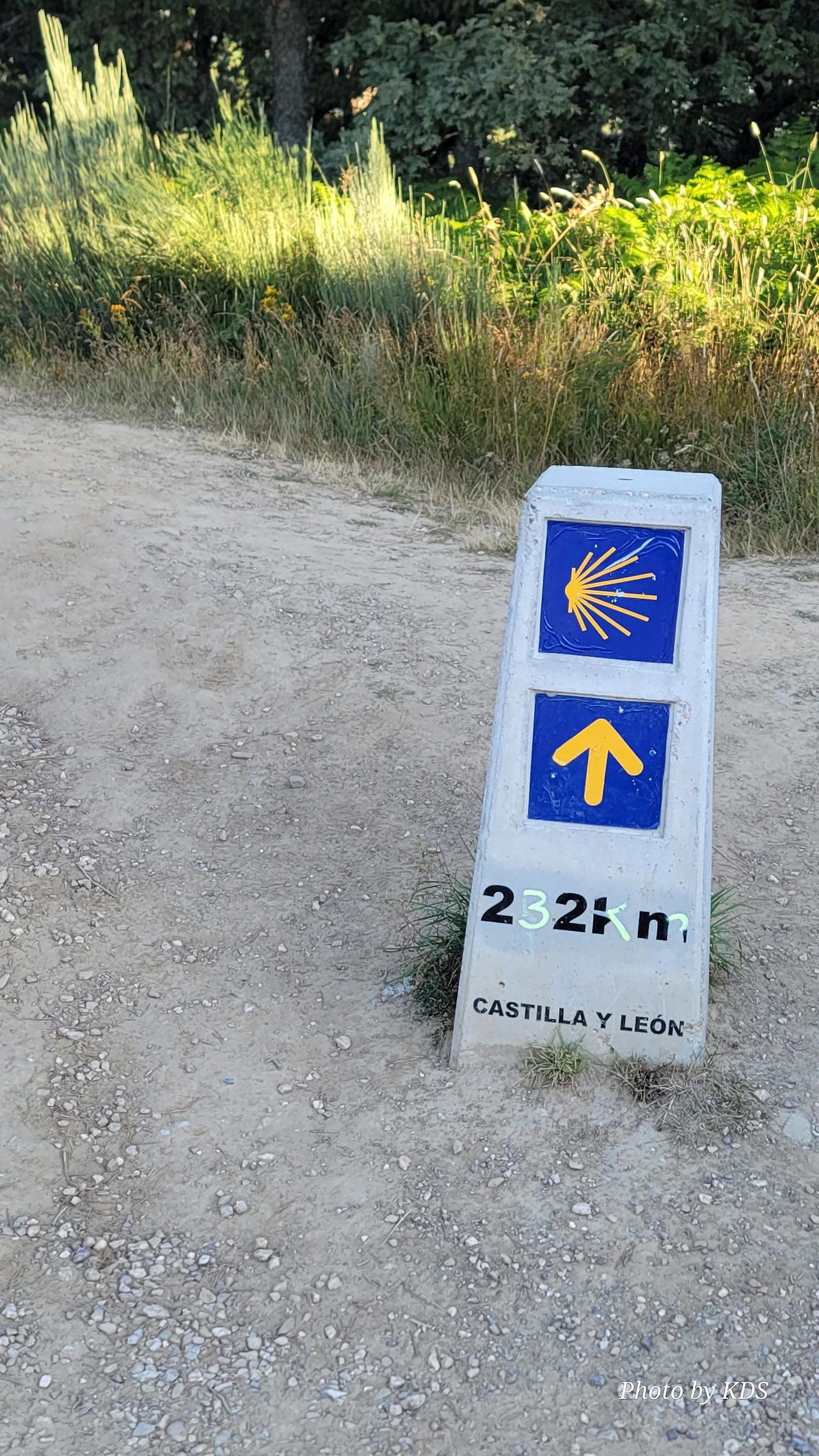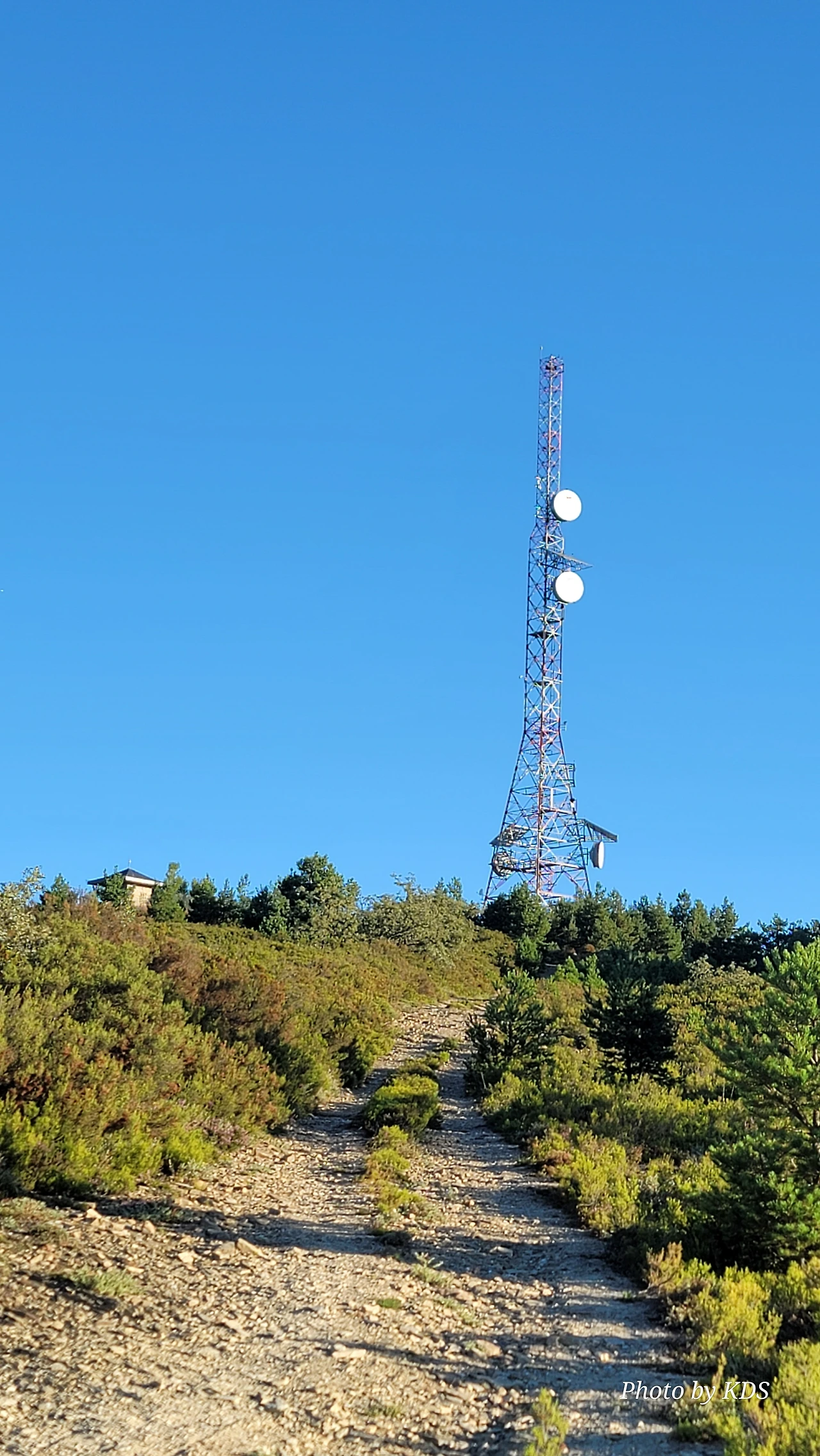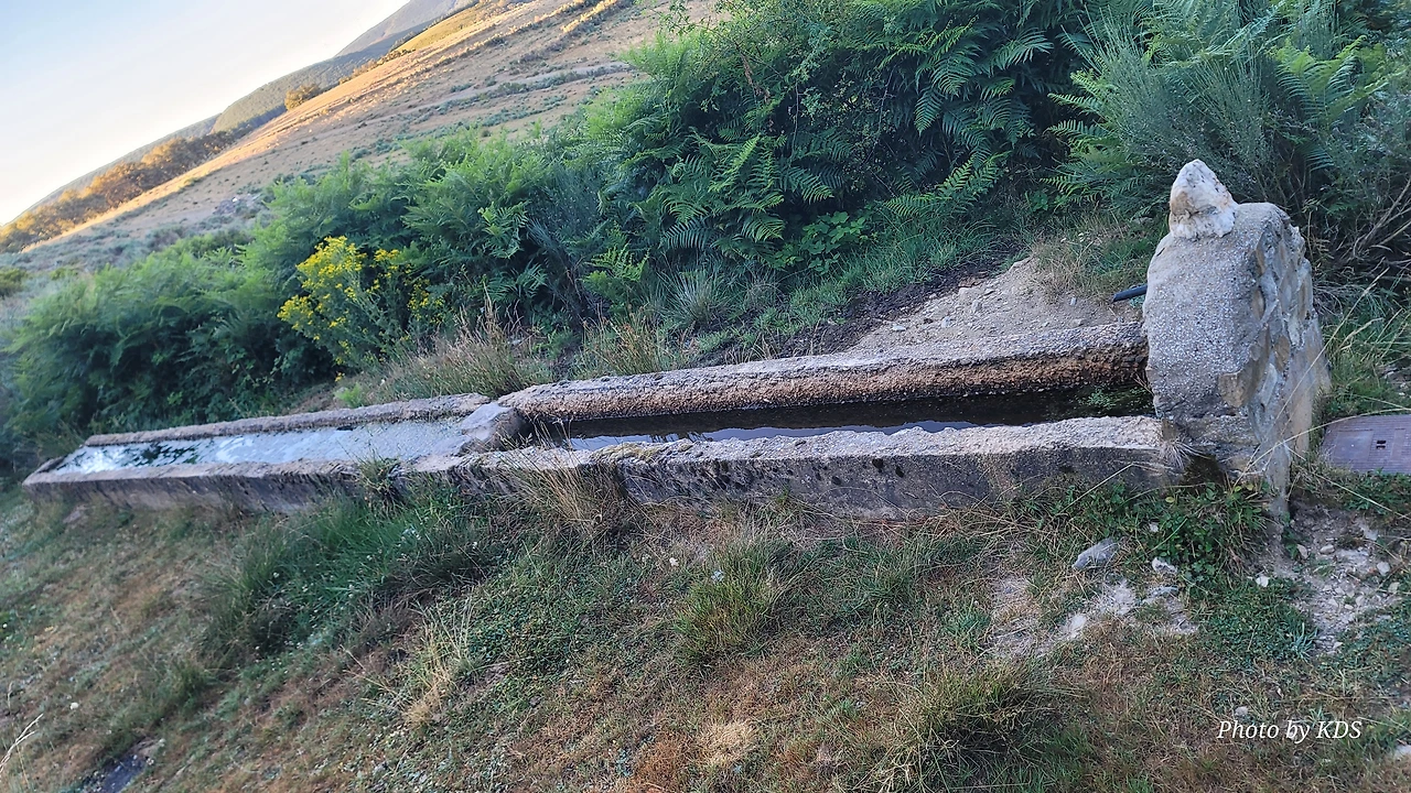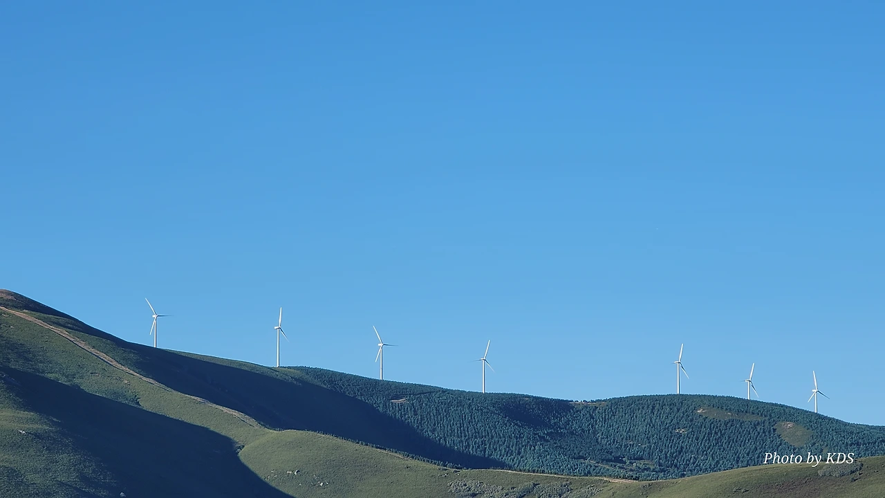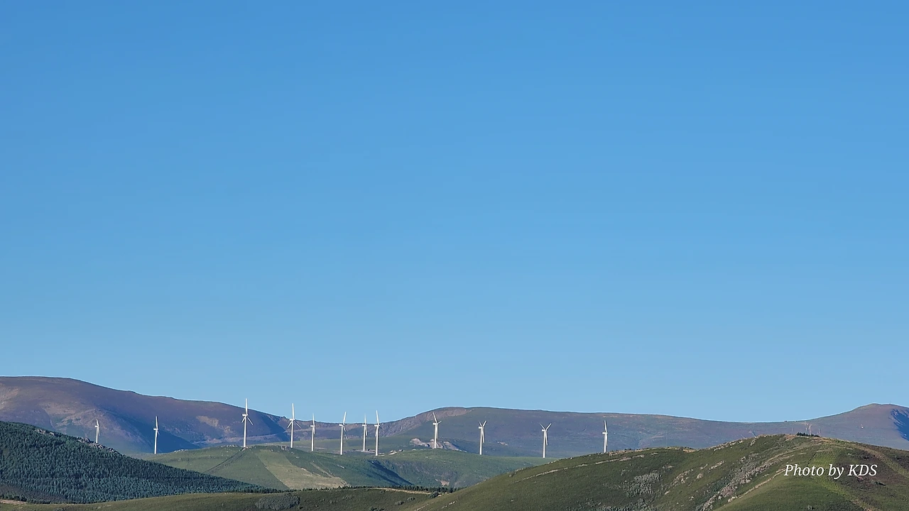 정상의 철 십자가(La Cruz de Ferro)에서 내리막길을 2.3Km 정도 내려오면 폐허가 된 마을인 만하린(Manjarin)을 만난다. 이 마을은 거의 폐허가 되어서 보기에도 을씨년스럽다. 그런데 이곳의 쓸만한 건축물을 재건하여 순례자용 알베르게로 활용하고 있는 곳이 딱 하나 있다. 이곳의 해발고도가 1458m로 표시되어 있는데, 이런 곳에서 하룻밤을 묵어도 기분이 괜찮을 것 같았다. 공기도 상쾌하고 시야가 넓어서 가슴이 탁 트인다. 알베르게 주변에 돌담과 나무 목책을 얼기설기 만들어 놓고 여러 나라의 국기를 걸어 놓았다. 우리나라의 태극기도 커다랗게 중앙에 자리 잡고 있어서 매우 뿌듯했다. 조선 과객 금삿갓이 지나갈 때는 영업을 하지 않는지 출입구를 봉쇄해 놓았다. 아마 주인장이 이곳을 비우고 다른 곳에 볼일을 보러 간 모양일 거다. 만하린 마을을 지나 내리막길을 계속 내려오면 저 멀리 산등성이에 통신용 철탑도 보이고, 능선을 타고 풍력발전기들이 열심히 전기를 생산하고 있는 모습이 보인다.