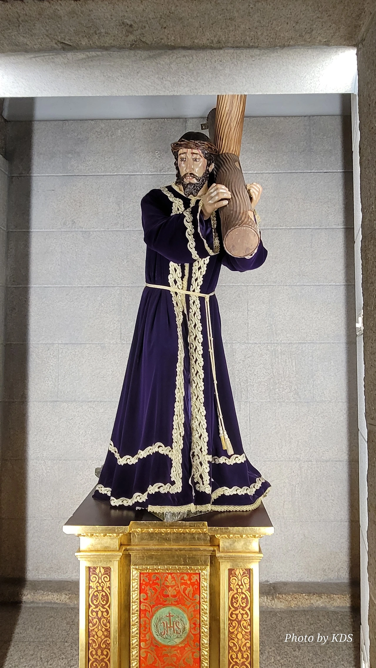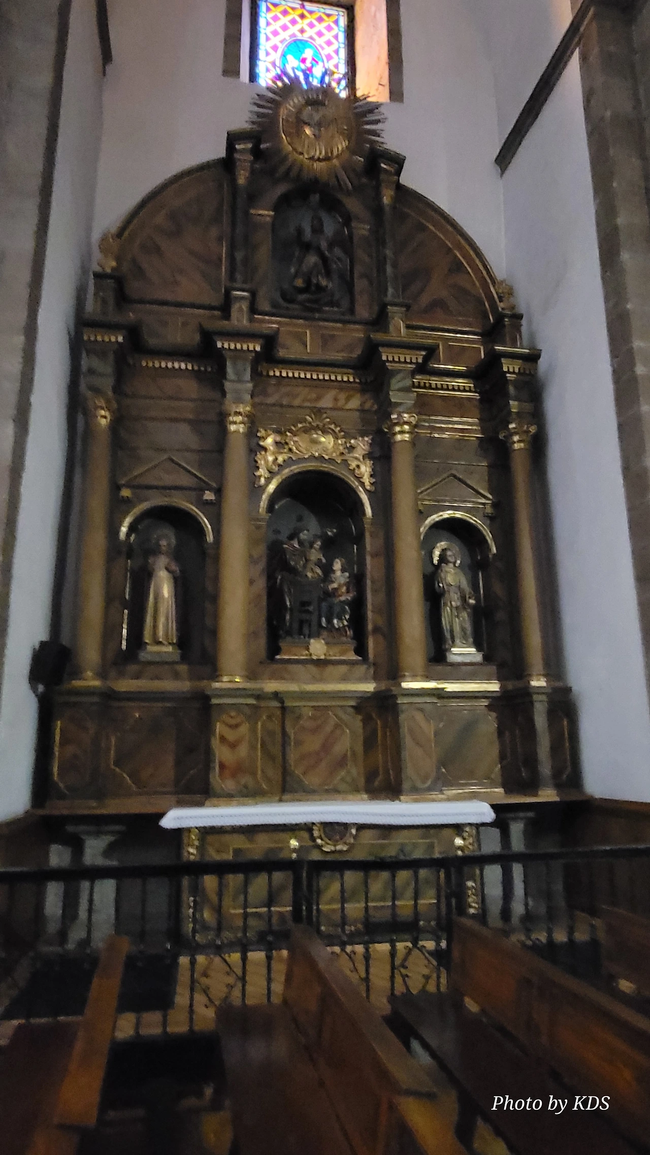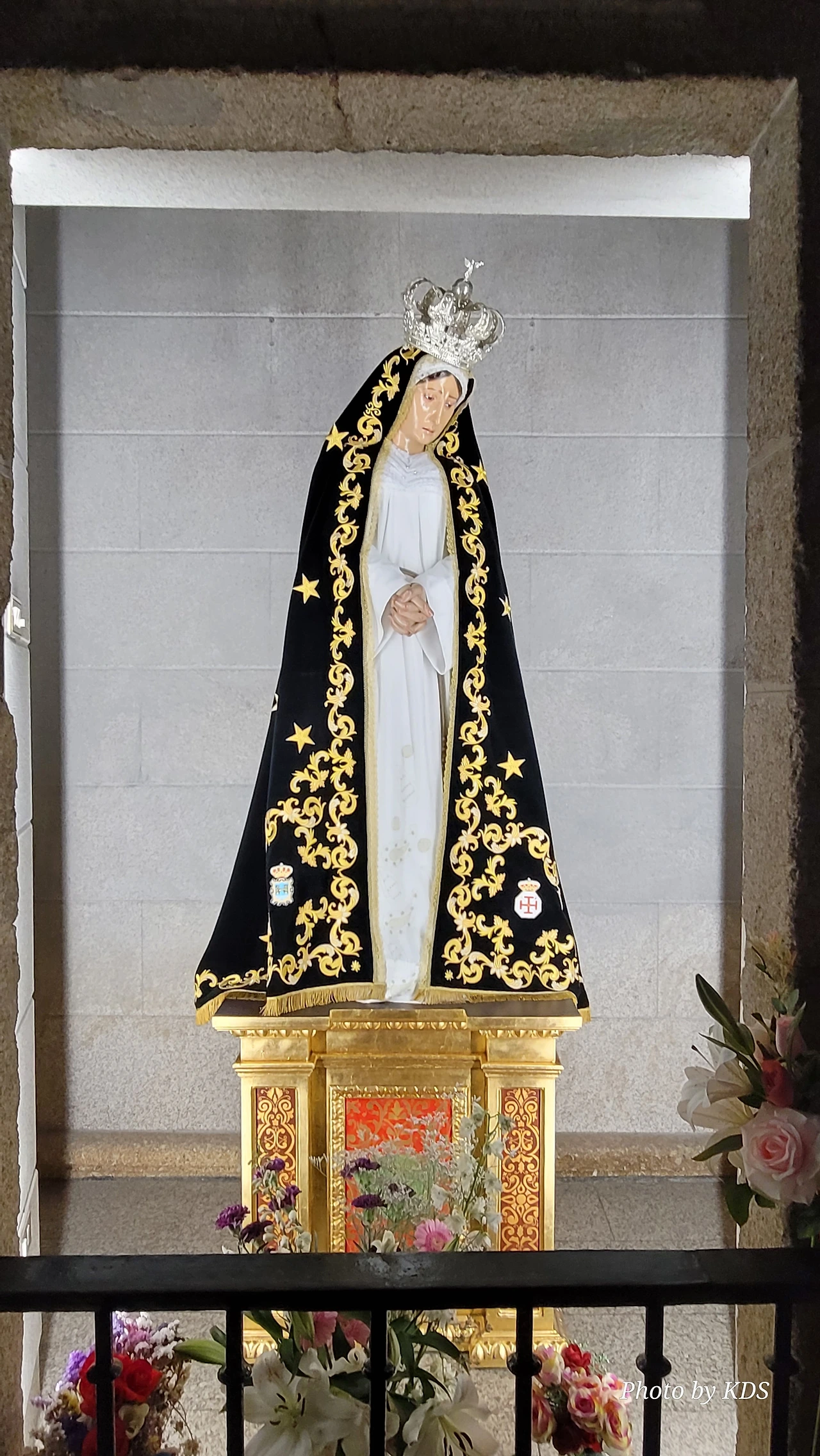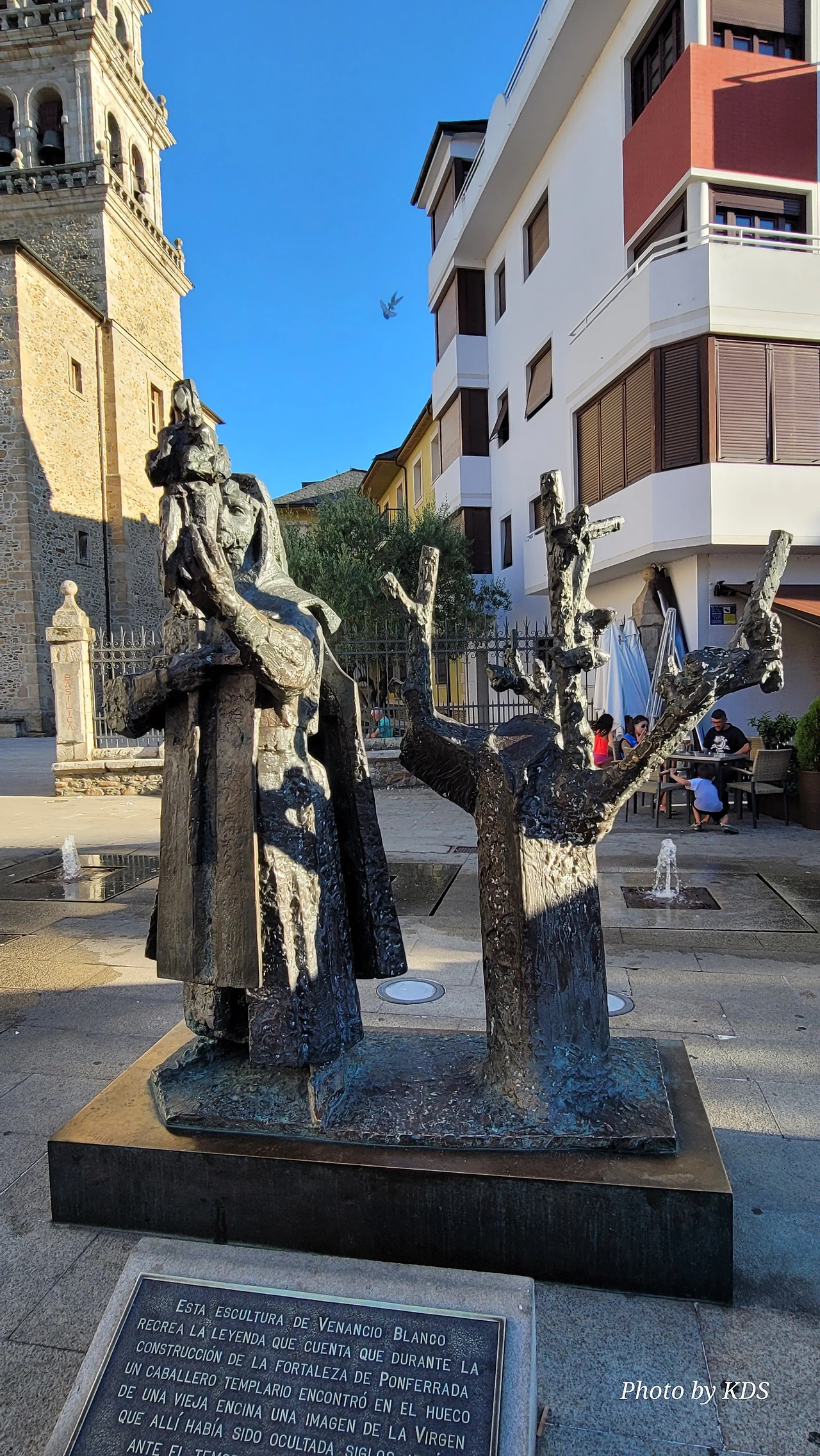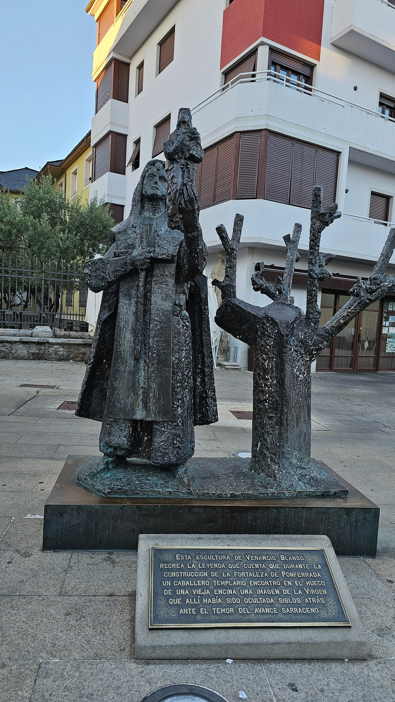 베난지오 블랑고(Venangio Blango)의 조각작품으로, 폰페라다의 요새인 템플 기사단 성곽 건설 중에 오래된 참나무 구멍에서 발견된 성모상의 전설에 기인한 조형물이다. 어떤 템플 기사단원이 성곽의 건설에 대들보로 쓸 나무를 베어오라고 나무꾼에게 명령했다. 대들보로 사용할 커다란 나무를 베기 위하여 숲 속으로 들어간 나무꾼들은 이상한 빛을 보았고, 그 빛은 신비스러운 광채를 뿜고 있는 떡갈나무로 그들을 인도했단다. 나무꾼의 제보를 듣고 숲으로 간 다른 기사는 커다란 참나무 구멍에 성모상이 있는 것을 발견하게 되었다. 템플 기사단은 이 성모상을 위해 성전을 짓기로 했고, 엔시나의 성모를 이 지역의 수호성인으로 삼았다. 조형물은 템플 기사와 성모상, 참나무를 조형화한 것이다.