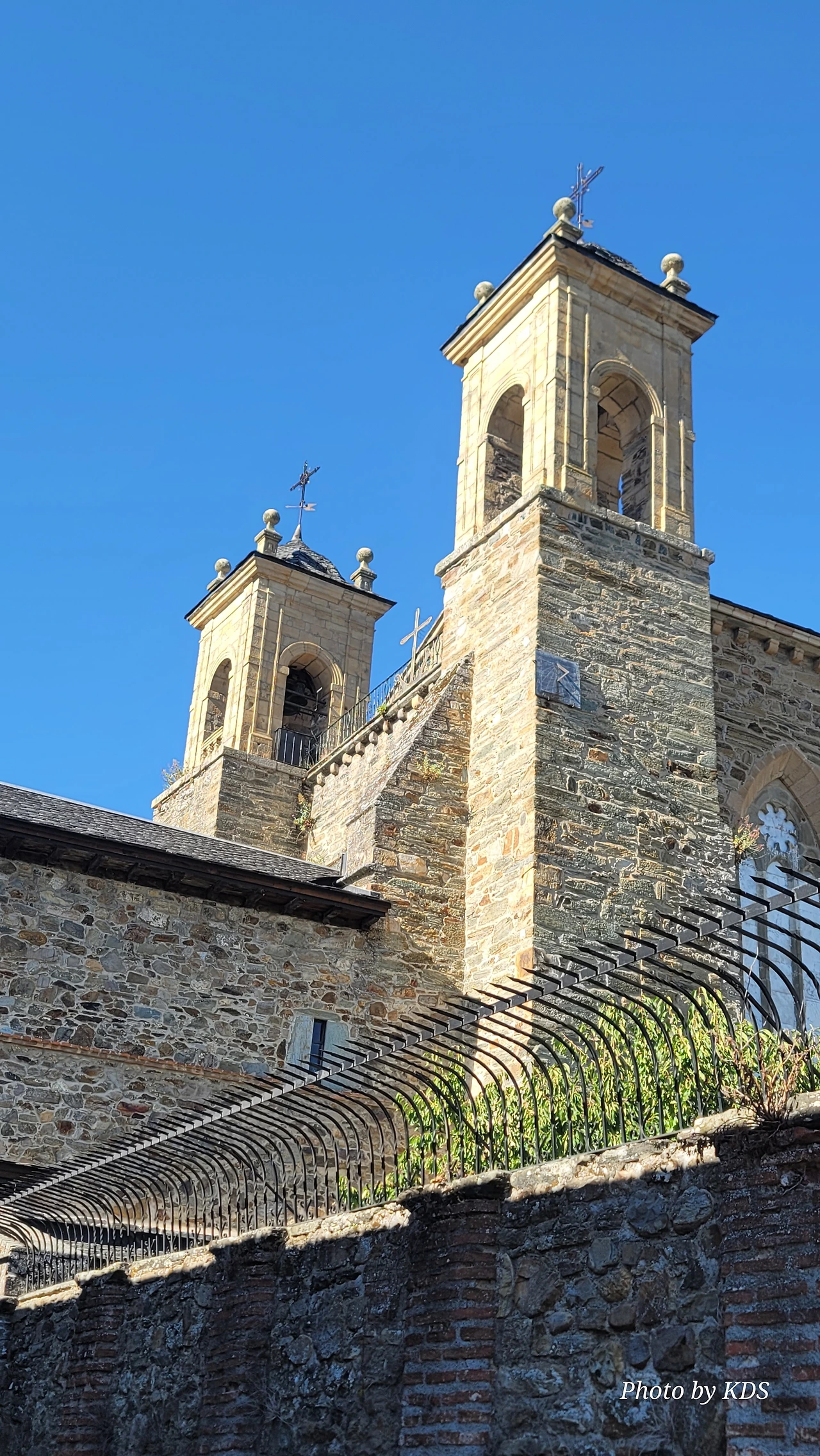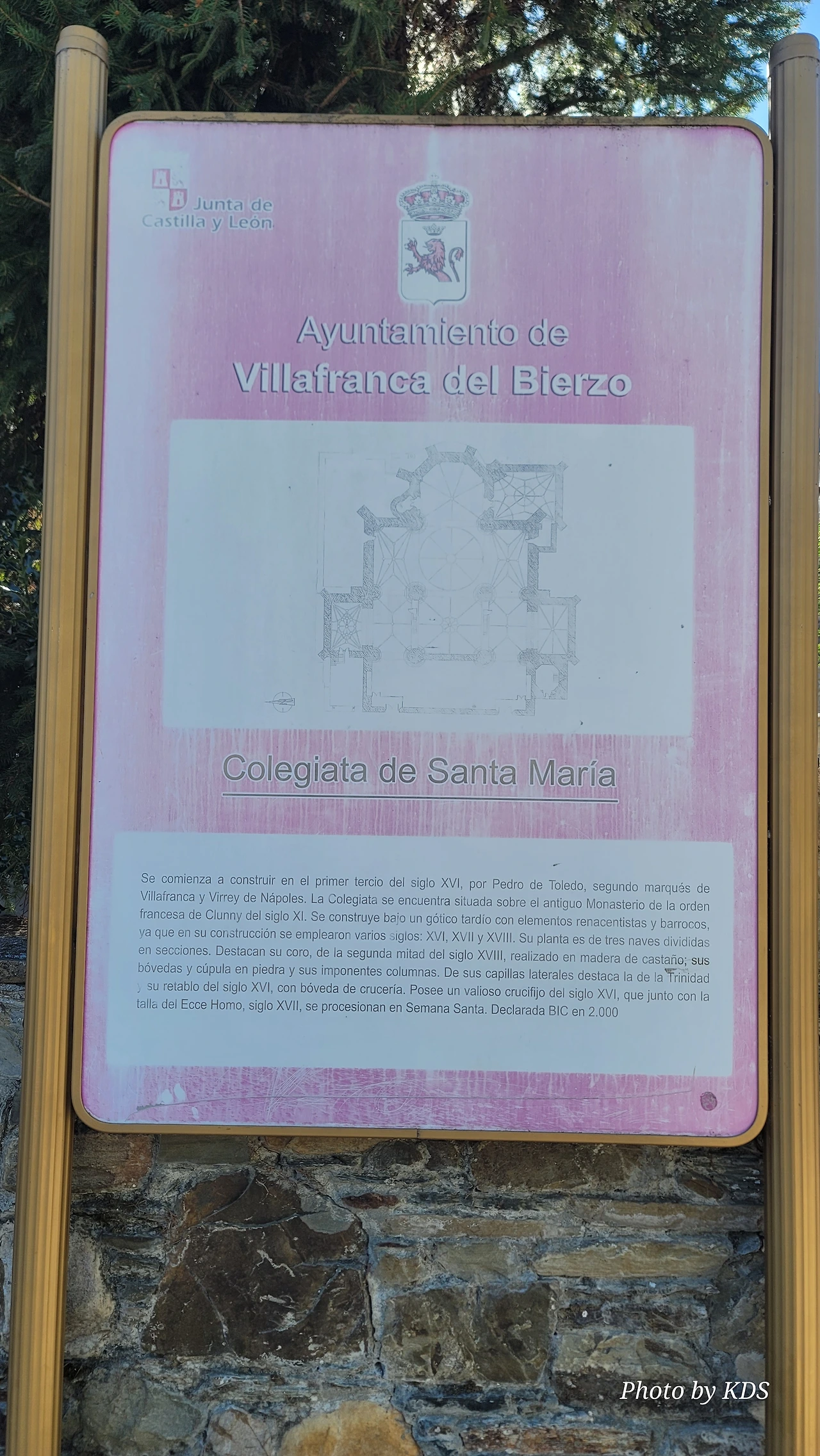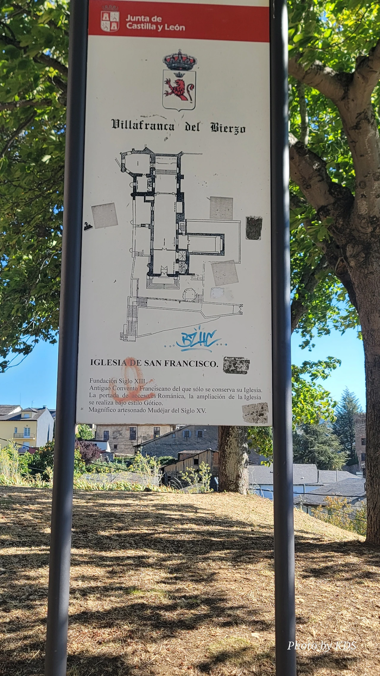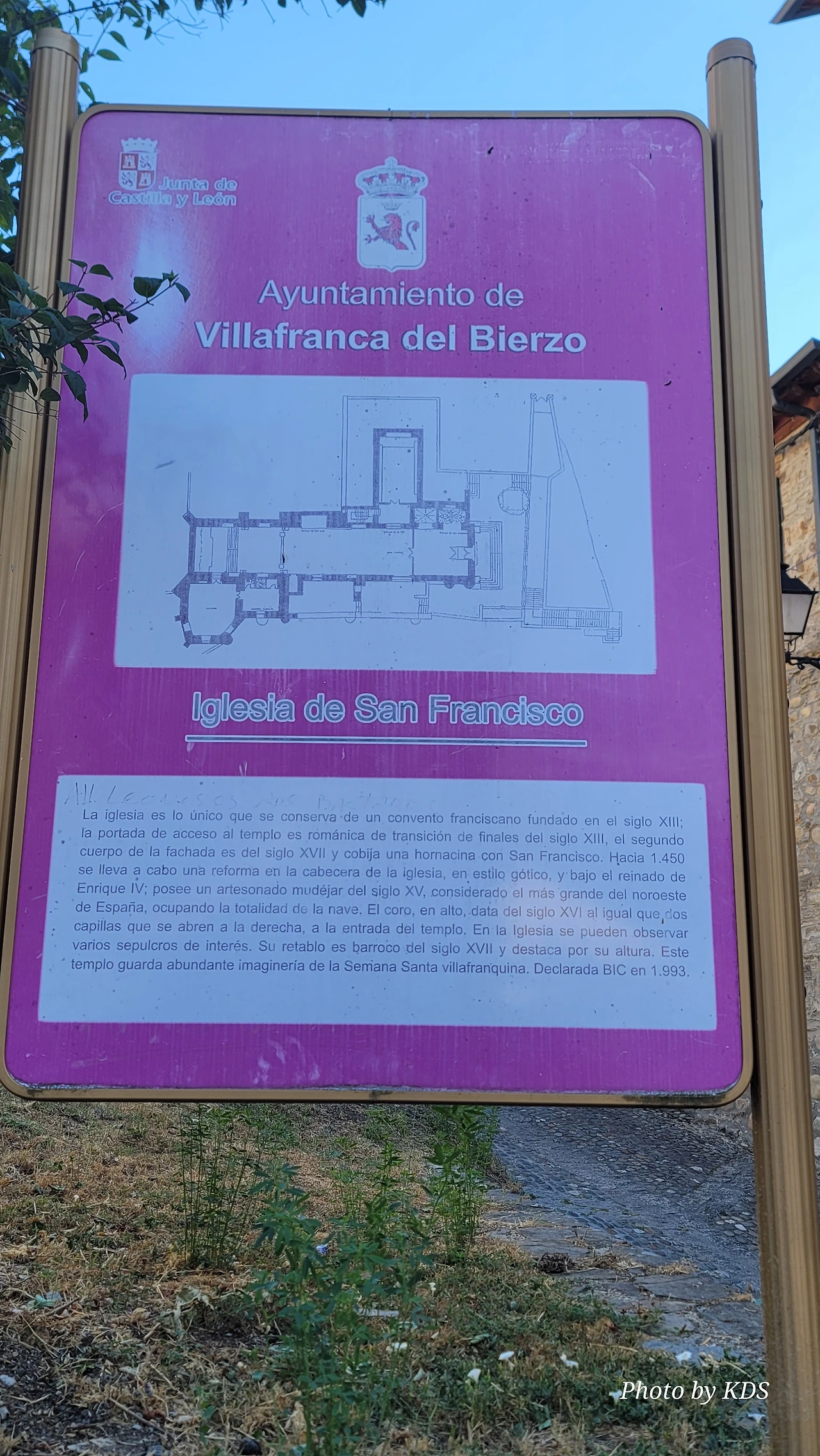 이 마을에는 유서 깊은 성당이 많다. 산 프란시스코 성당(Iglesia de San Francisco)이 웅장하게 서 있다. 이 성당은 13세기에 설립된 프란체스코 수도원의 유일한 유적이다. 성당 입구문은 13세기말의 로마네스크 양식이고, 외관은 17세기에 건축되었다. 원래 도냐 우라까 여왕의 저택을 개조하여 1450년 경 성 프란시스코와 함께 엔리케 4세의 통치하에 고딕 양식으로 개조되었다. 또 큰 성당은 클뤼니아꼬의 산따 마리아 성당(Colegiata de Santa Maria de Cluniaco)이다. 이 성당은 16세기 전반에 비야프랑카의 2대 후작인 뻬드로 데 톨레도(Pedro de Toledo)와 나폴리의 비메이(Vimey of Napes)에 의해 건설되었는데, 원래 11세기에 지어진 프랑스의 쿠니 수도원(Cunny Order of Cunny)의 옛 수도원 옆에 위치해 있다. 이곳에 들였더니 마침 결혼식이 진행되고 난 후였다. 하객들과 행사 진행 요원들이 부산하게 움직이고 있었다. 또 커다란 건축물인 산 니꼴라스 엘 레알 수도원(Convento San Nicolas el Real)은 17~18세기에 만들어진 수도원이다. 내부에는 수도원의 설립자가 아메리카 대륙에서 가져왔다고 하는 ‘희망의 그리스도’(Cristo de la Esperanza)가 보존되어 있다고 한다. 현재는 자연사 박물관으로 활용되고 있다. 그 외에도 아눈시아다 수도원(Convento de la Anunciada)과 산띠아고 성당(Iglesia de Santiago)도 있다.