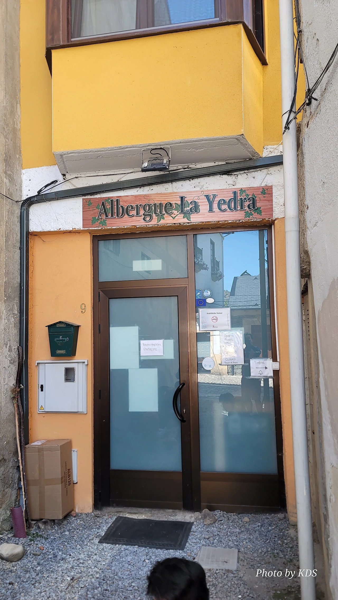 마을을 샅샅이 뒤지서 정말 차도 들어갈 수 없는 좁은 골목길 막다른 곳에 작은 나무 간판이 붙은 알베르게를 발견했다. 이름하여 라 예드라(La Yedra) 스페인어로 돌멩이다. 그런데, 주인도 없고 문도 잠겼다. 전화번호가 적혀 있어서 전화를 하니까 주인 여사장이 14시가 넘어야 이곳으로 올 테니 기다리란다. 일단 숙소를 정해야 하니 길바닥에 퍼질러 앉아서 기다린다. 한국에서 온 젊은 친구들이 4명도 도착했다. 그리고 그 헝가리 모자들도 도착하였다. 모두들 길에서 한 두 번씩 조우하거나 같이 잔 경험이 있어서 마치 이산가족 상봉하듯이 반가워한다. 겉보기엔 허름하고 별거 아닌 것 같았는데, 들어가니 이외로 실내는 수리를 했는지 깨끗하고 현대식이다. 화장실과 샤워실도 좋았다. 특히 주인 여사장의 넉넉한 친절이 마음에 와닿는다.