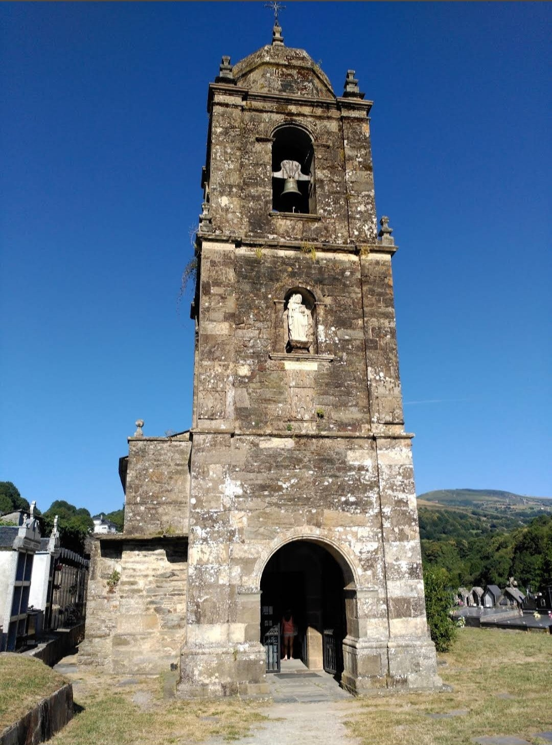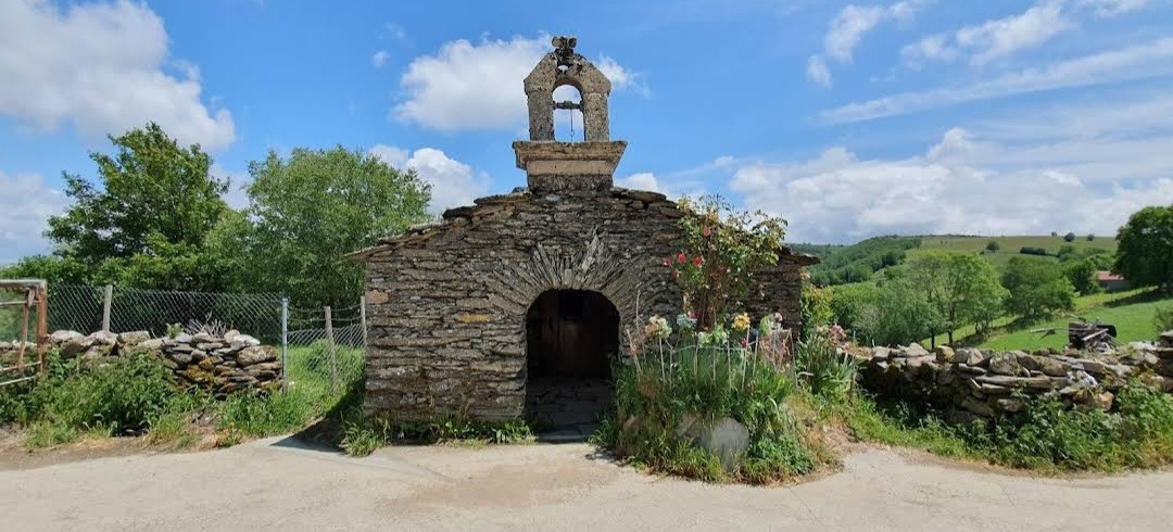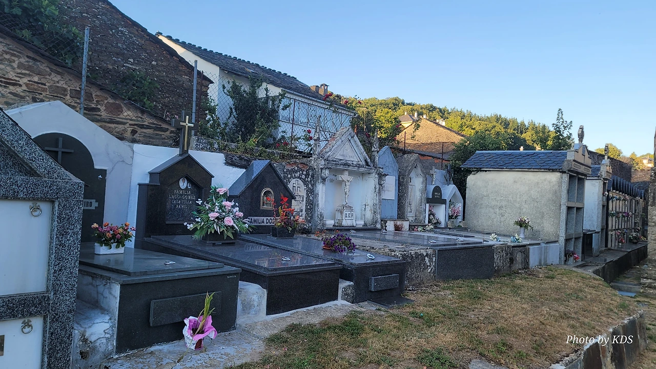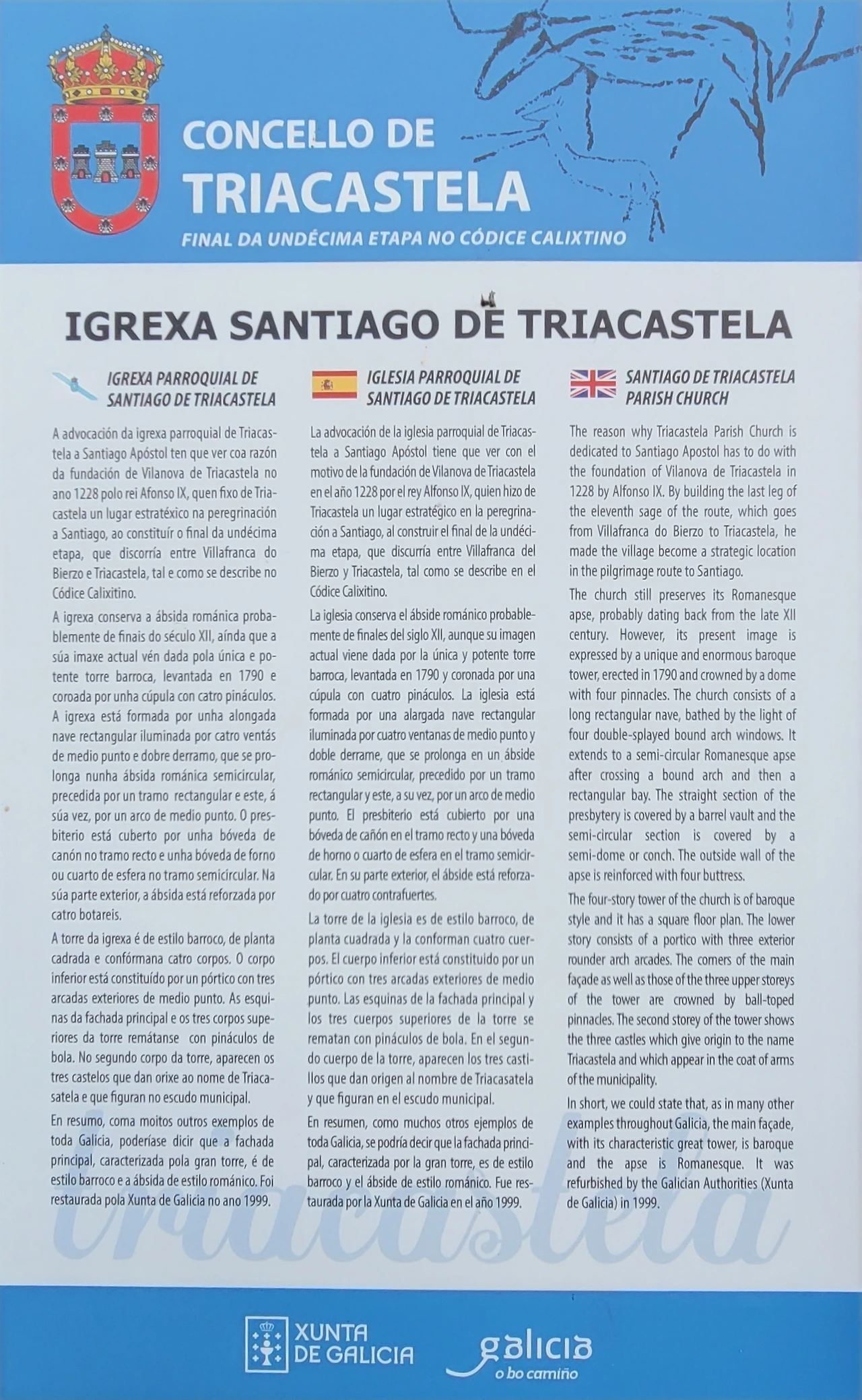 이 마을의 중간쯤에 산띠아고 로만시아 성당(Iglesia Romanica de Santiago)이 있는데, 그 옆으로 공동묘지가 같이 붙어 있다. 이 성당이 산티아고 아포스톨에게 봉헌된 이유는 그 창립과 관련이 있다. 1228년 알폰소 9세에 의해 빌리프란카 비에르소에서 뜨리아까스뗄로로 가는 길의 11번째 현자의 마지막 다리를 지음으로써 산티아고 순례길의 전략적 마을이 되었다. 정확한 건축 연대는 알 수 없으니 그 시대에 지어진 것으로 추정된다. 로마네스크 양식으로 돌로 건축된 소박한 전원풍 성당으로, 성당의 내부에는 복음서를 들고 있는 산띠아고 성인의 순례자상이 보관되어 있다. 현재의 건축물은 1790년도에 세워졌고, 네 개의 정점이 있는 돔으로 장식된 바로크 양식의 종탑이 멋지게 보인다. 성당 옆은 공동묘지는 인생의 순례길을 끝마친 분들의 최후의 안식처로 제공되고 있었다. 교회 안내문이 특이하게 3개의 언어로 작성되어 있는데, 제일 앞이 갈리시아어이고, 다음이 스페인어, 마지막이 영어로 되어 있다.