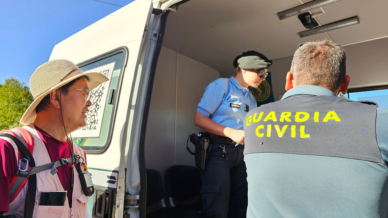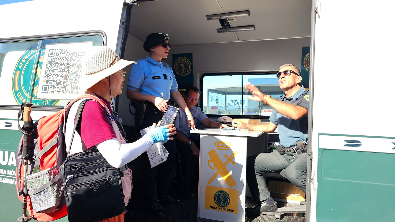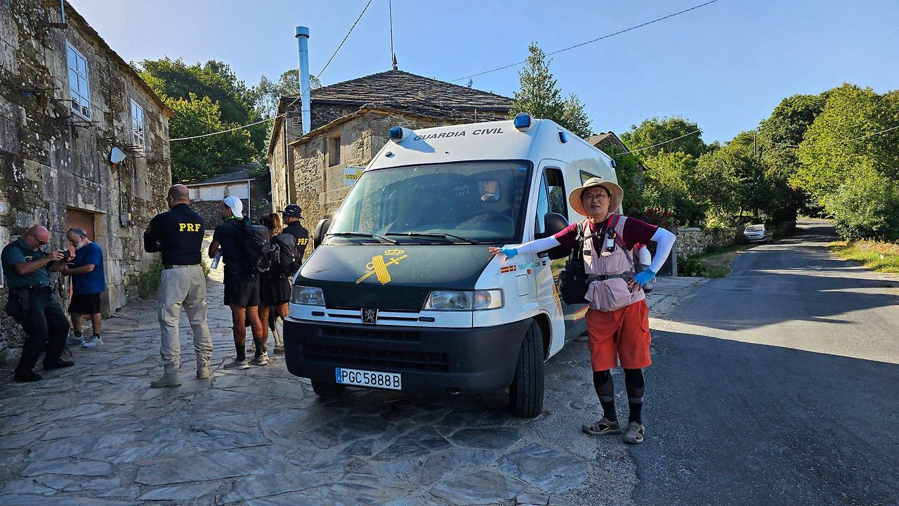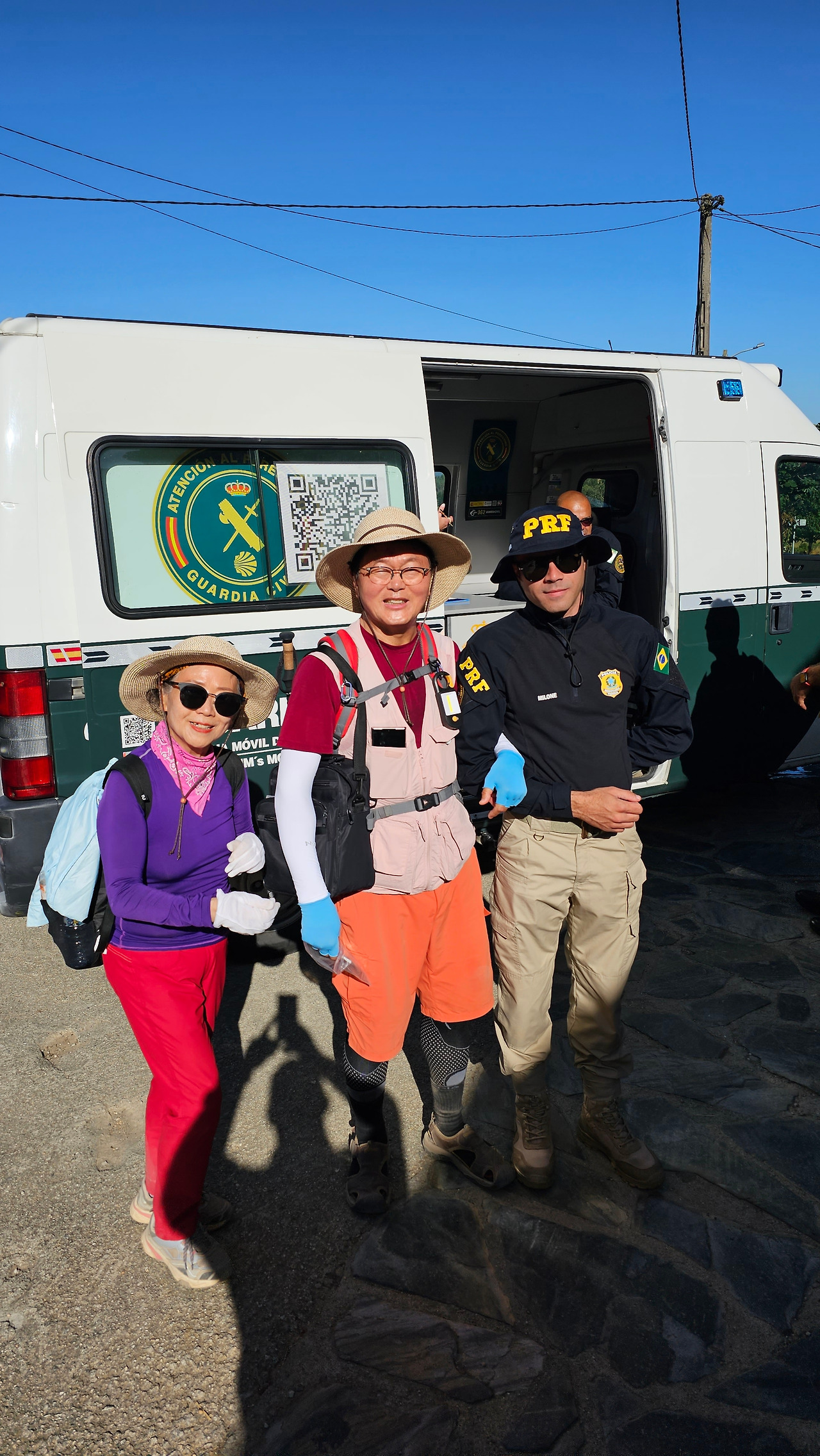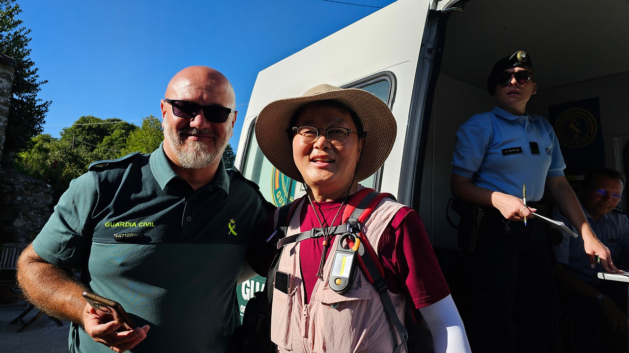 사리아(Sarria) 마을에서 20Km 정도를 걸으면 빌라차(Vilacha) 마을에 도착한다. 이 마을은 약간 높은 언덕 위에 있어서 민뇨강(Rio Mino) 강을 거너서 뽀르또마린(Portomarin) 마을이 훤히 내려다 보이는 전망이 좋은 마을이다. 조선 과객 금삿갓이 이 마을을 그 냥 스쳐 지나가려 하는데 마을의 골목에 이 지방의 경찰들이 차를 세워놓고 임시 경찰 오아시스 역할을 하고 있었다. 치안을 담당하기보다, 지나가는 순례객들에게 서비스를 하는 것이다. 순례객들의 여권인 끌리덴셜(Credencial)에 스탬프인 세요(Sello)를 찍어주고, 같이 사진도 찍는 등 순례자들에게 서비스를 하는 것이다. 그렇다고 음료수를 제공하는 것은 아니다. 다만 자기들의 존대 이유를 몸으로 표현하는 것이다. 조선 과객 금삿갓의 모자와 배낭에 달린 태극기를 보자 단번에 대한한국이라는 것을 알아보았다. 우리나라 경찰과도 업무 공조를 잘하고 있다고 했다. 한 달 전까지 우리나라 경찰 1명이 이곳 경찰서에서 한 1년간 같이 근무하다가 한국으로 돌아갔단다. 같이 사진도 찍고 이런저런 이야기로 떠들다가 이들과 헤어져 길을 재촉한다.