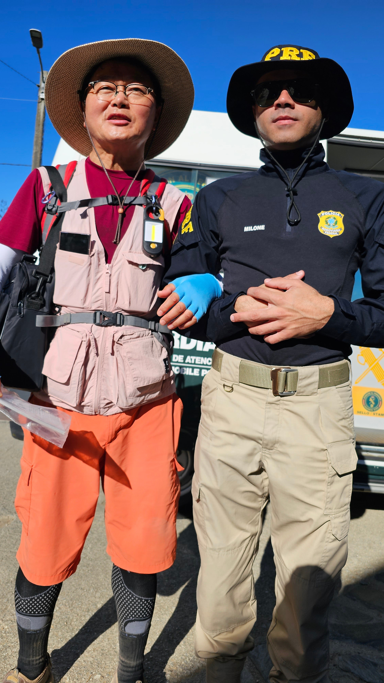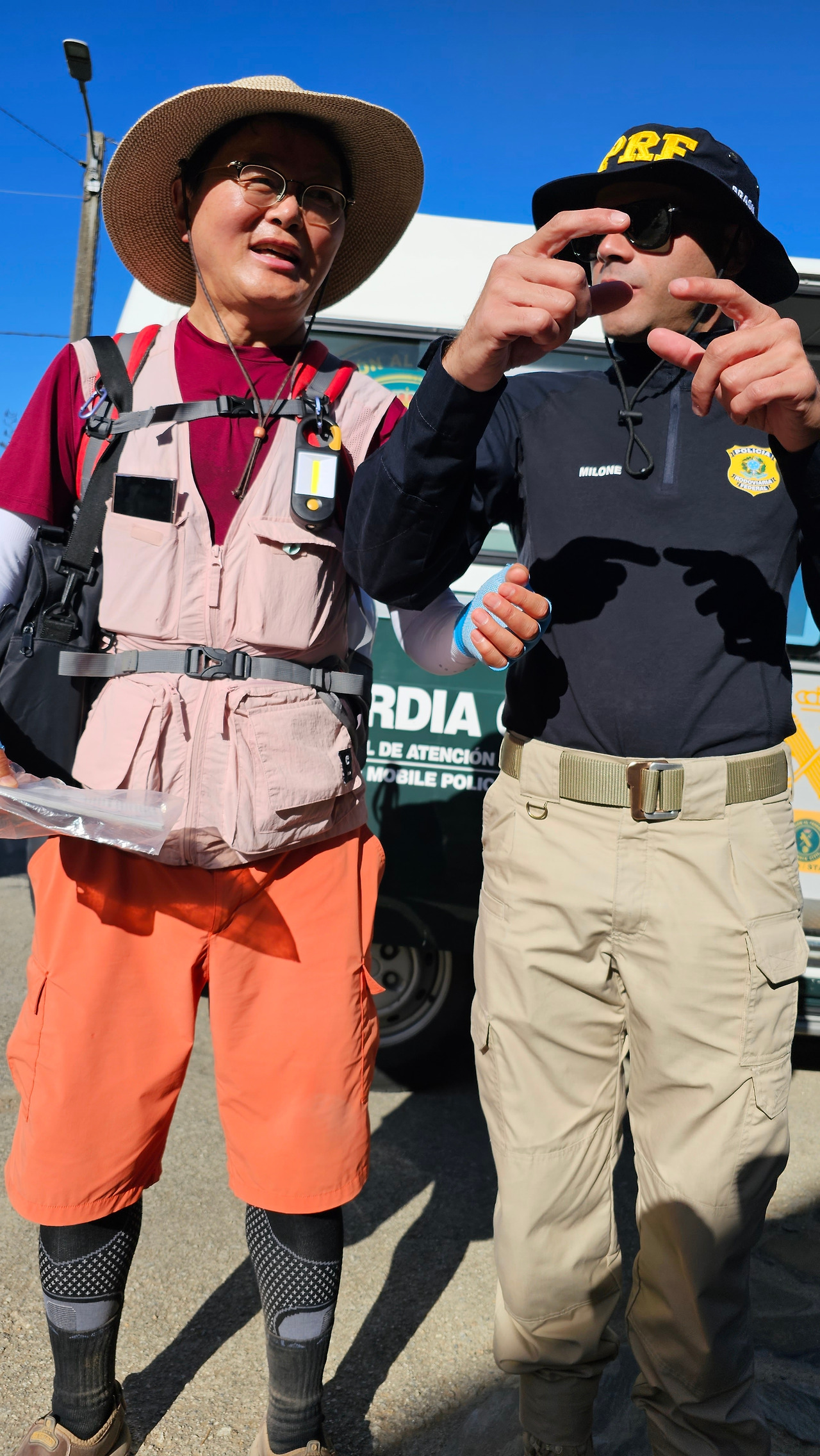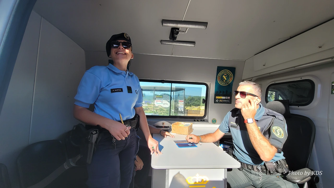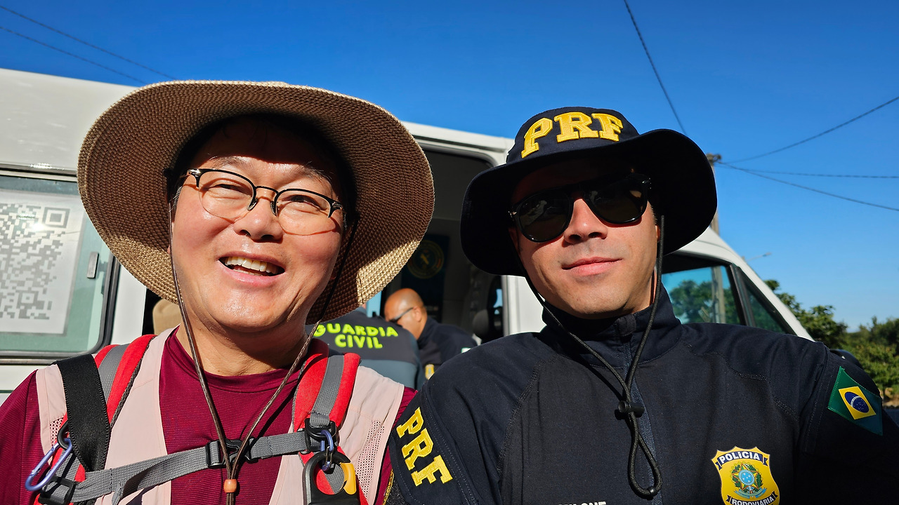 사리아(Sarria) 마을에서 20Km 정도를 걸으면 빌라차(Vilacha) 마을에 도착한다. 이 마을은 약간 높은 언덕 위에 있어서 민뇨강(Rio Mino) 강을 거너서 뽀르또마린(Portomarin) 마을이 훤히 내려다 보이는 전망이 좋은 마을이다. 조선 과객 금삿갓이 이 마을을 그 냥 스쳐 지나가려 하는데 마을의 골목에 이 지방의 경찰들이 차를 세워놓고 임시 경찰 오아시스 역할을 하고 있었다. 치안을 담당하기보다, 지나가는 순례객들에게 서비스를 하는 것이다. 순례객들의 여권인 끌리덴셜(Credencial)에 스탬프인 세요(Sello)를 찍어주고, 같이 사진도 찍는 등 순례자들에게 서비스를 하는 것이다. 그렇다고 음료수를 제공하는 것은 아니다. 다만 자기들의 존대 이유를 몸으로 표현하는 것이다. 조선 과객 금삿갓의 모자와 배낭에 달린 태극기를 보자 단번에 대한한국이라는 것을 알아보았다. 우리나라 경찰과도 업무 공조를 잘하고 있다고 했다. 한 달 전까지 우리나라 경찰 1명이 이곳 경찰서에서 한 1년간 같이 근무하다가 한국으로 돌아갔단다. 같이 사진도 찍고 이런저런 이야기로 떠들다가 이들과 헤어져 길을 재촉한다.