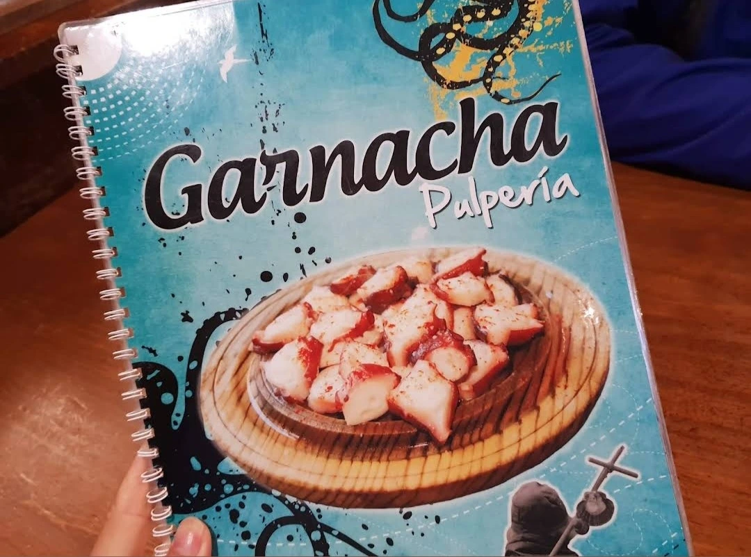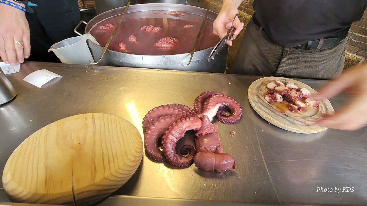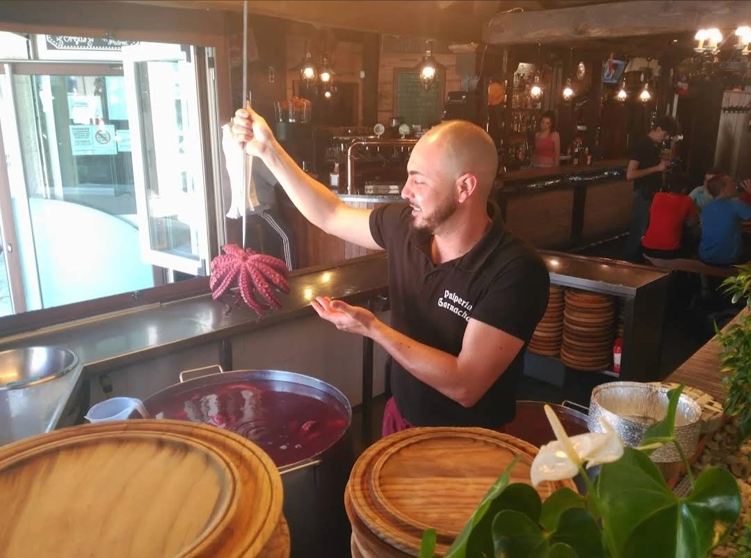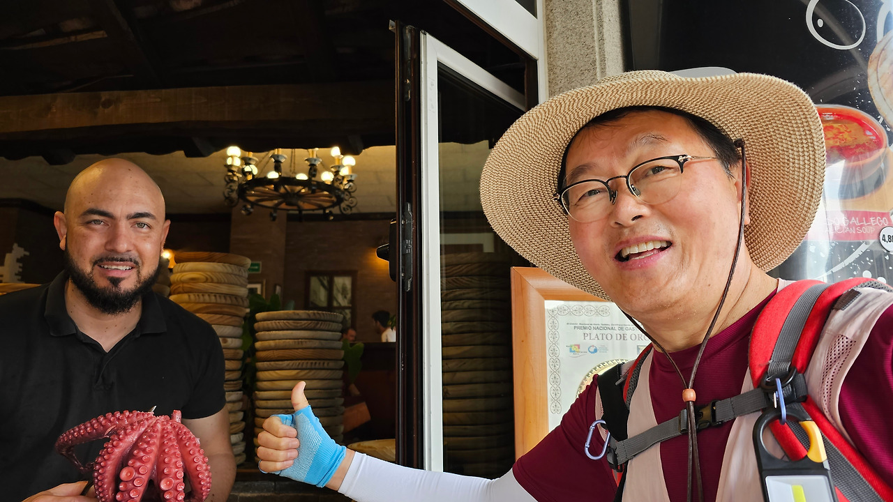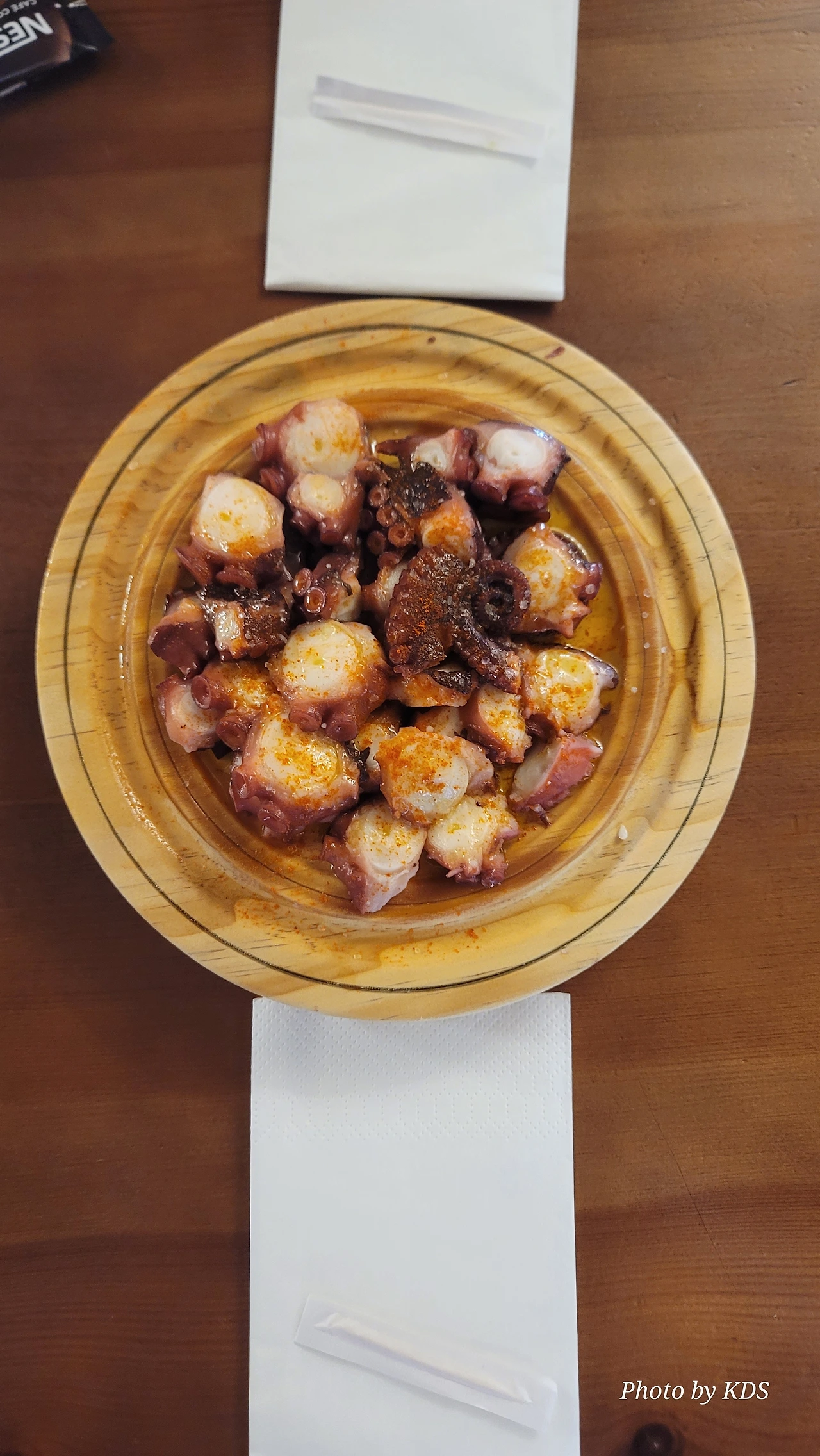스페인의 "꽃" 문어는 문어의 근육을 분해하여 부드럽고 맛있게 만드는 첨가물이나 화학 물질을 사용하지 않고 자연 공정을 통해 연화되어 꽃처럼 말려 있는 모양이다. 세계적으로 문어가 맛있는 국가는 포르투갈, 스페인, 그리스라고 한다. 그런데 조선과객 금삿갓의 입맛에는 안동의 신시장 문어가 제일 맛있다. 물론 요리 방법의 차이이다. 안동 신시장의 문어는 동해안 문어를 가마솥에서 살짝 데쳐서 숙회로 만들어 먹으면 졸깃졸깃한 식감이 살아 있다. 그런데 이곳 스페인 뽈뽀는 커다란 식관에 여러 마리를 넣고 은근히 푹 삶아서 내므로 부드럽기는 하나 문어의 맛이 빠지고 식감이 약간 쫄깃하지 않아서 한국 문어에 익숙한 금삿갓의 입맛에는 최상품은 못된다. 금삿갓이 들린 이곳은 뽈뻬리아 아 가르나차(Pulperia A Garnach)라는 멜리데에서는 굉장히 유명한 문어집이었다. 주방도 개방해 놓고 순례객들이 사진을 찍을 수 있도록 허용하고, 넓은 객실이 있어서 많은 순례객들로 항상 붐비는 곳이었다. 이곳에서 두 시간 이상은 걸어온 허기진 배를 문어와 와인으로 해결했다.