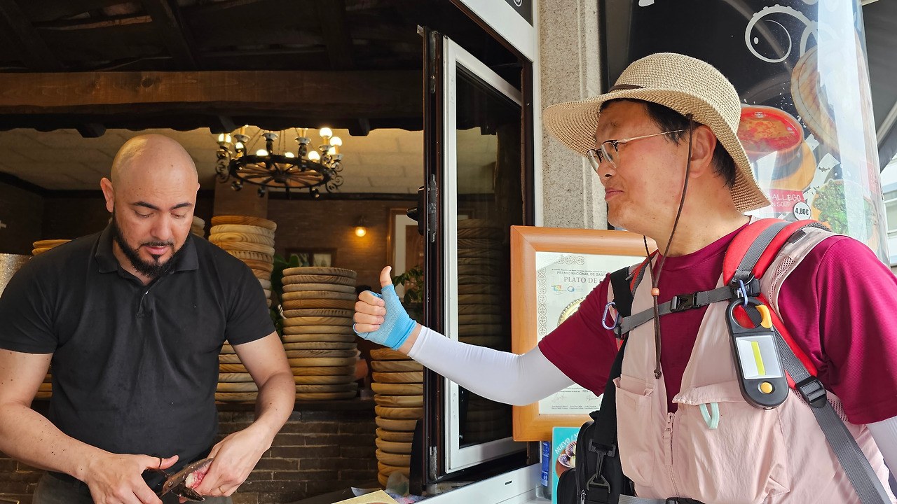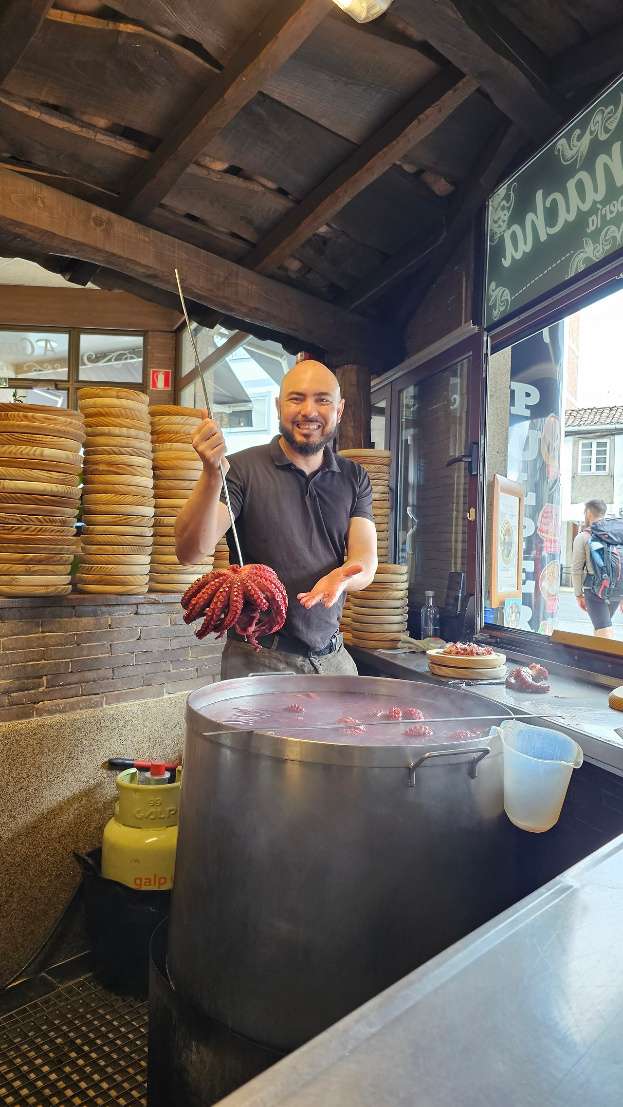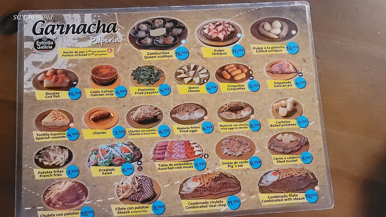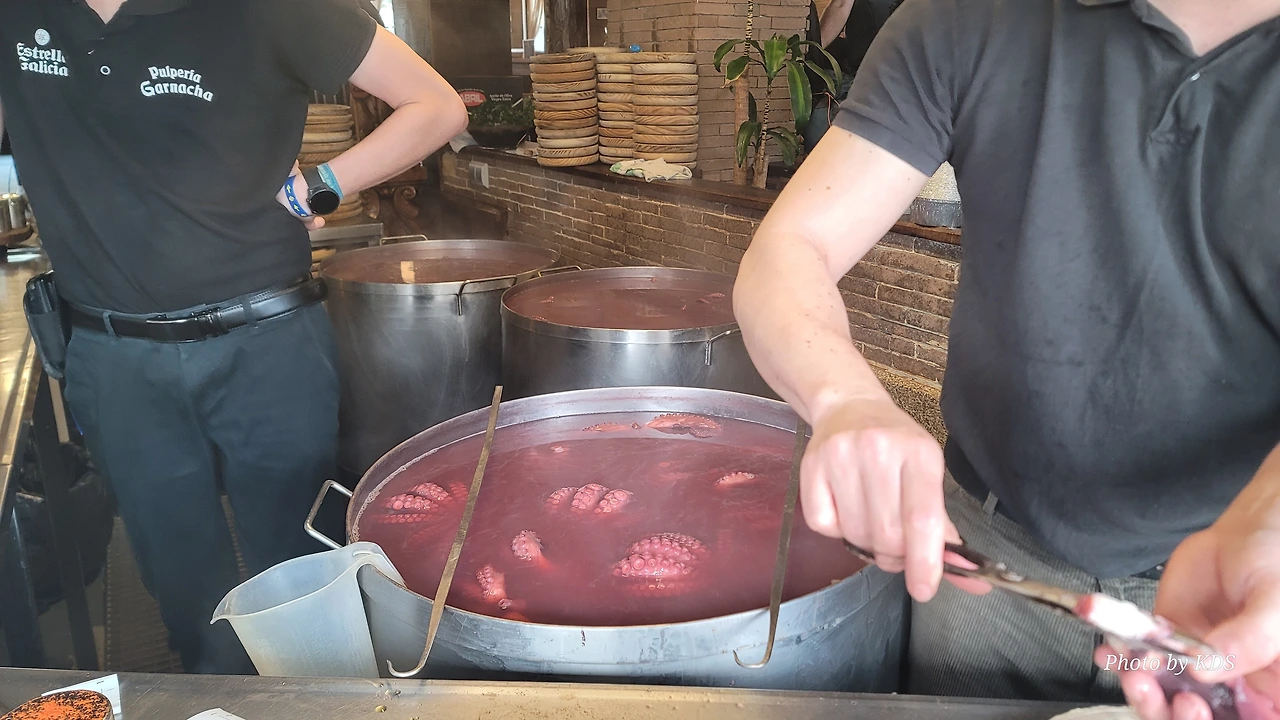 스페인의 "꽃" 문어는 문어의 근육을 분해하여 부드럽고 맛있게 만드는 첨가물이나 화학 물질을 사용하지 않고 자연 공정을 통해 연화되어 꽃처럼 말려 있는 모양이다. 세계적으로 문어가 맛있는 국가는 포르투갈, 스페인, 그리스라고 한다. 그런데 조선과객 금삿갓의 입맛에는 안동의 신시장 문어가 제일 맛있다. 물론 요리 방법의 차이이다. 안동 신시장의 문어는 동해안 문어를 가마솥에서 살짝 데쳐서 숙회로 만들어 먹으면 졸깃졸깃한 식감이 살아 있다. 그런데 이곳 스페인 뽈뽀는 커다란 식관에 여러 마리를 넣고 은근히 푹 삶아서 내므로 부드럽기는 하나 문어의 맛이 빠지고 식감이 약간 쫄깃하지 않아서 한국 문어에 익숙한 금삿갓의 입맛에는 최상품은 못된다. 금삿갓이 들린 이곳은 뽈뻬리아 아 가르나차(Pulperia A Garnach)라는 멜리데에서는 굉장히 유명한 문어집이었다. 주방도 개방해 놓고 순례객들이 사진을 찍을 수 있도록 허용하고, 넓은 객실이 있어서 많은 순례객들로 항상 붐비는 곳이었다. 이곳에서 두 시간 이상은 걸어온 허기진 배를 문어와 와인으로 해결했다.